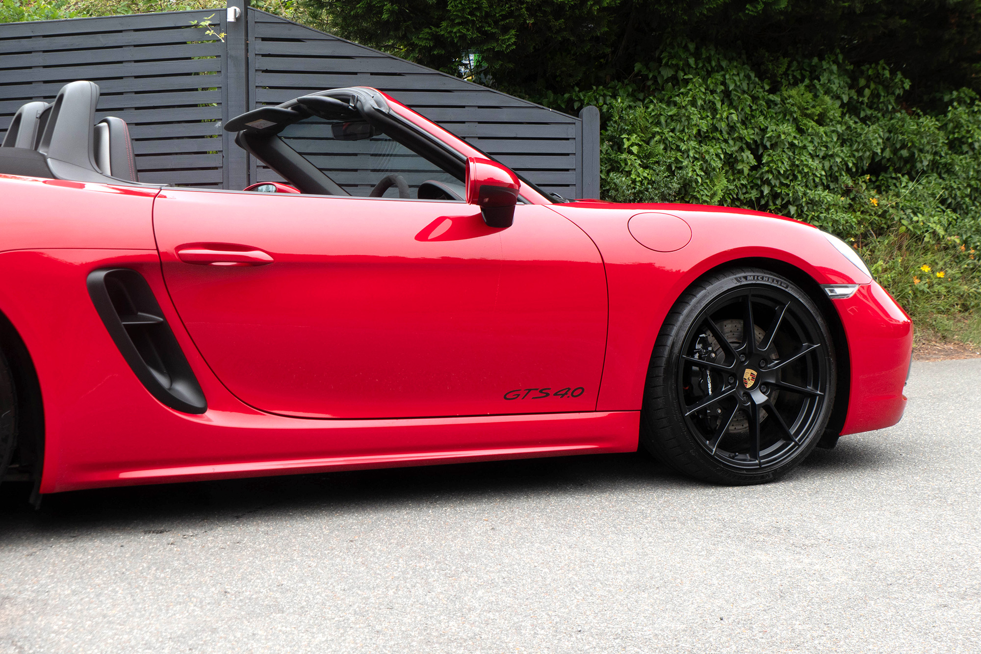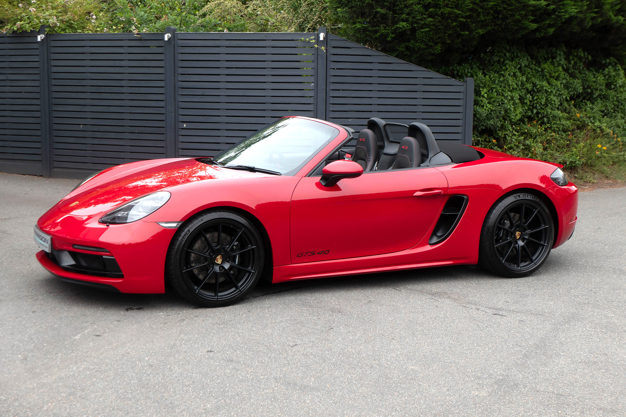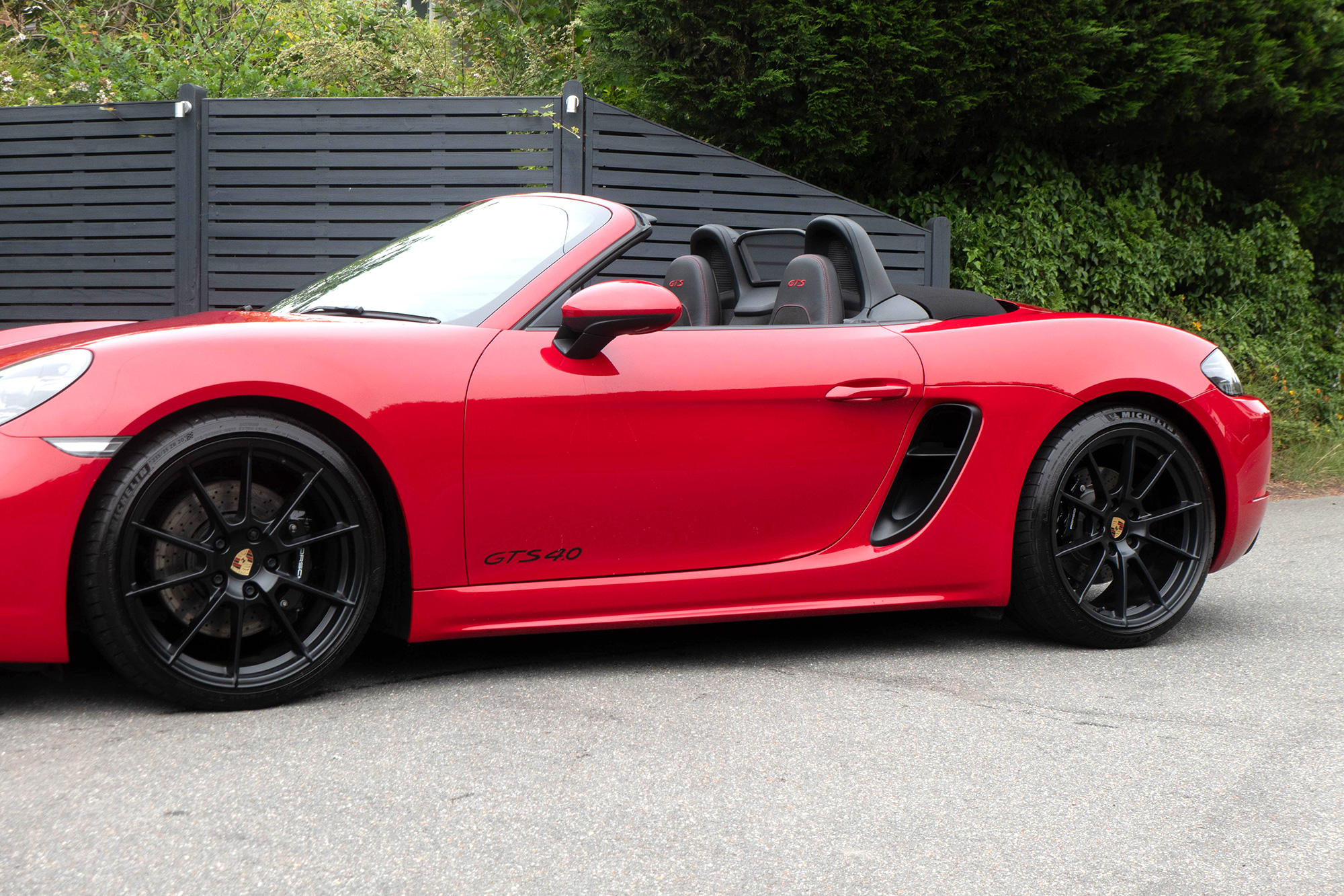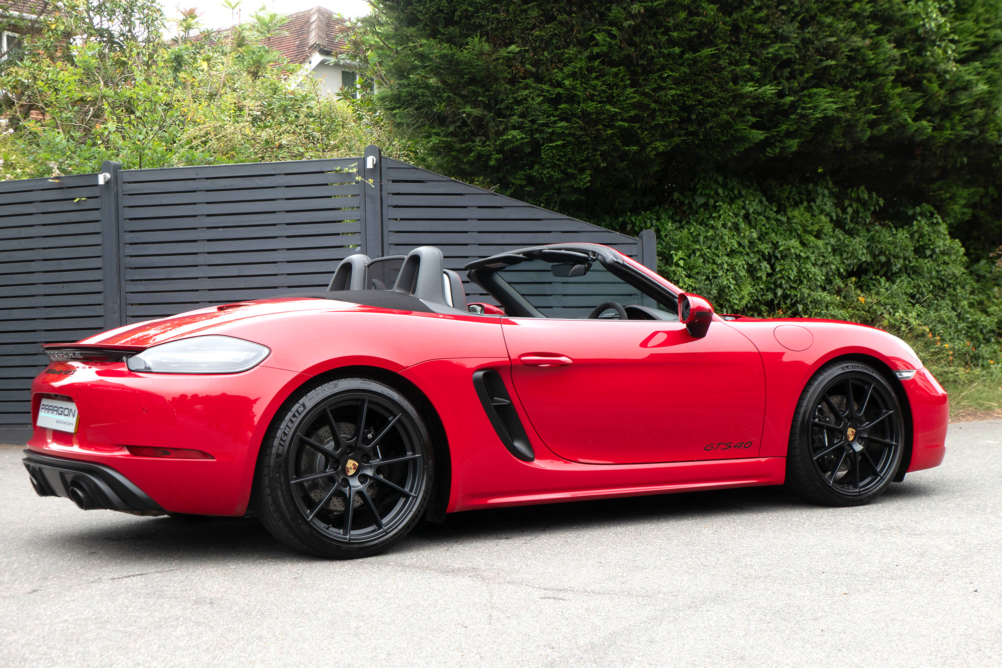 This Boxster GTS 4.0 (718) has the 7-speed PDK gearbox and is presented in Carmine Red with black half leather sports seats and a black power hood.