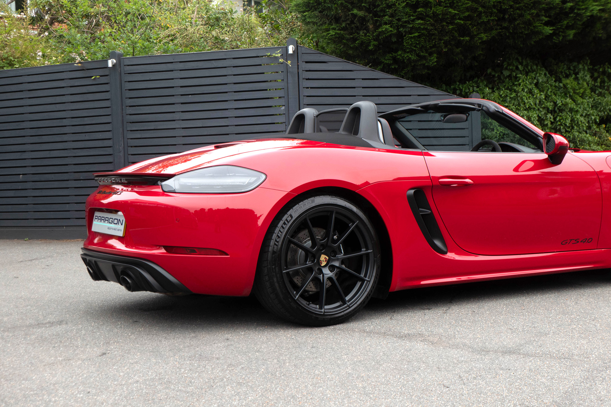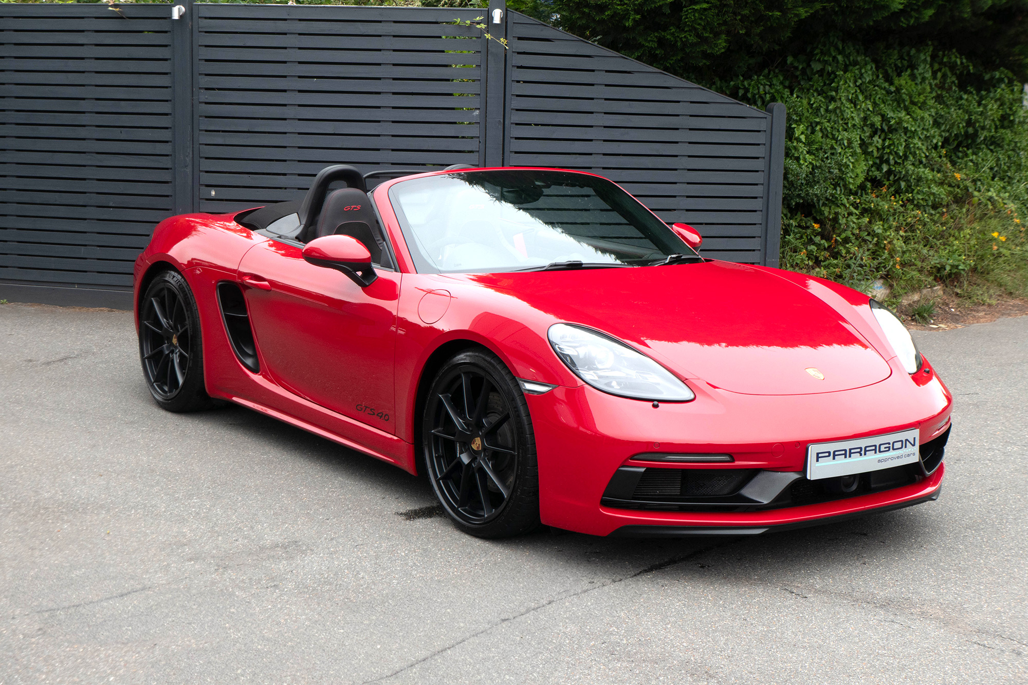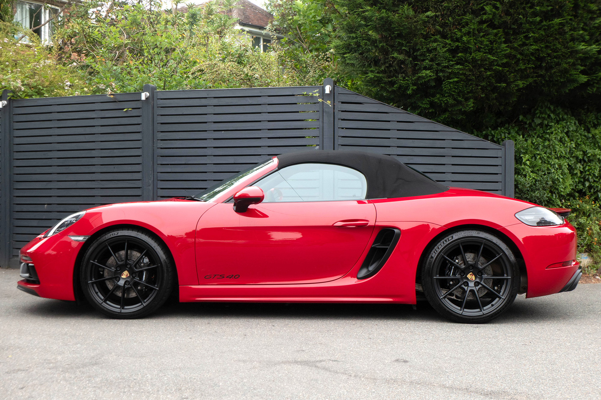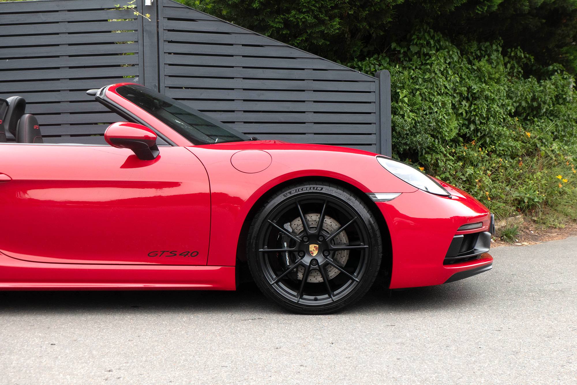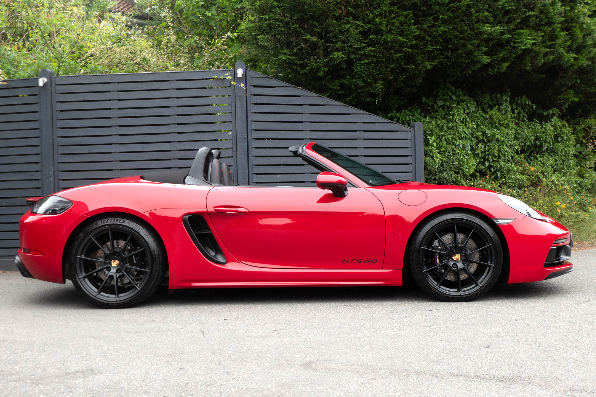 This Boxster GTS 4.0 (718) has the 7-speed PDK gearbox and is presented in Carmine Red with black half leather sports seats and a black power hood.