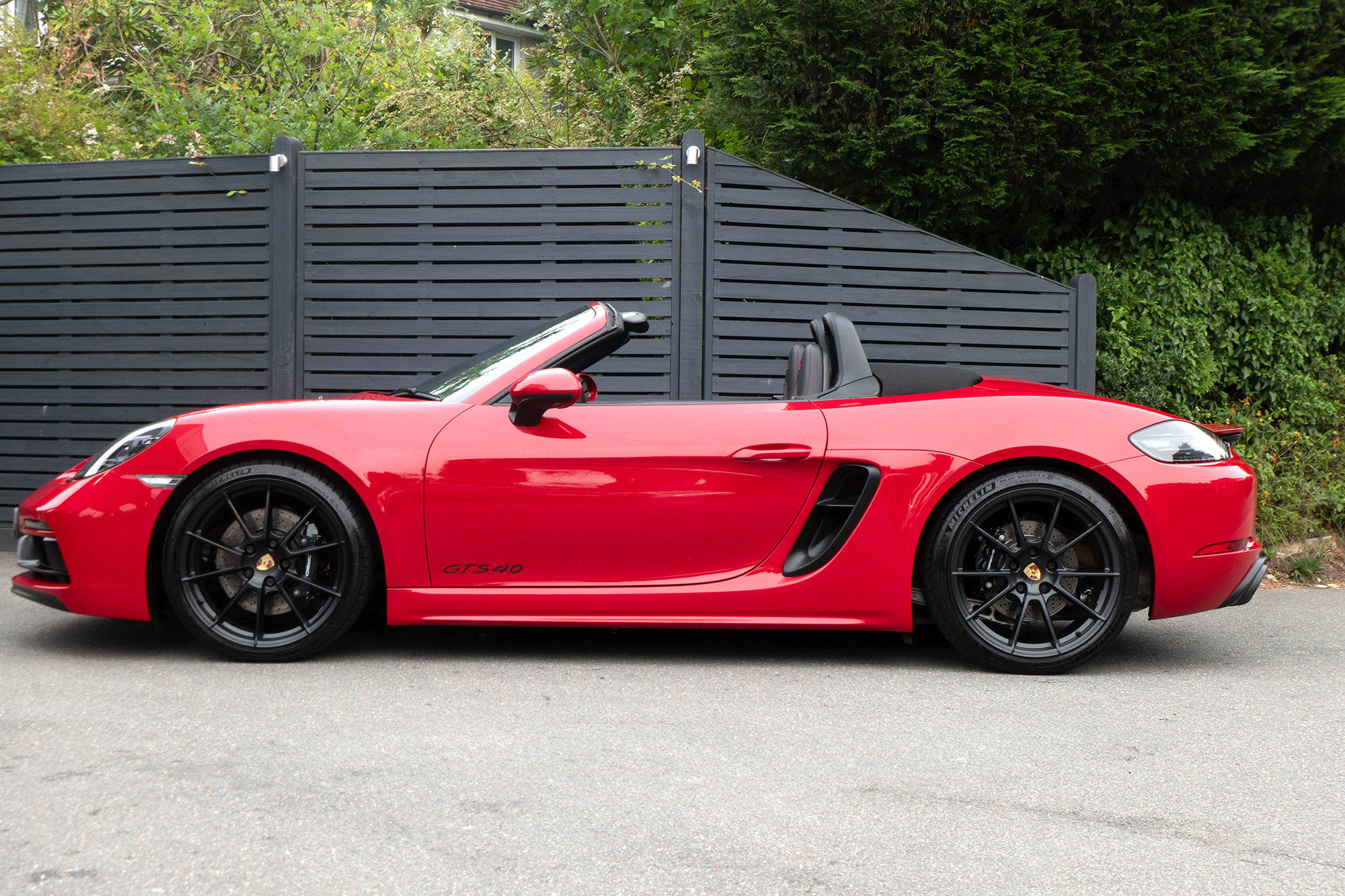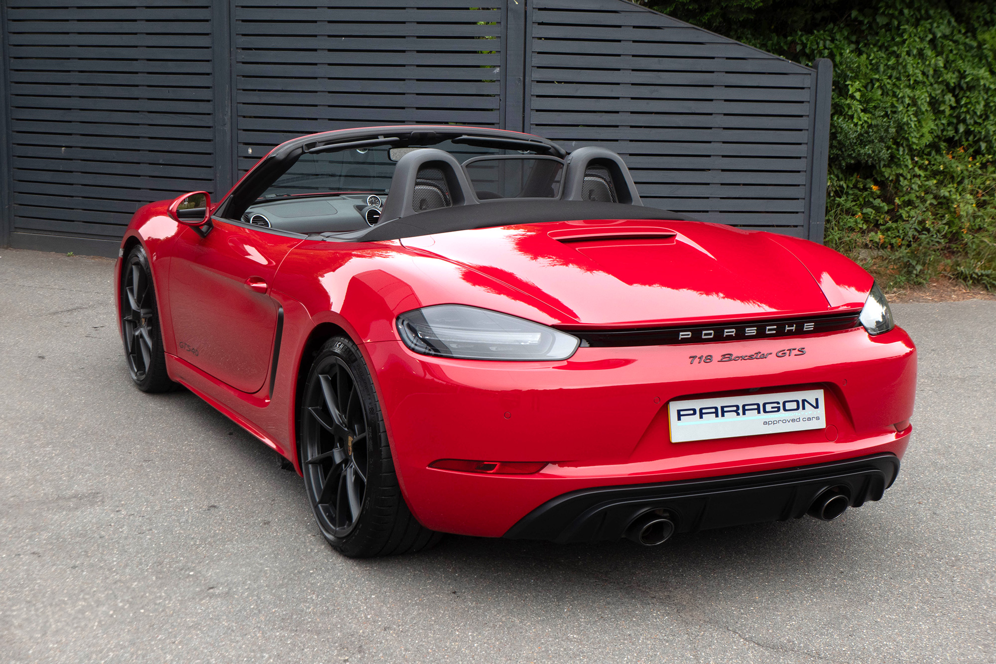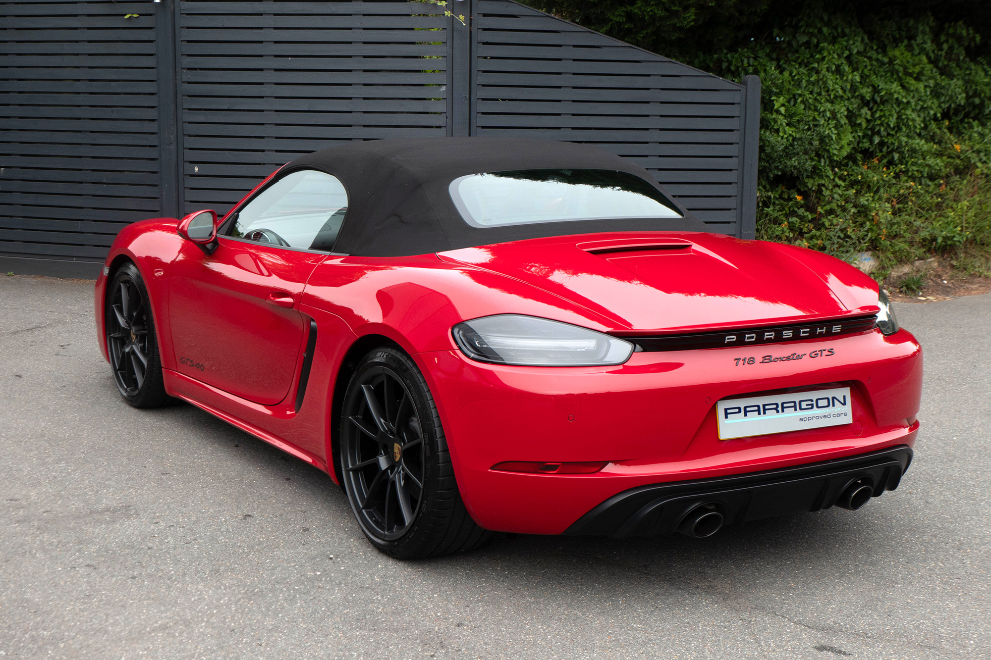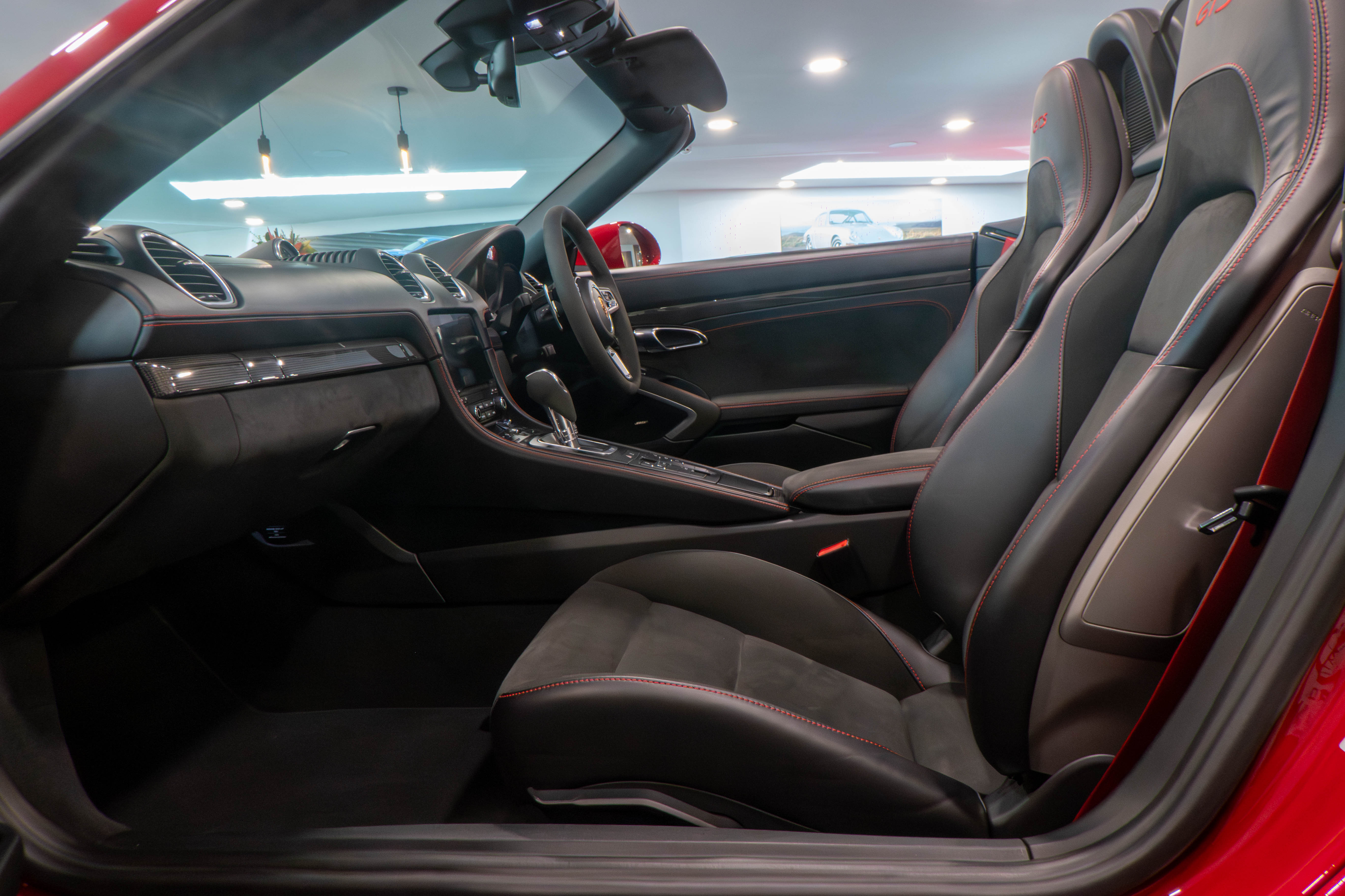 This Boxster GTS 4.0 (718) has the 7-speed PDK gearbox and is presented in Carmine Red with black half leather sports seats and a black power hood.