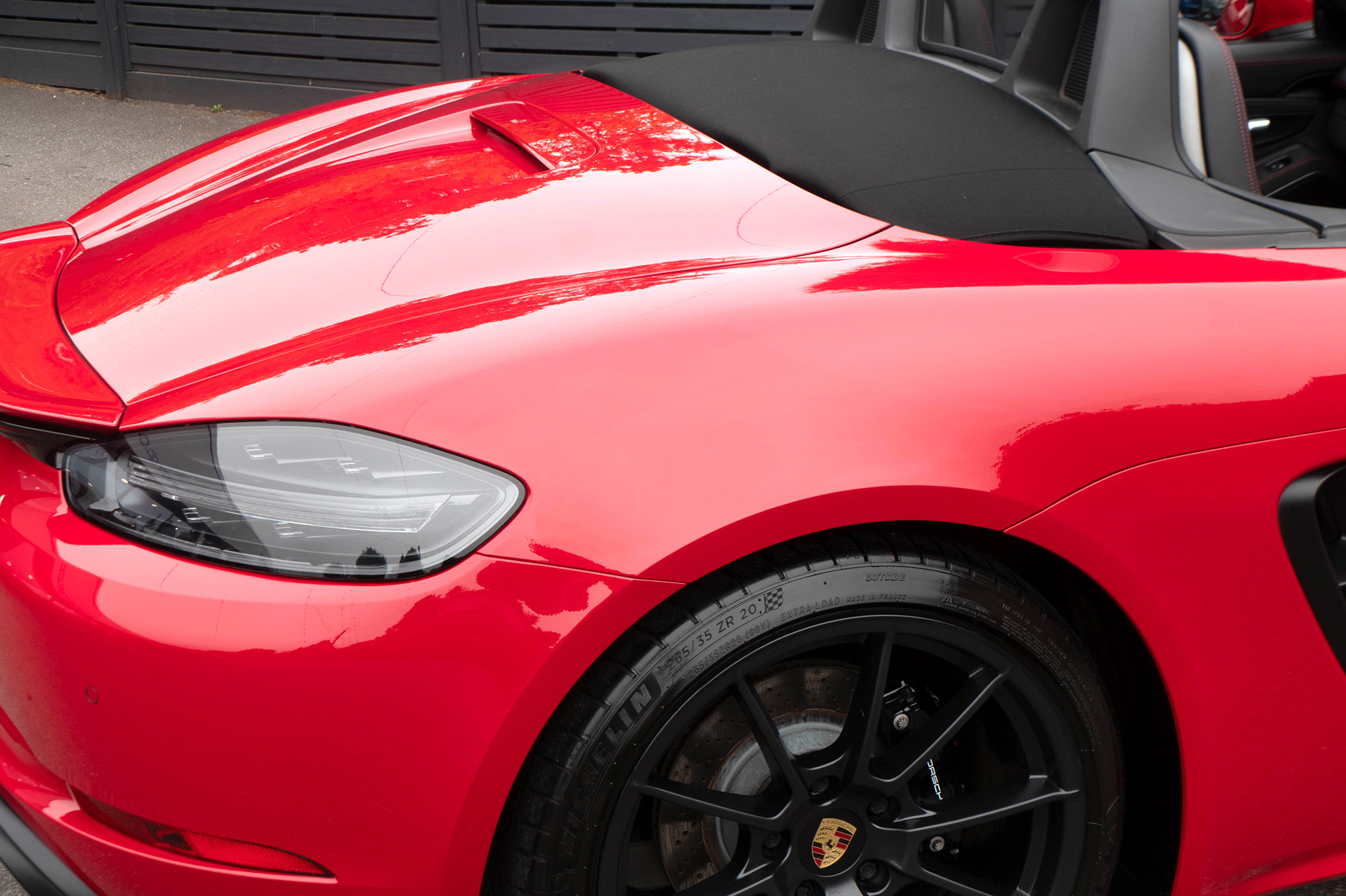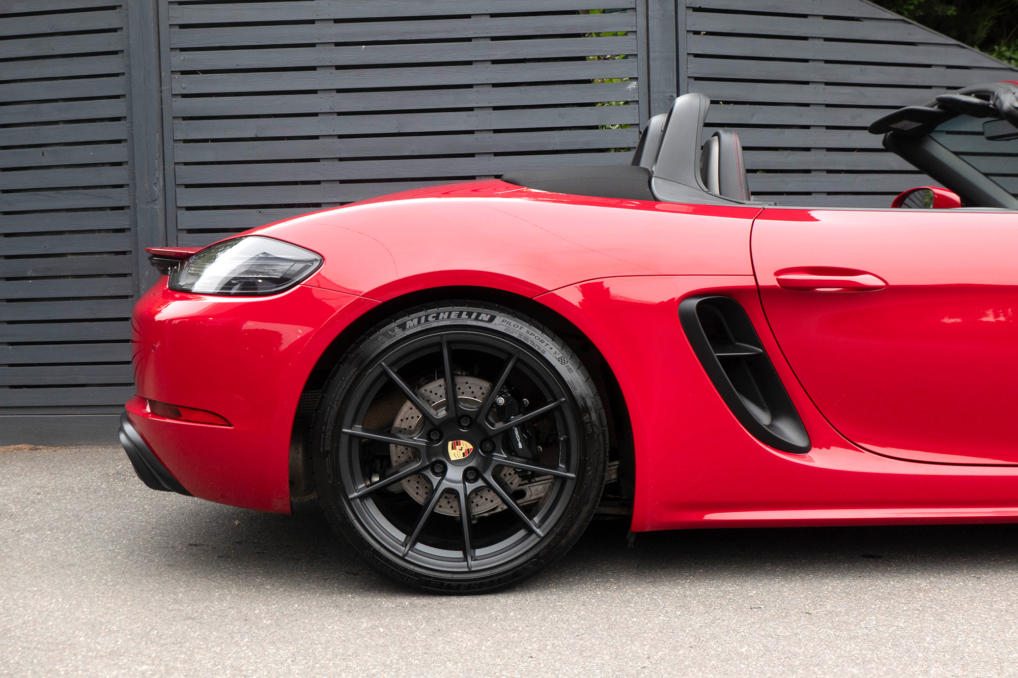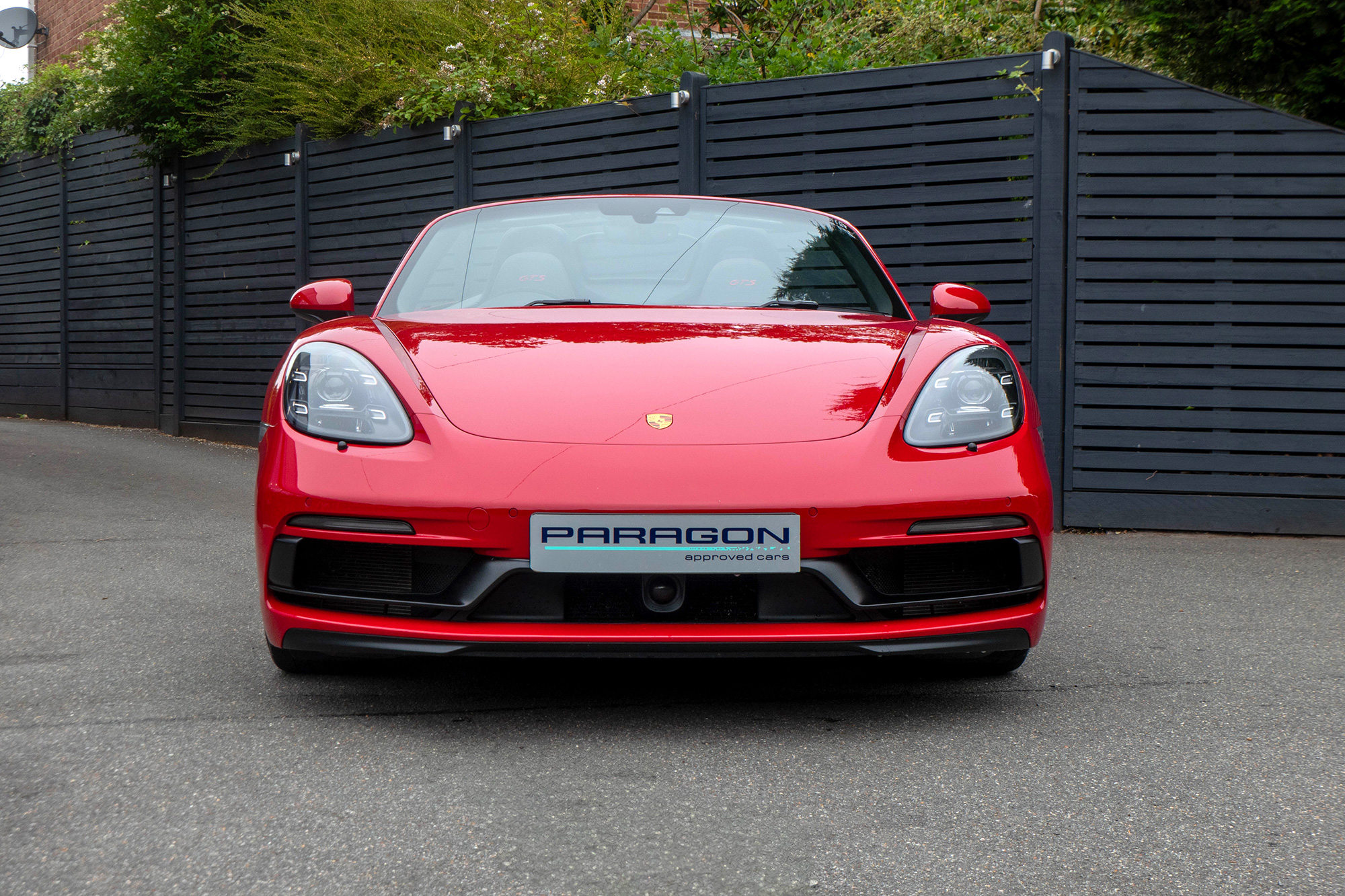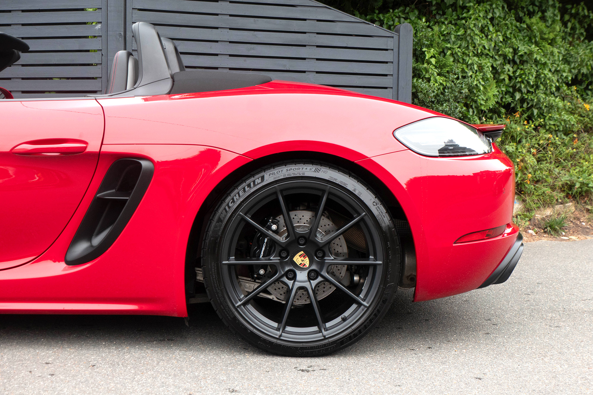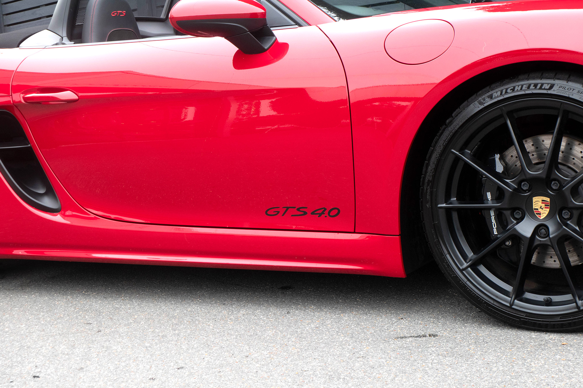 This Boxster GTS 4.0 (718) has the 7-speed PDK gearbox and is presented in Carmine Red with black half leather sports seats and a black power hood.
