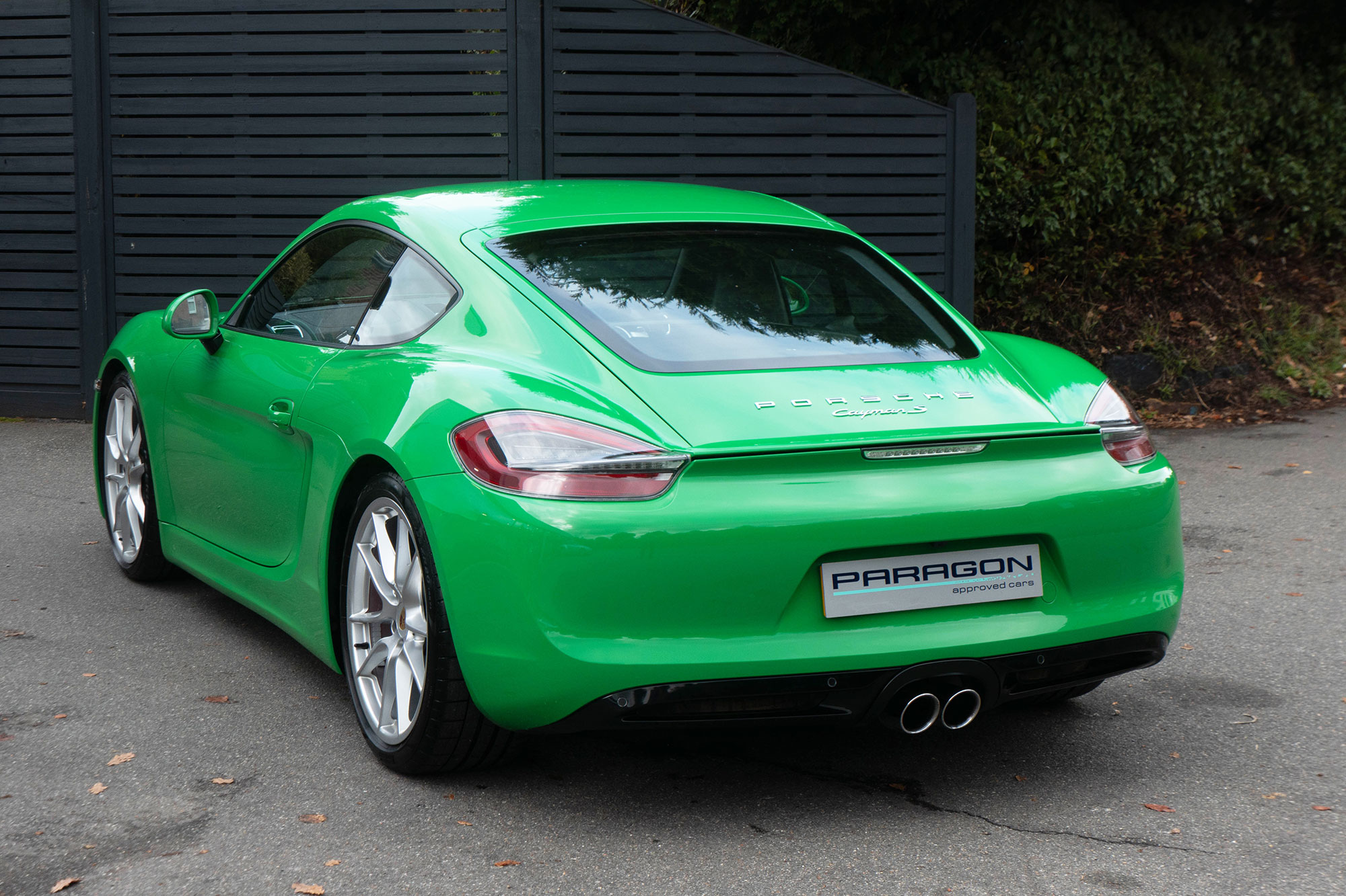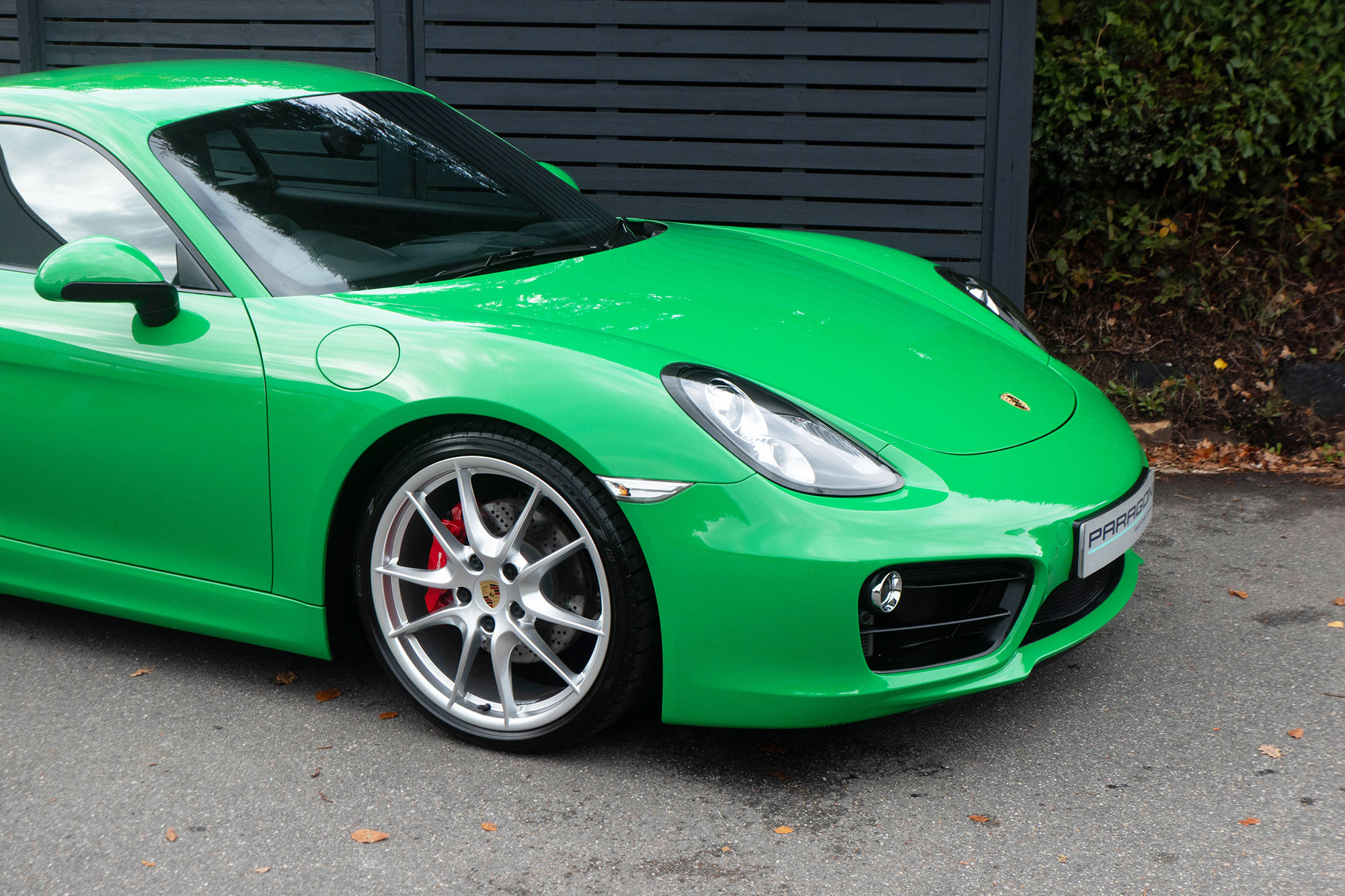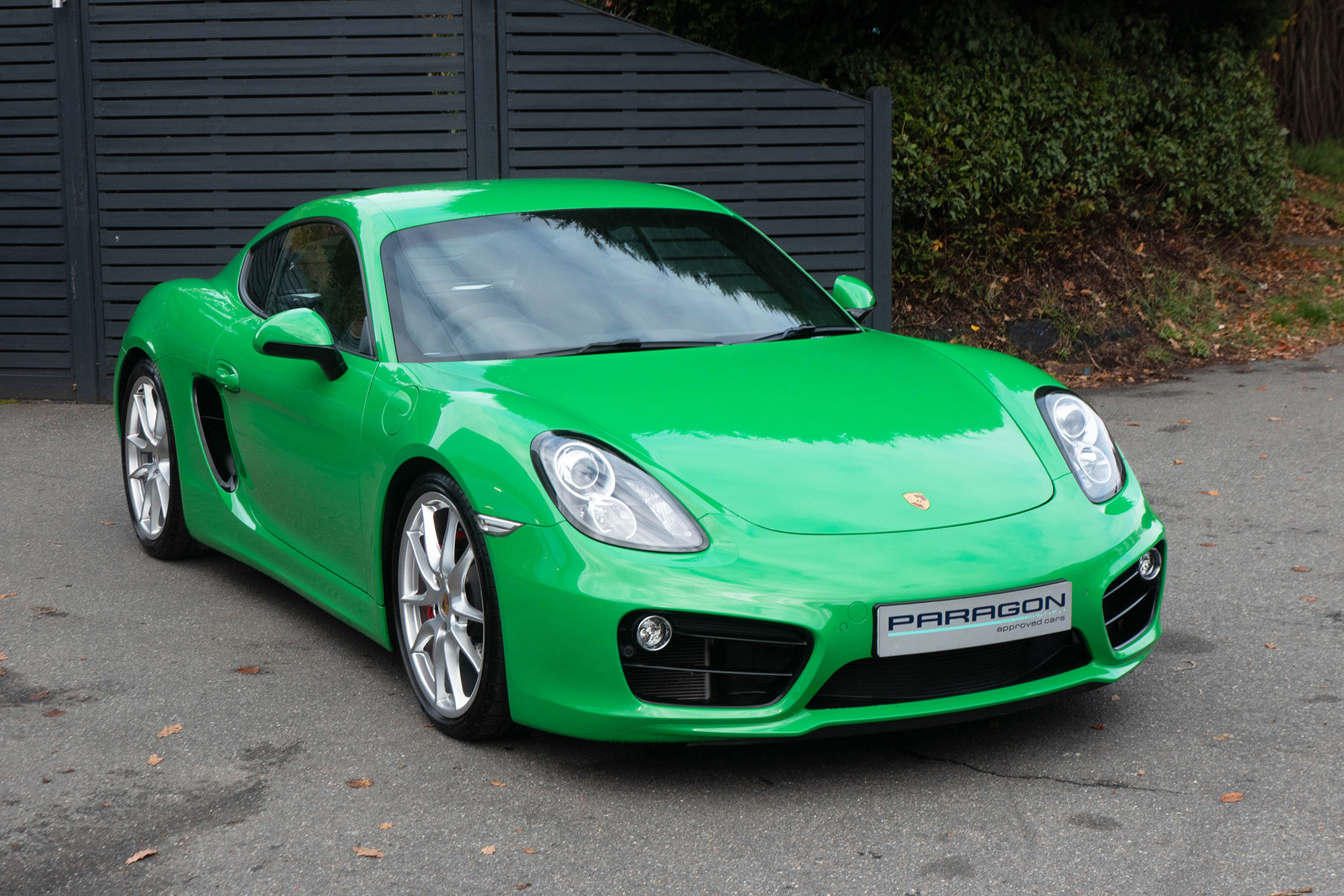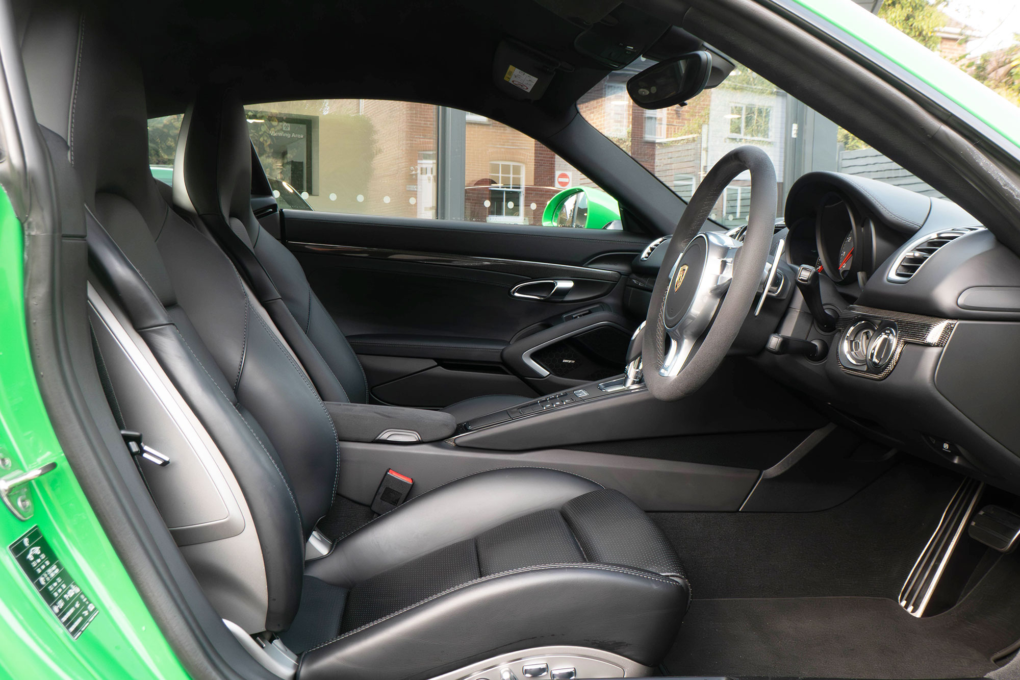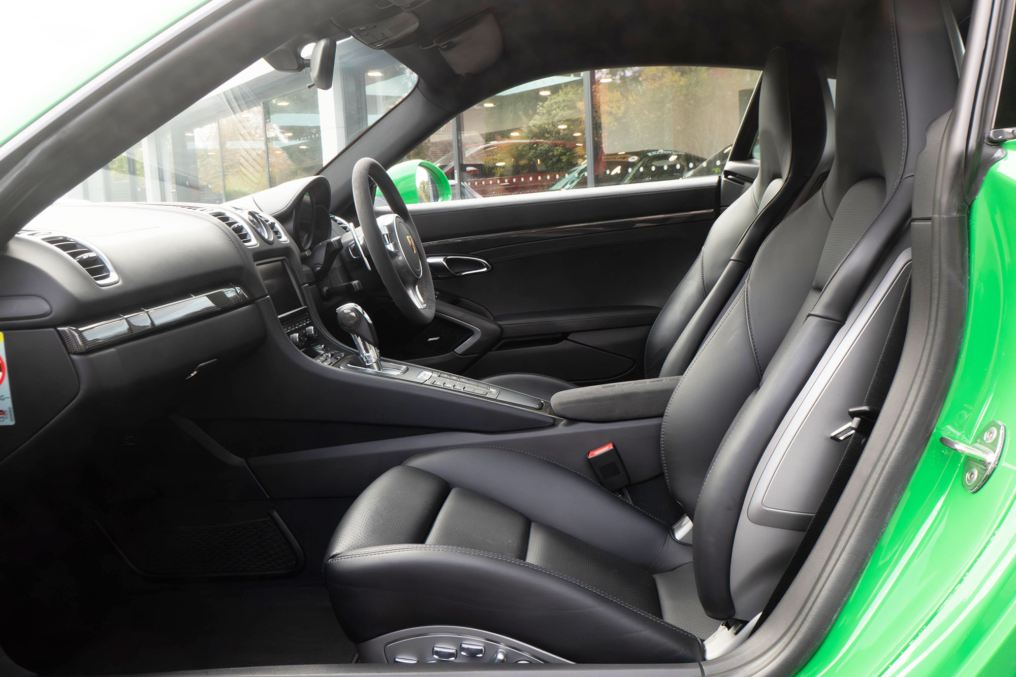 This Cayman S (981) has the 7-speed PDK gearbox and is presented in the special order colour of Viper Green with black leather sports seats.