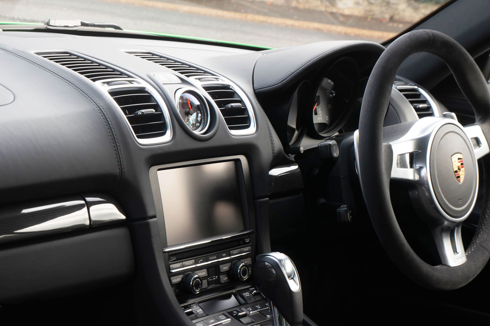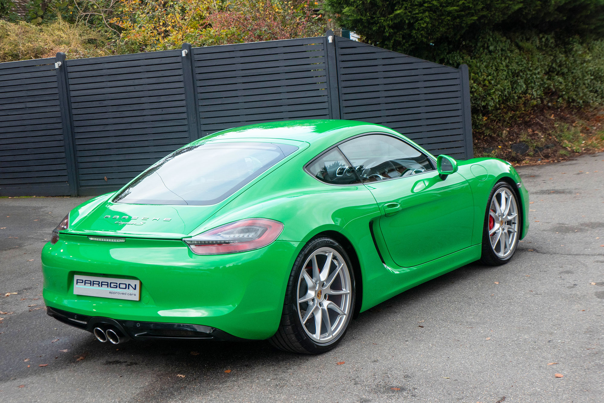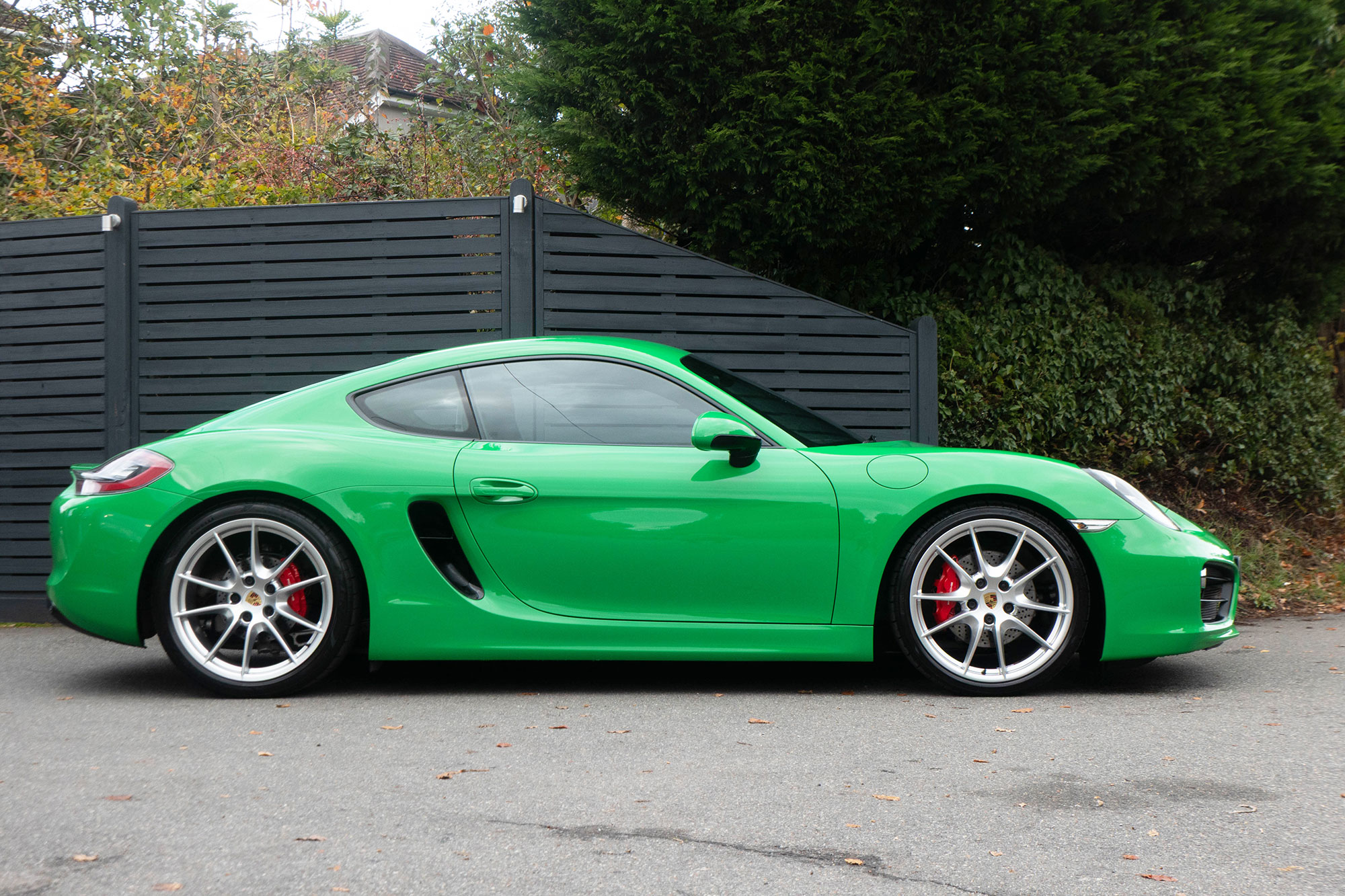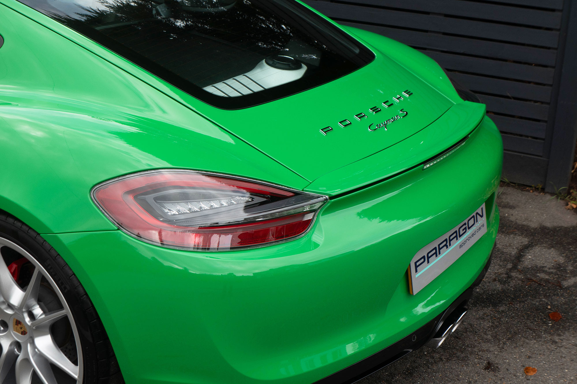 This Cayman S (981) has the 7-speed PDK gearbox and is presented in the special order colour of Viper Green with black leather sports seats.
