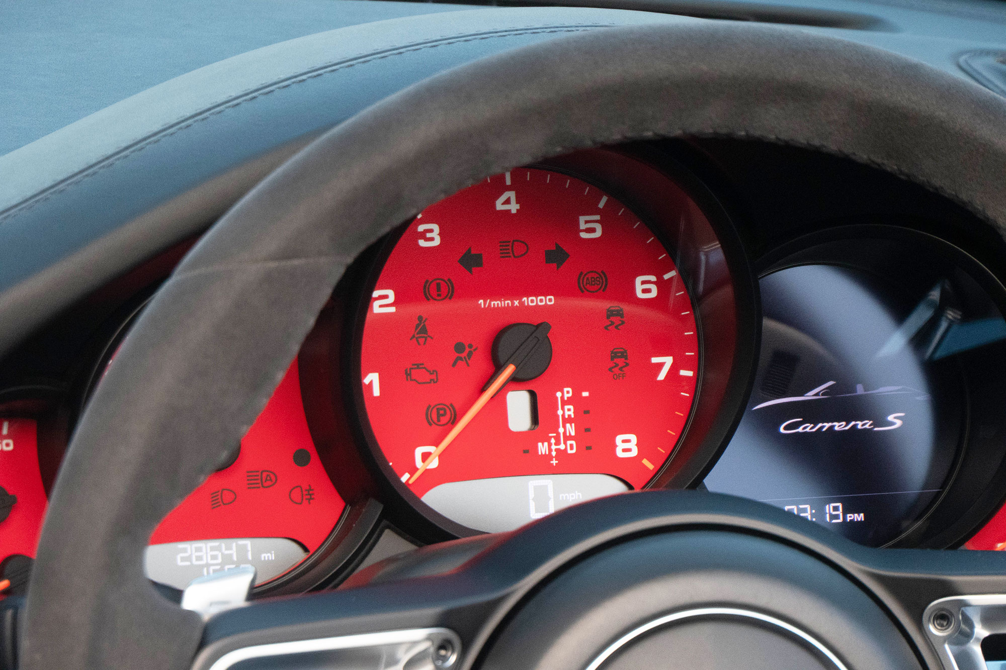 Factory-fitted options include 20" Carrera Classic wheels, the 7-speed PDK gearbox, a BOSE sound system, the Carbon Interior Pack, the dials finished in Carmine Red, Porsche embossed crested headrests, sports seats, a switchable sports exhaust, front & rear parking sensors, a reverse camera, the leather stitched in red and heated seats.
