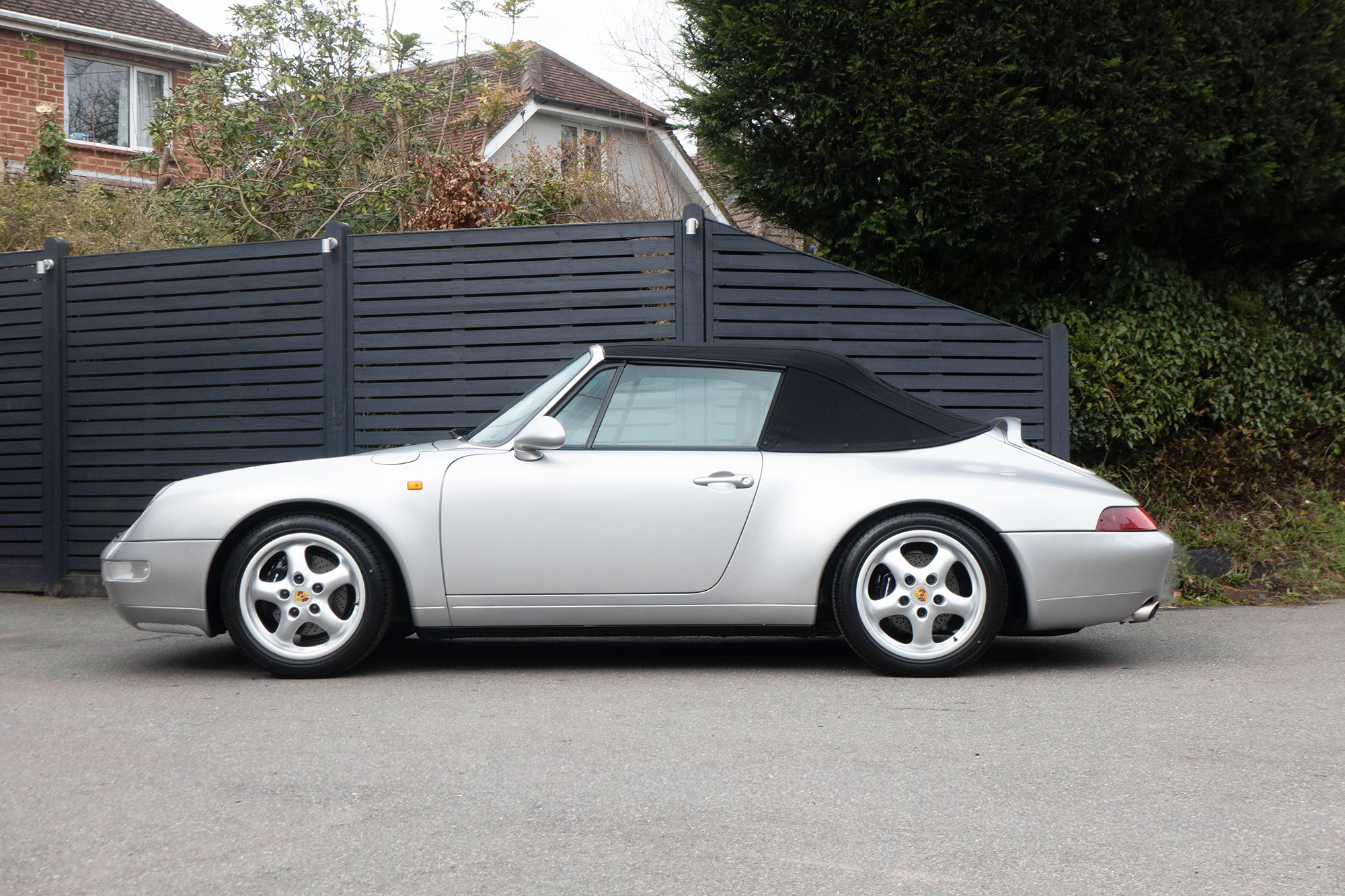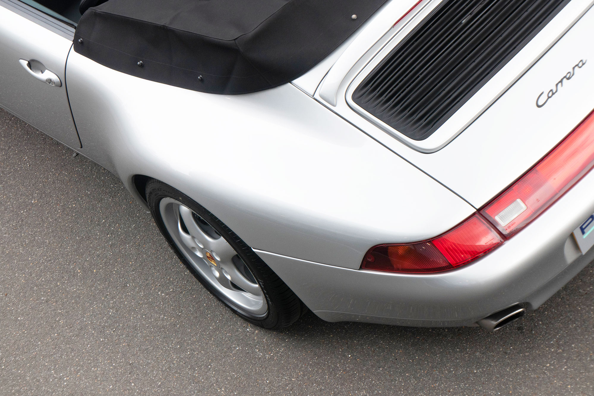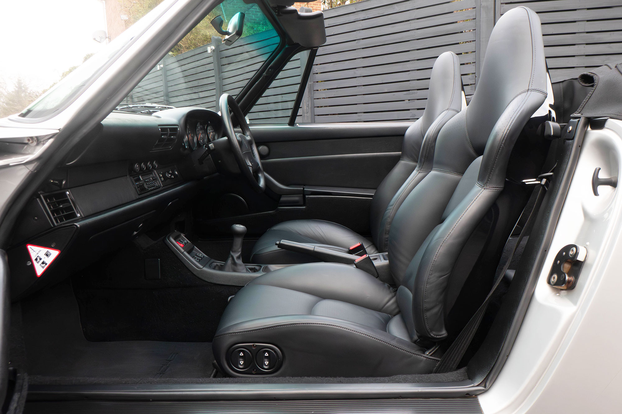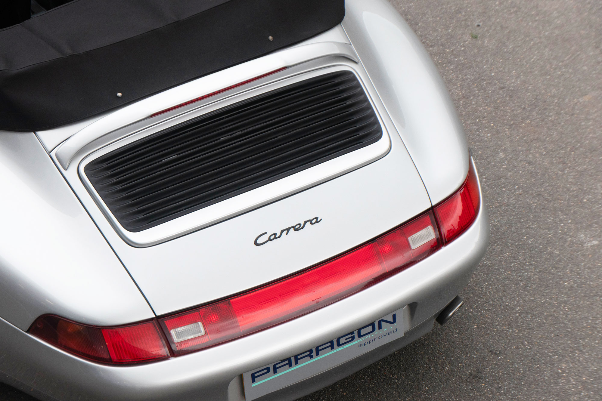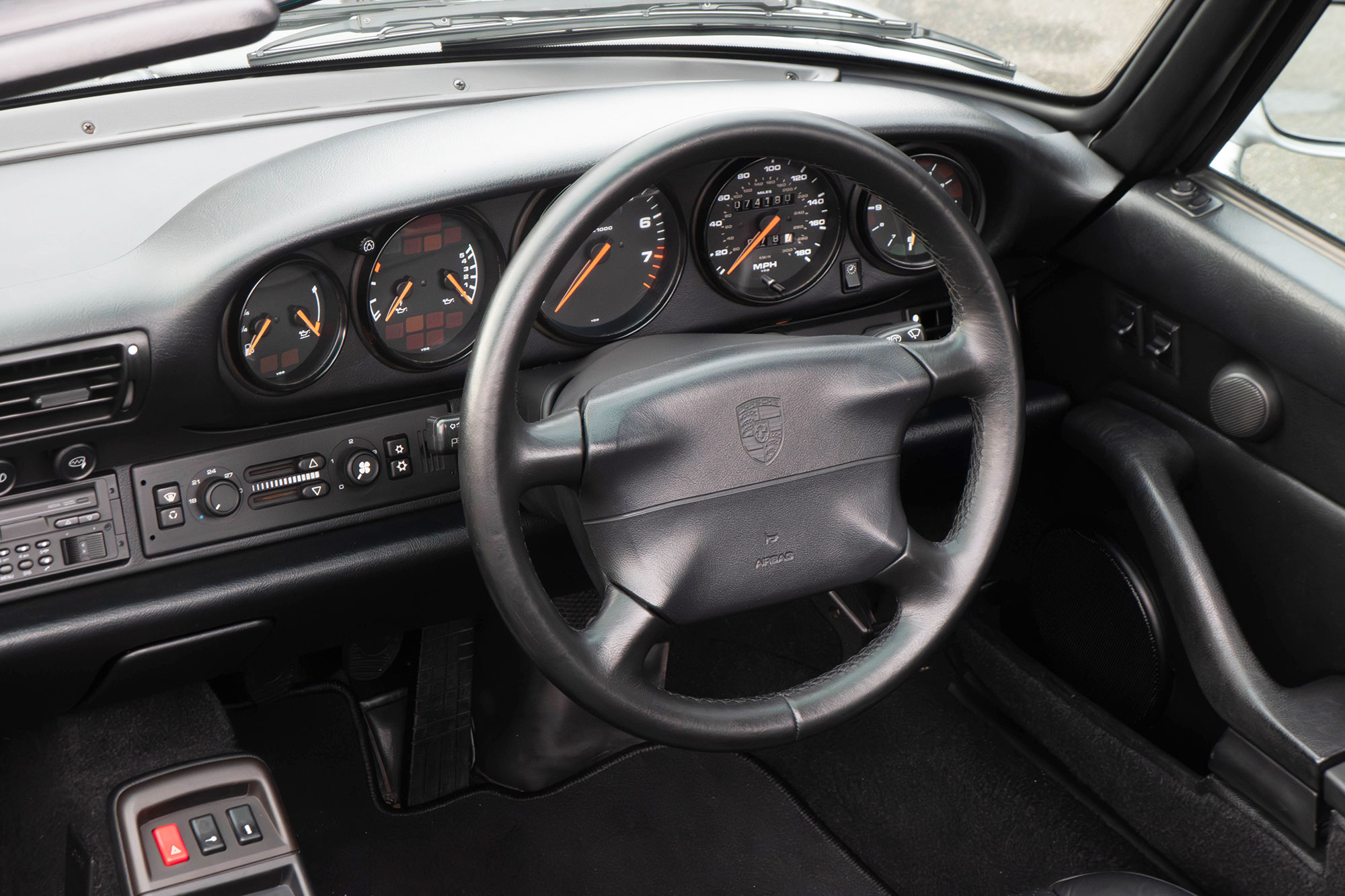 This 911 Carrera 2 cabriolet (993) has the 6-speed manual gearbox and is presented in Arctic Silver with black leather hard backed sports seats and a black fully electric roof.