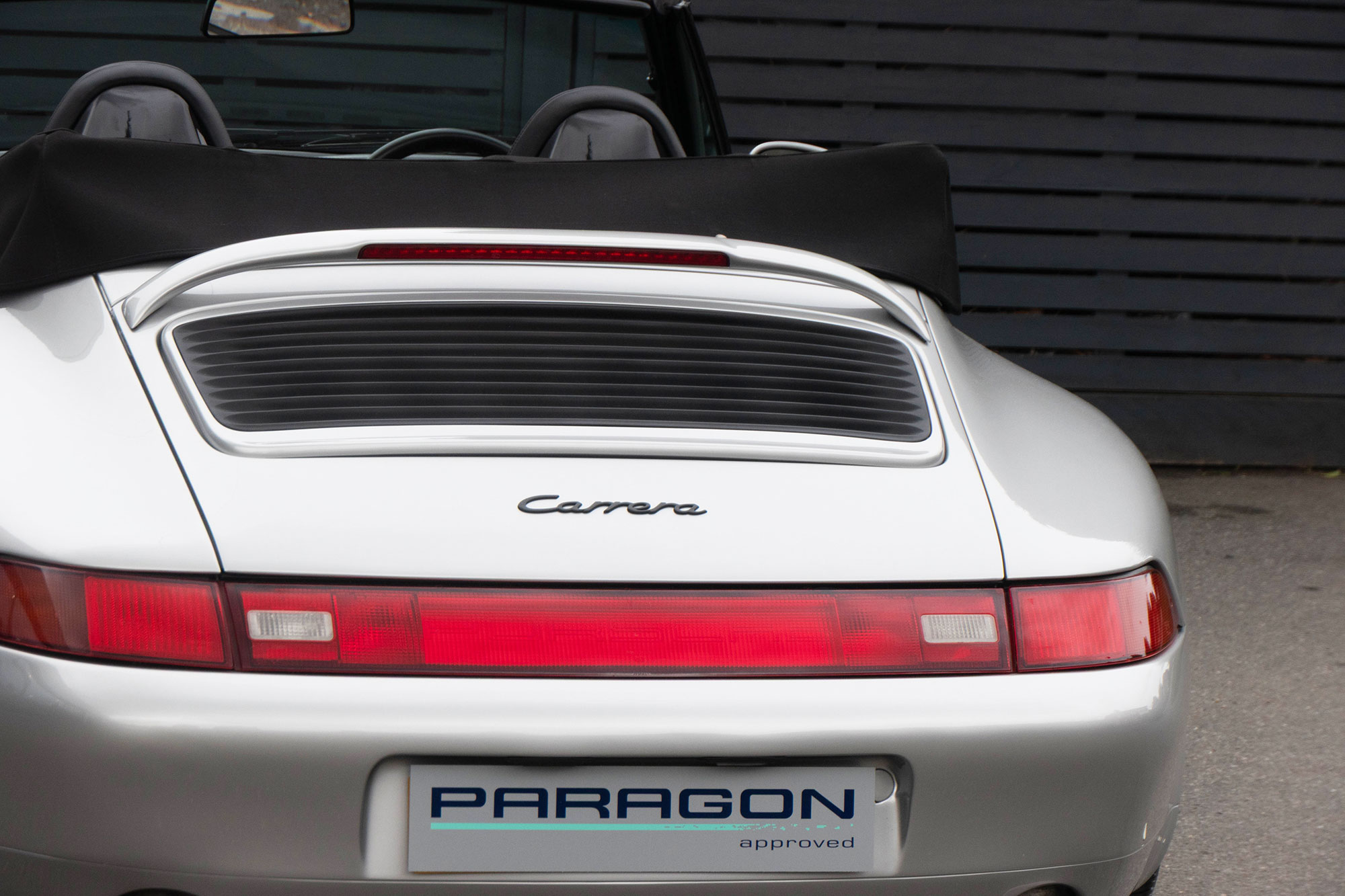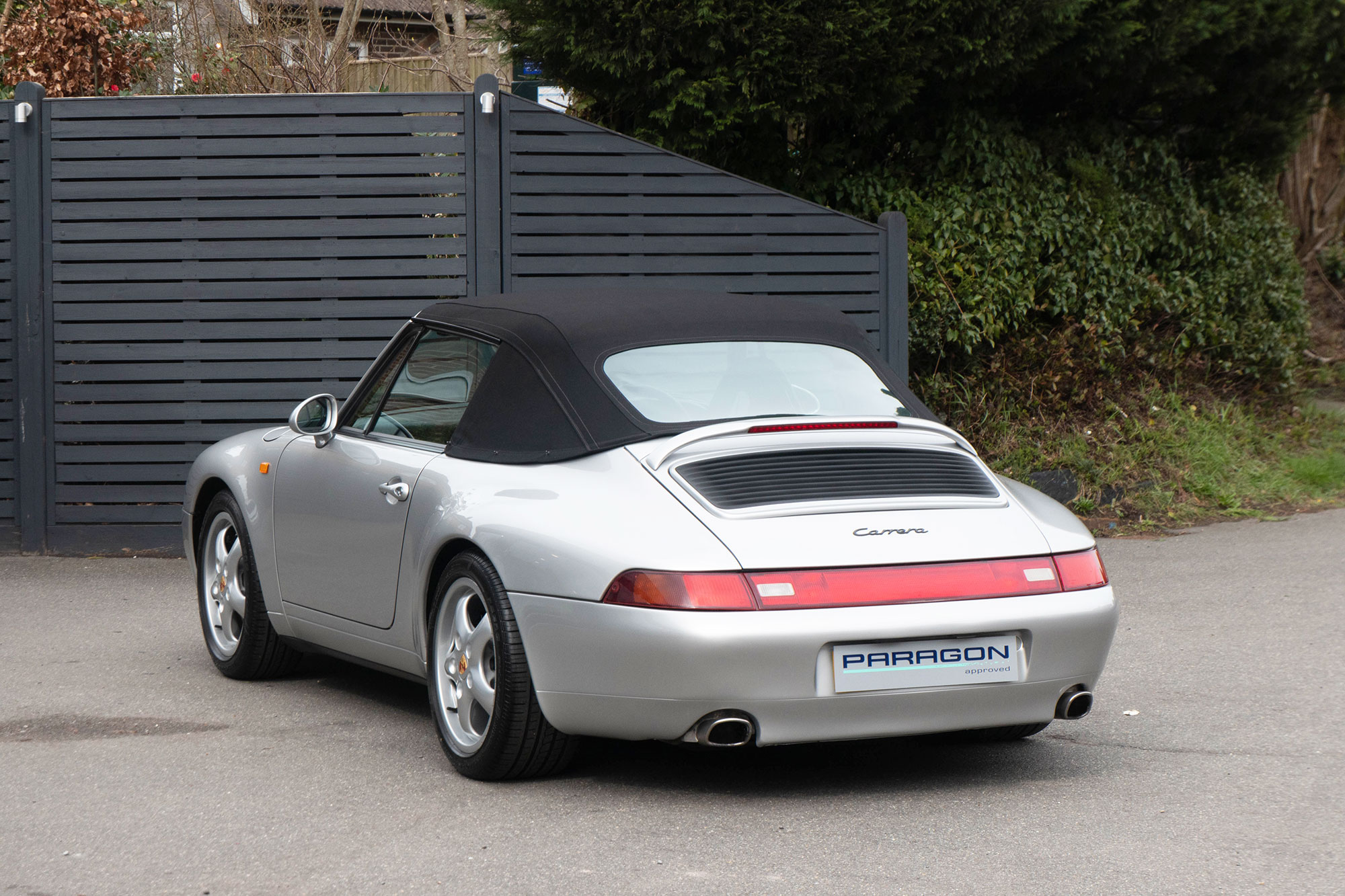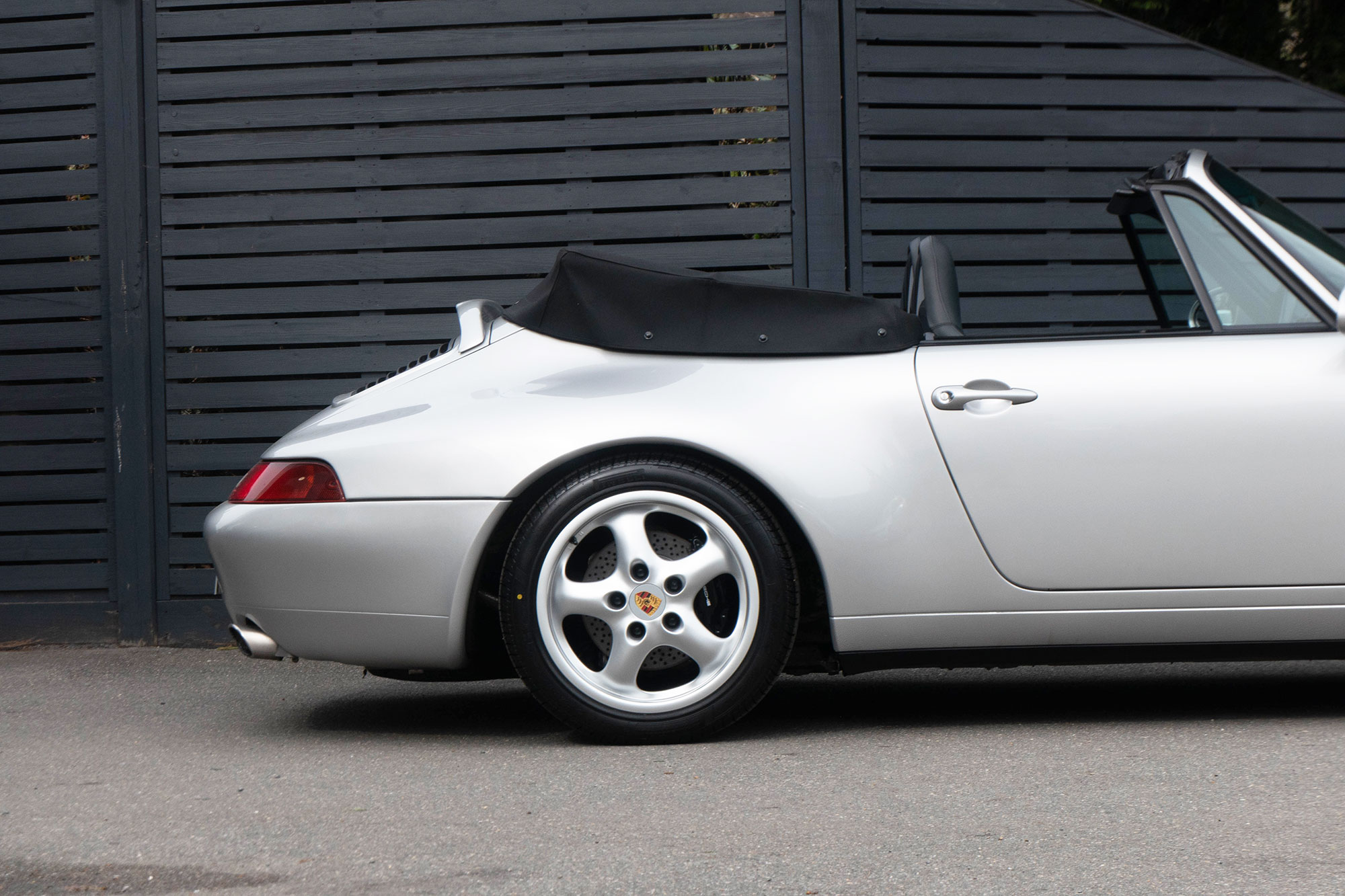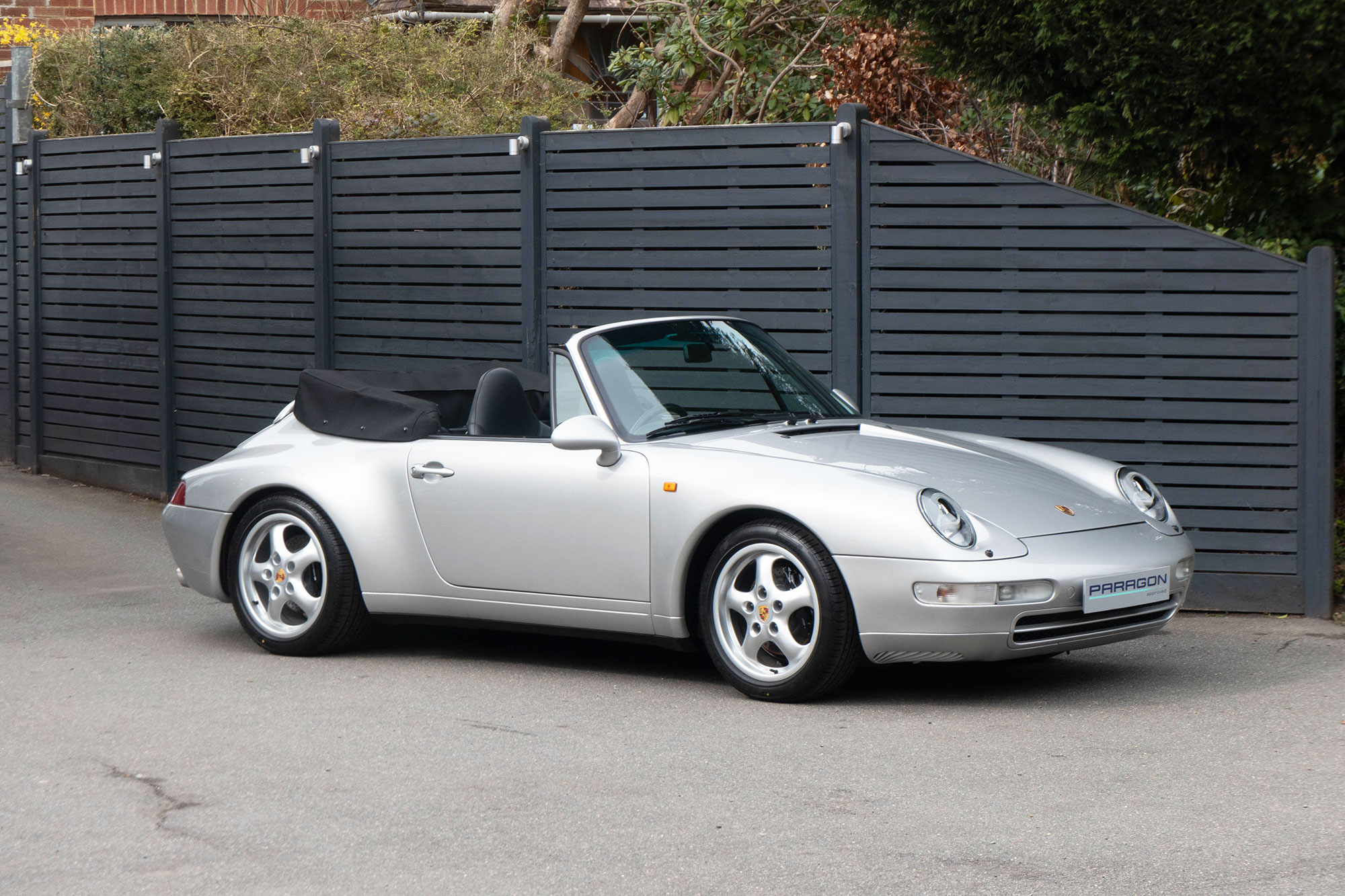 This 911 Carrera 2 cabriolet (993) has the 6-speed manual gearbox and is presented in Arctic Silver with black leather hard backed sports seats and a black fully electric roof.