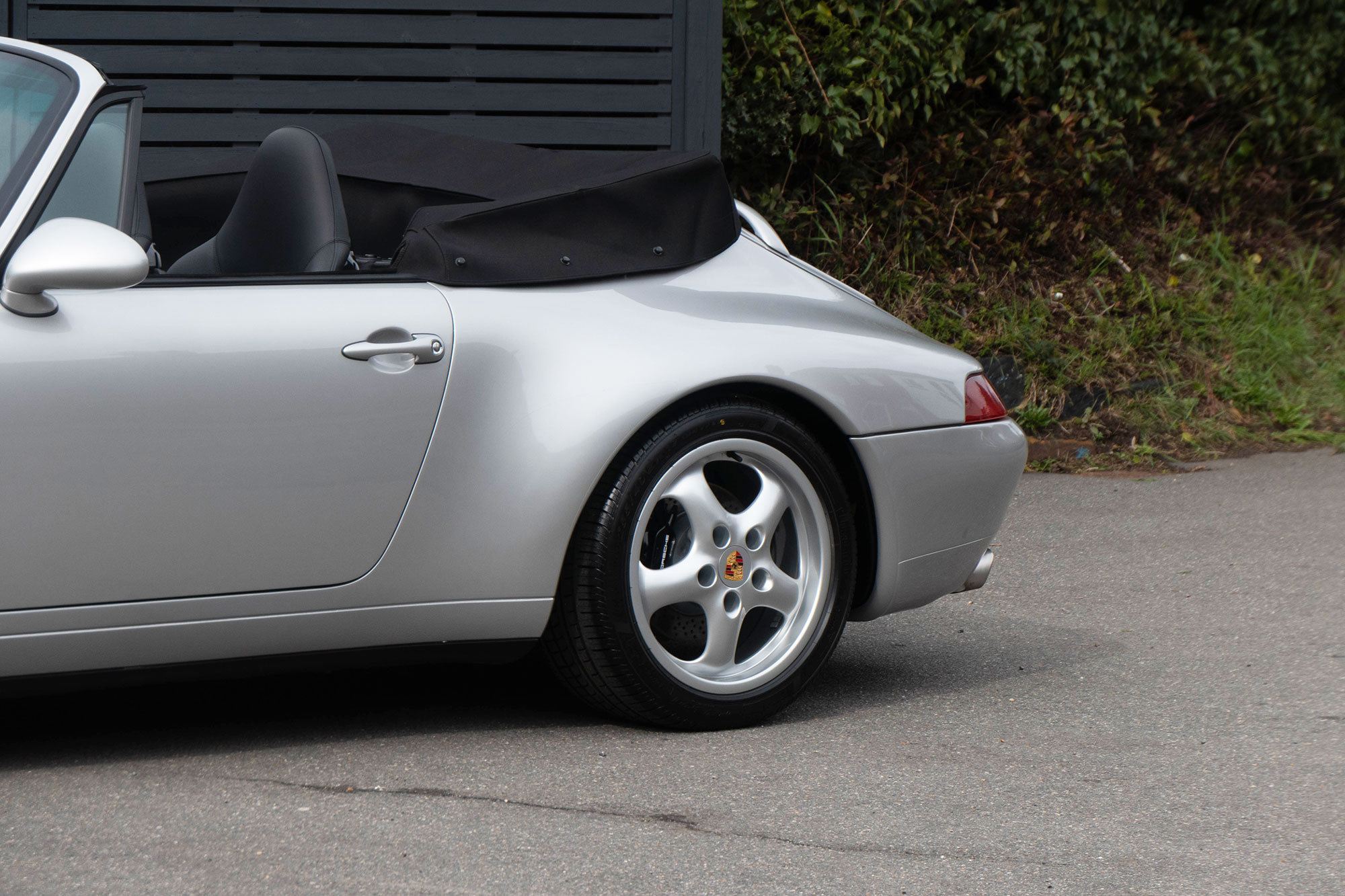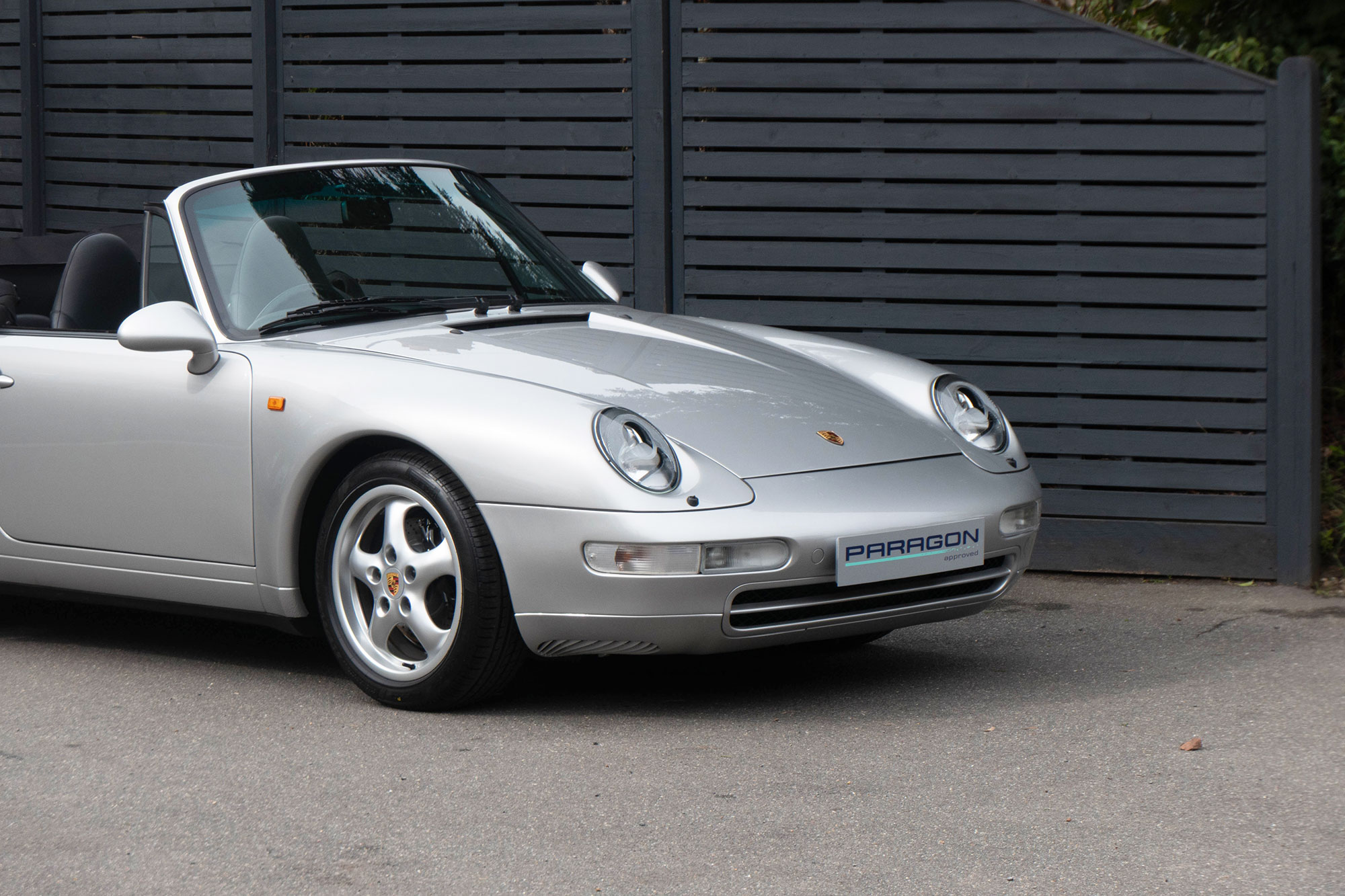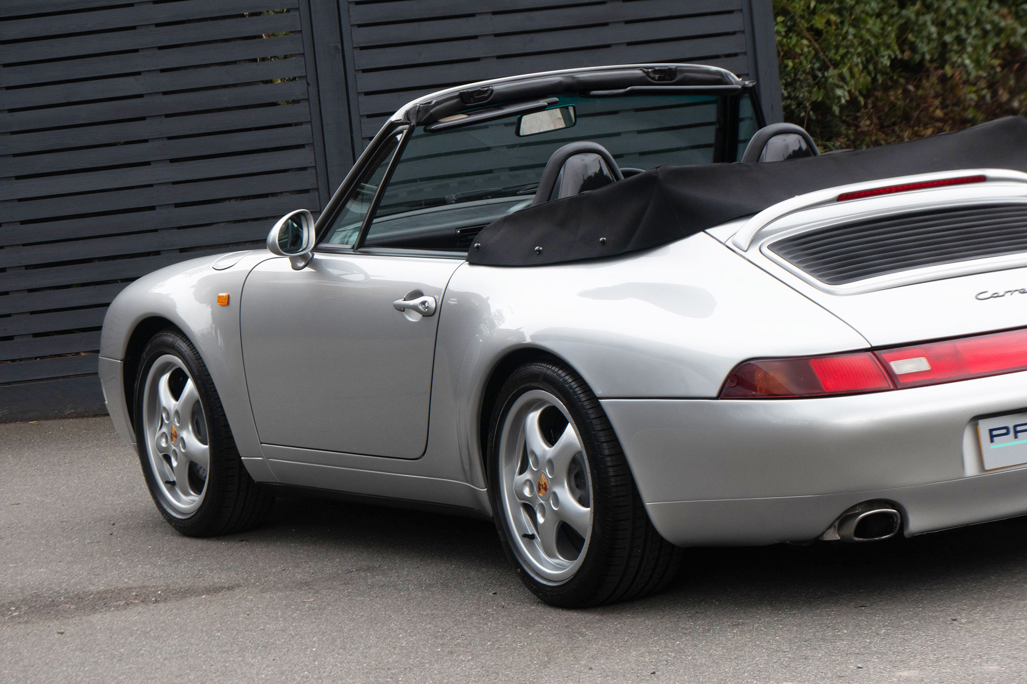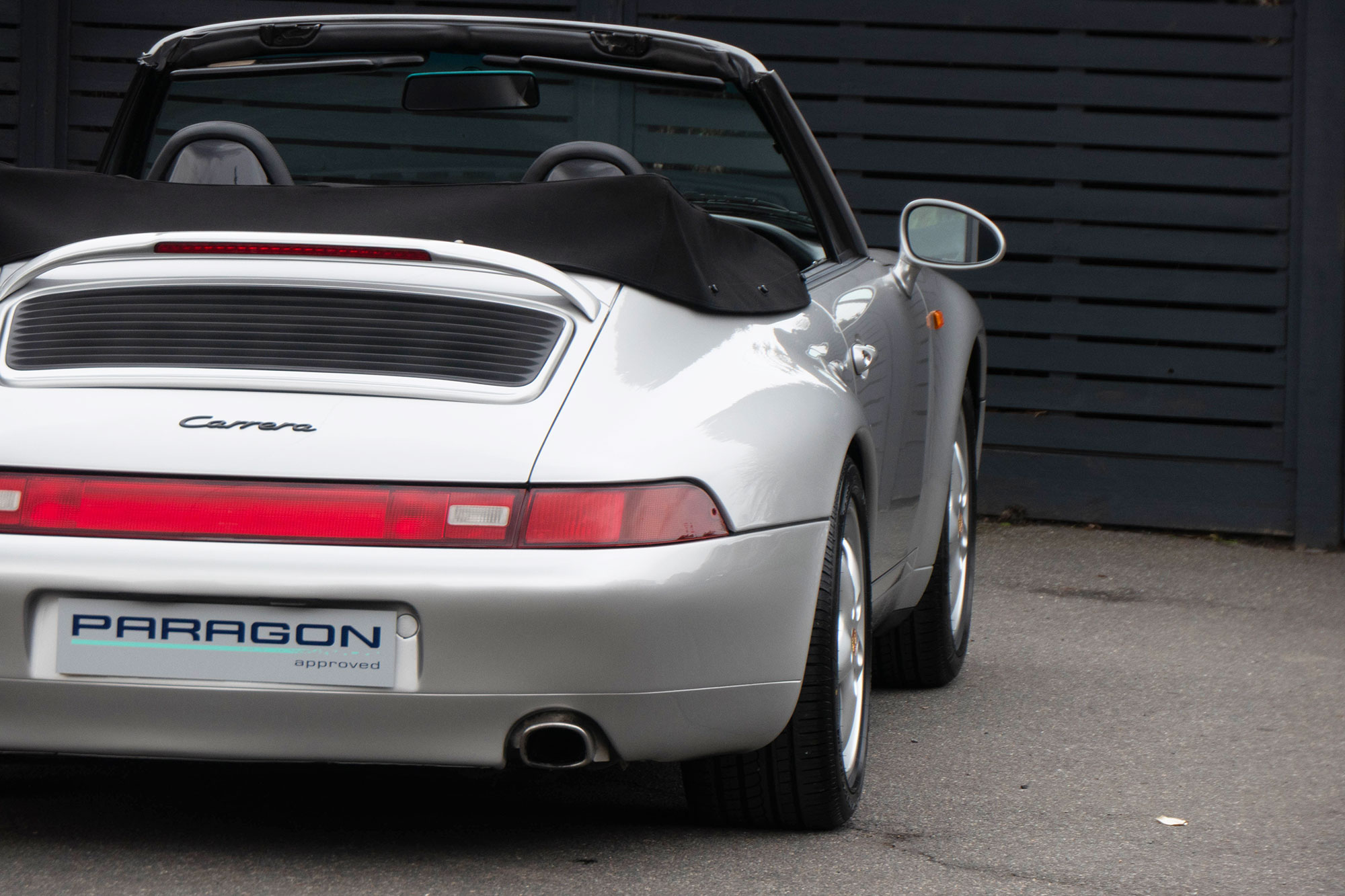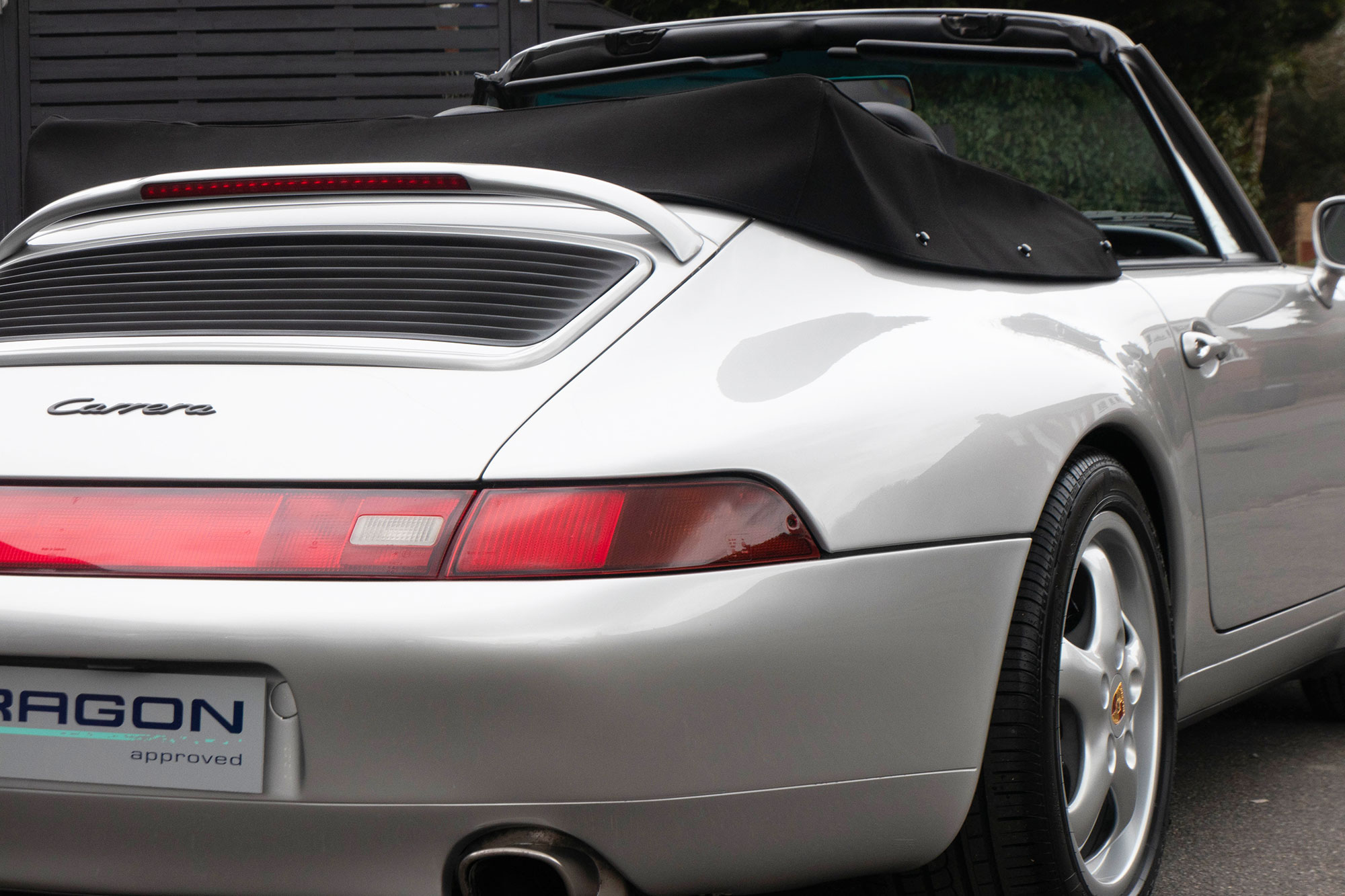 This 911 Carrera 2 cabriolet (993) has the 6-speed manual gearbox and is presented in Arctic Silver with black leather hard backed sports seats and a black fully electric roof.
