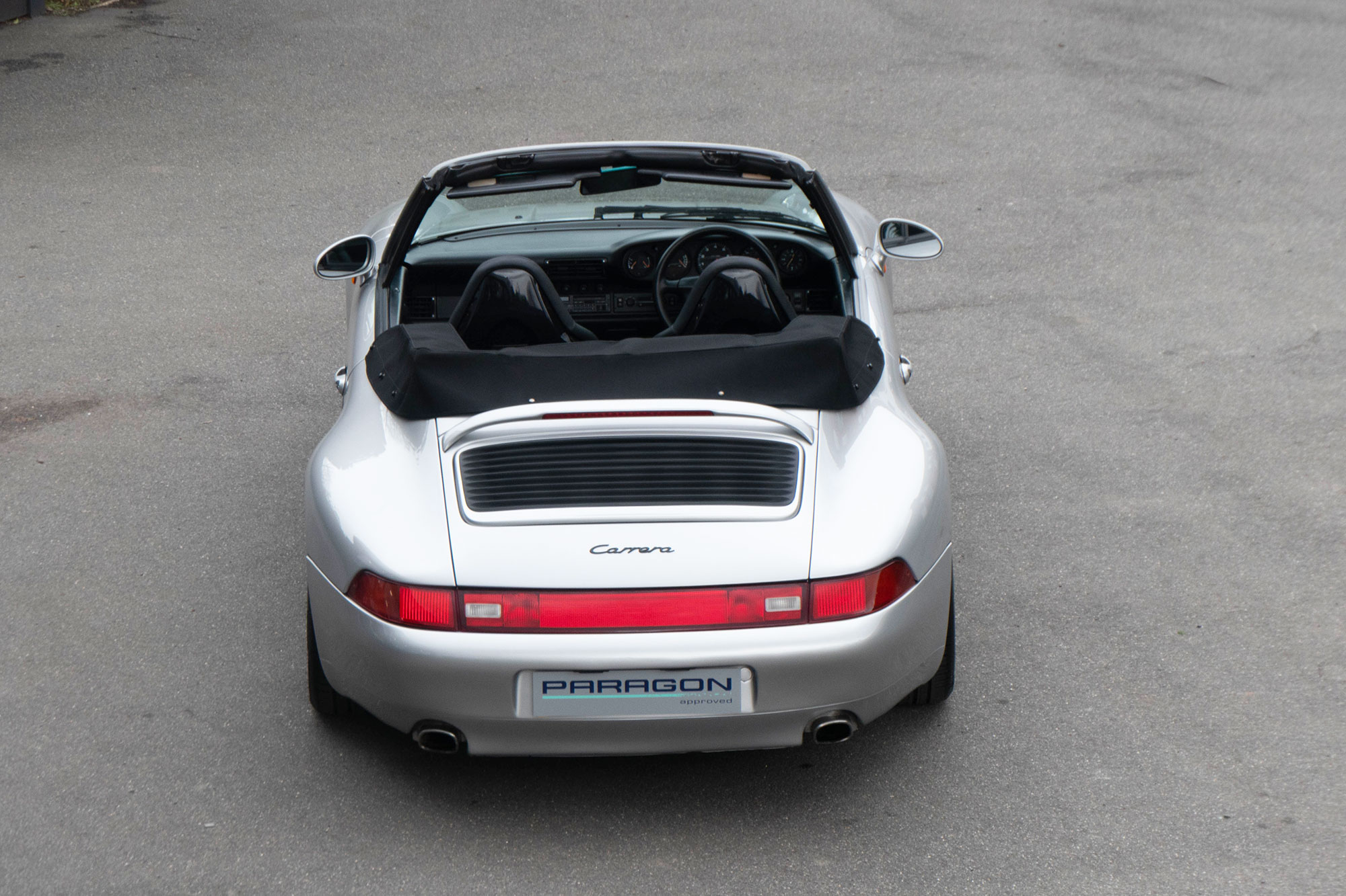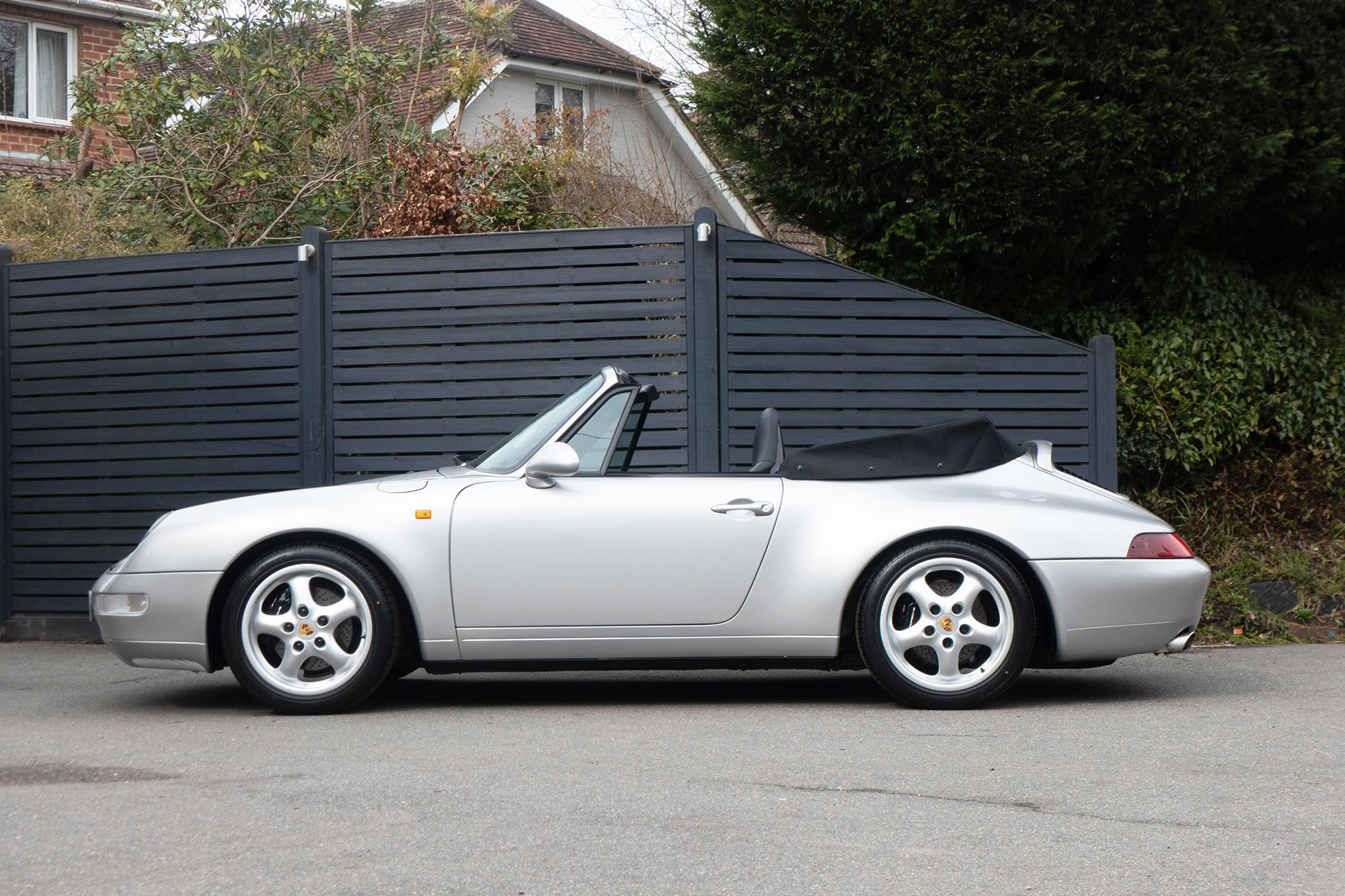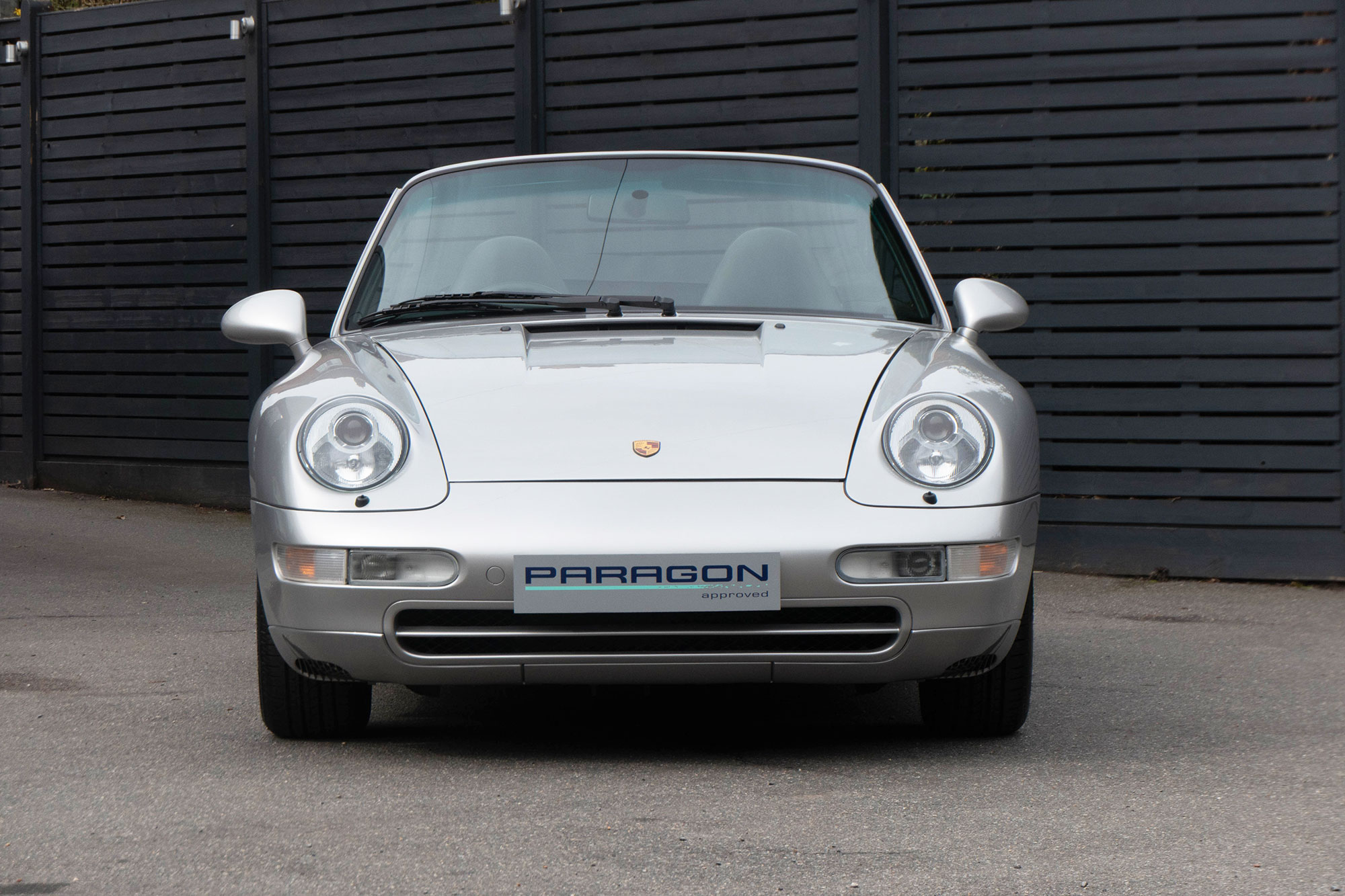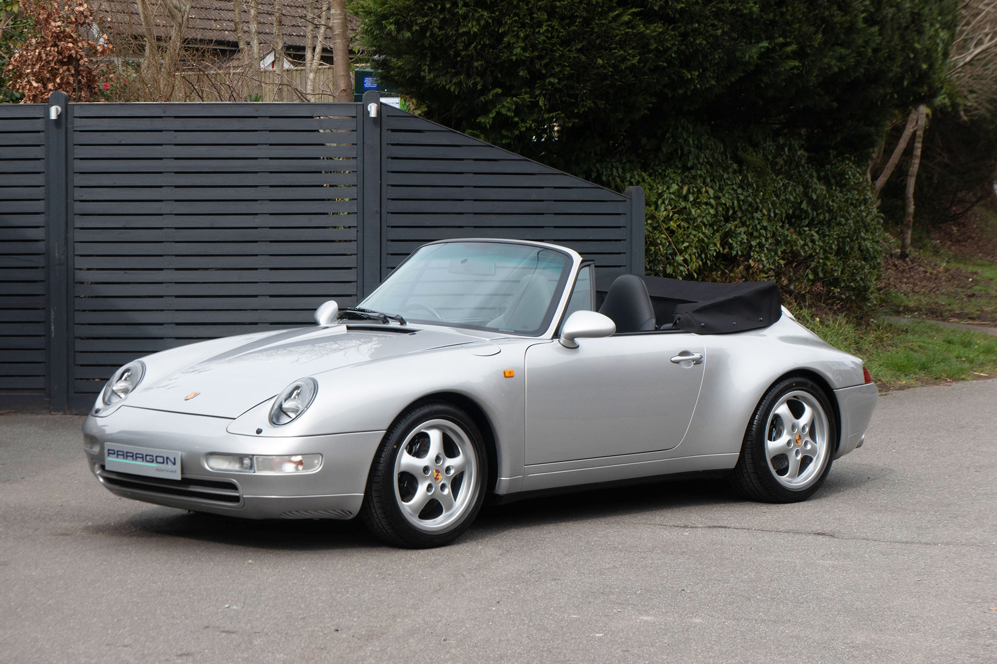 This 911 Carrera 2 cabriolet (993) has the 6-speed manual gearbox and is presented in Arctic Silver with black leather hard backed sports seats and a black fully electric roof.