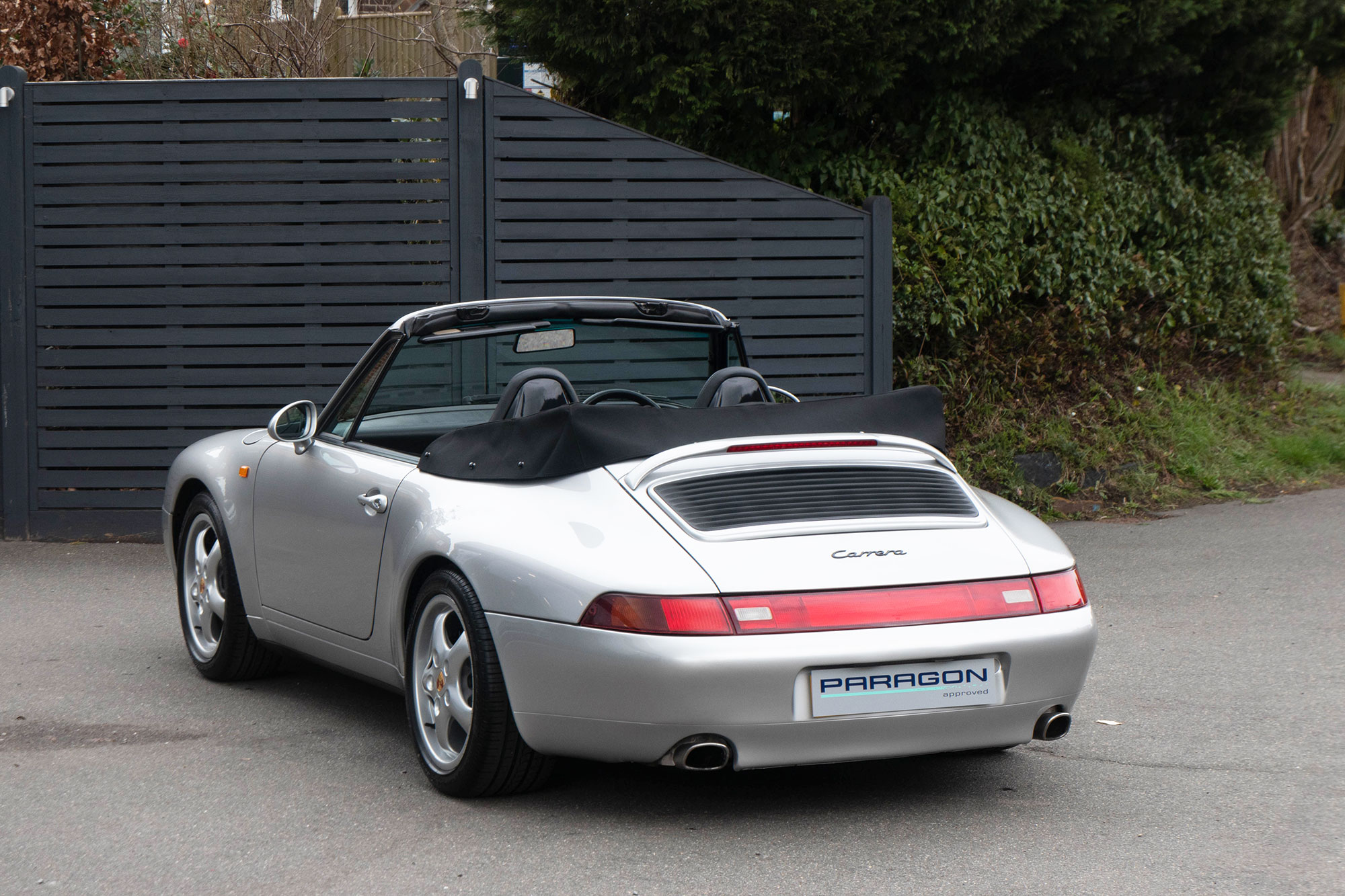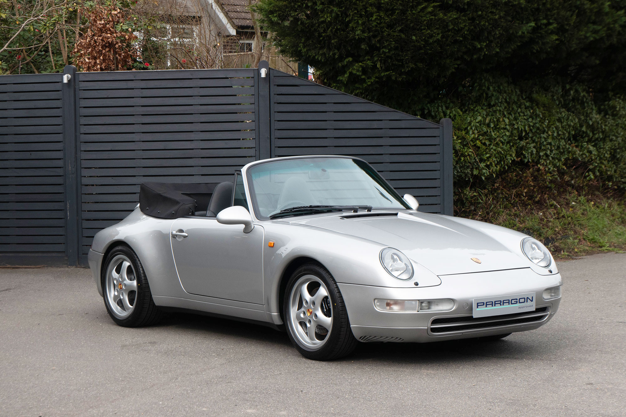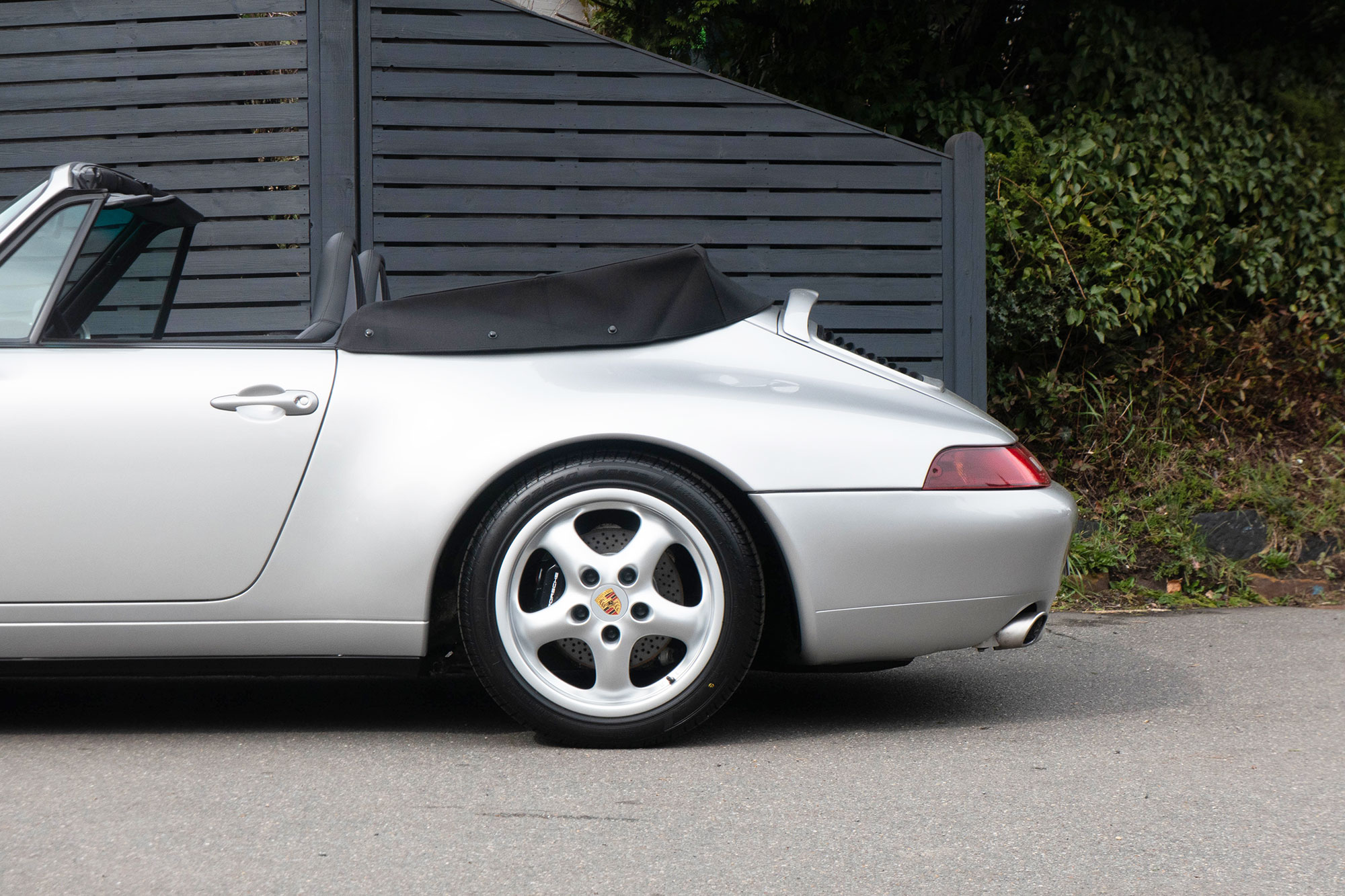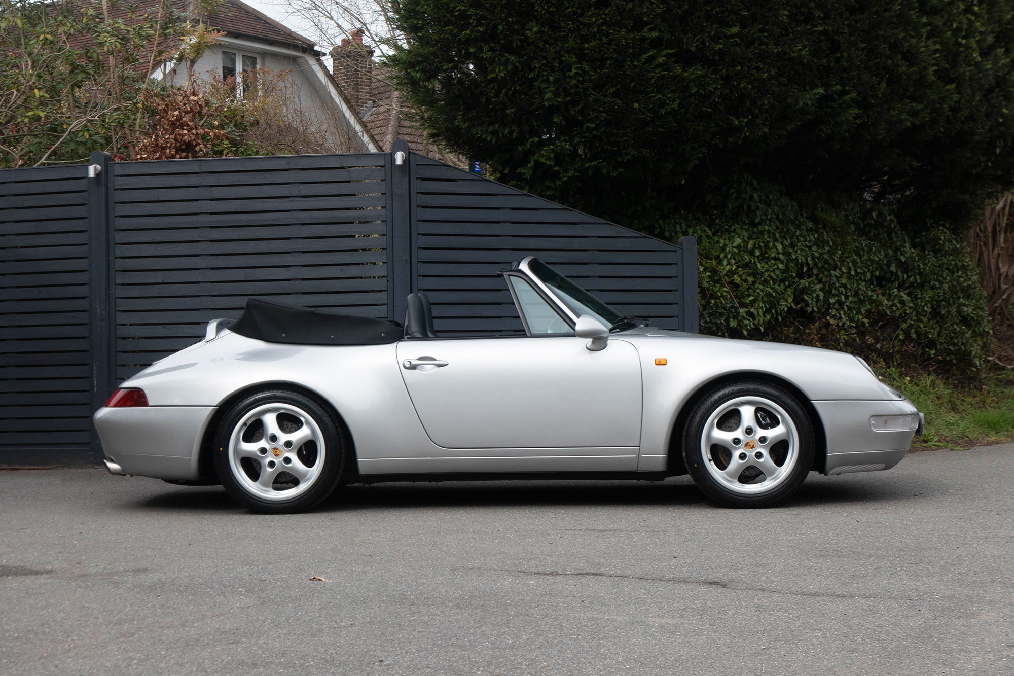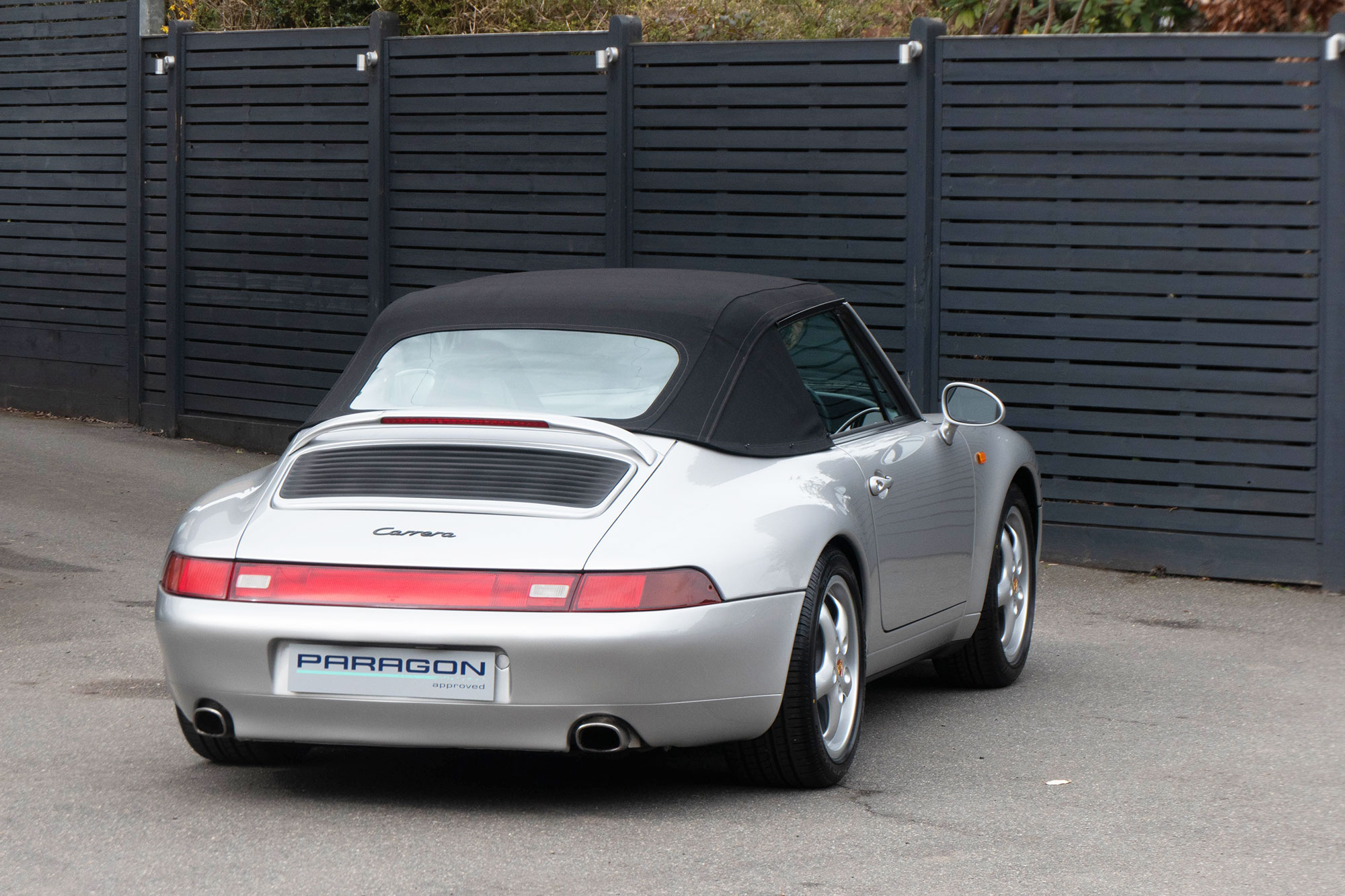 This 911 Carrera 2 cabriolet (993) has the 6-speed manual gearbox and is presented in Arctic Silver with black leather hard backed sports seats and a black fully electric roof.