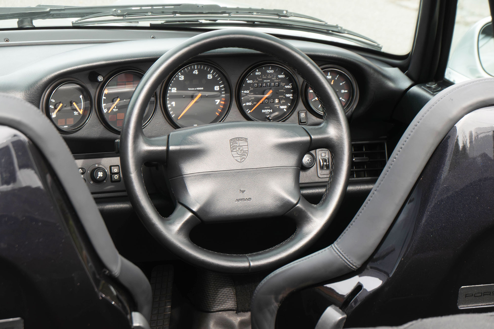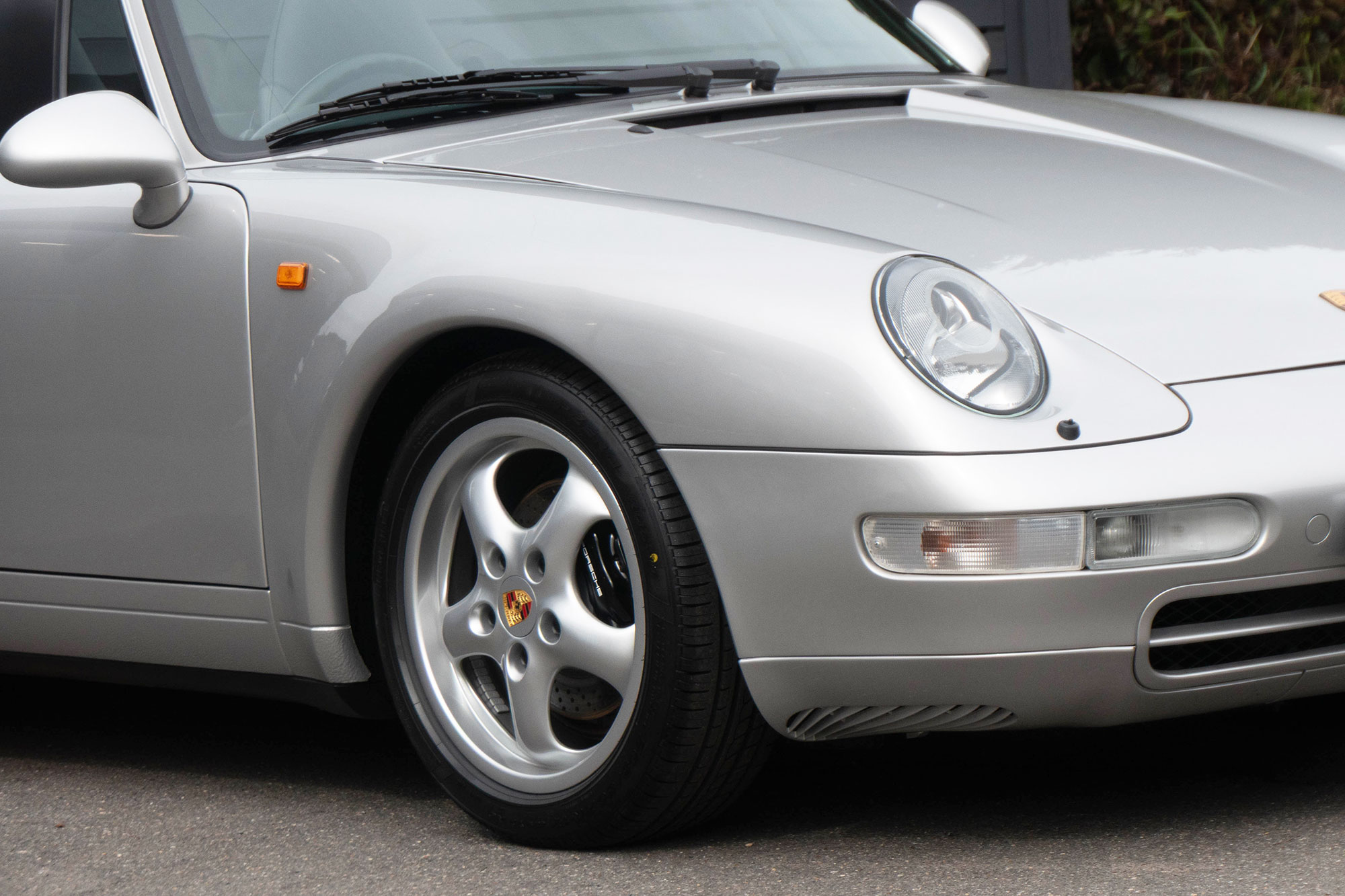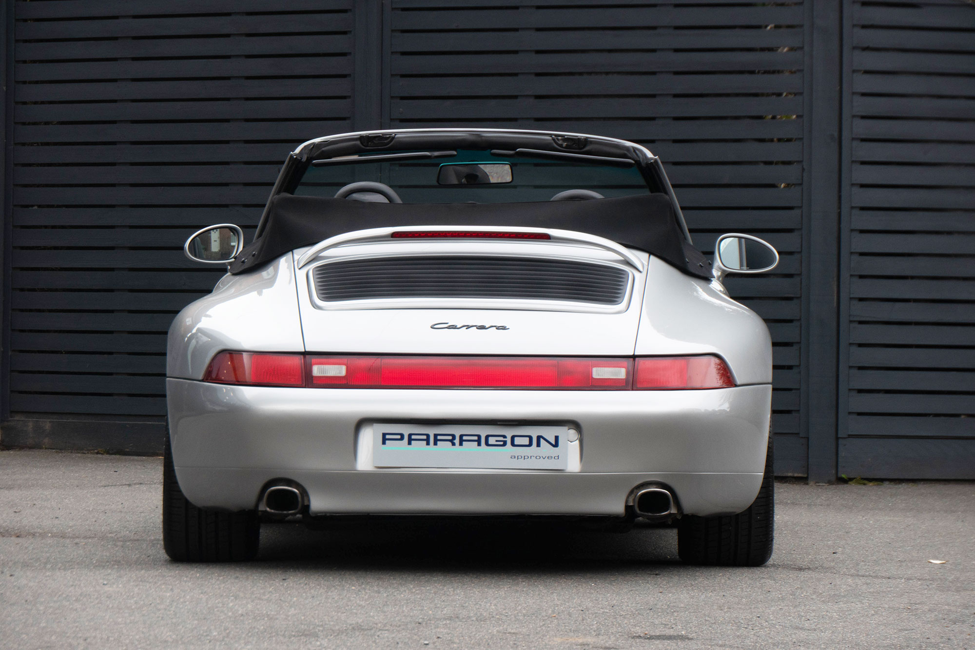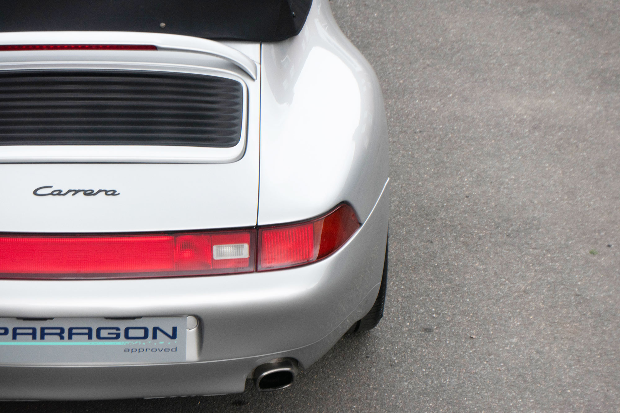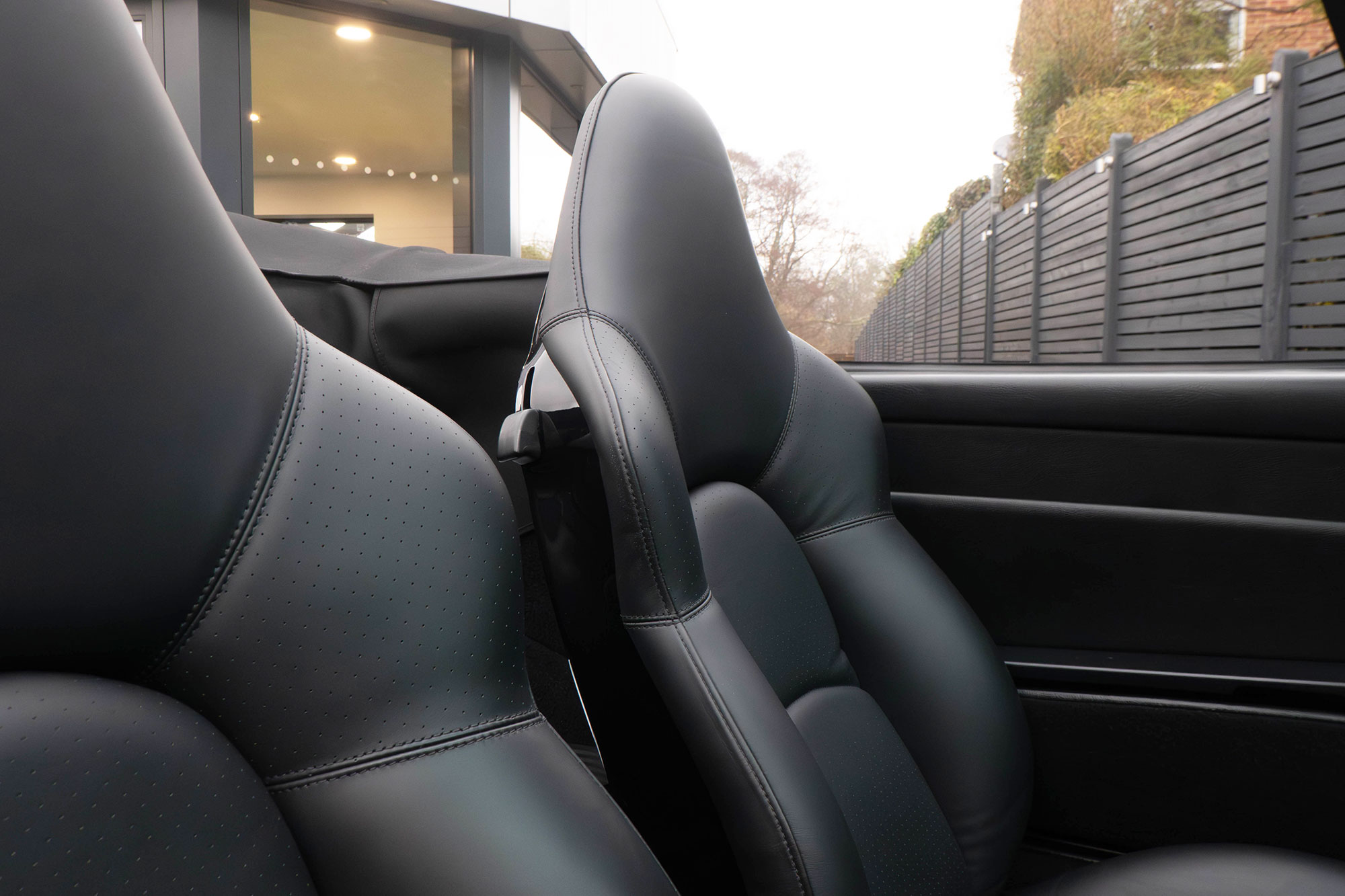 This 911 Carrera 2 cabriolet (993) has the 6-speed manual gearbox and is presented in Arctic Silver with black leather hard backed sports seats and a black fully electric roof.
