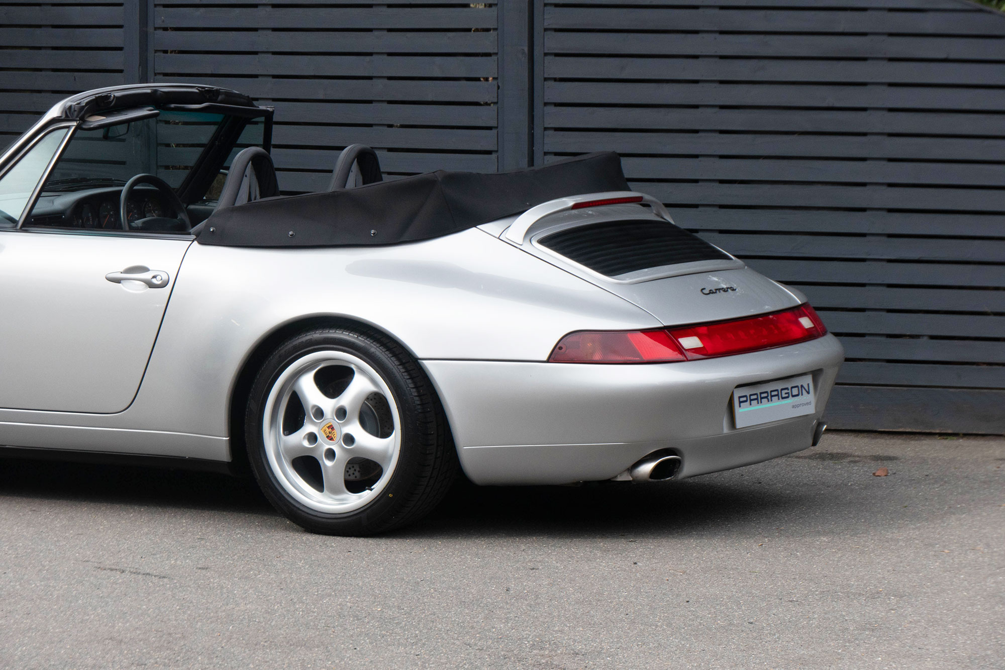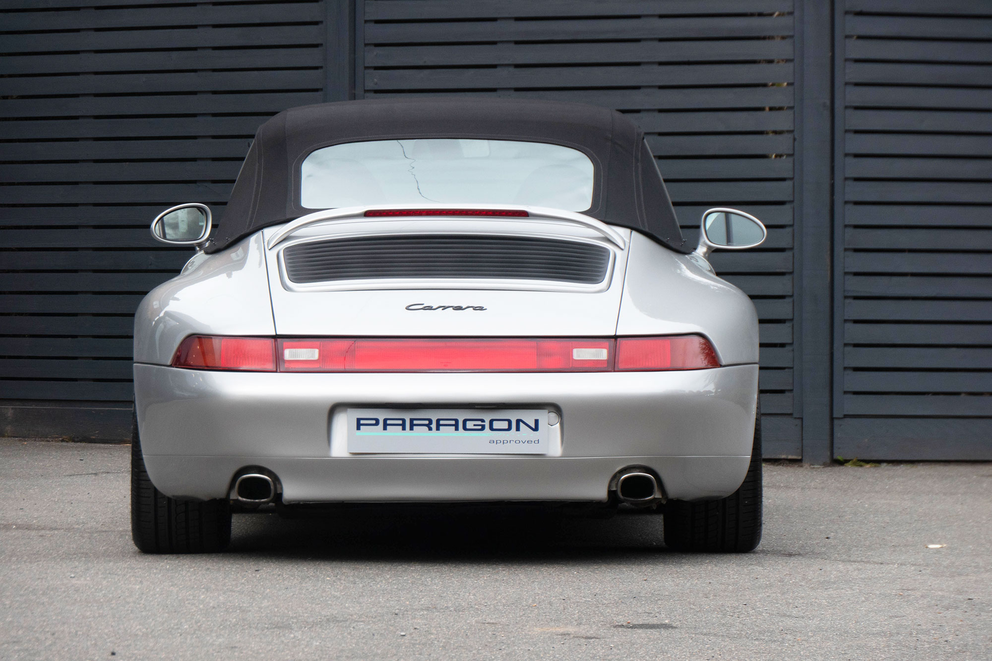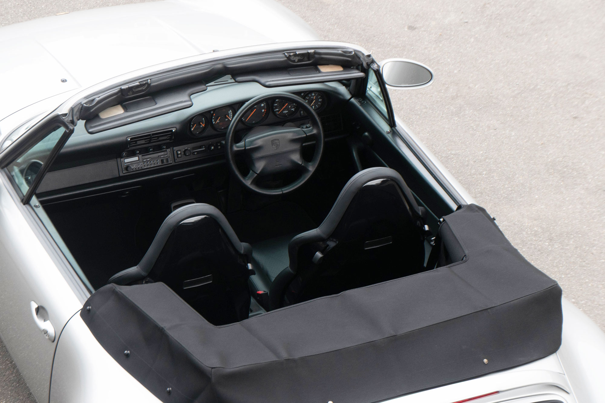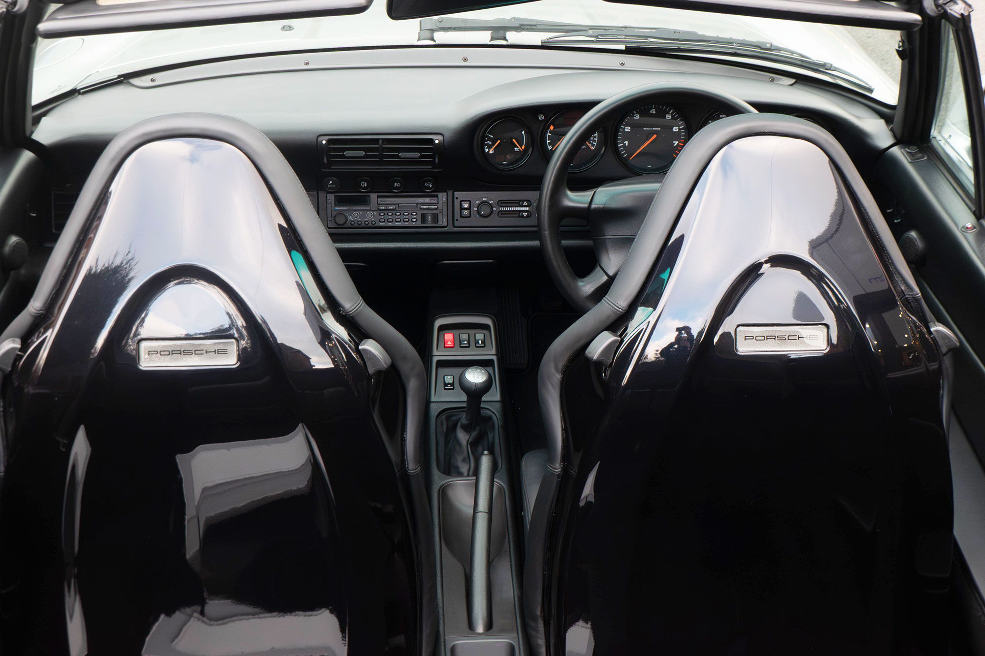 This 911 Carrera 2 cabriolet (993) has the 6-speed manual gearbox and is presented in Arctic Silver with black leather hard backed sports seats and a black fully electric roof.