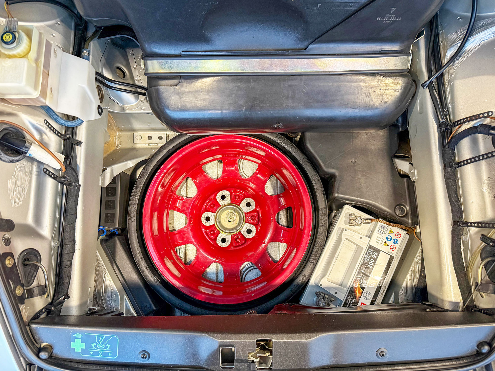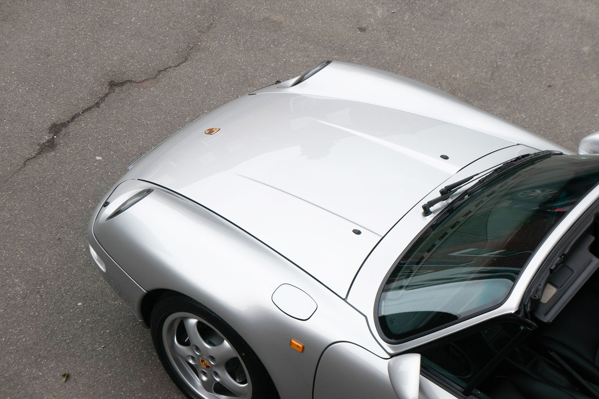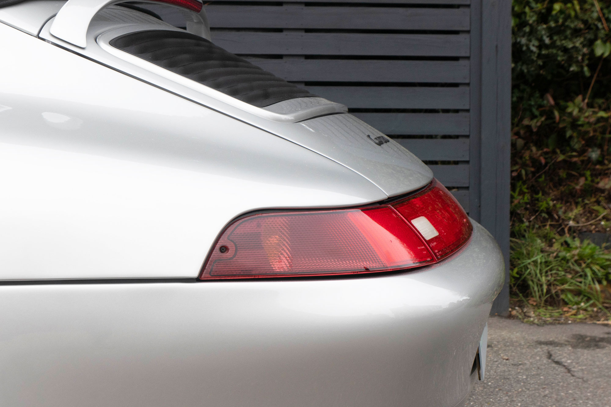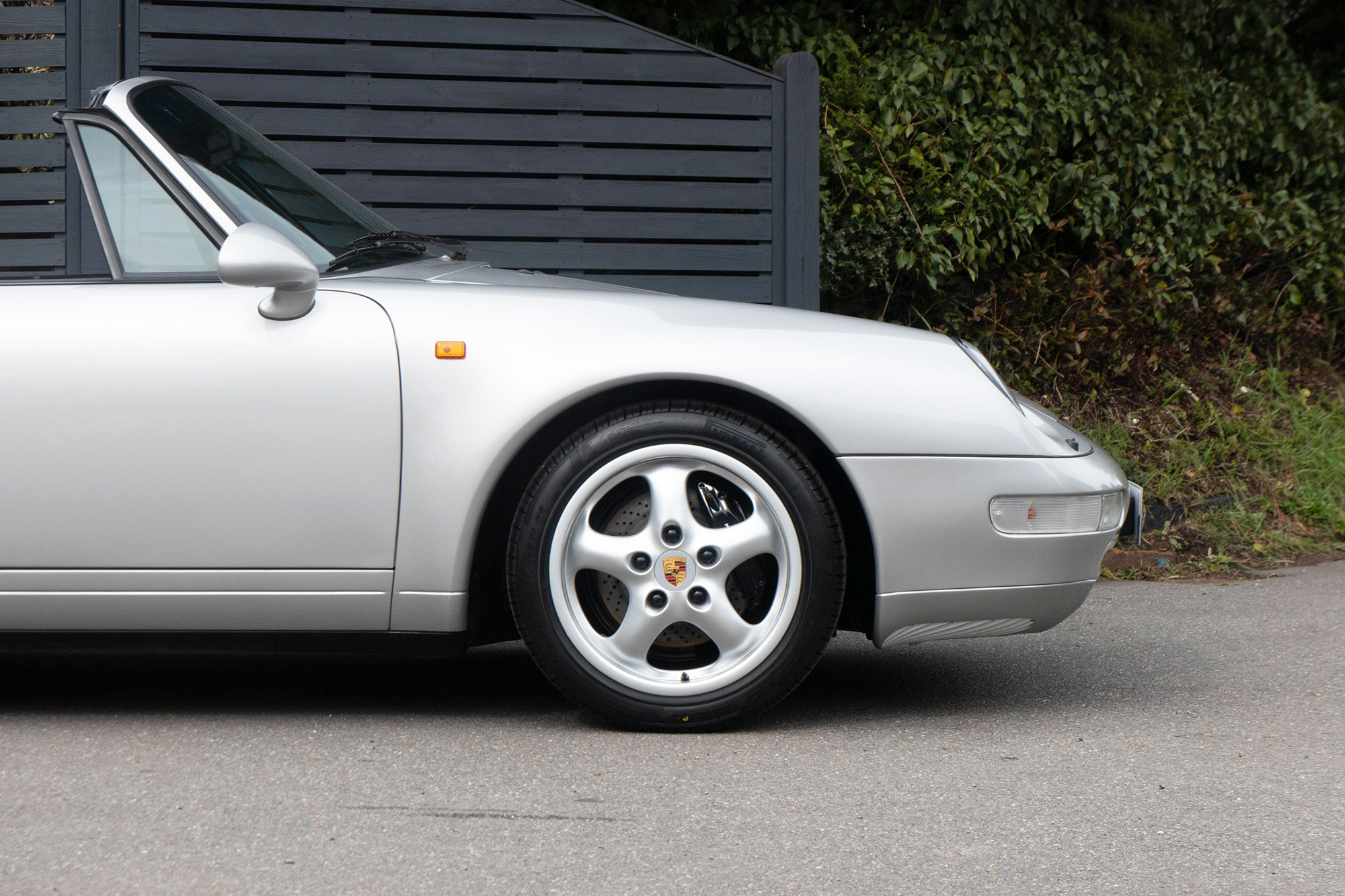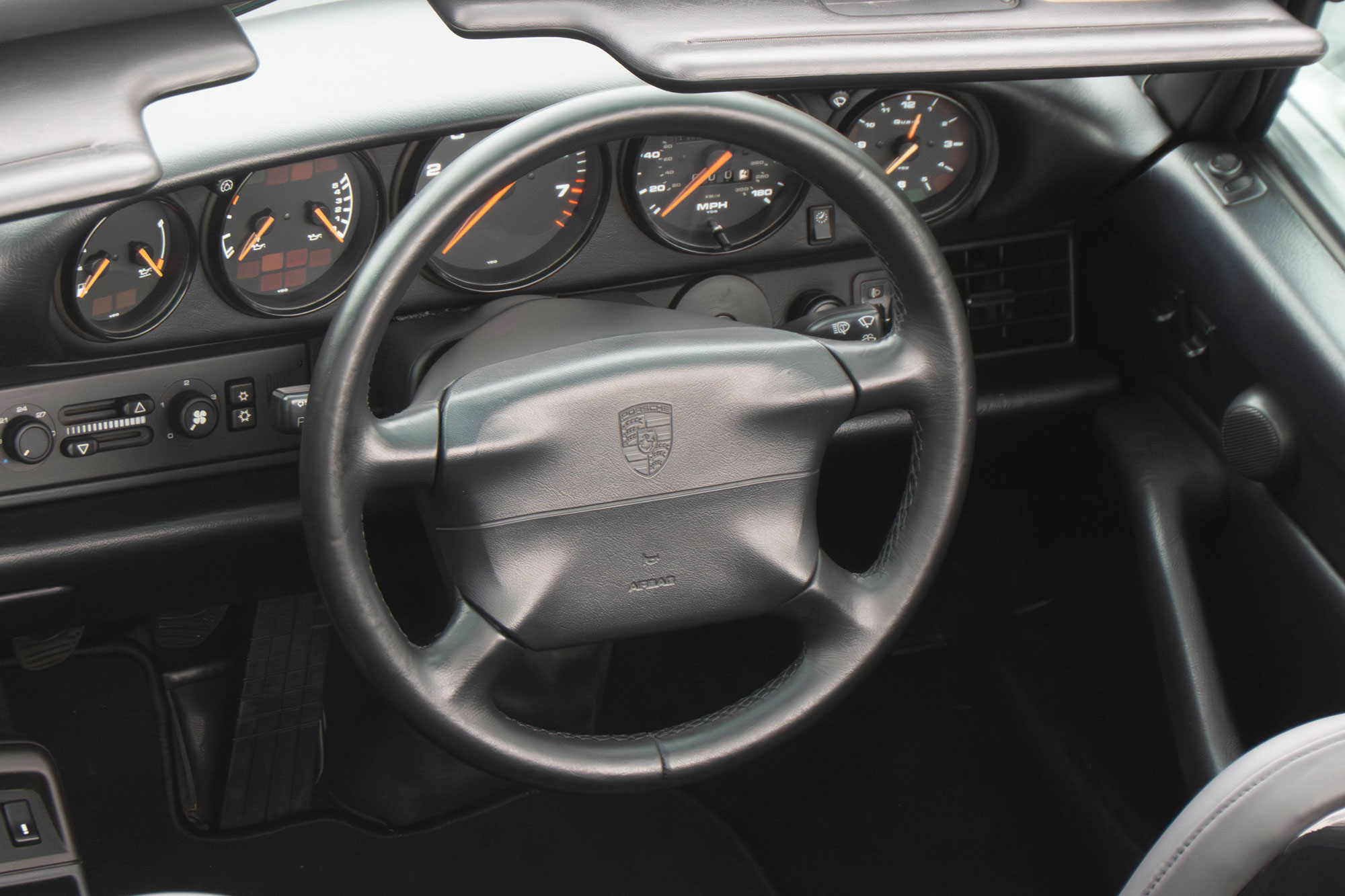 This 911 Carrera 2 cabriolet (993) has the 6-speed manual gearbox and is presented in Arctic Silver with black leather hard backed sports seats and a black fully electric roof.