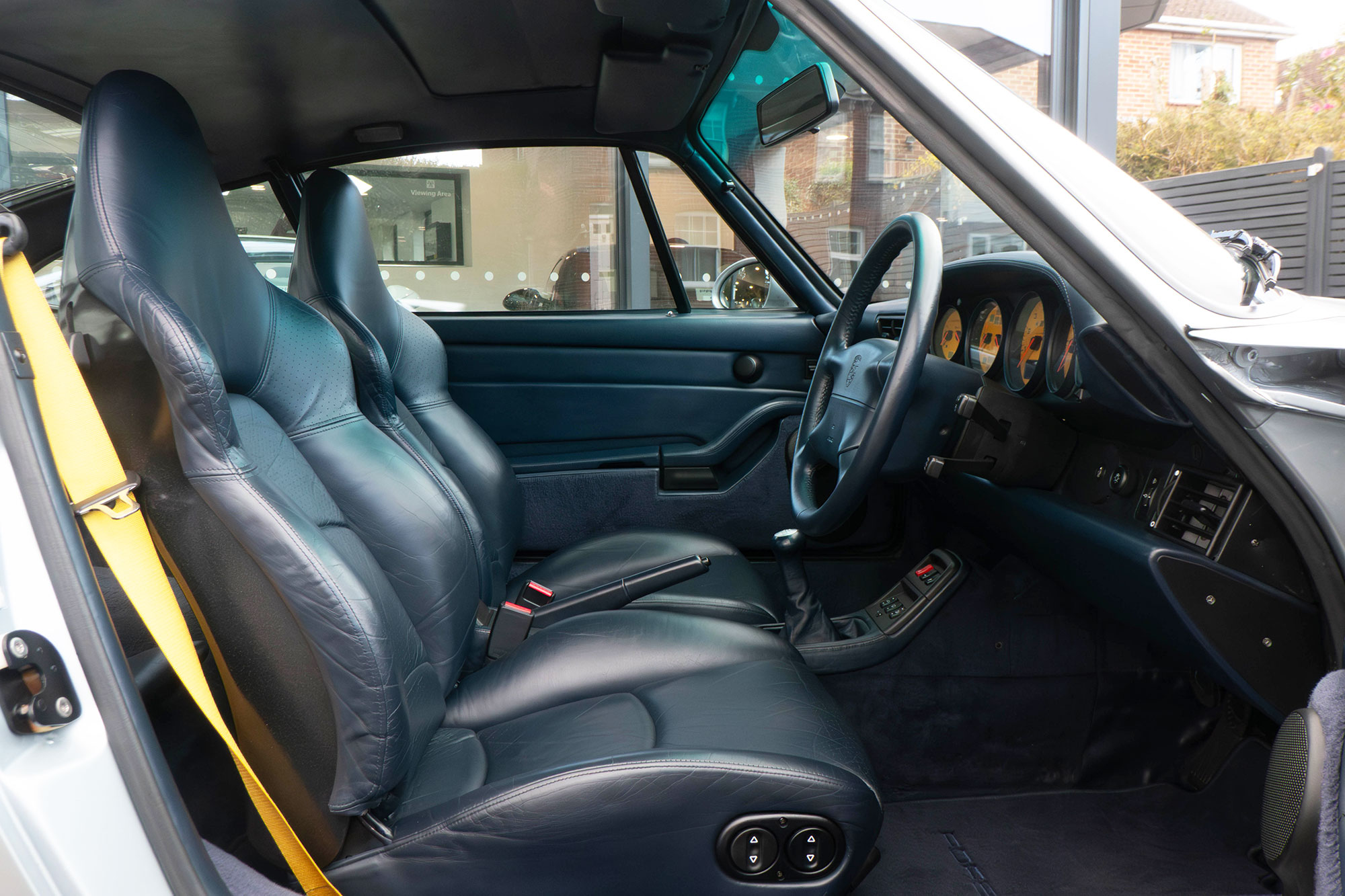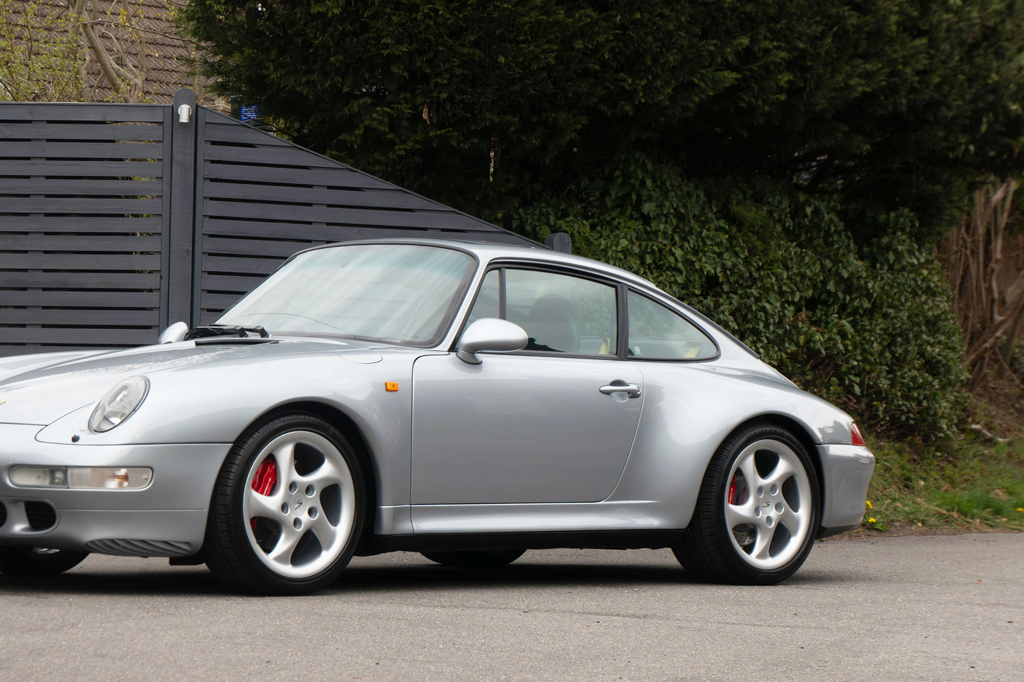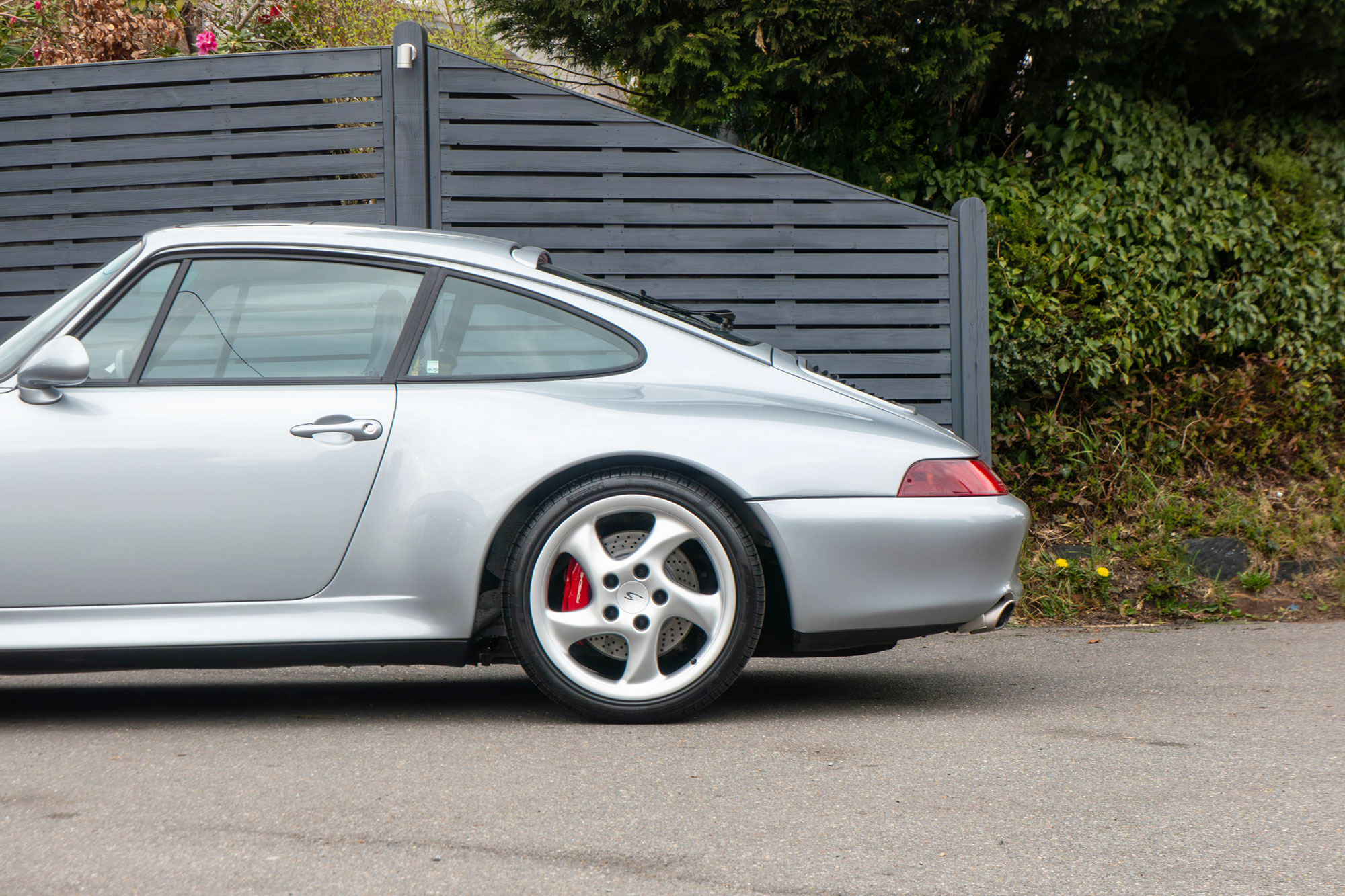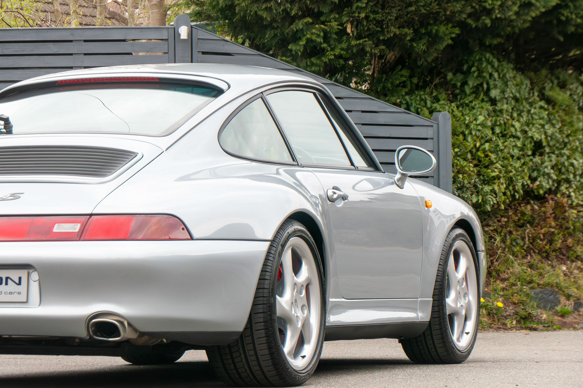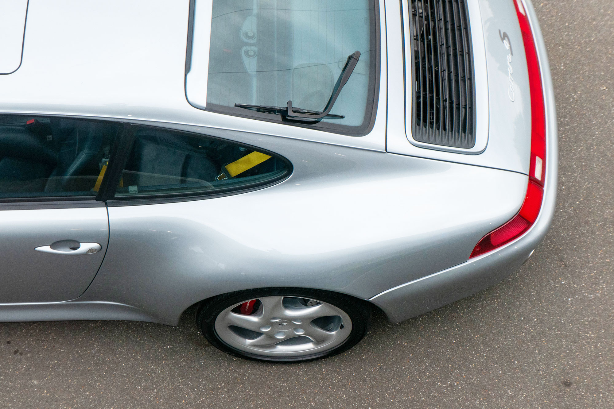 This 911 Carrera 4 S Coupe (993) has the 6-speed manual gearbox and is presented in Polar Silver with Dark Blue leather sports seats.