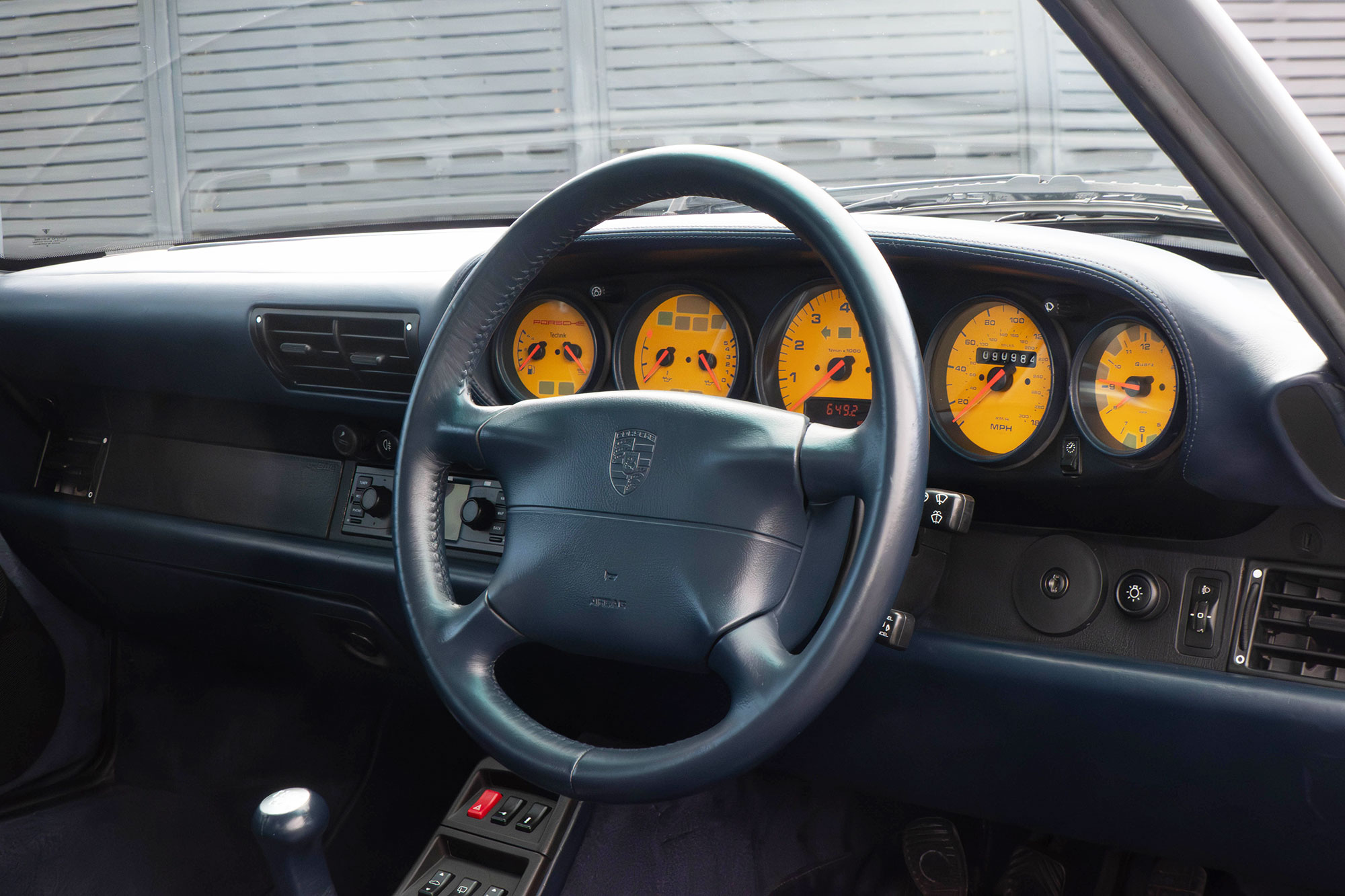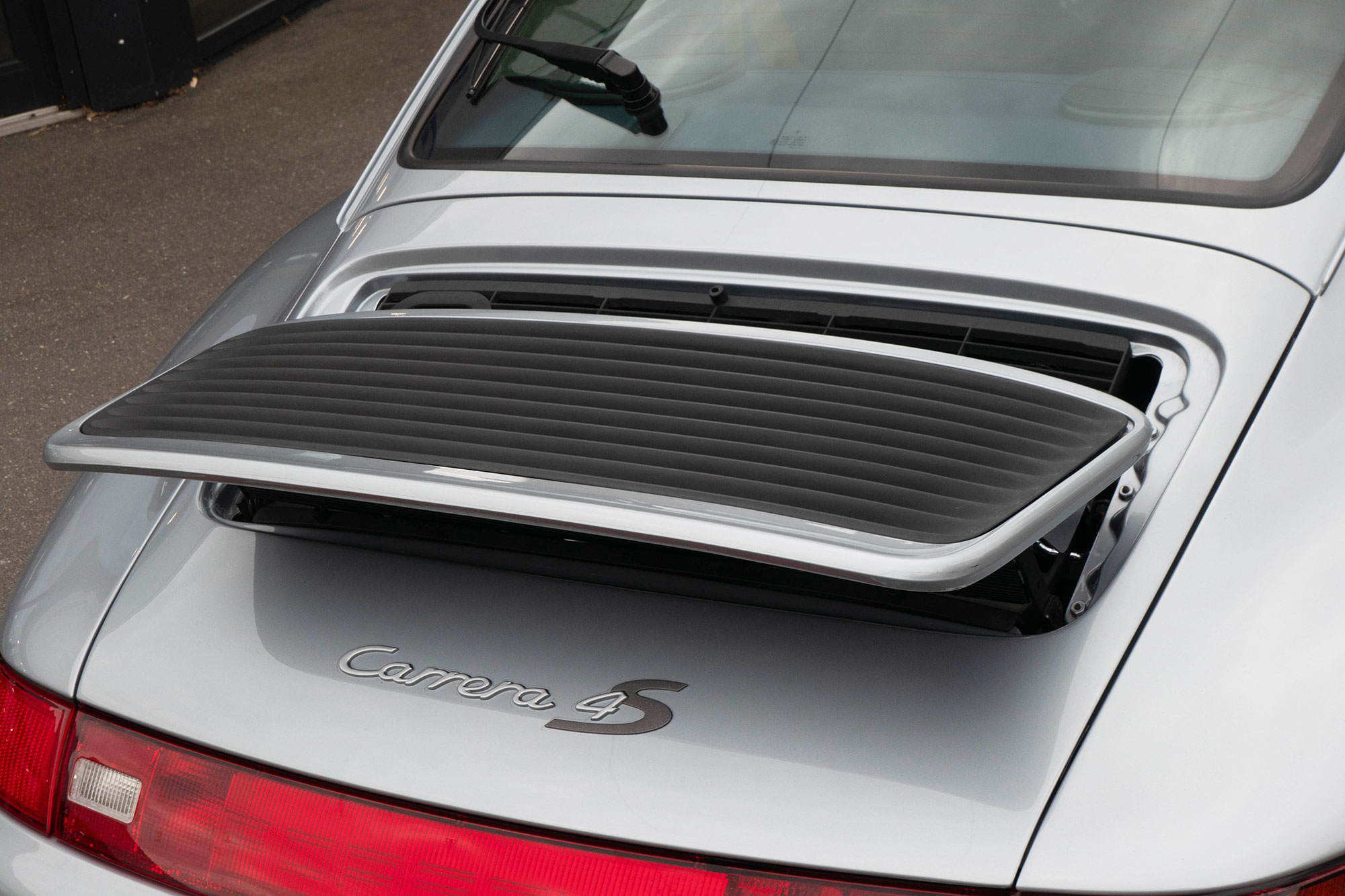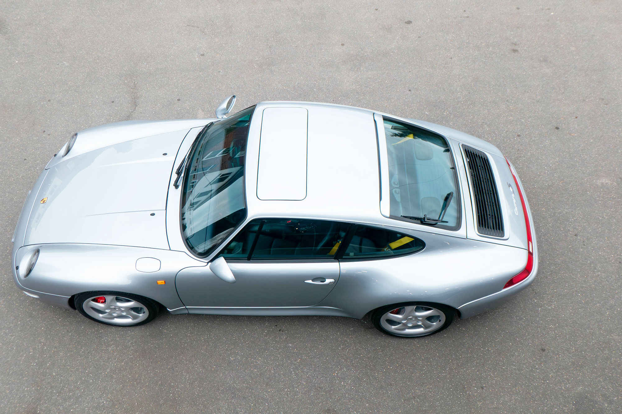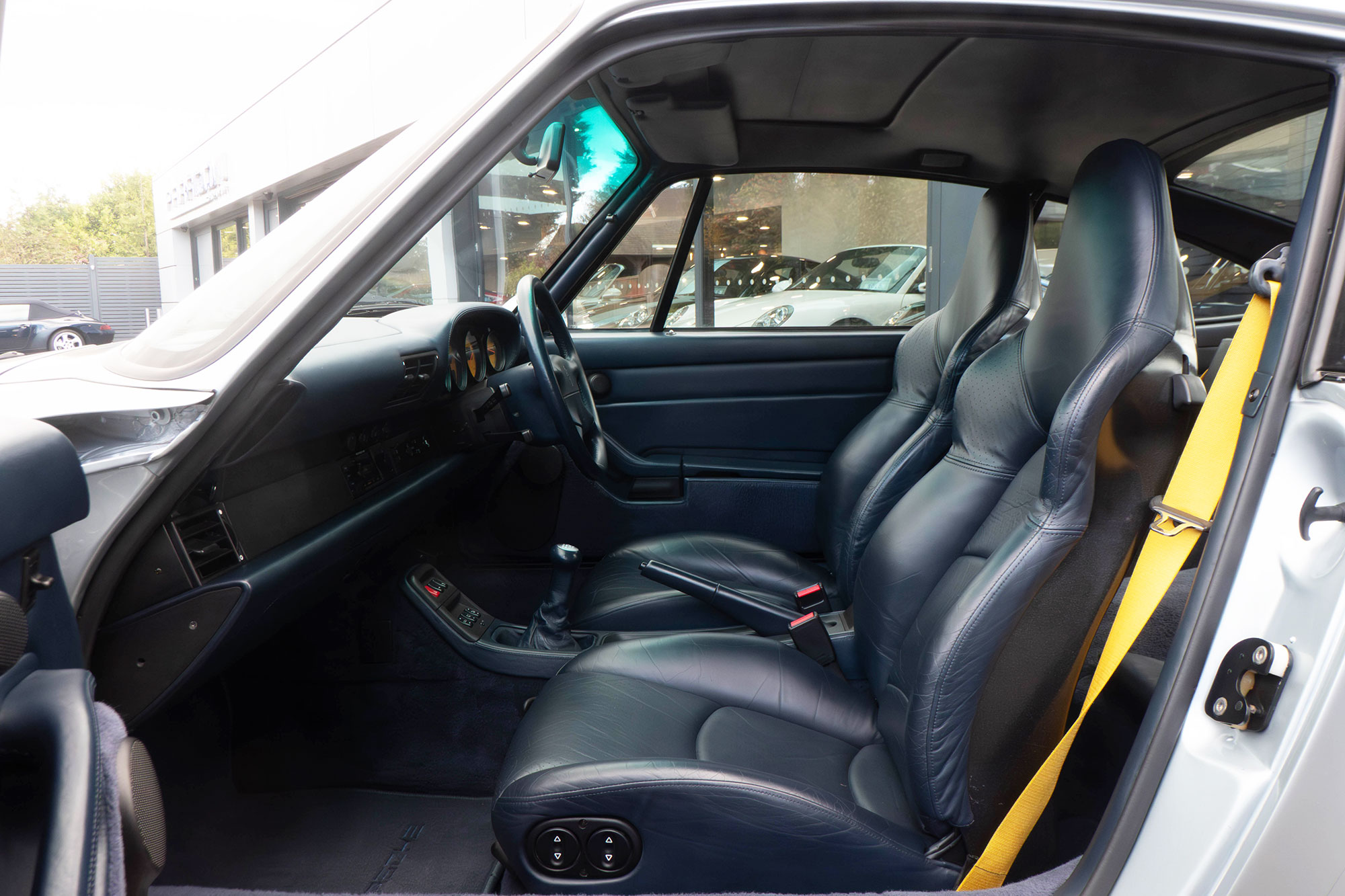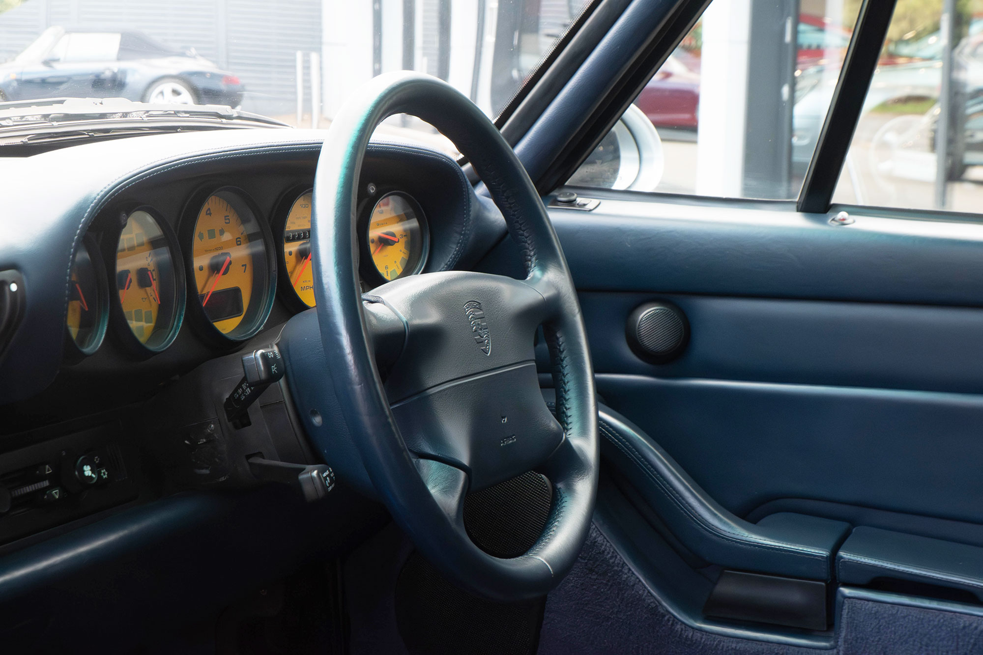 This 911 Carrera 4 S Coupe (993) has the 6-speed manual gearbox and is presented in Polar Silver with Dark Blue leather sports seats.
