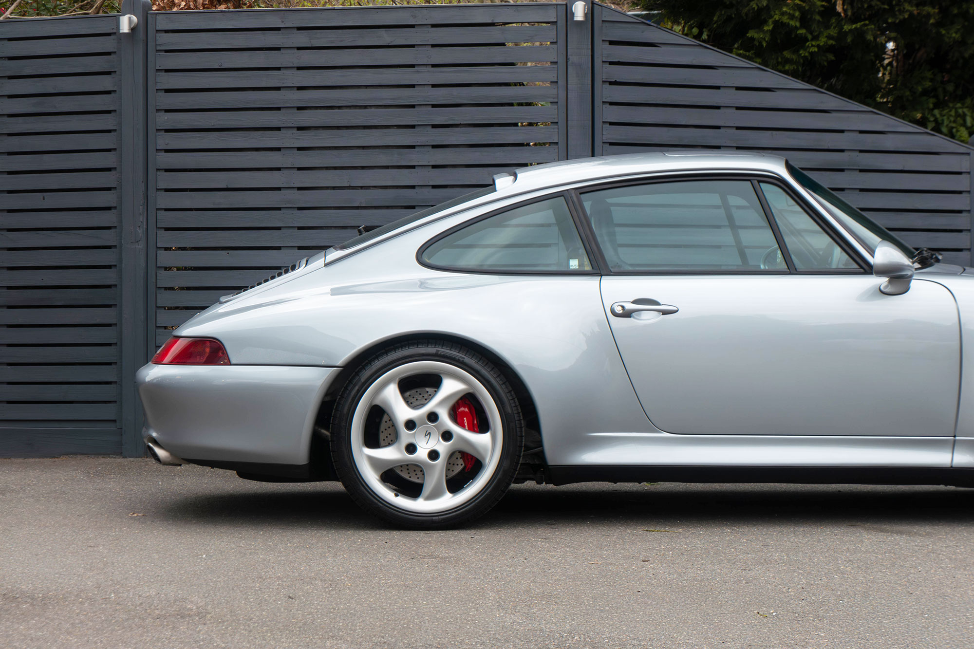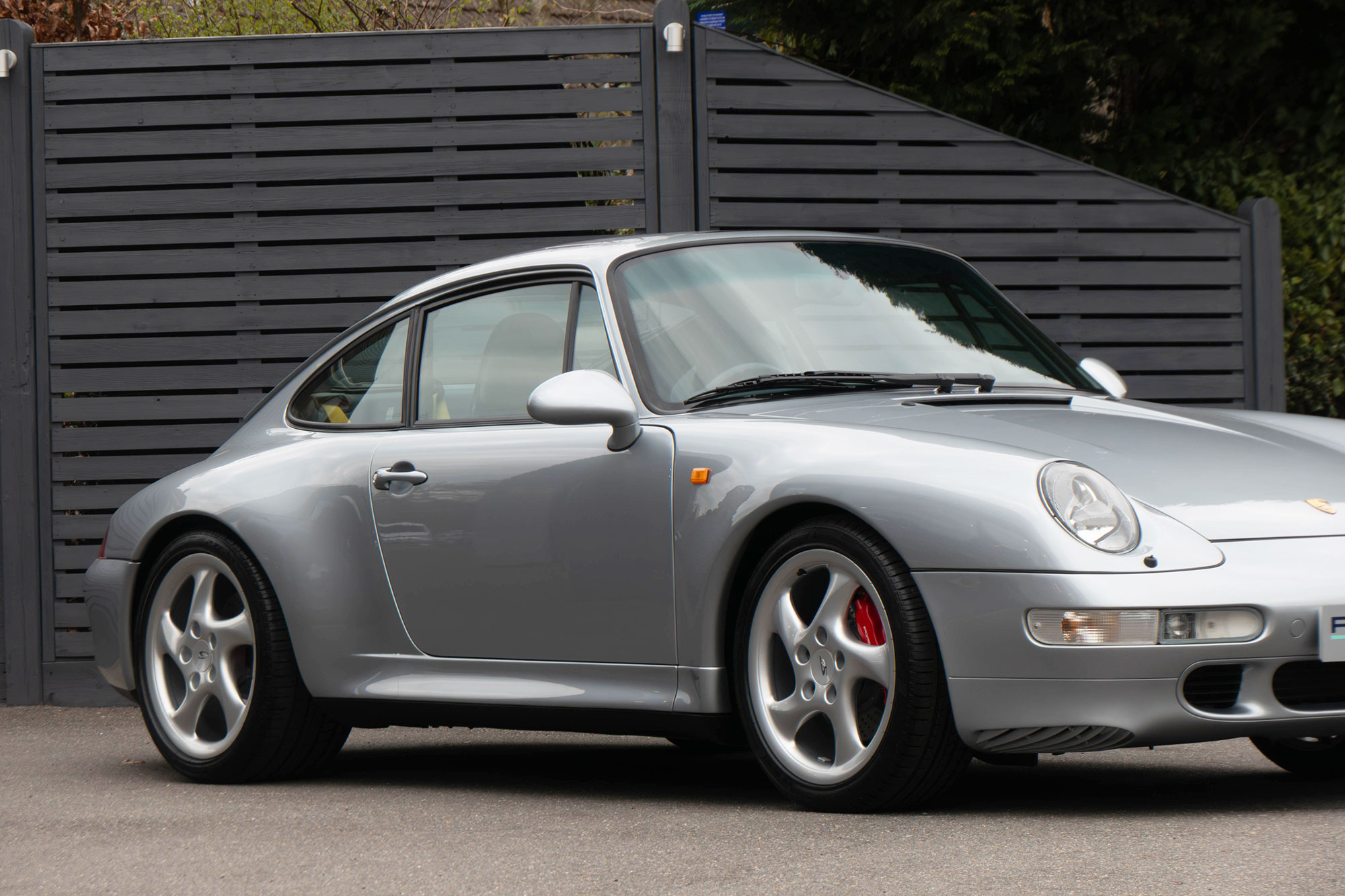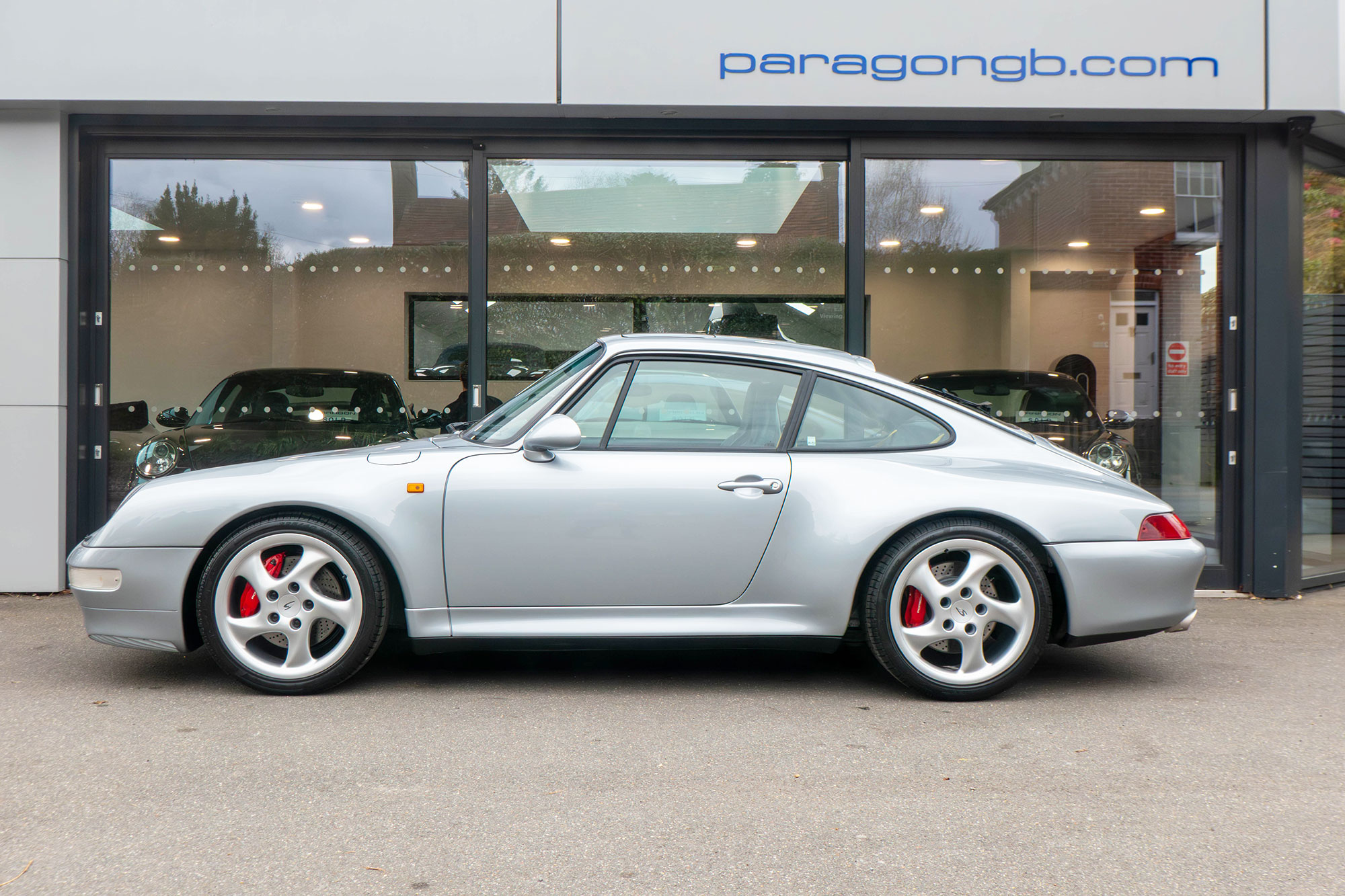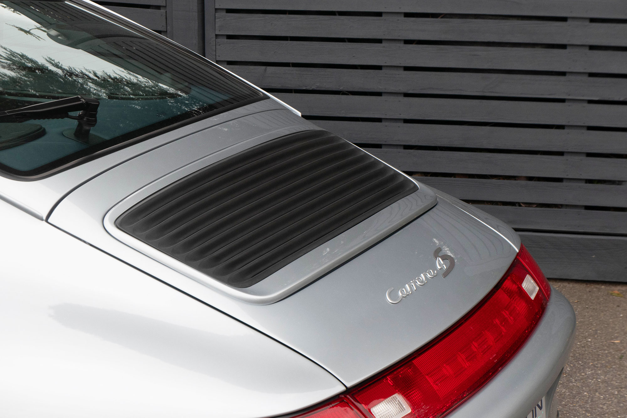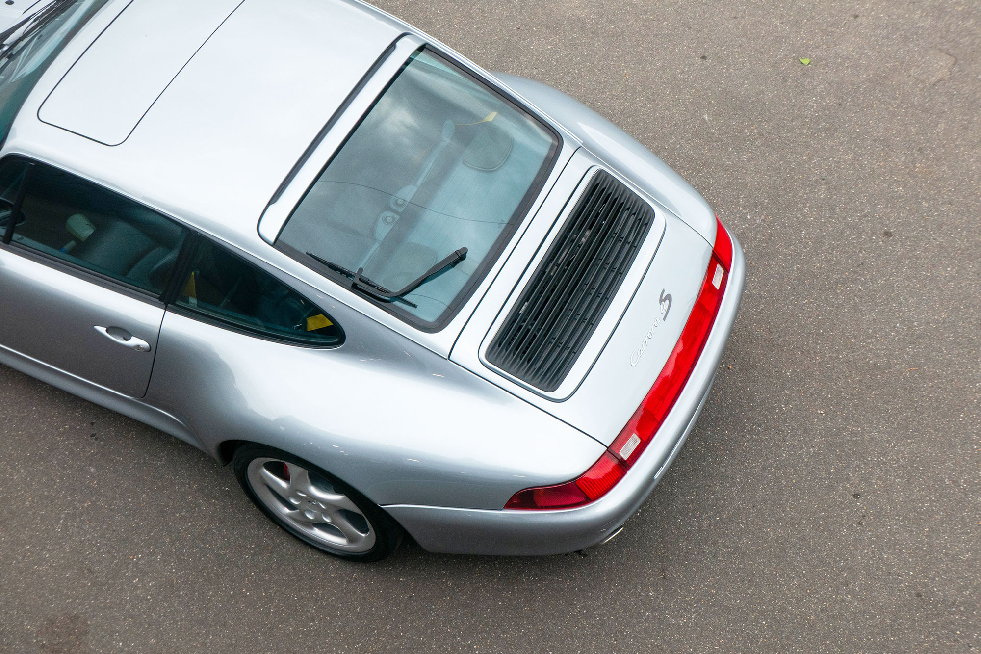 This 911 Carrera 4 S Coupe (993) has the 6-speed manual gearbox and is presented in Polar Silver with Dark Blue leather sports seats.