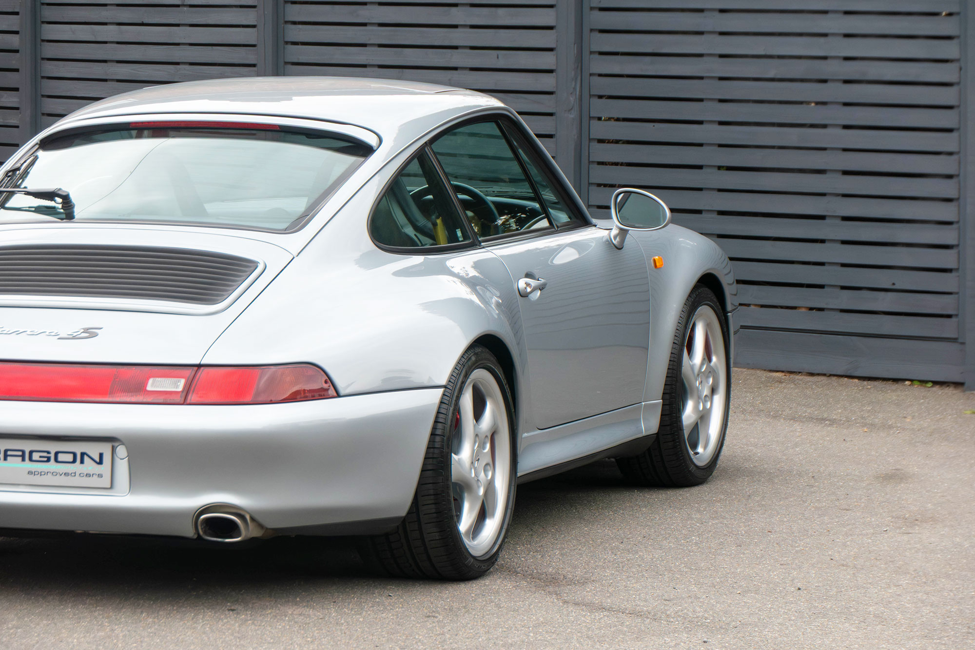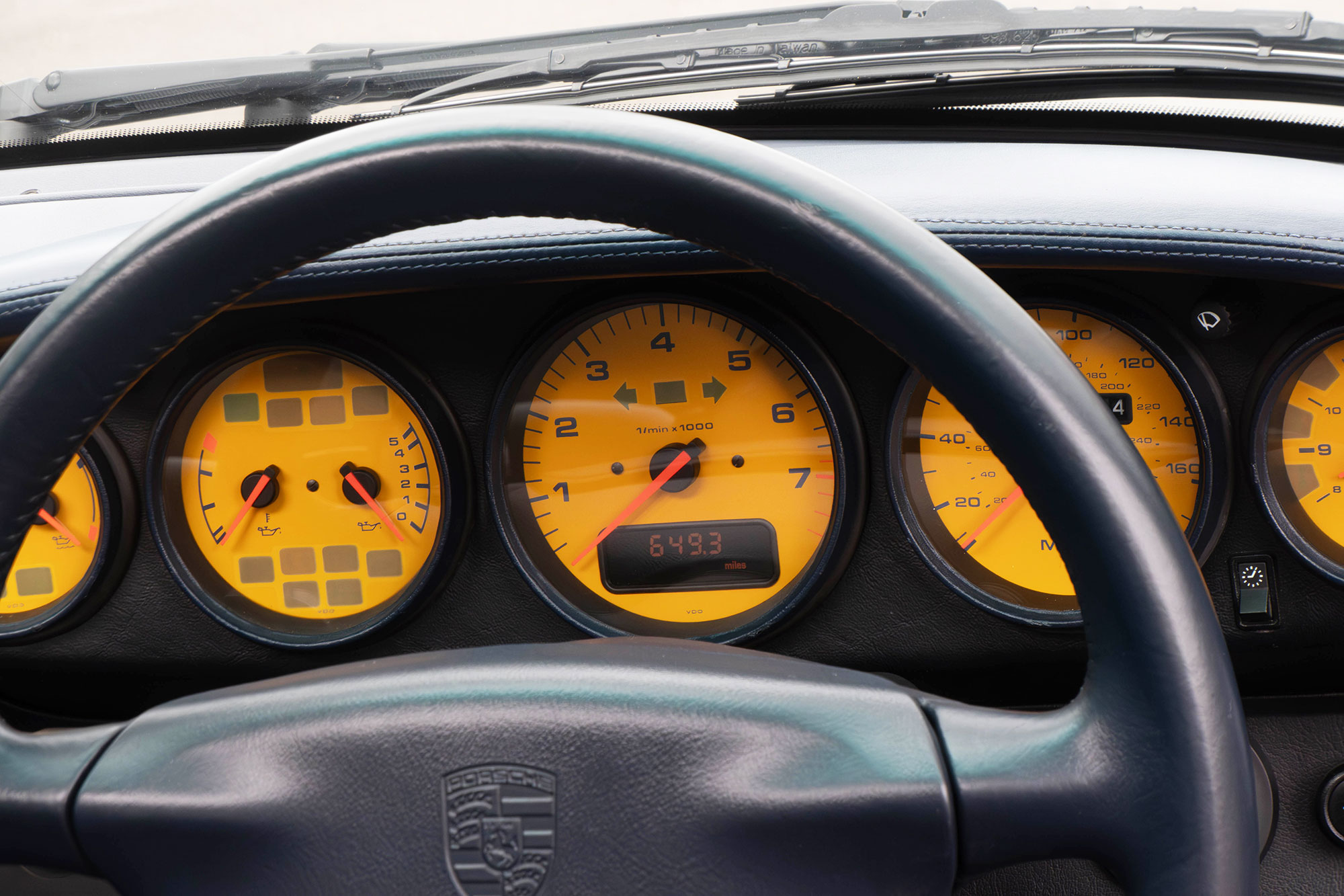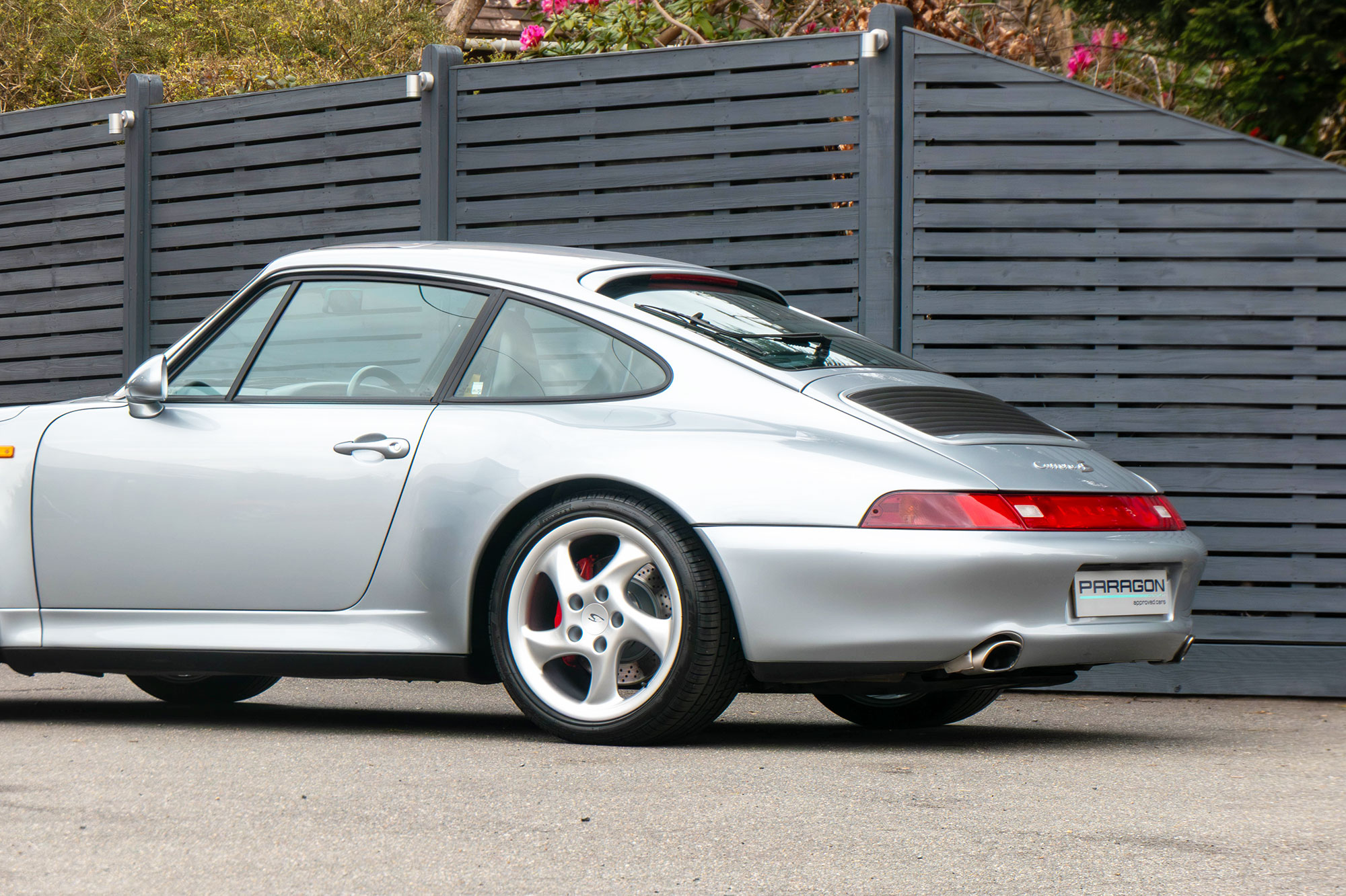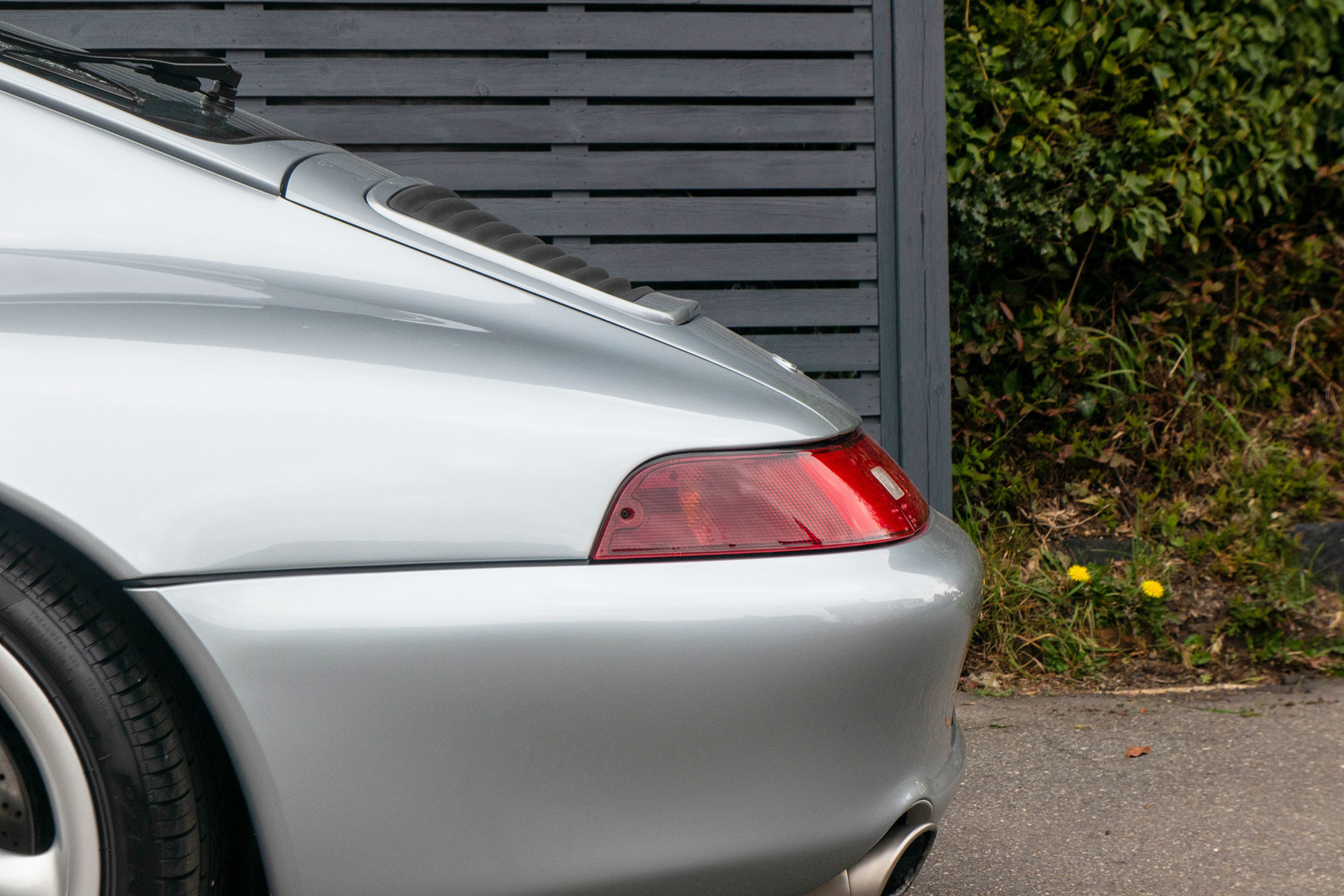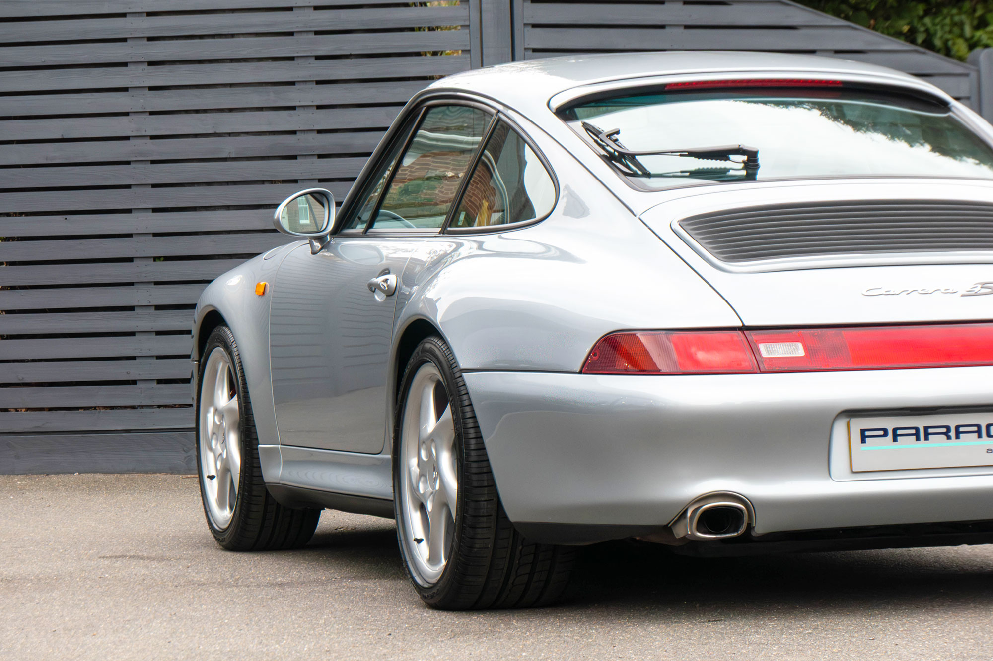 This 911 Carrera 4 S Coupe (993) has the 6-speed manual gearbox and is presented in Polar Silver with Dark Blue leather sports seats.