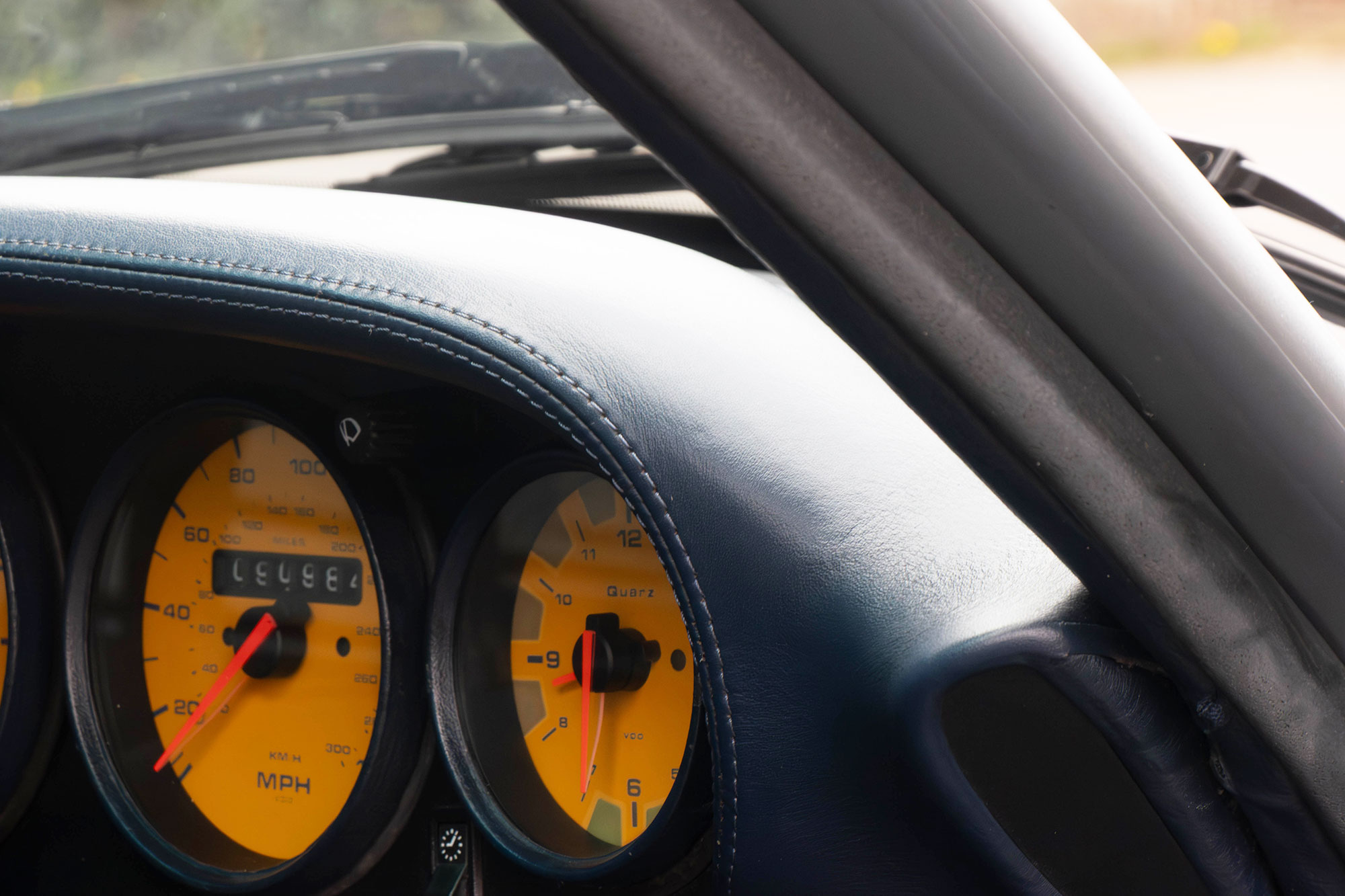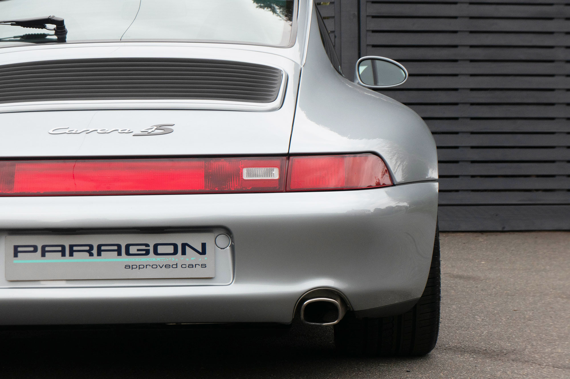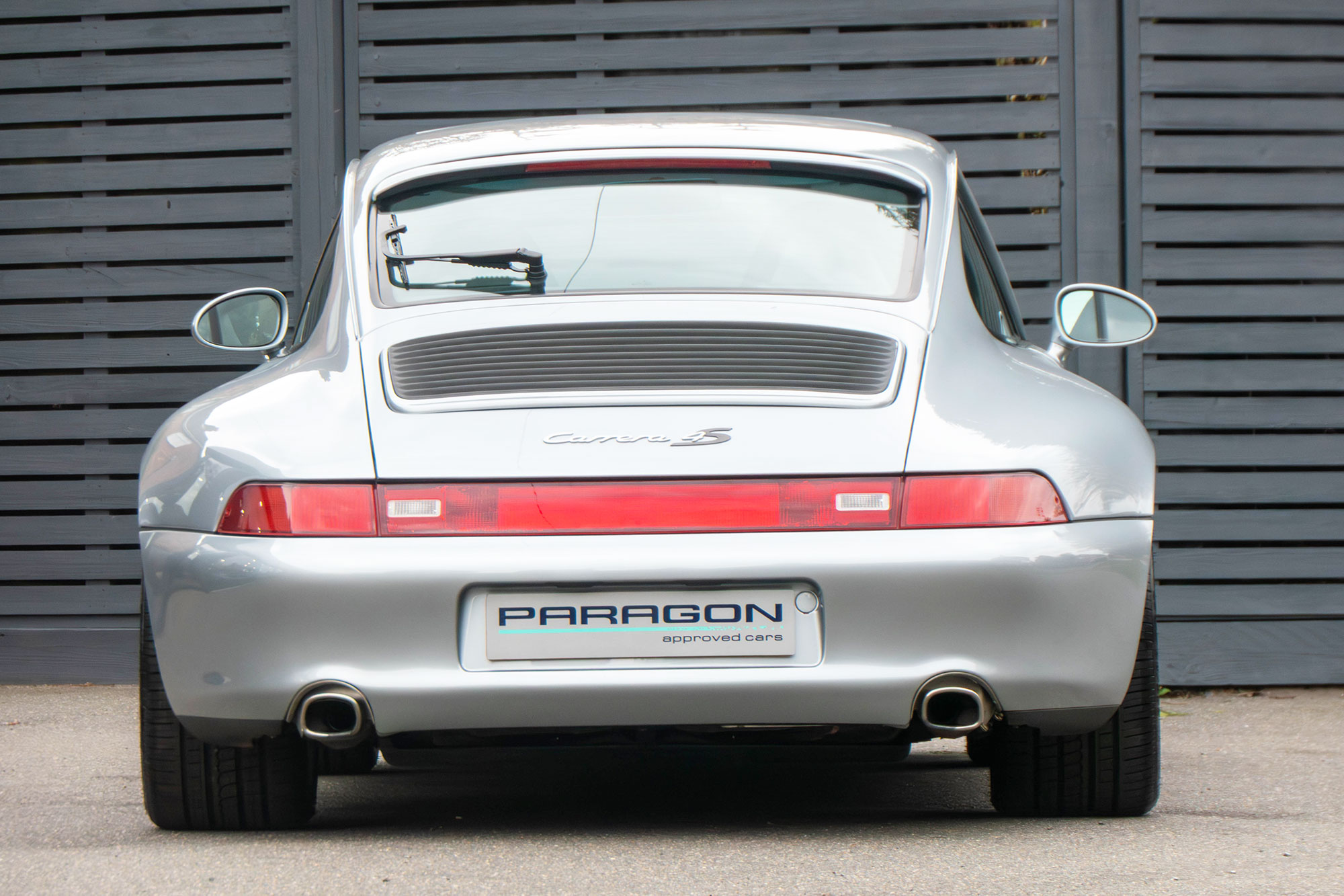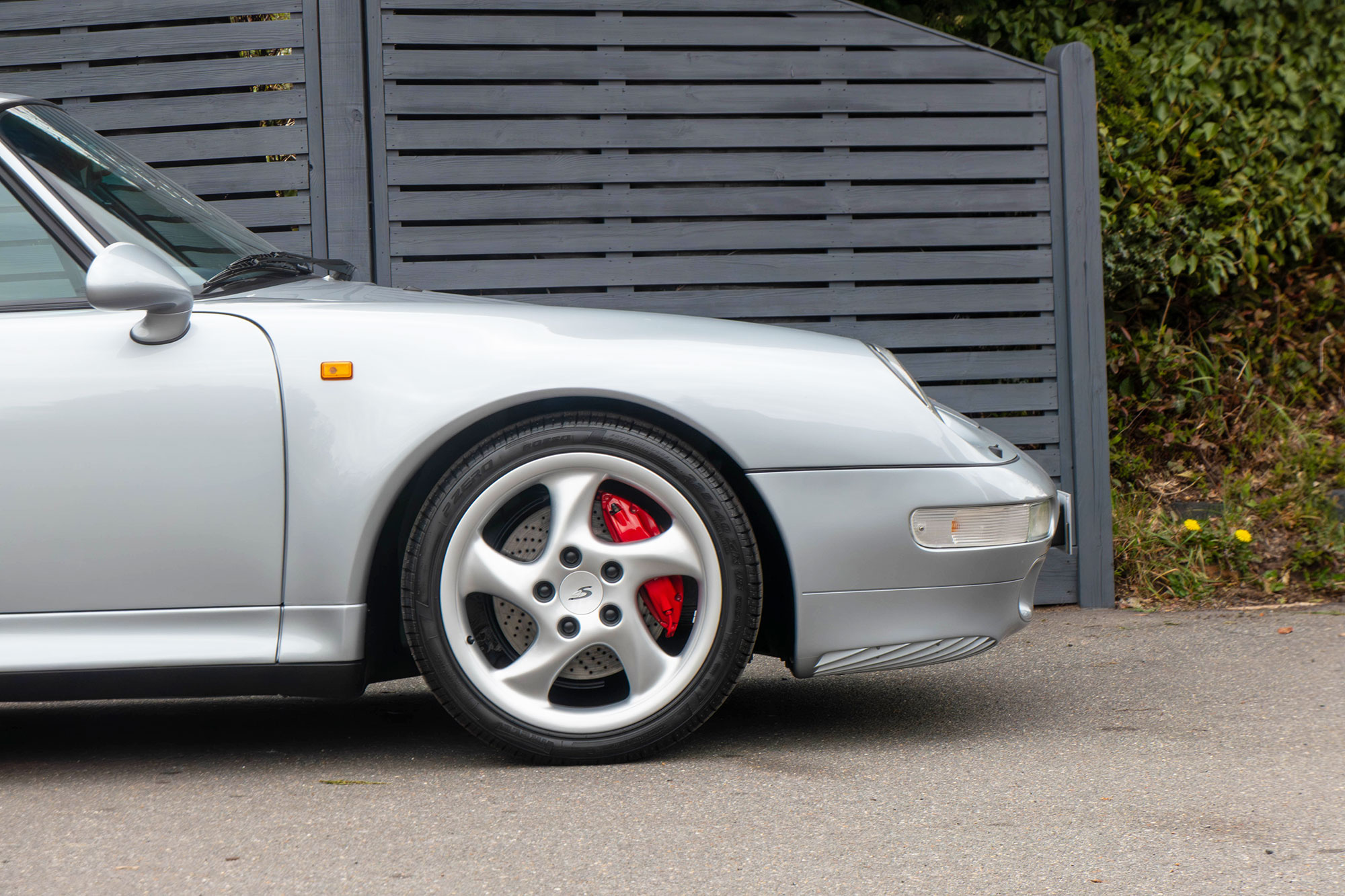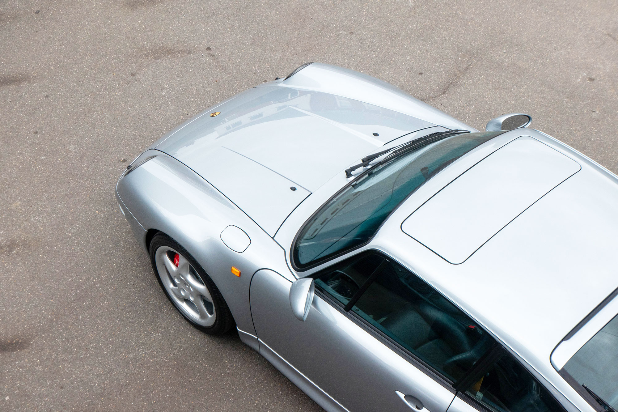 This 911 Carrera 4 S Coupe (993) has the 6-speed manual gearbox and is presented in Polar Silver with Dark Blue leather sports seats.