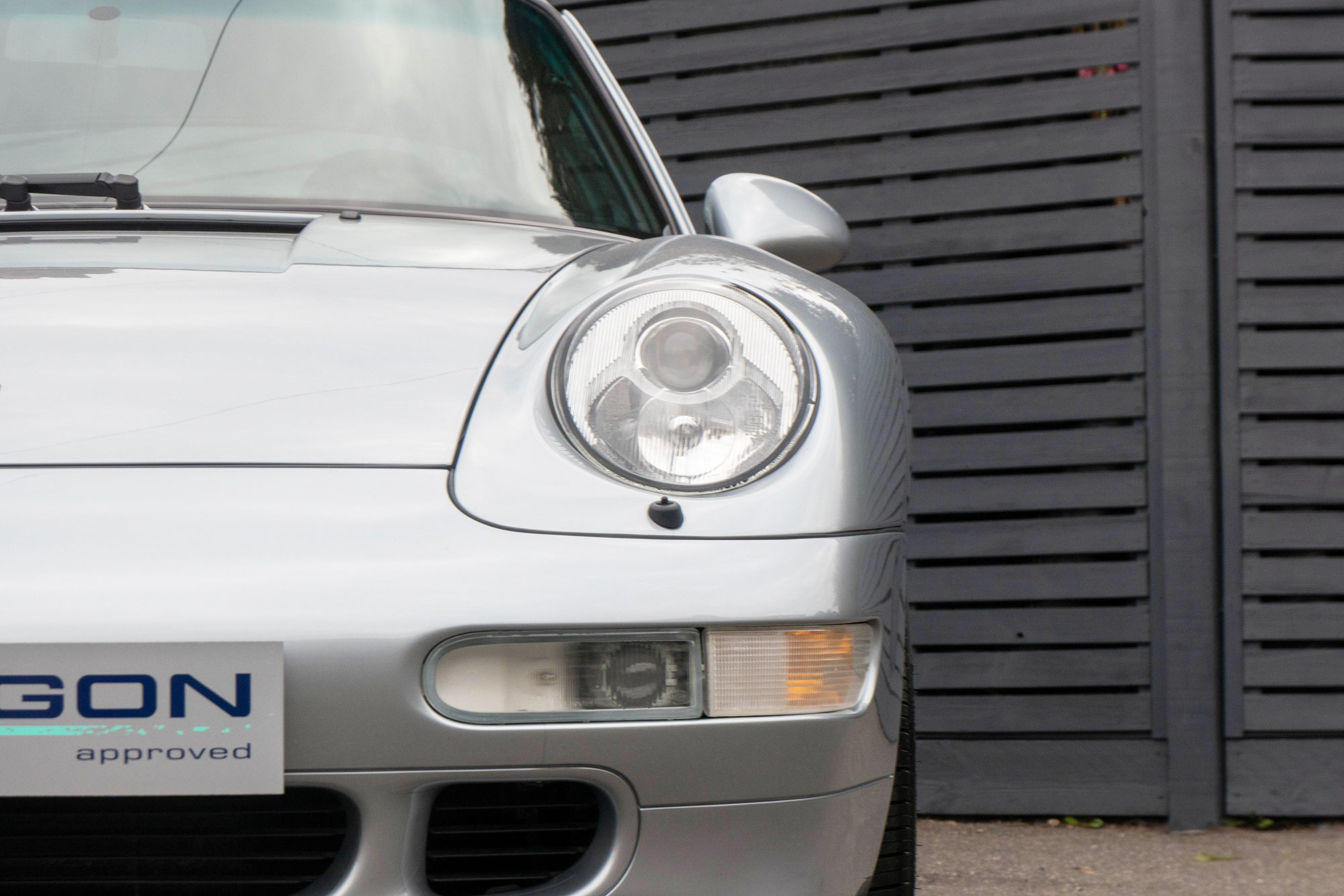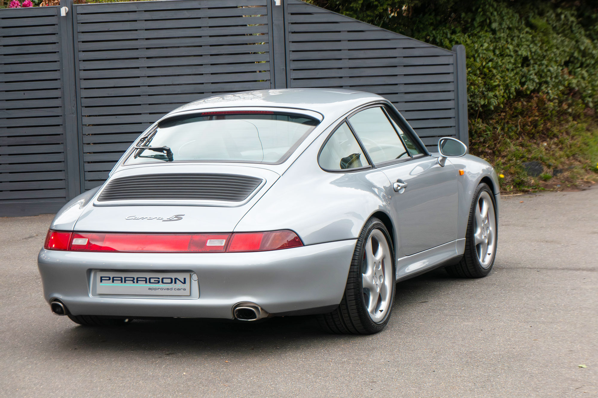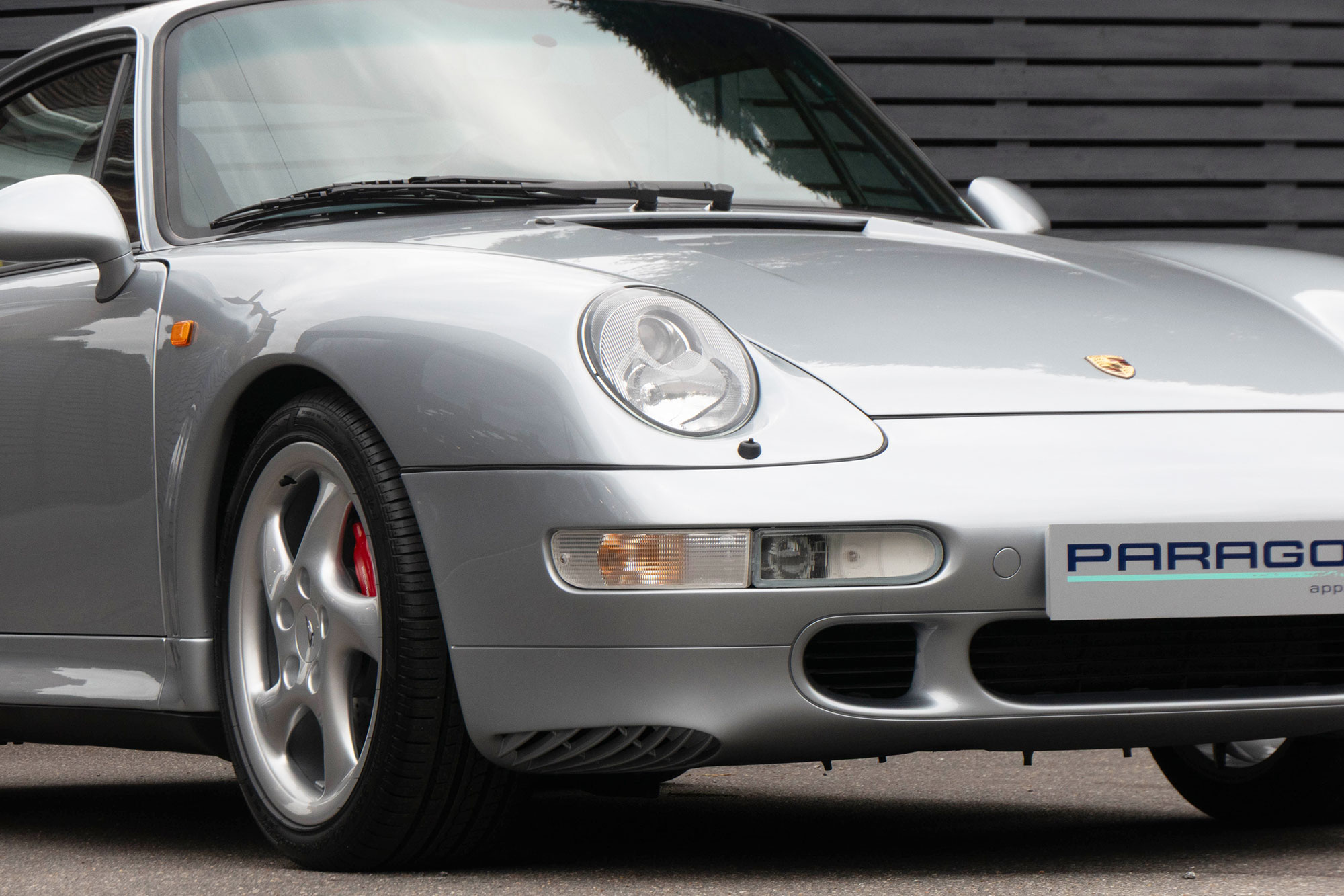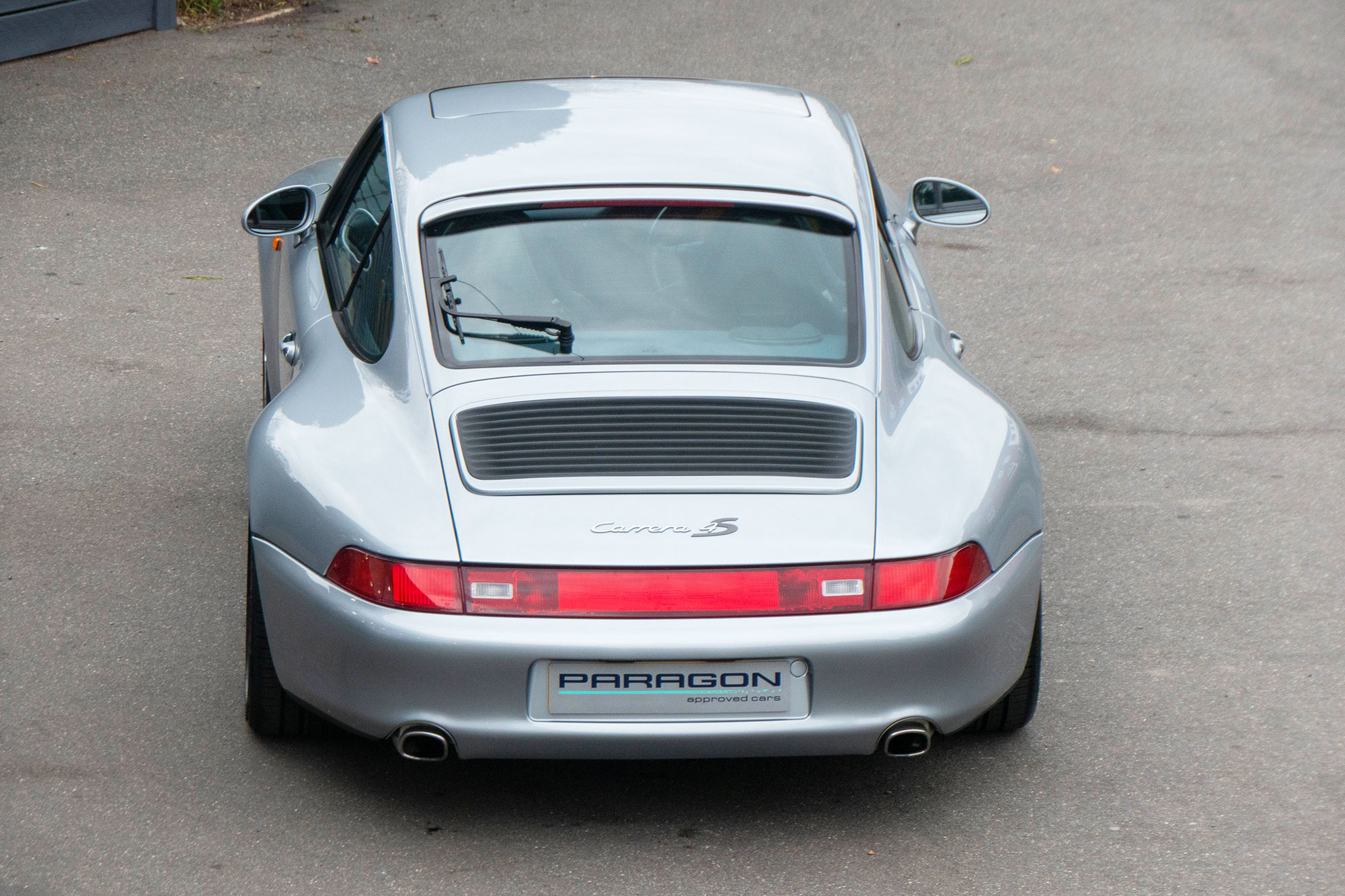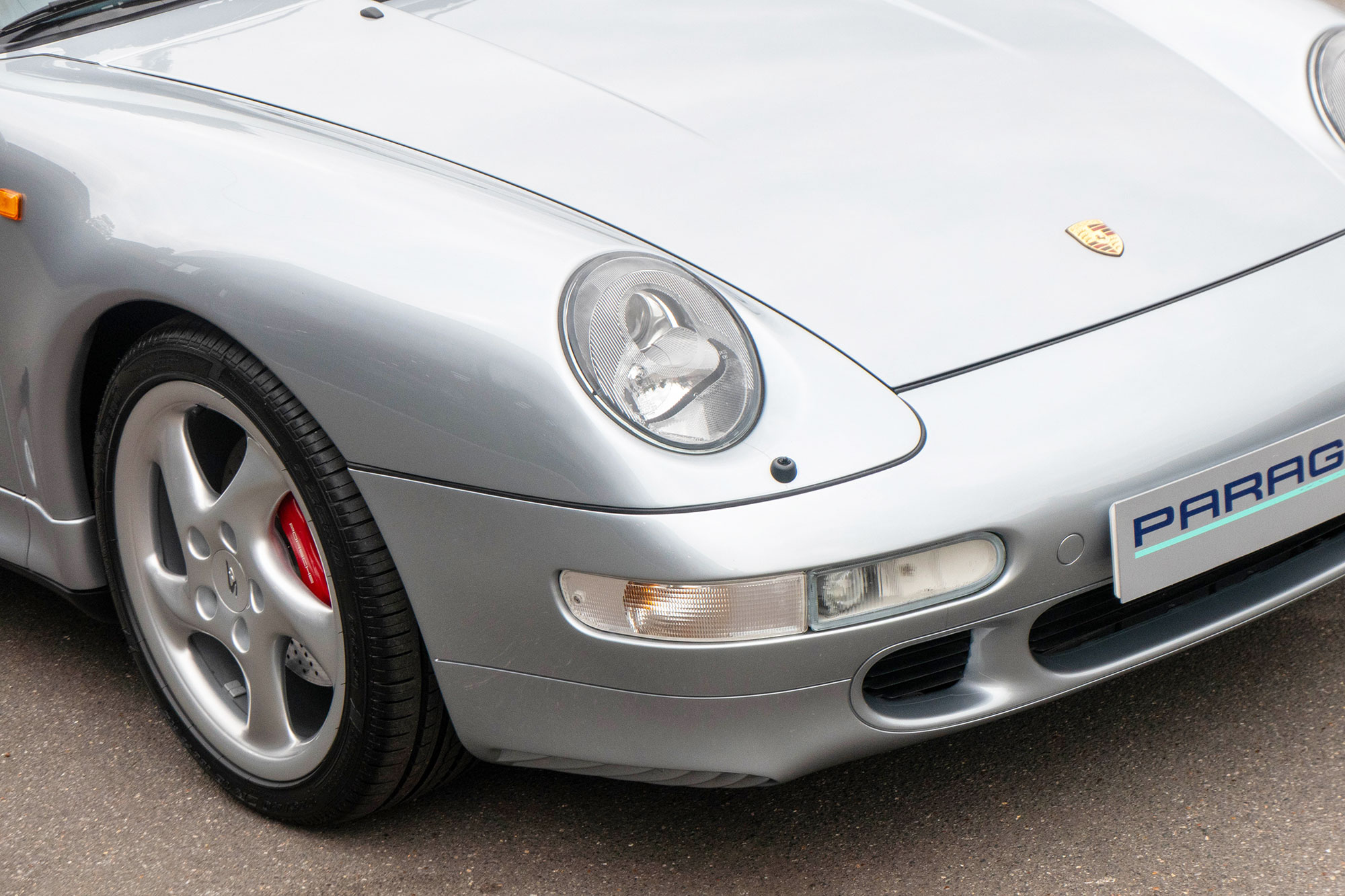 This 911 Carrera 4 S Coupe (993) has the 6-speed manual gearbox and is presented in Polar Silver with Dark Blue leather sports seats.