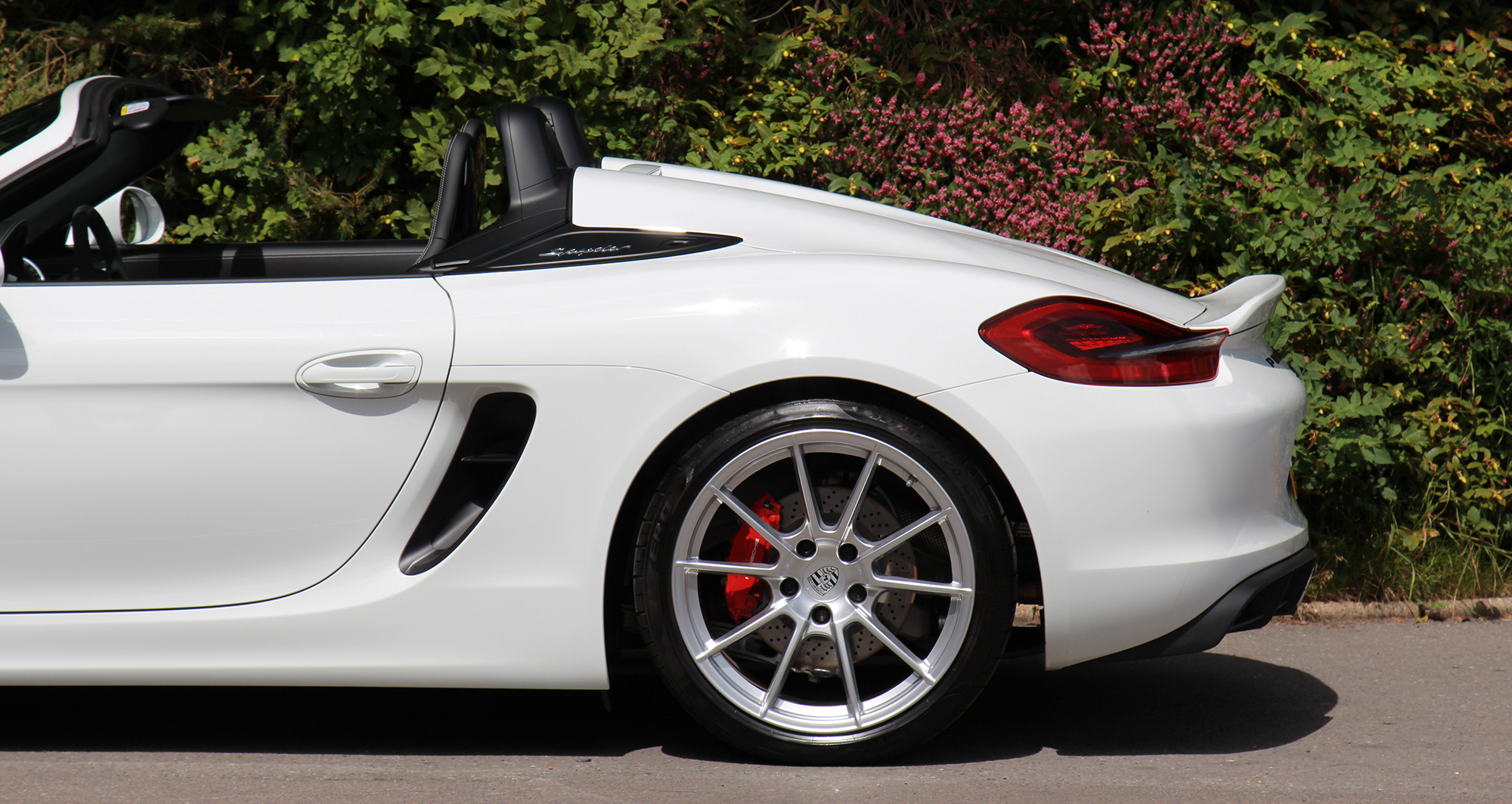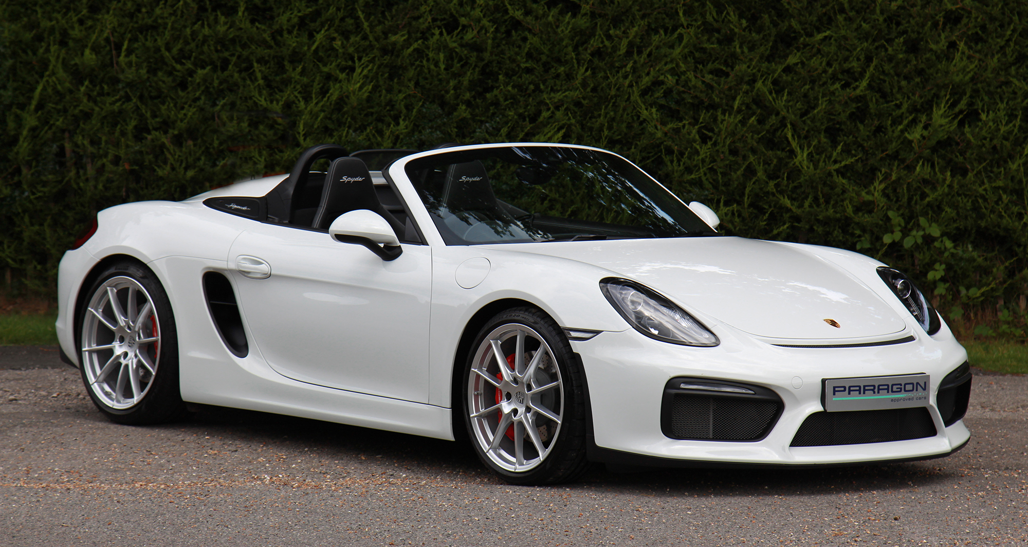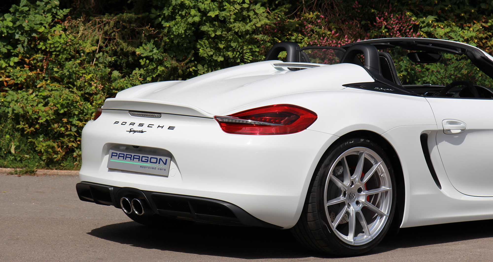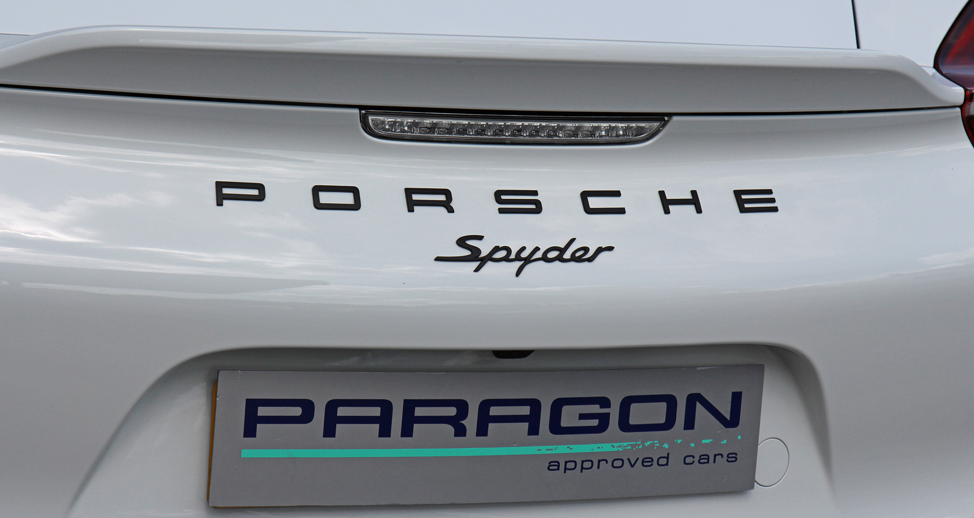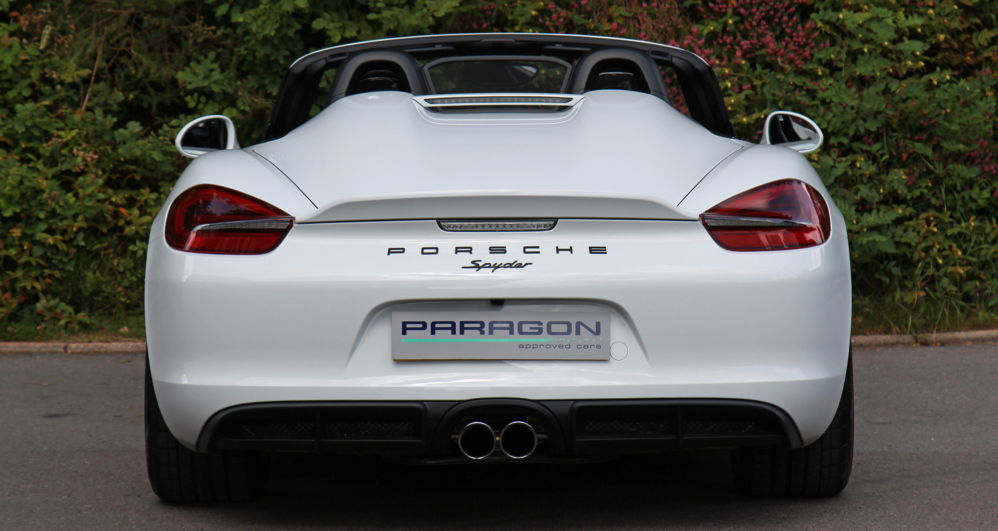 The 3.8 litre flat six engine develops 375 bhp and standard features include a wind deflector, automatic lights, LED daytime running lights, a switchable sports exhaust, the Sport Chrono Pack with Sport Plus, 20" Boxster Spyder Design wheels and Porsche Stability Management (PSM).