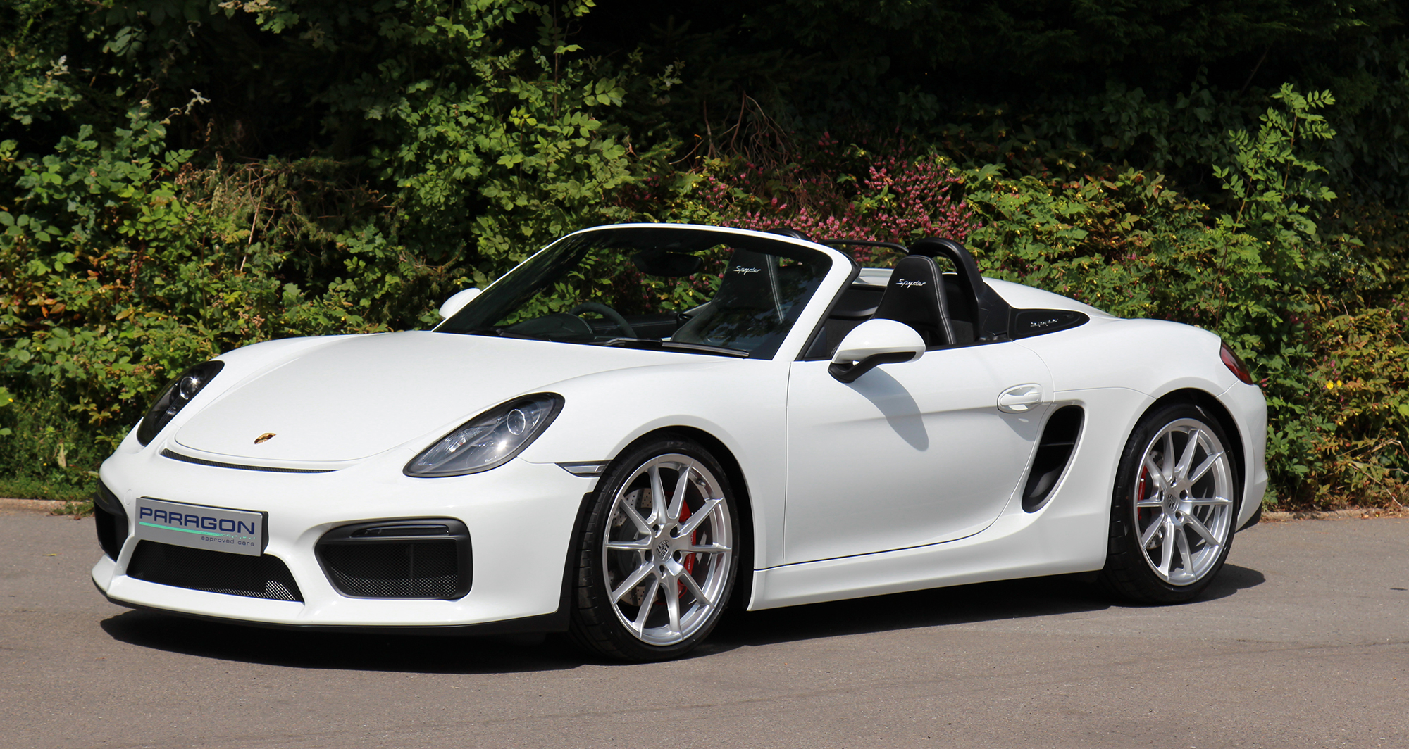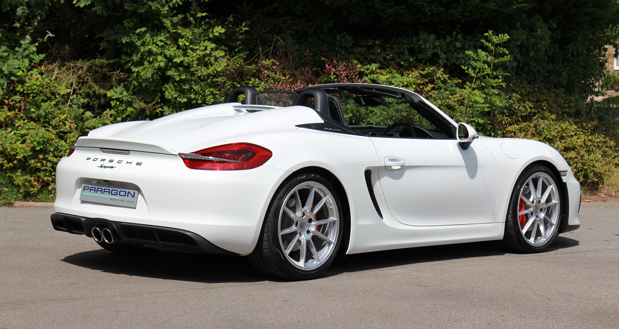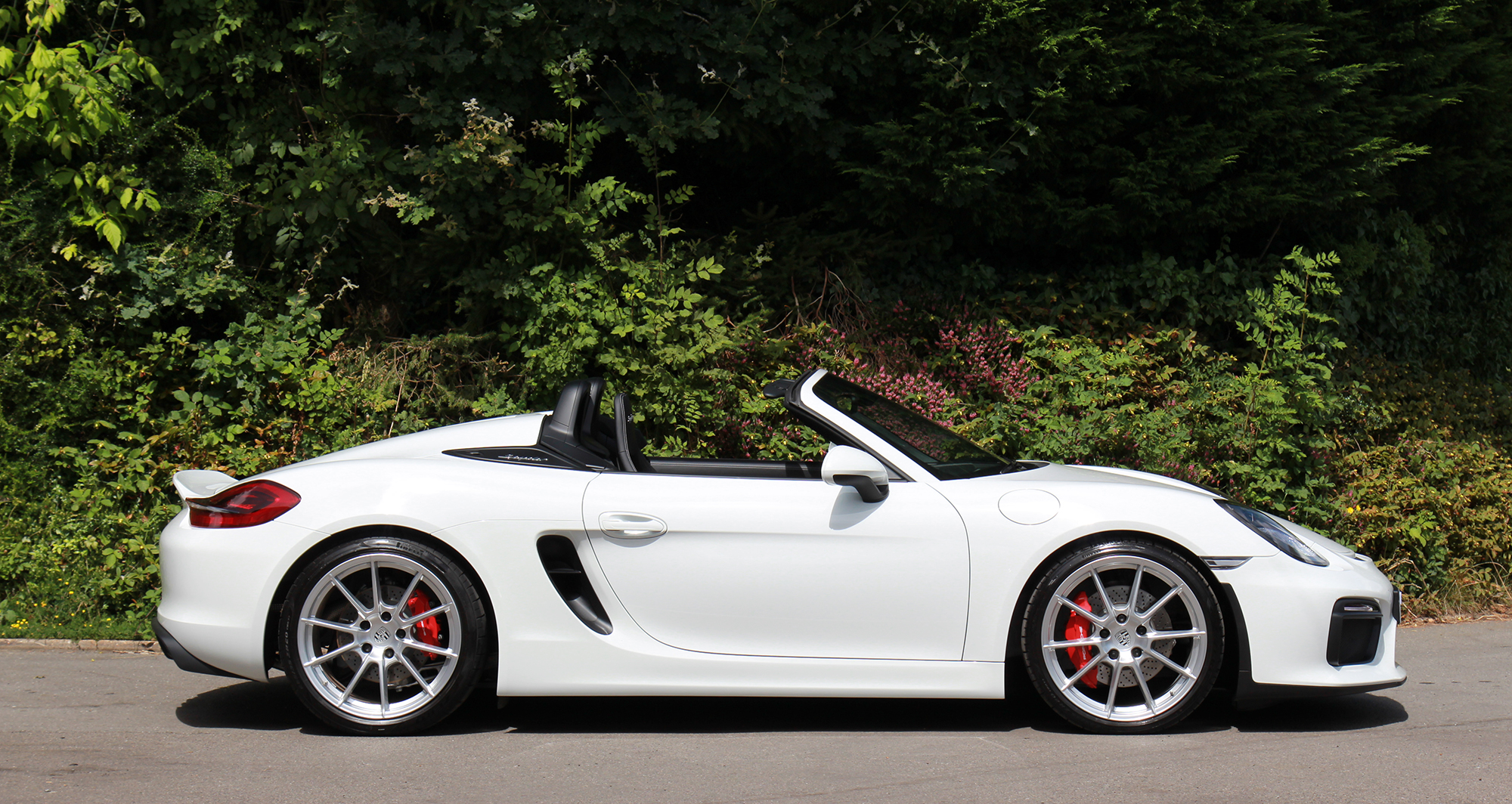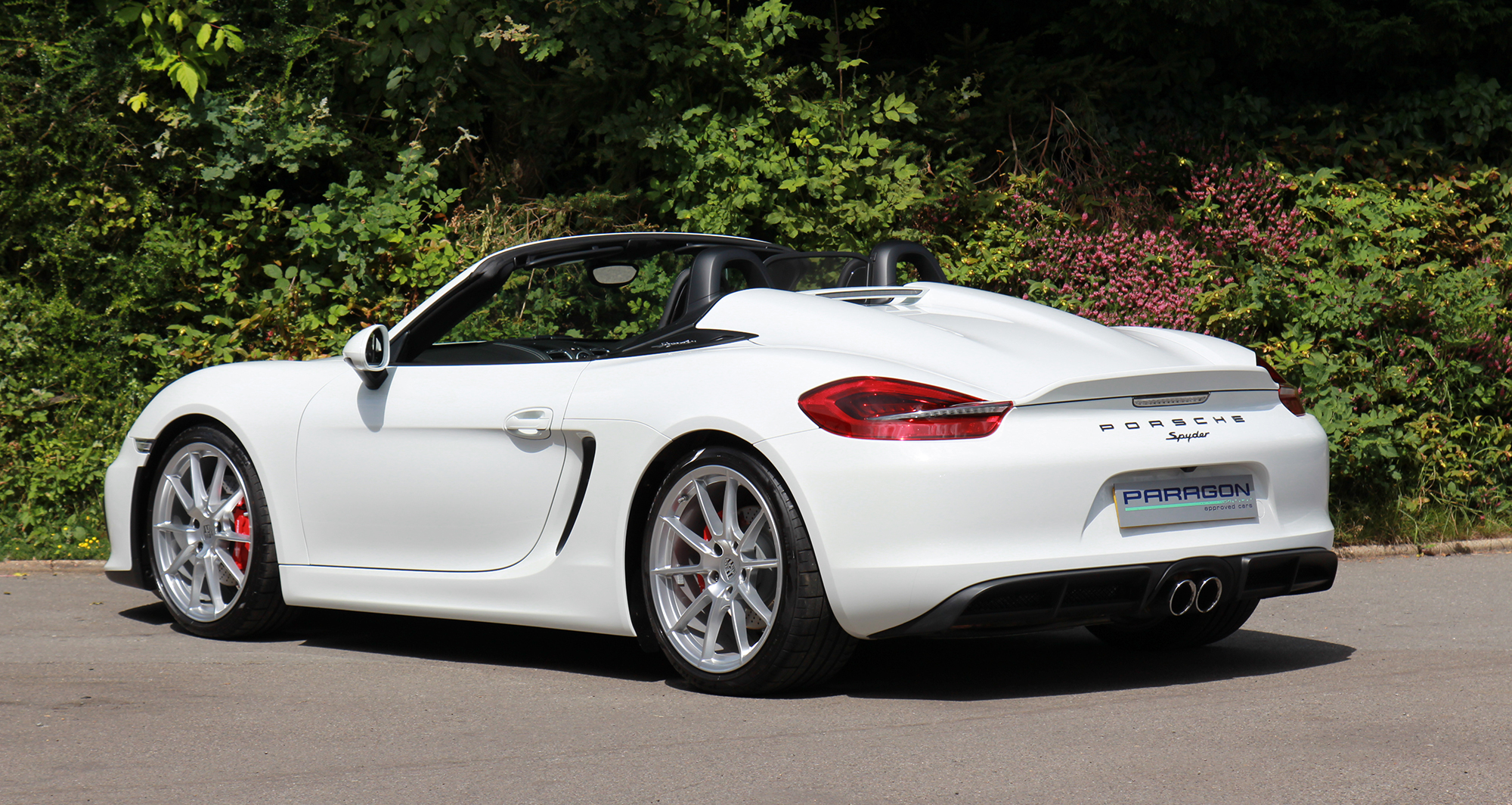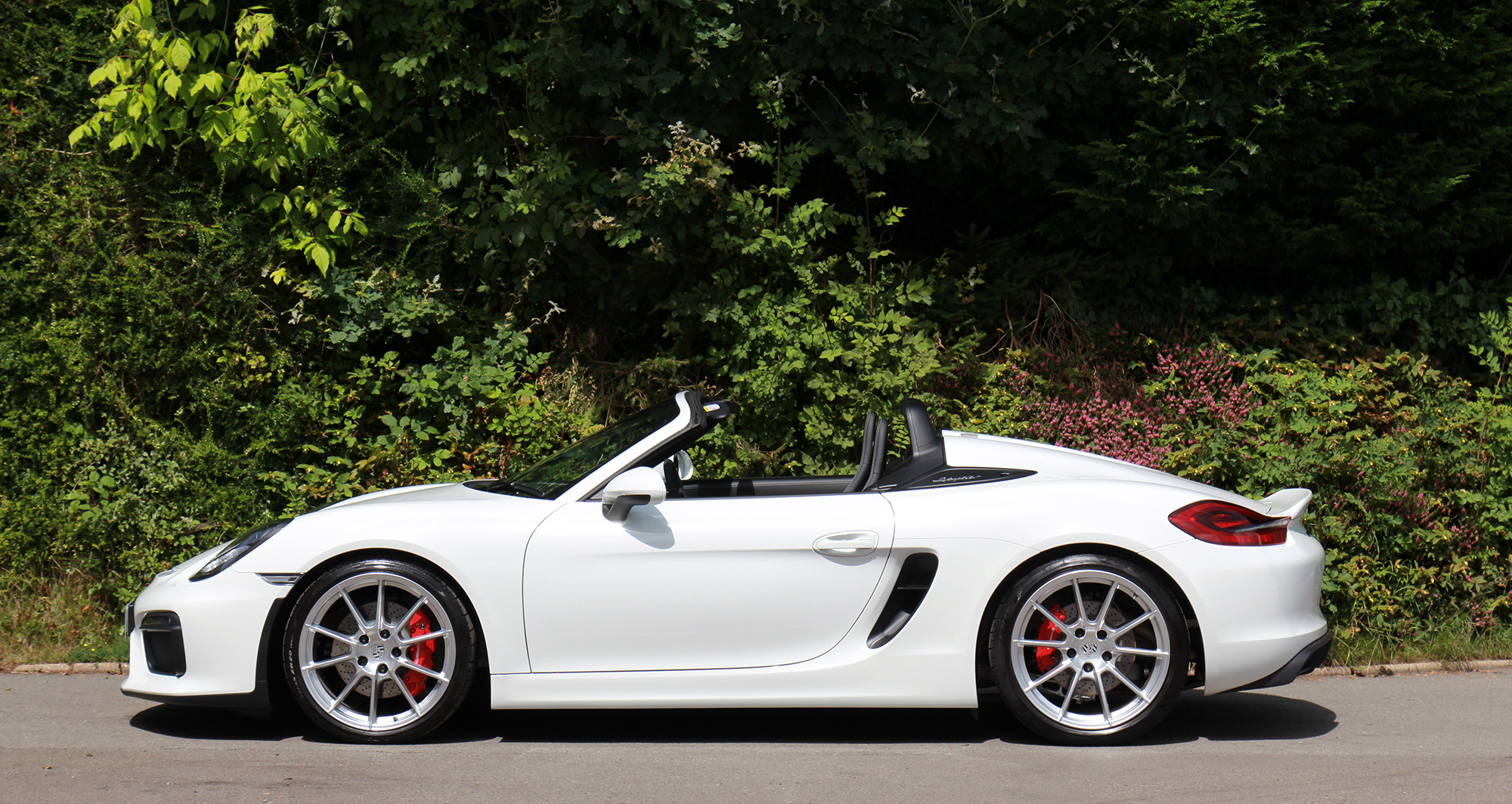 The 3.8 litre flat six engine develops 375 bhp and standard features include a wind deflector, automatic lights, LED daytime running lights, a switchable sports exhaust, the Sport Chrono Pack with Sport Plus, 20" Boxster Spyder Design wheels and Porsche Stability Management (PSM).