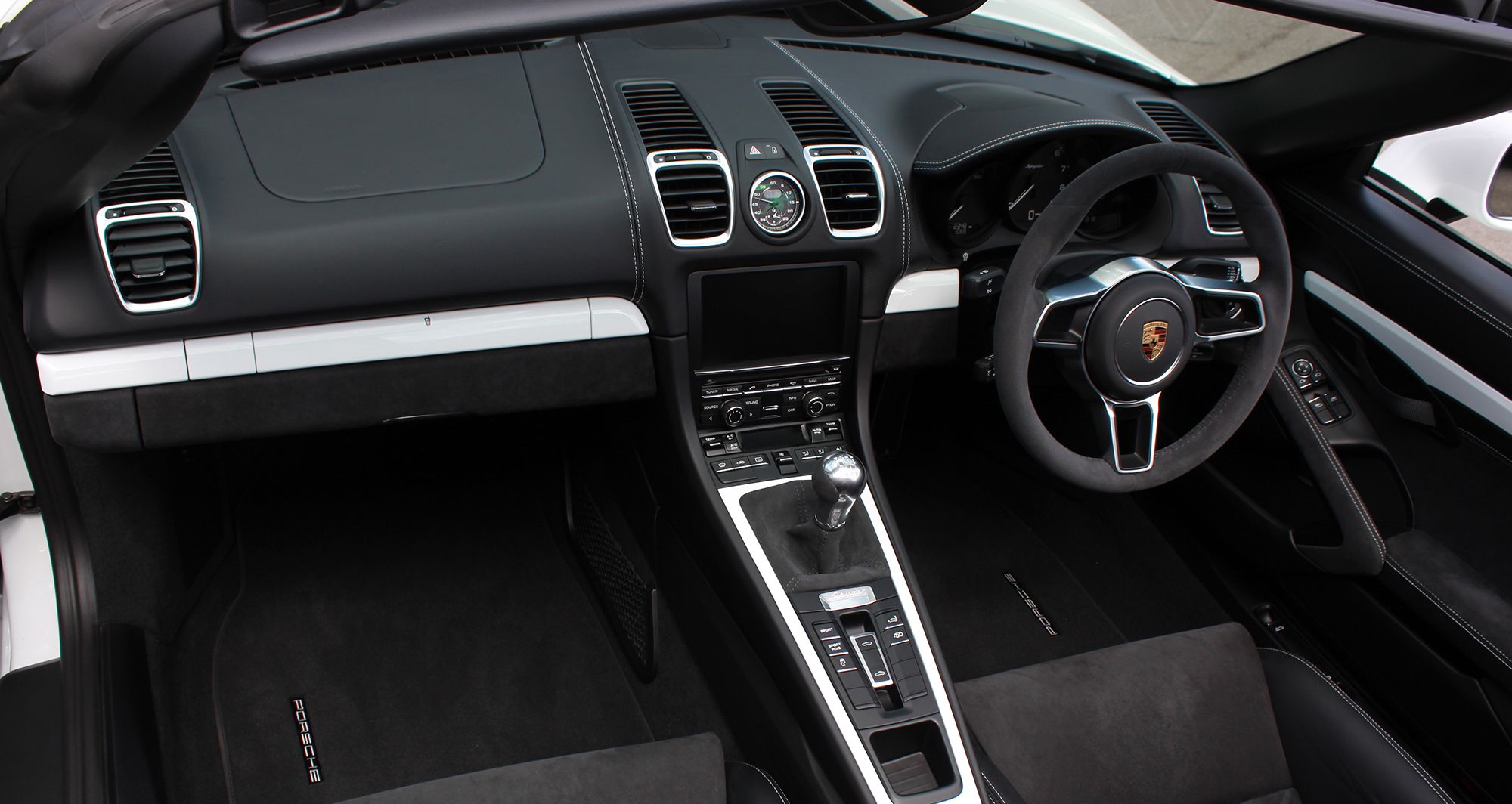This gorgeous Boxster Spyder (981) has the 6-speed manual gearbox and is presented in Carrara White with black half leather bucket seats with Alcantara inserts.