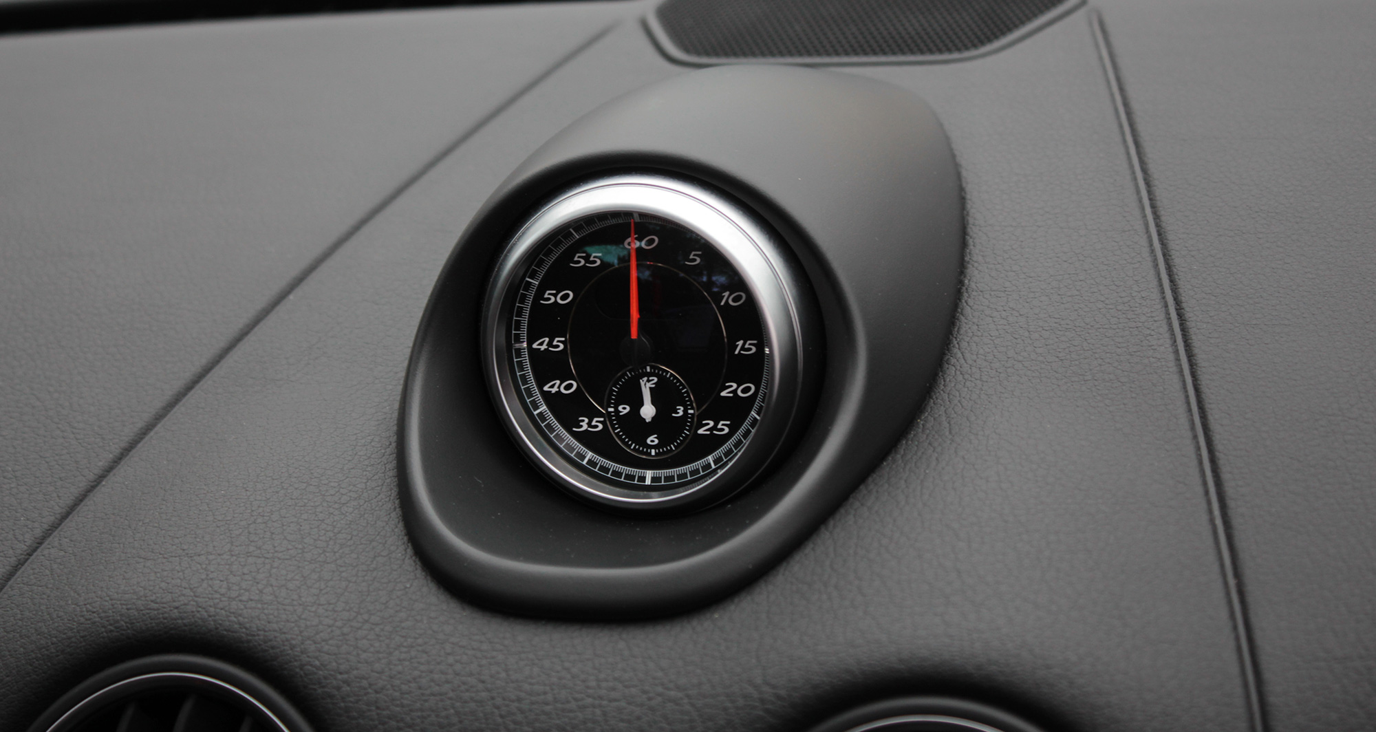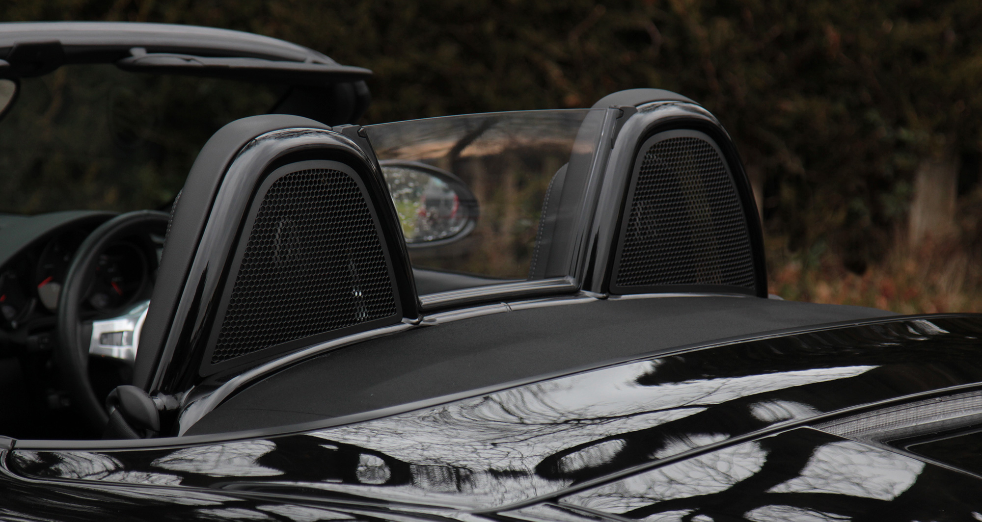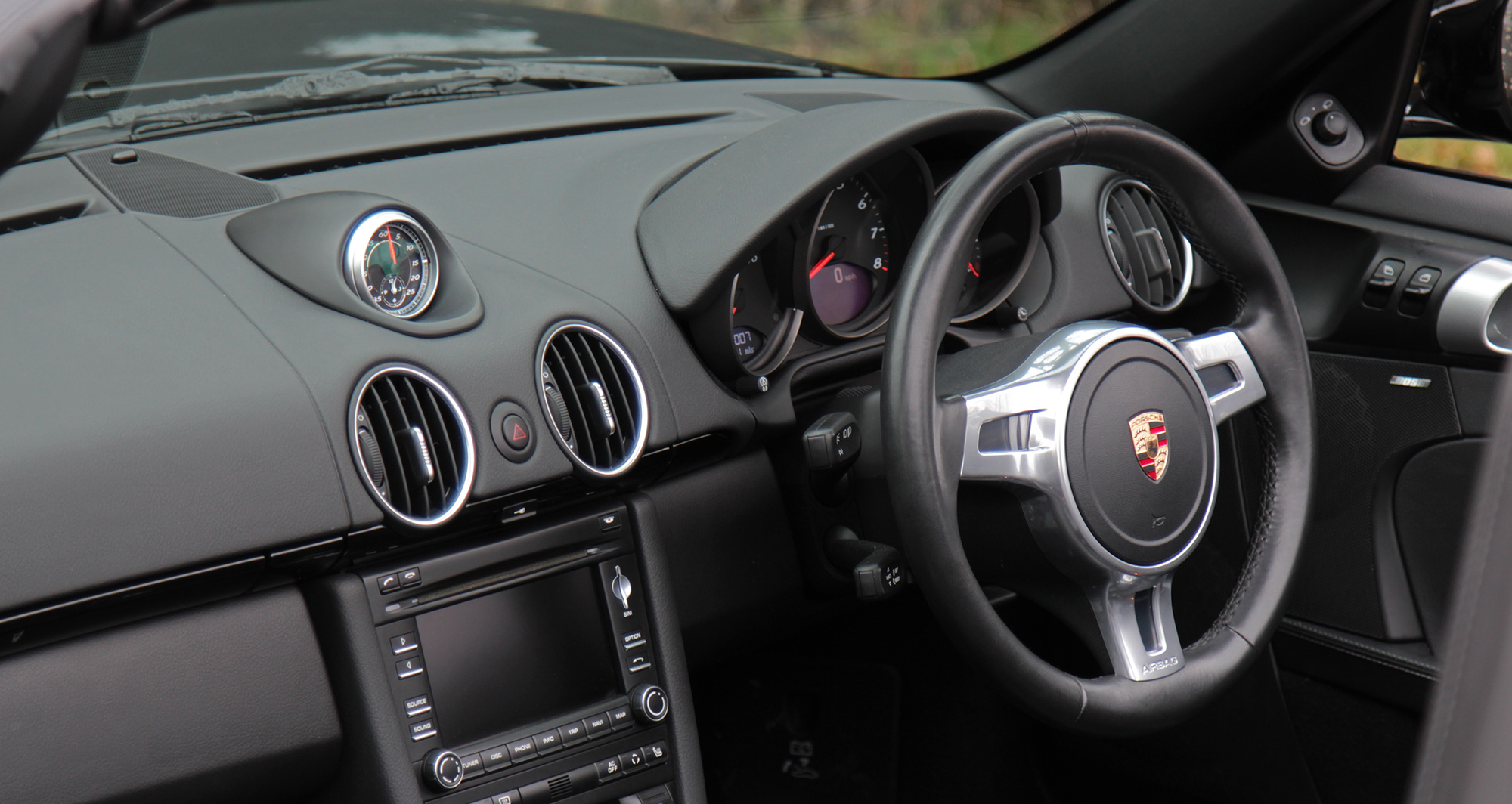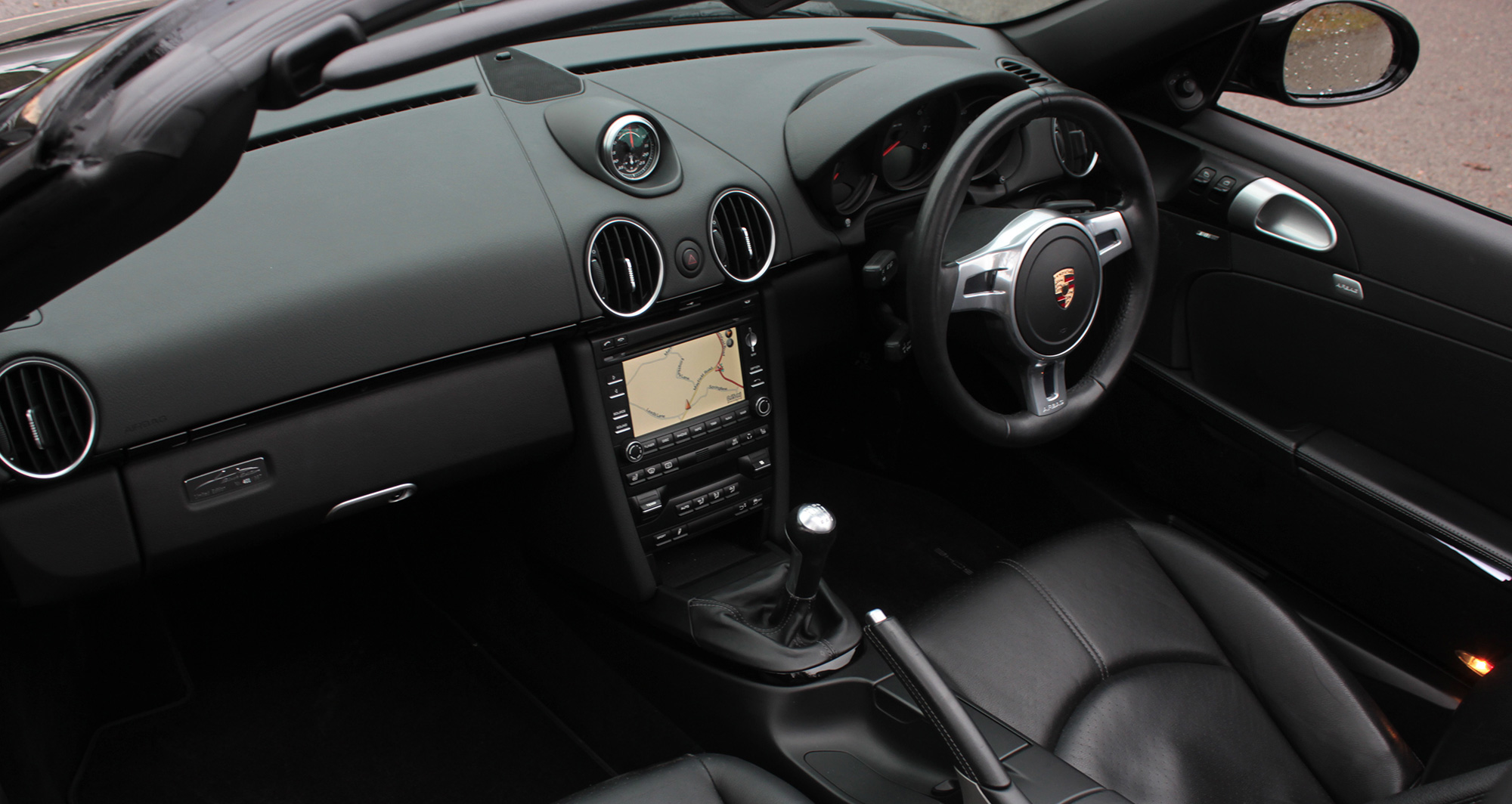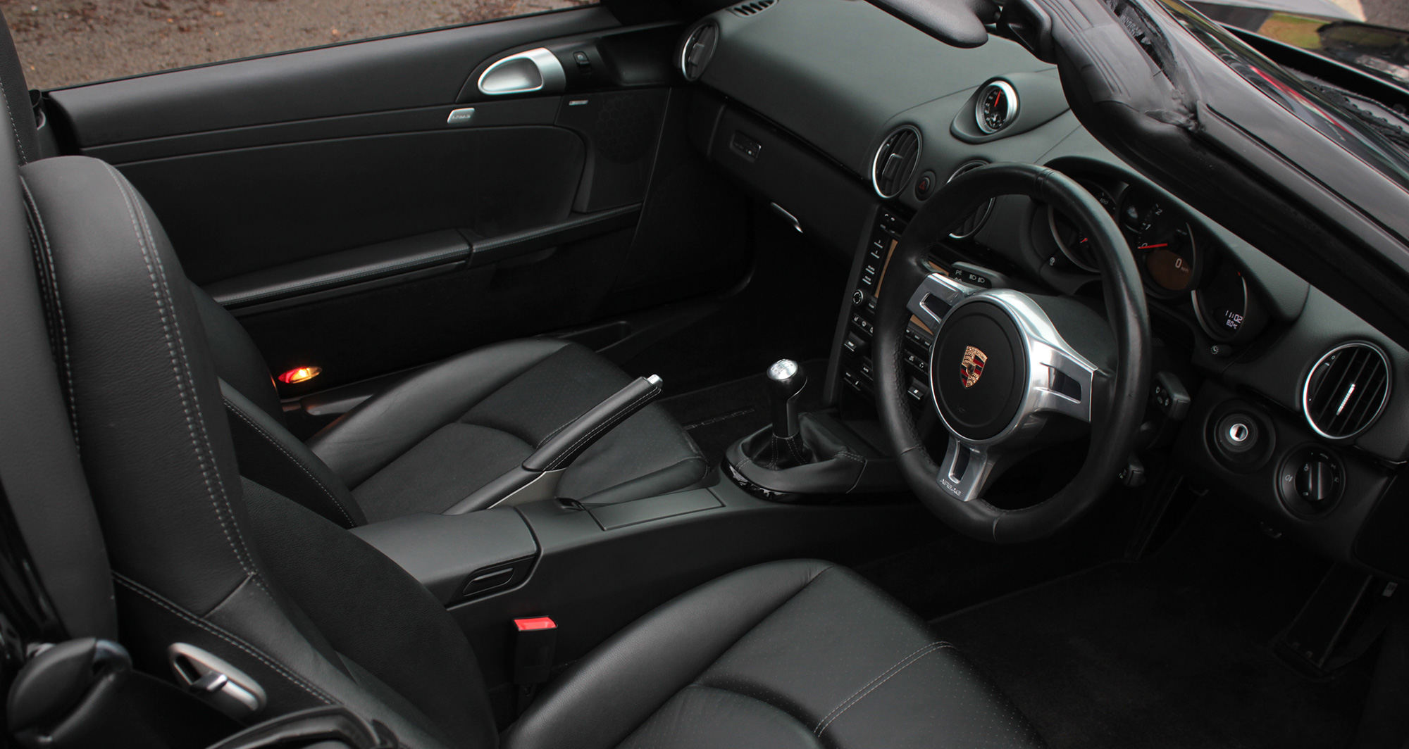 This Boxster S Black Edition has the 6-speed manual gearbox, and is presented (unsurprisingly) in Jet Black with black leather seats and a black power hood.