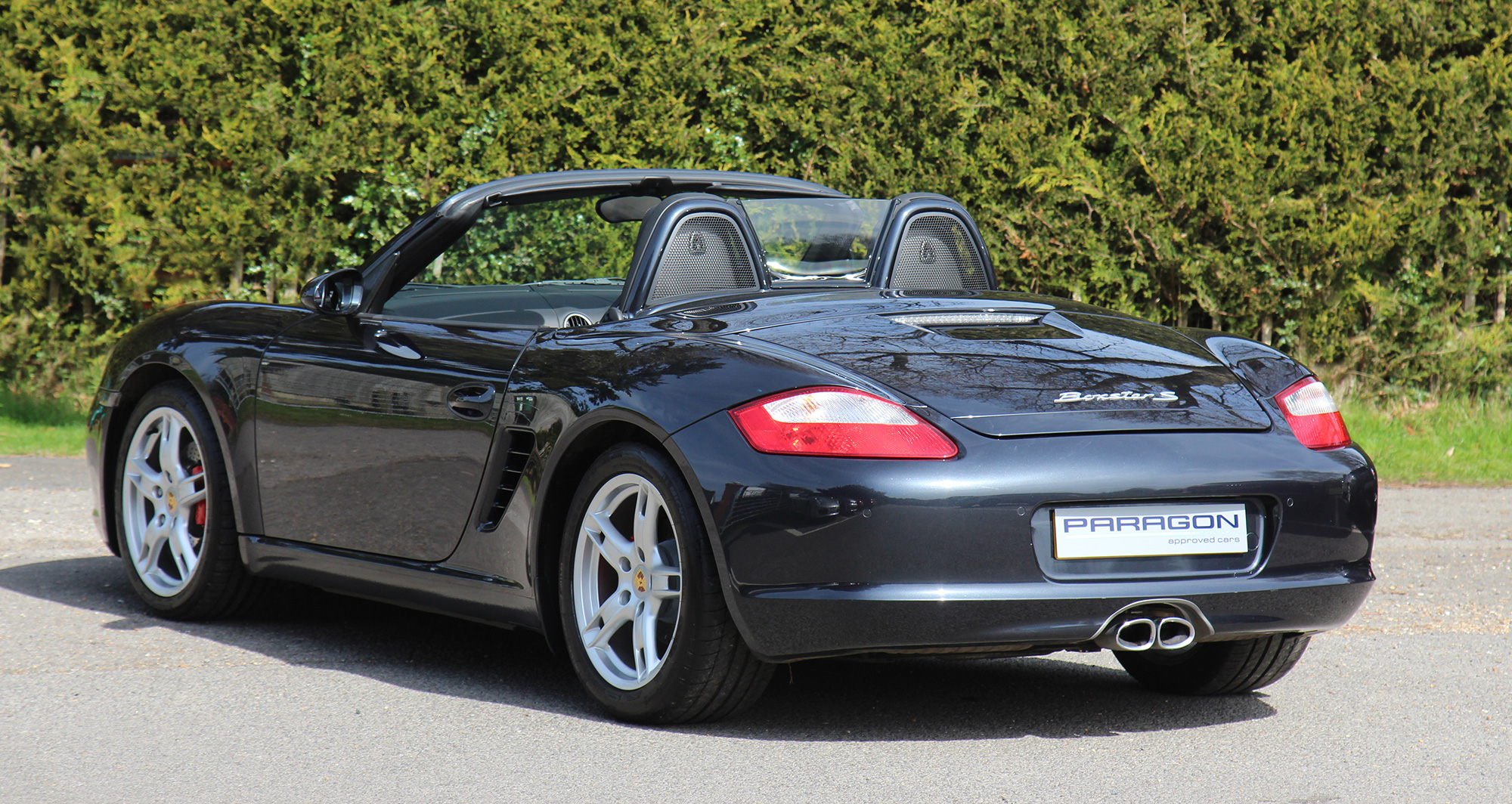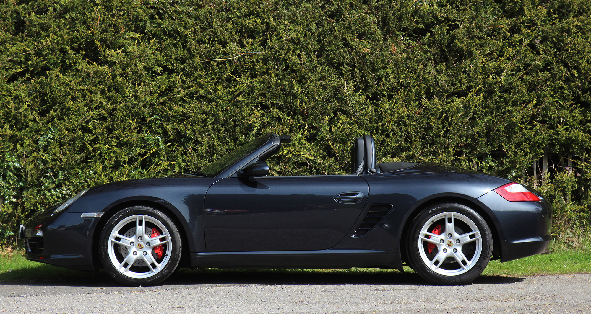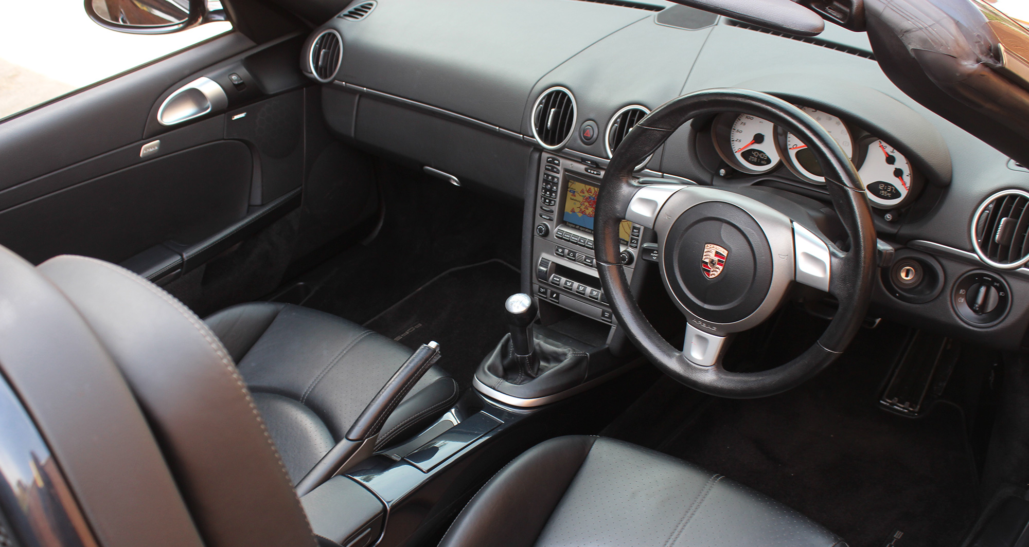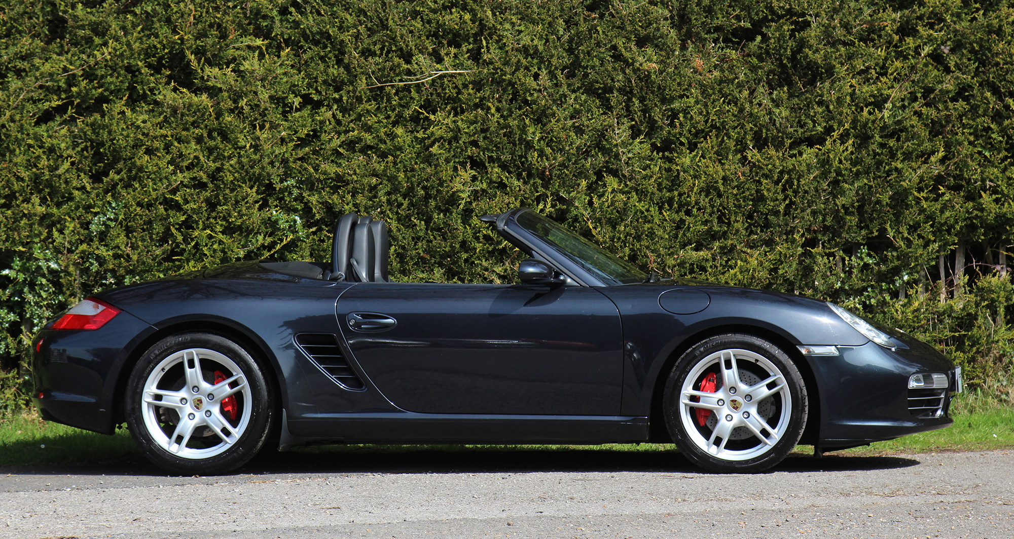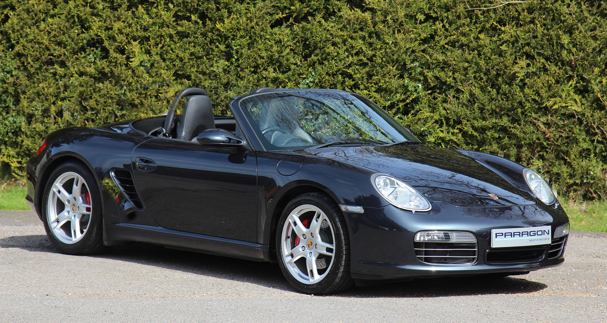 This Boxster S (987) has the 6-speed manual gearbox and is presented in Atlas Grey with black leather seats and a black power hood.