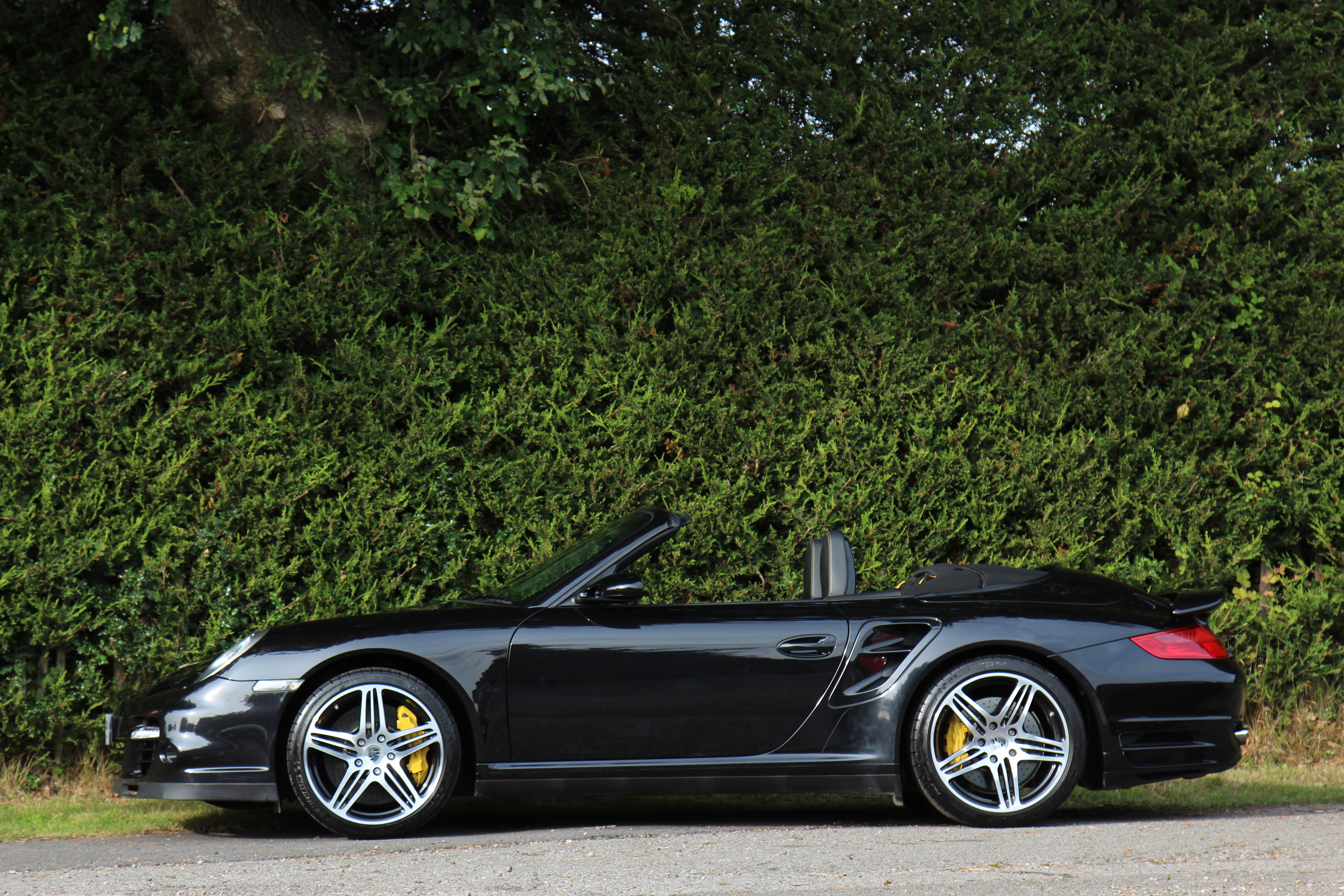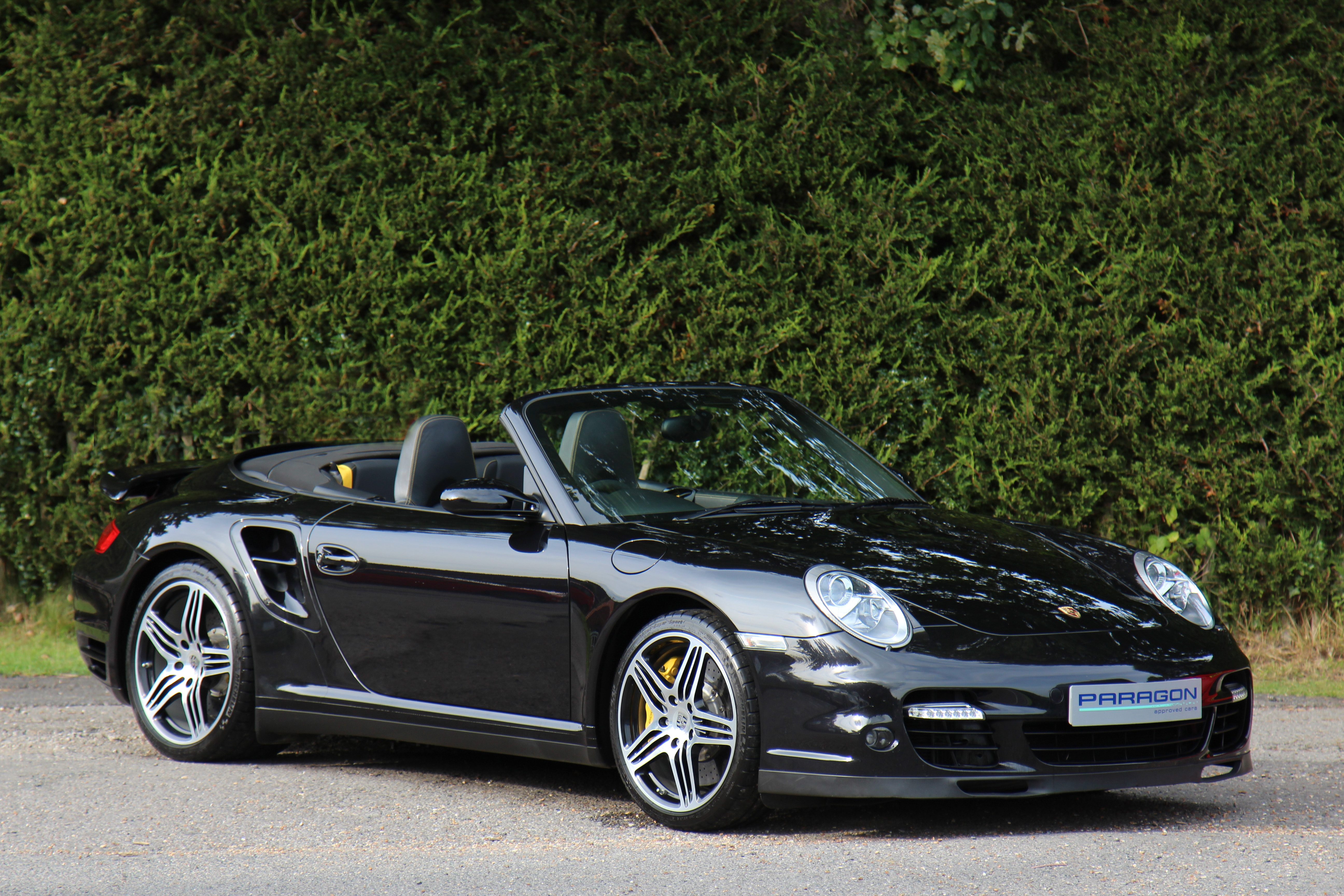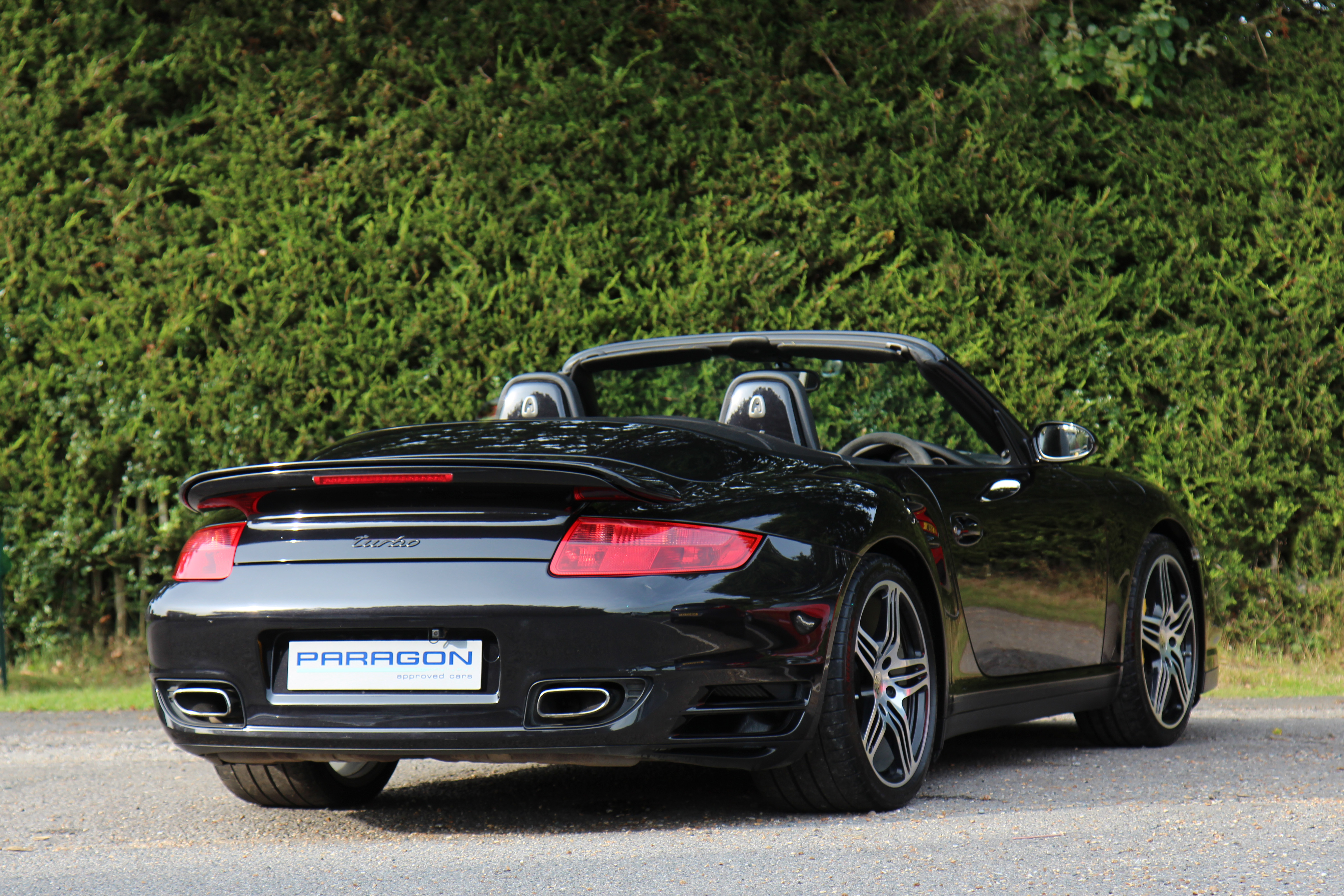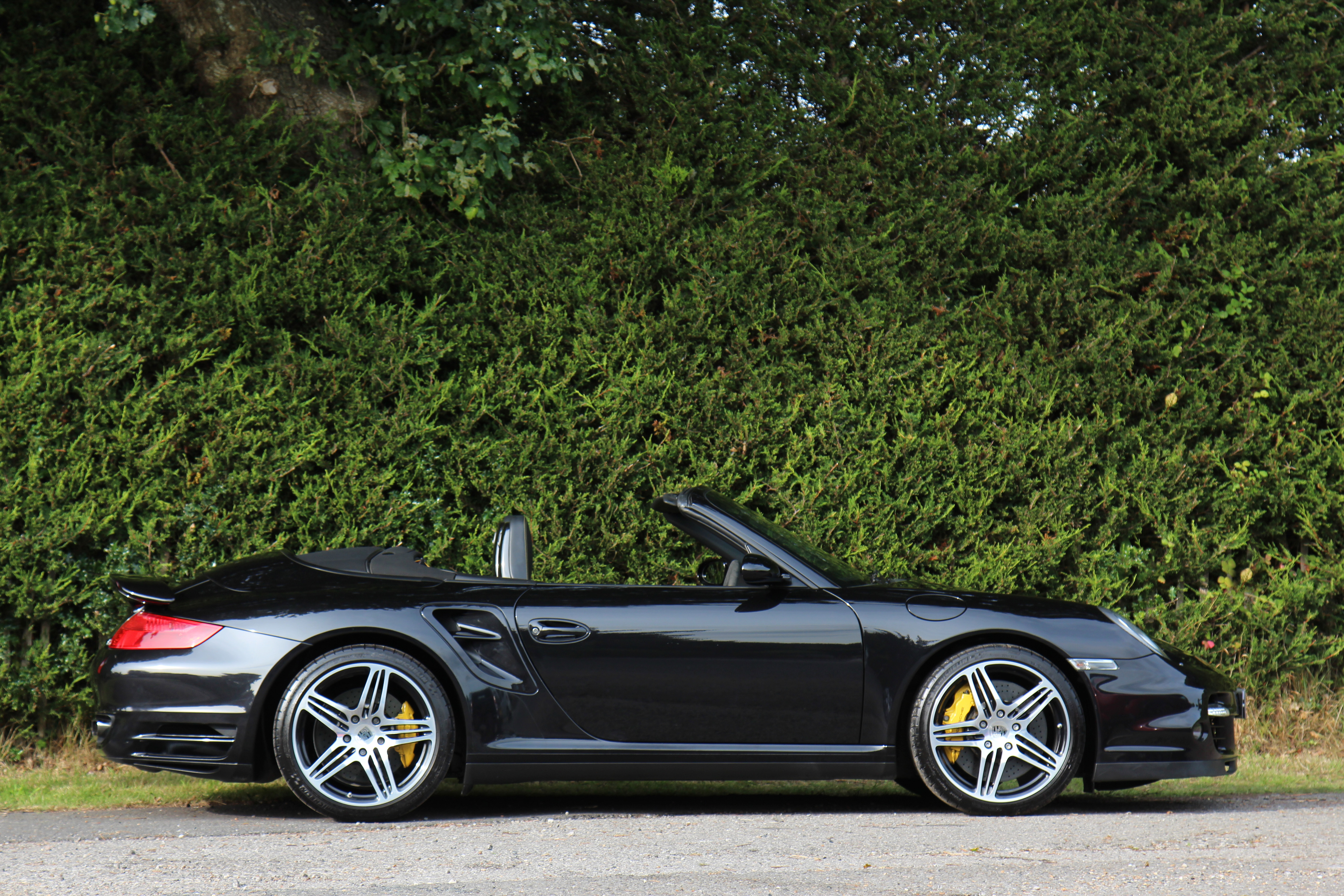 This 911 Turbo Cabriolet (997) has the Tiptronic S gearbox with fingertip gear change and is presented in Basalt Black with black leather seats.