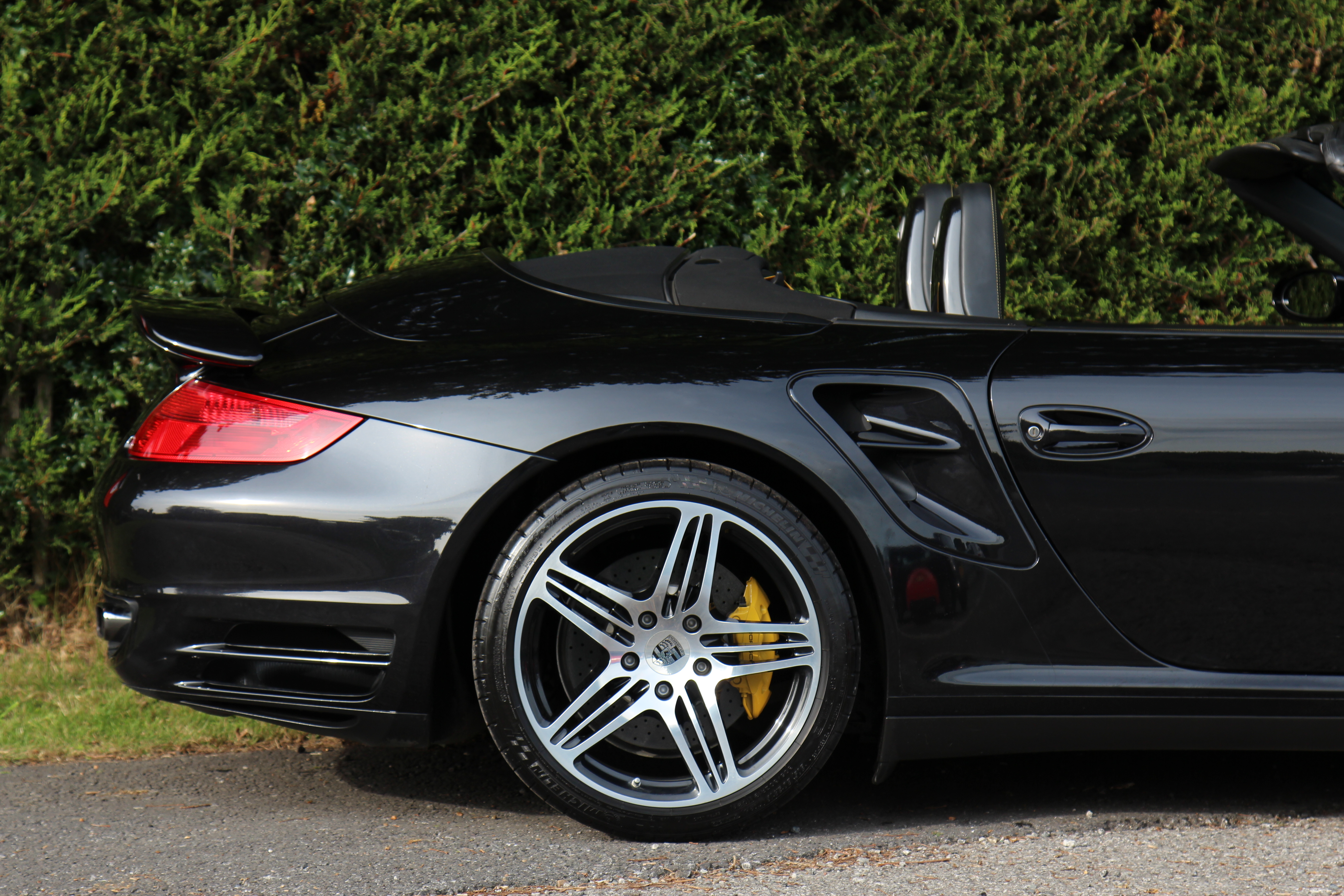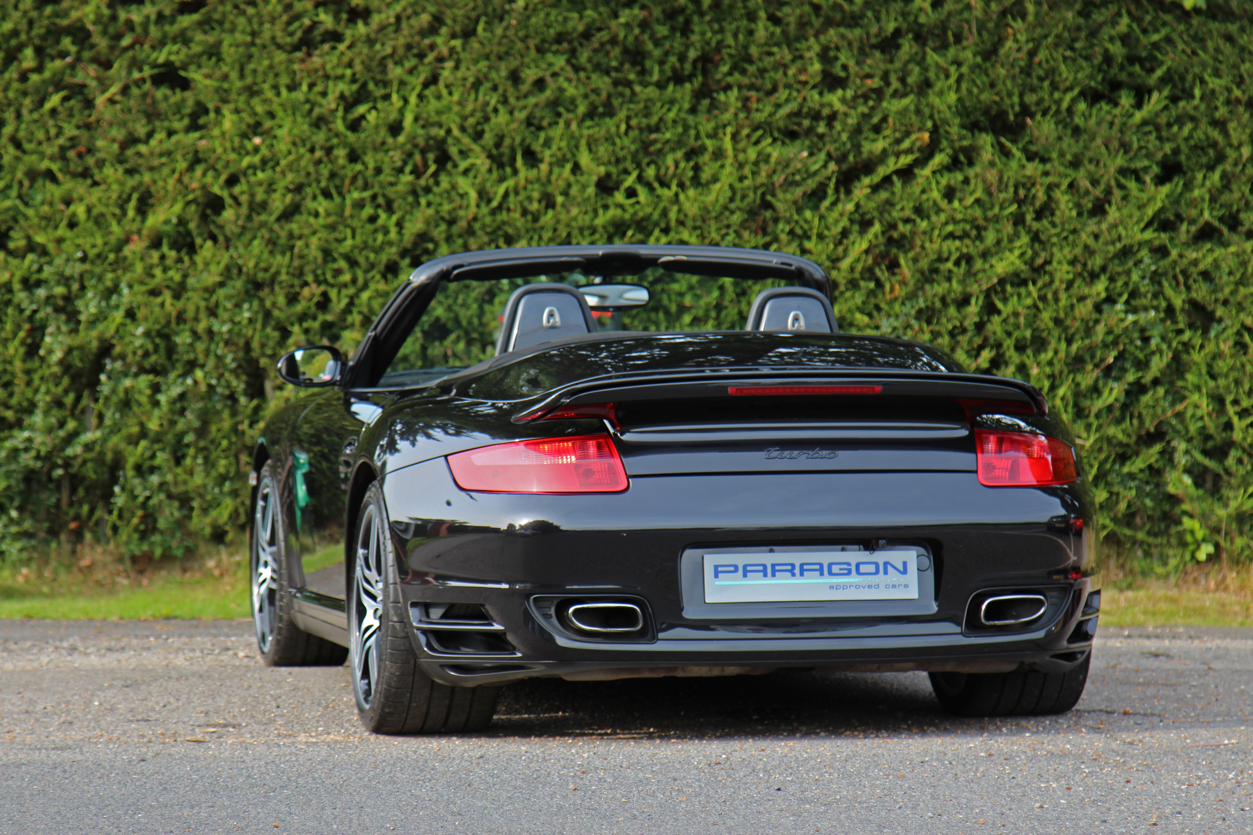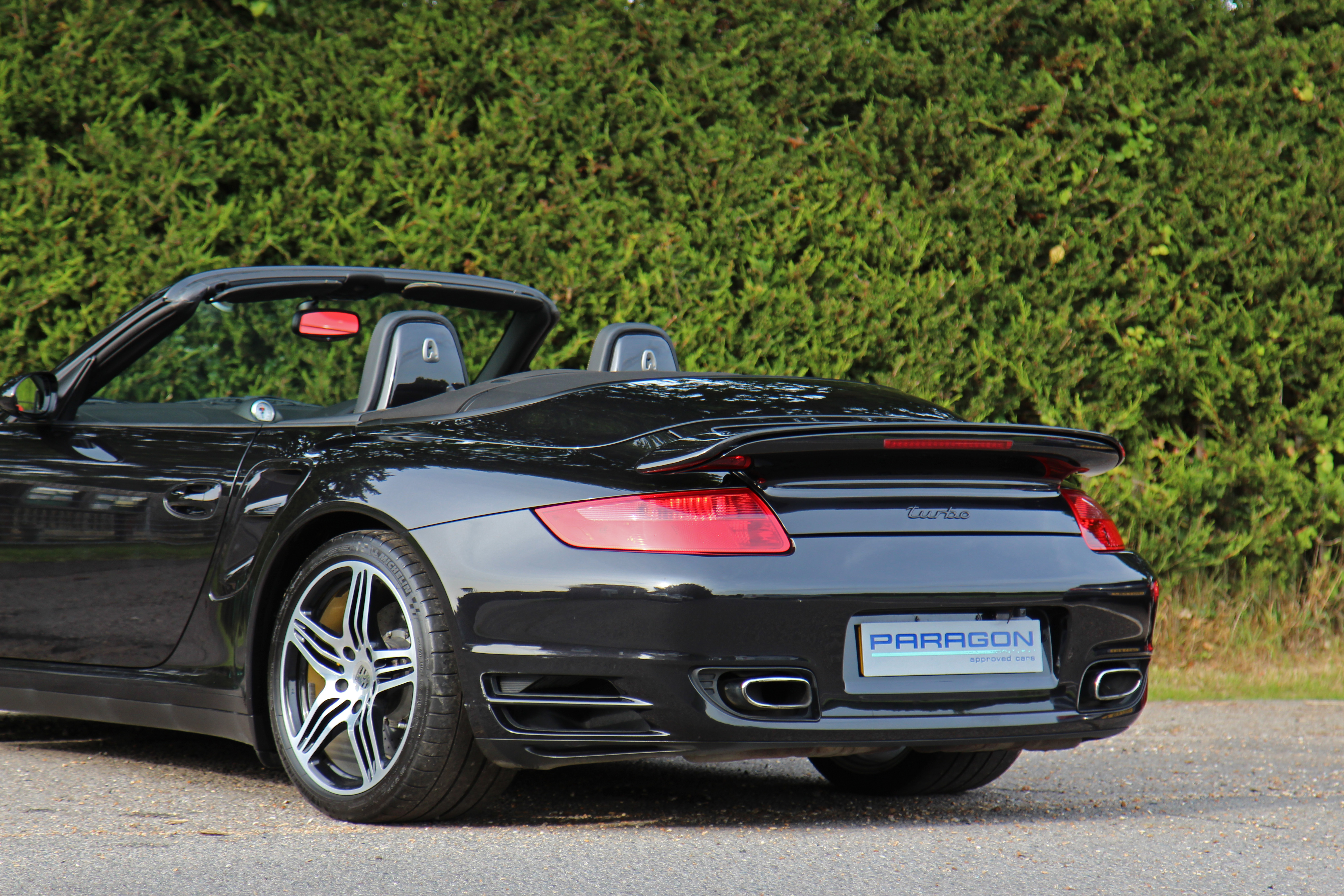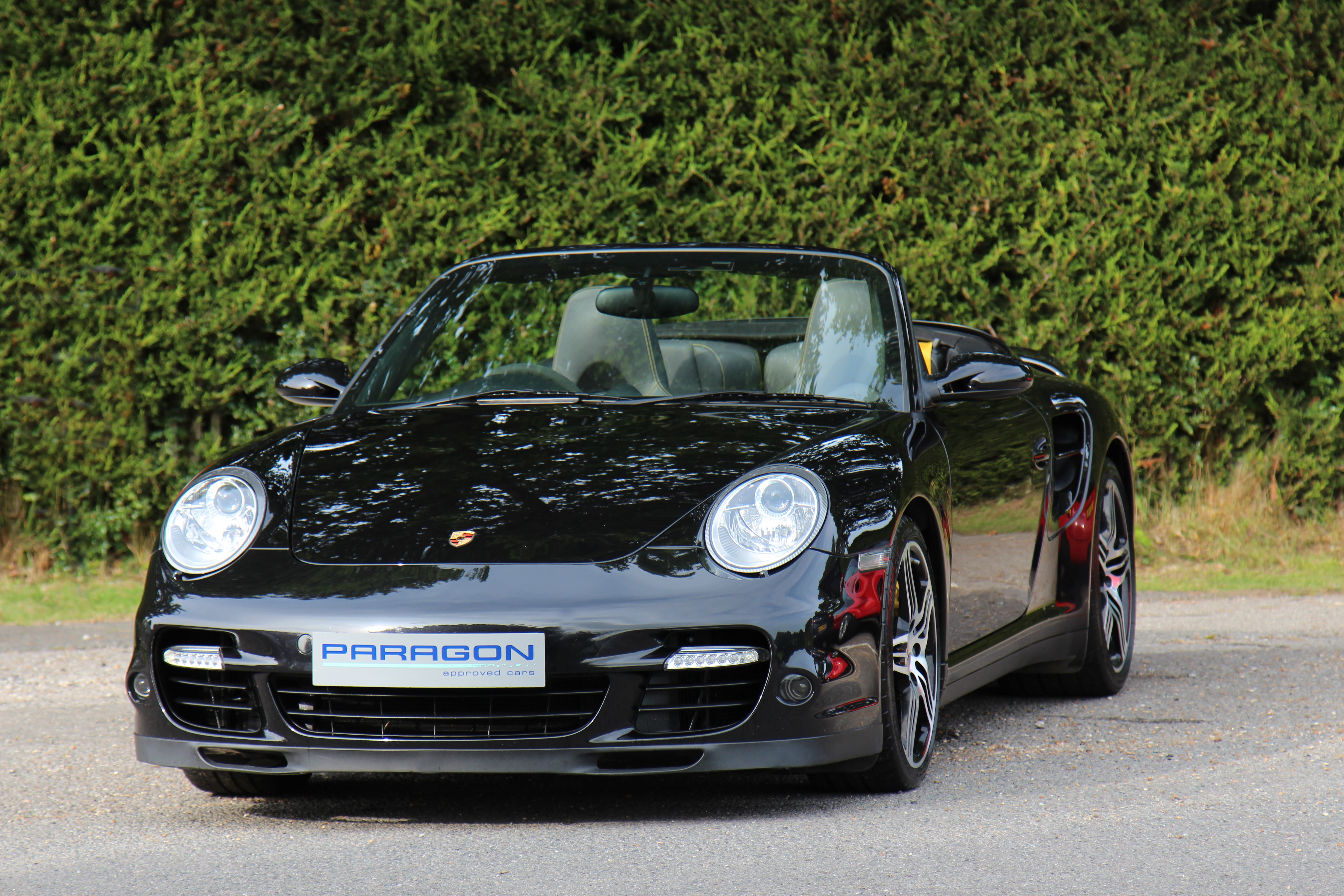 This 911 Turbo Cabriolet (997) has the Tiptronic S gearbox with fingertip gear change and is presented in Basalt Black with black leather seats.