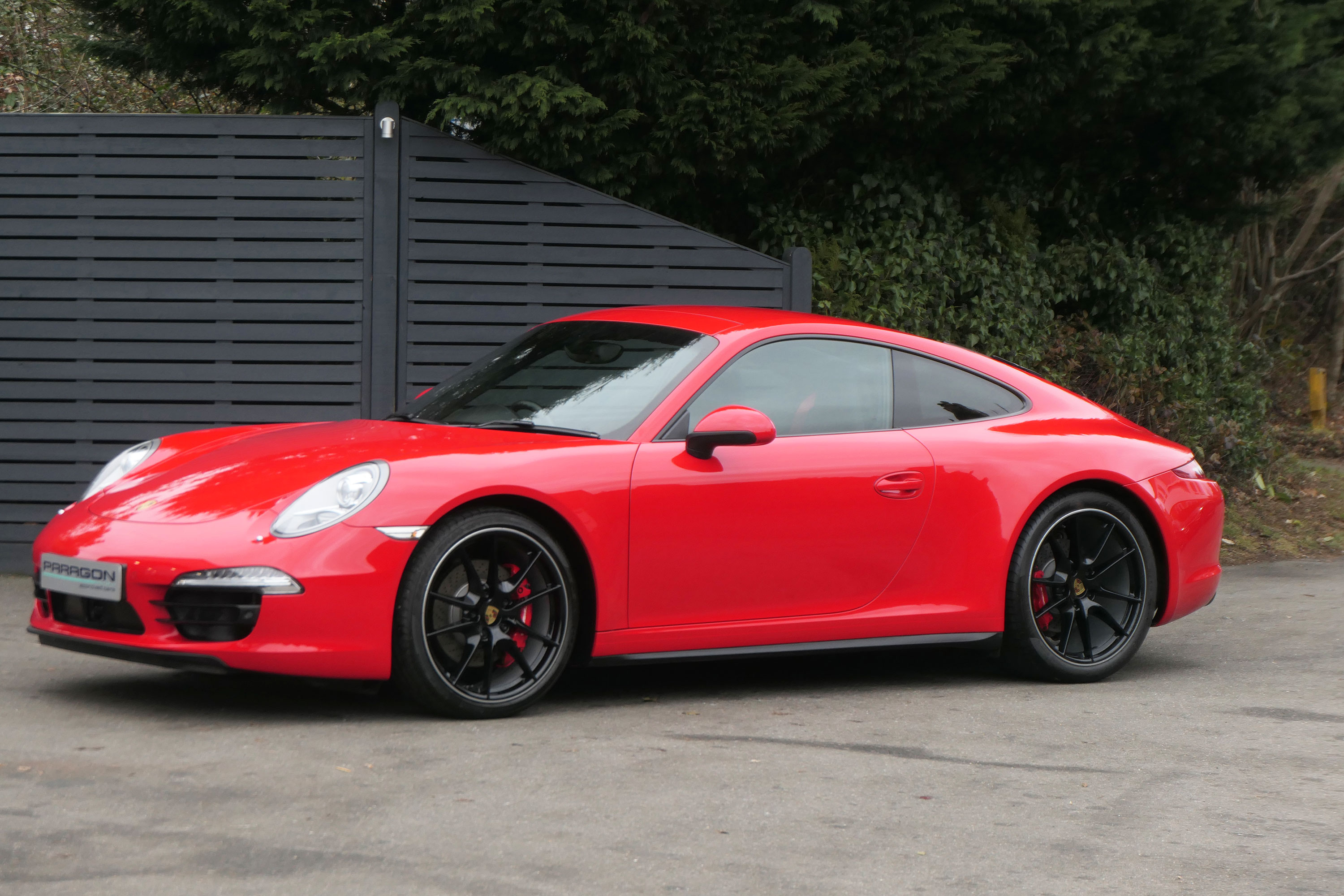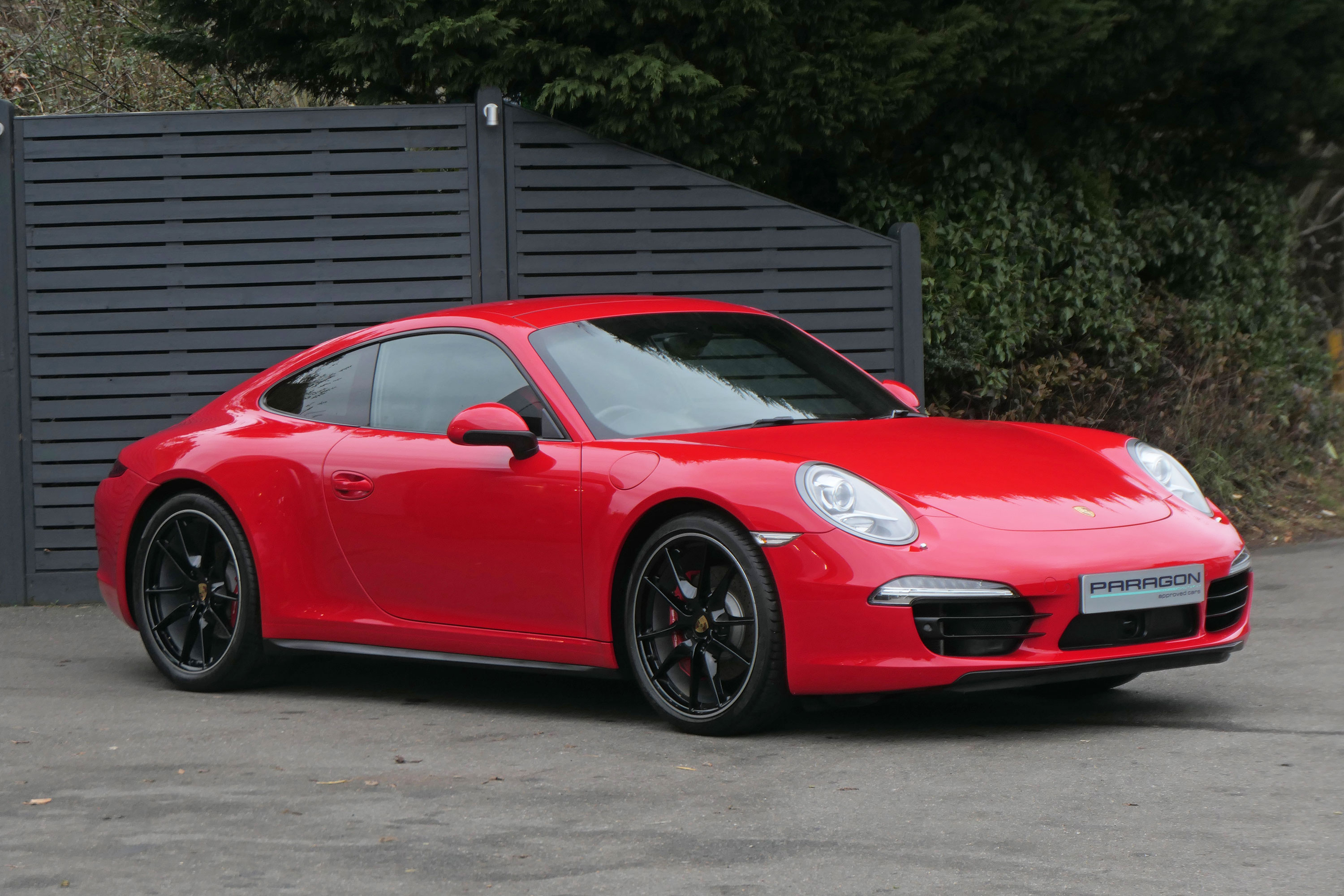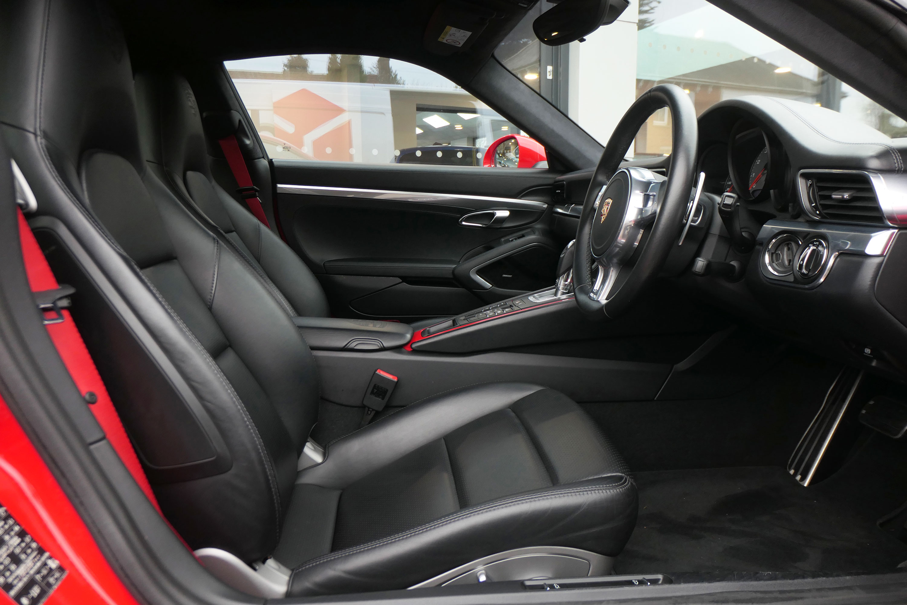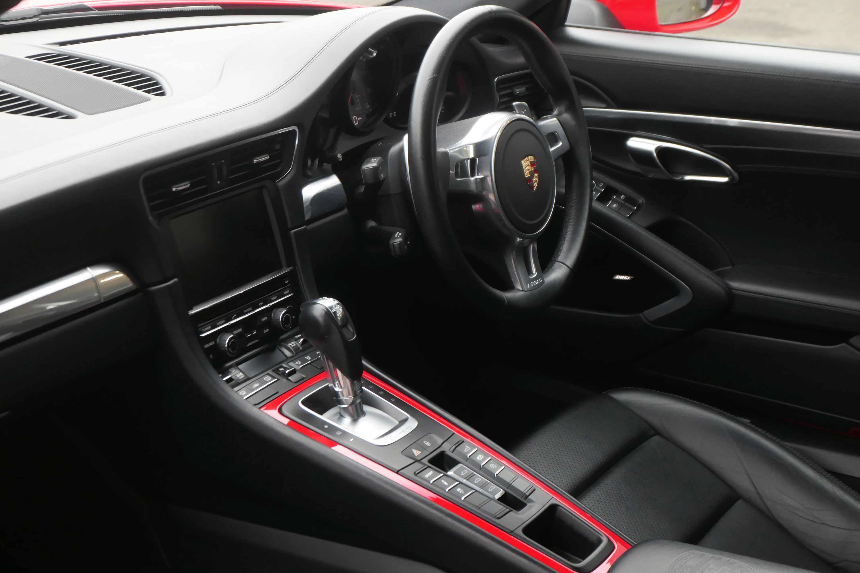This 911 Carrera 4 S Coupe (991) has the 7-speed PDK gearbox and is presented in Guards Red with black leather sports seats.