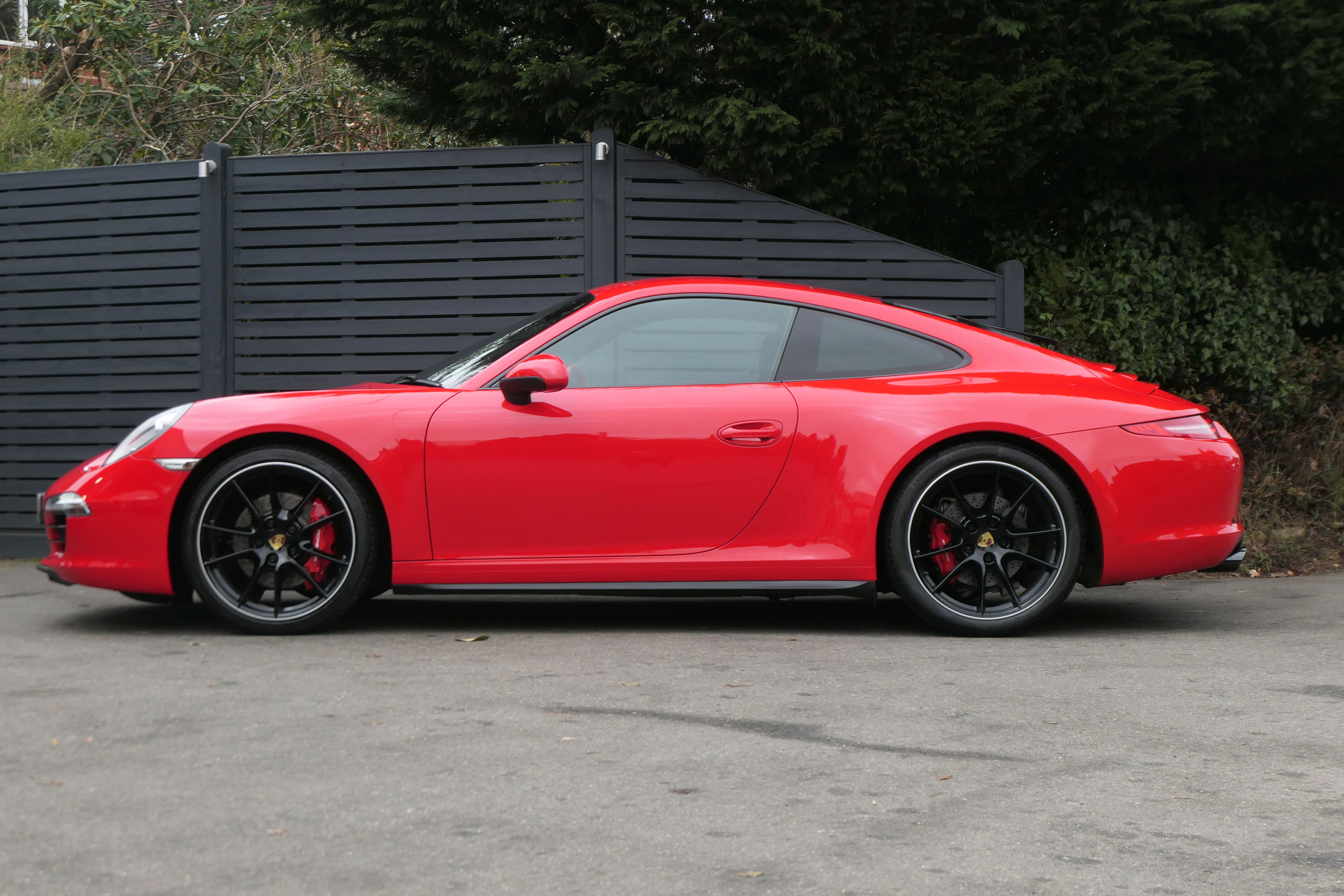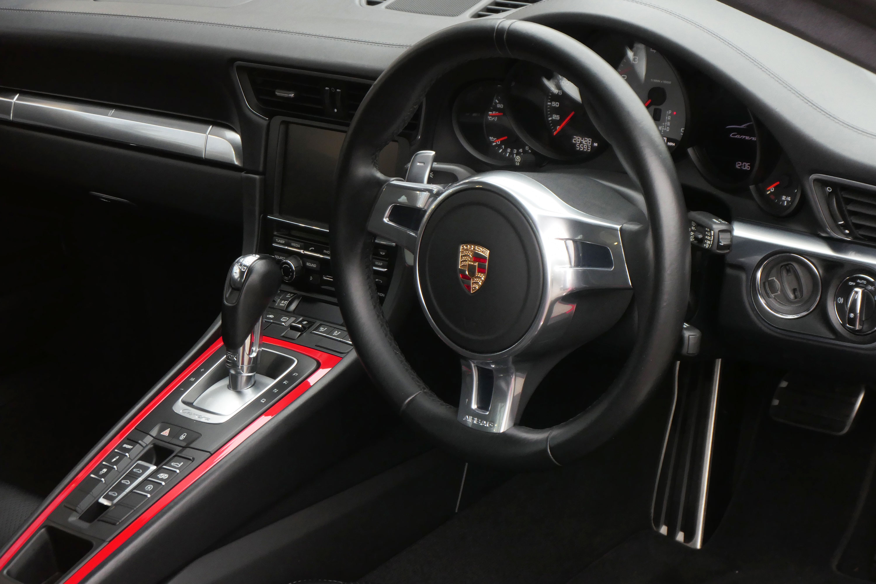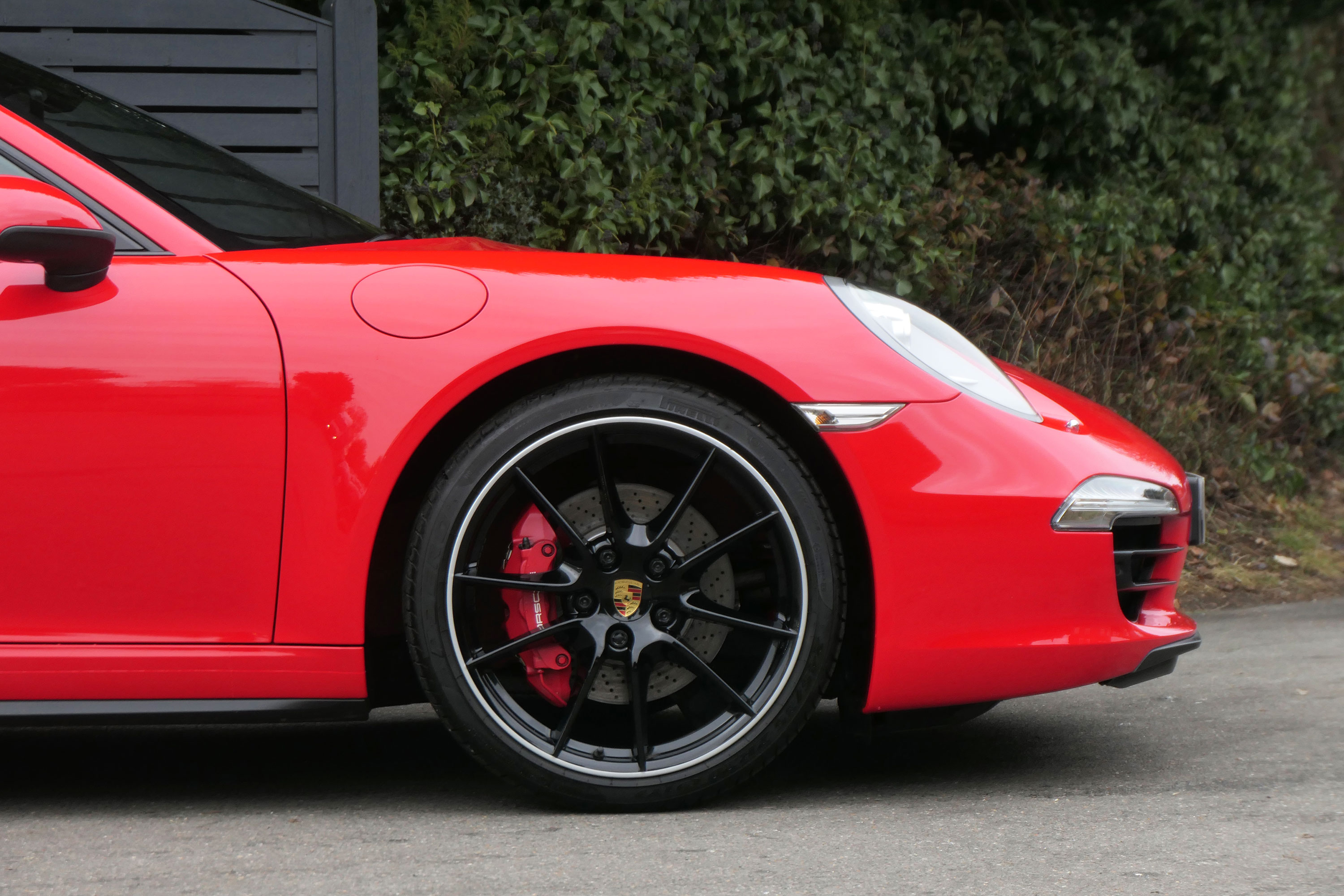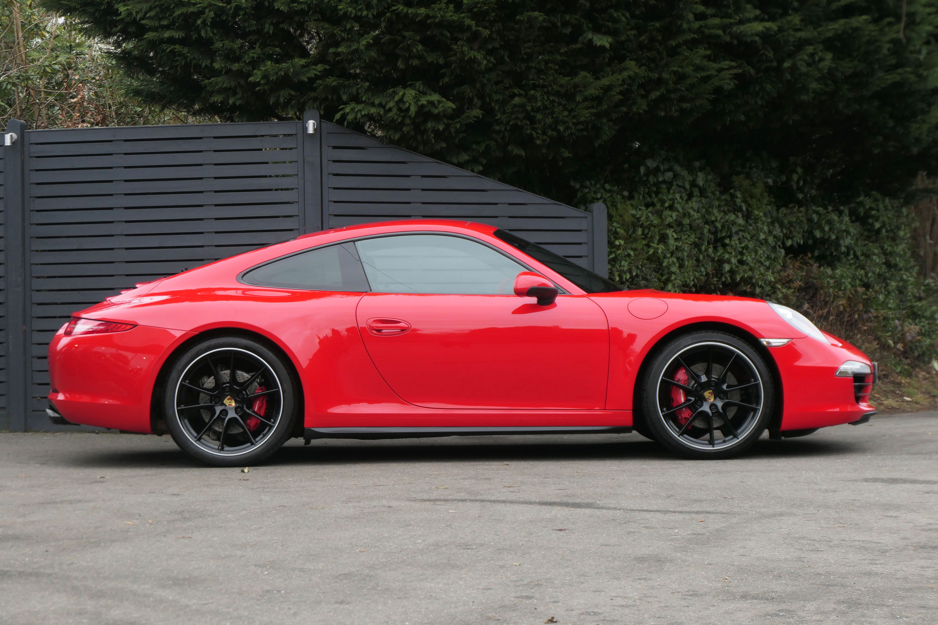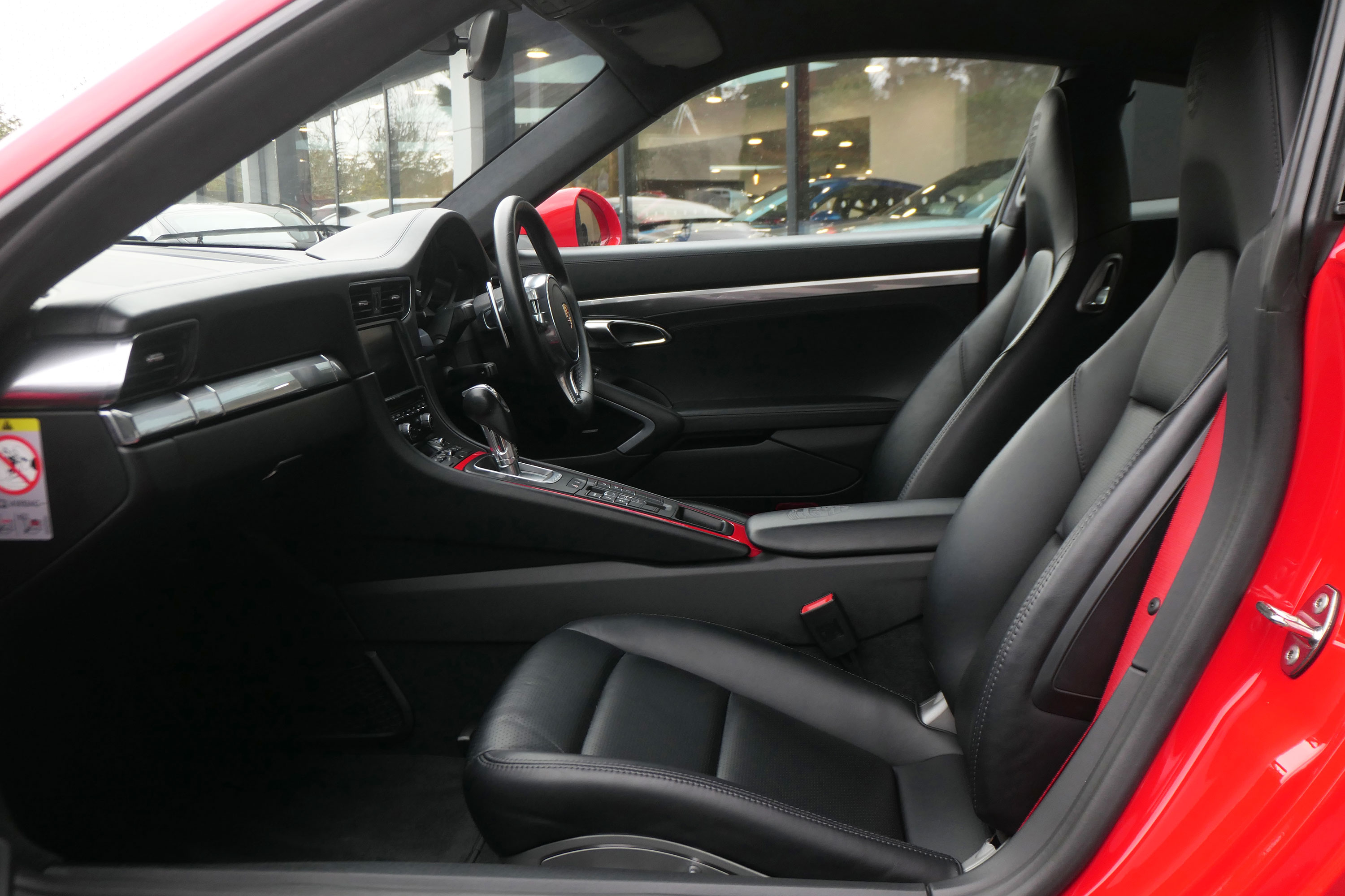 This 911 Carrera 4 S Coupe (991) has the 7-speed PDK gearbox and is presented in Guards Red with black leather sports seats.