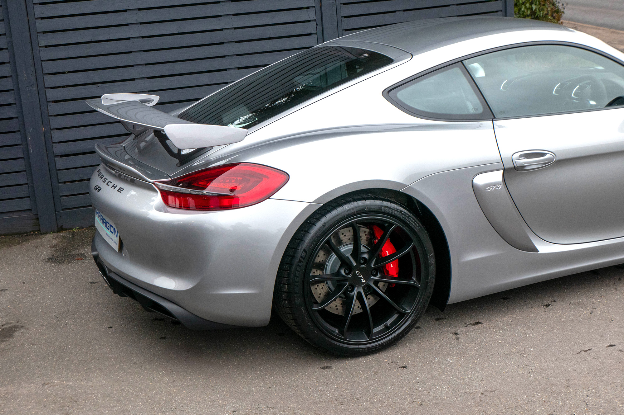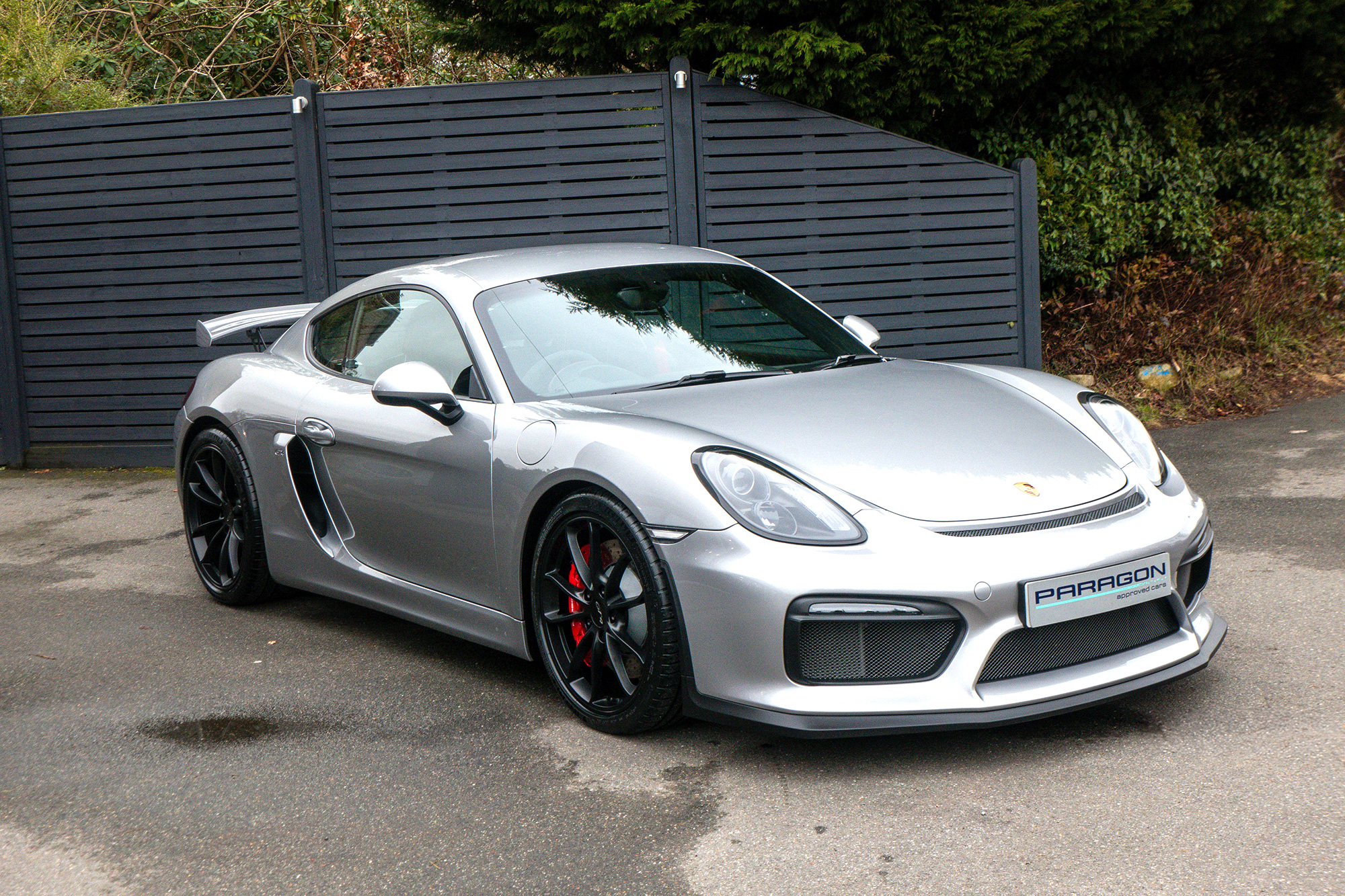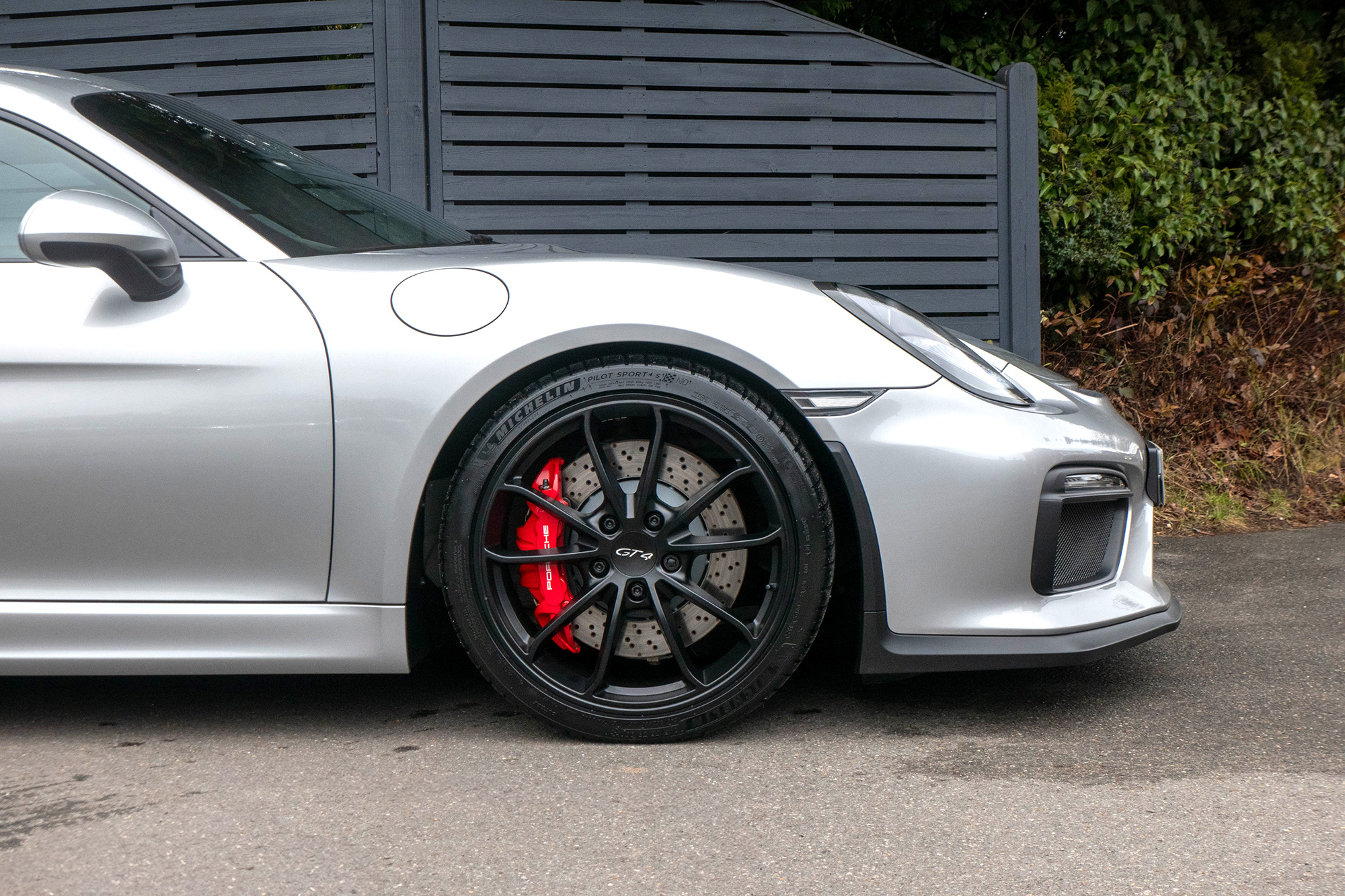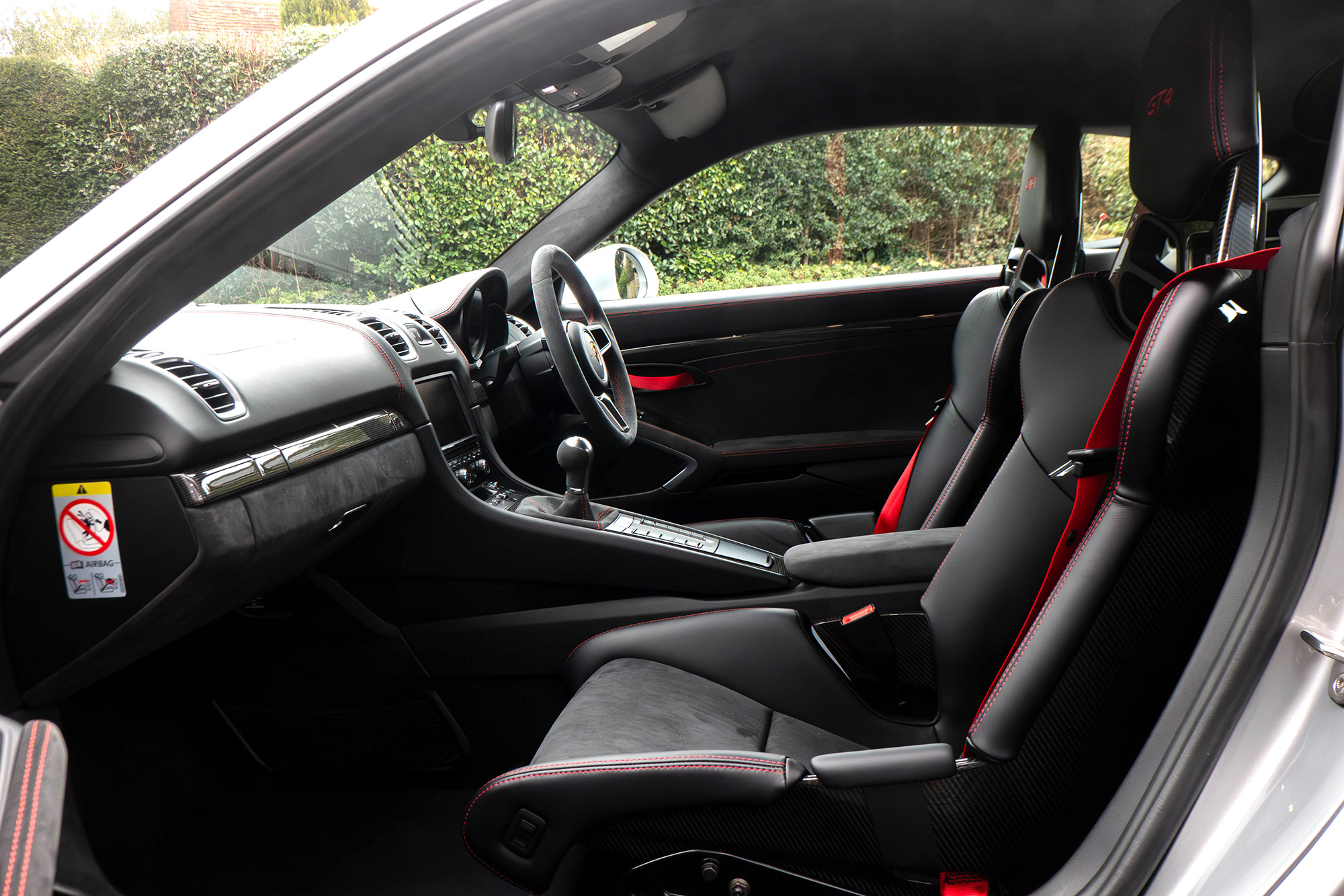 This Cayman GT4 (981) has the 6-speed manual gearbox and is presented in GT Silver with black half leather 918 bucket seats.