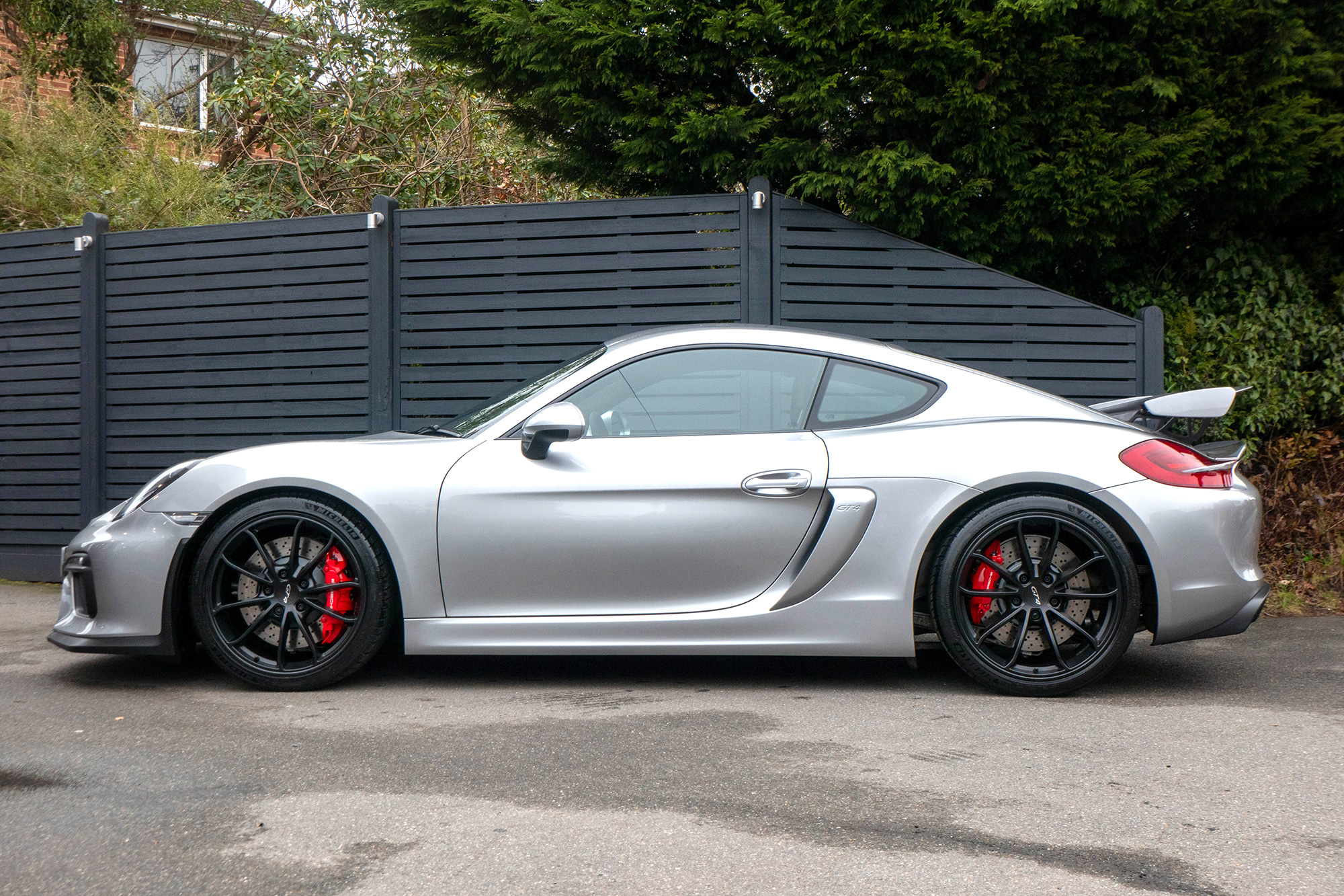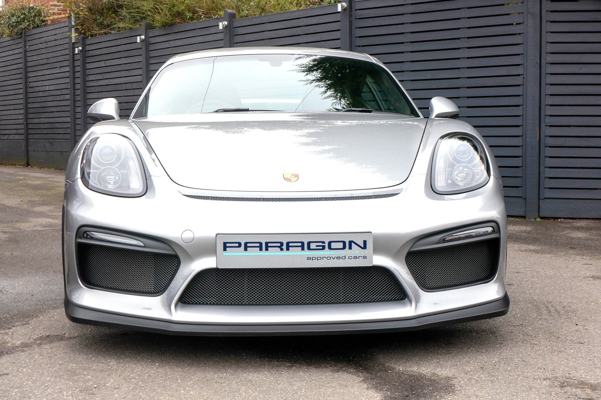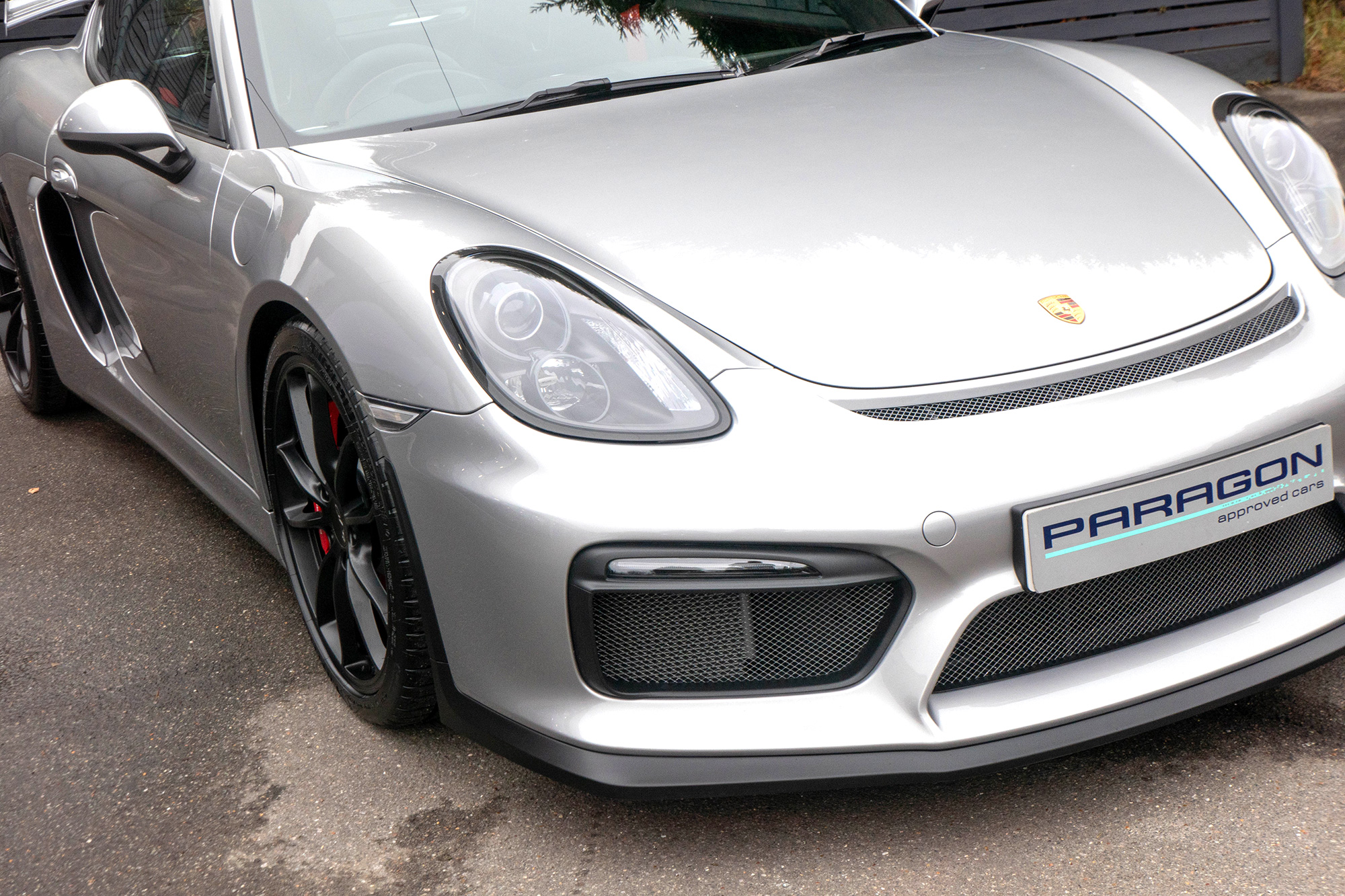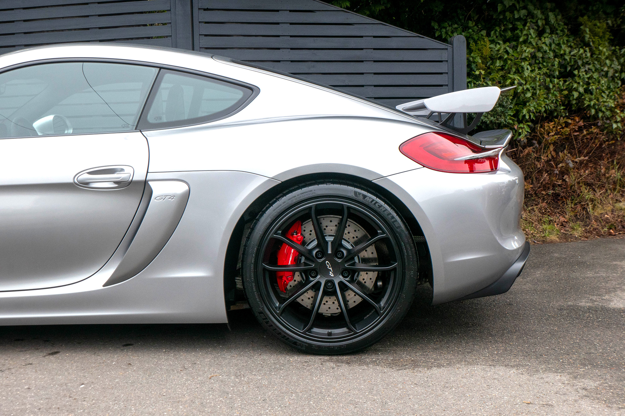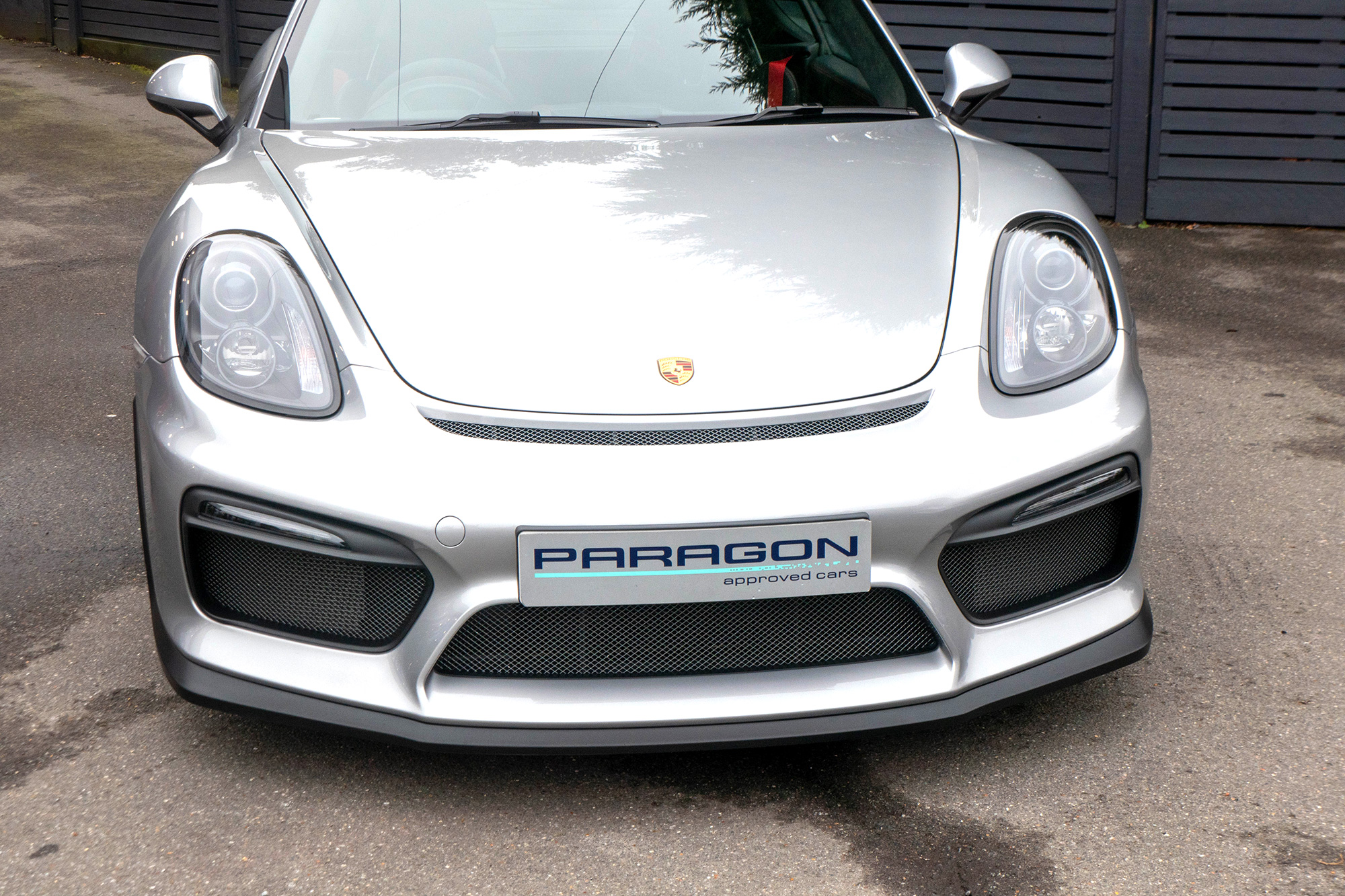 This Cayman GT4 (981) has the 6-speed manual gearbox and is presented in GT Silver with black half leather 918 bucket seats.