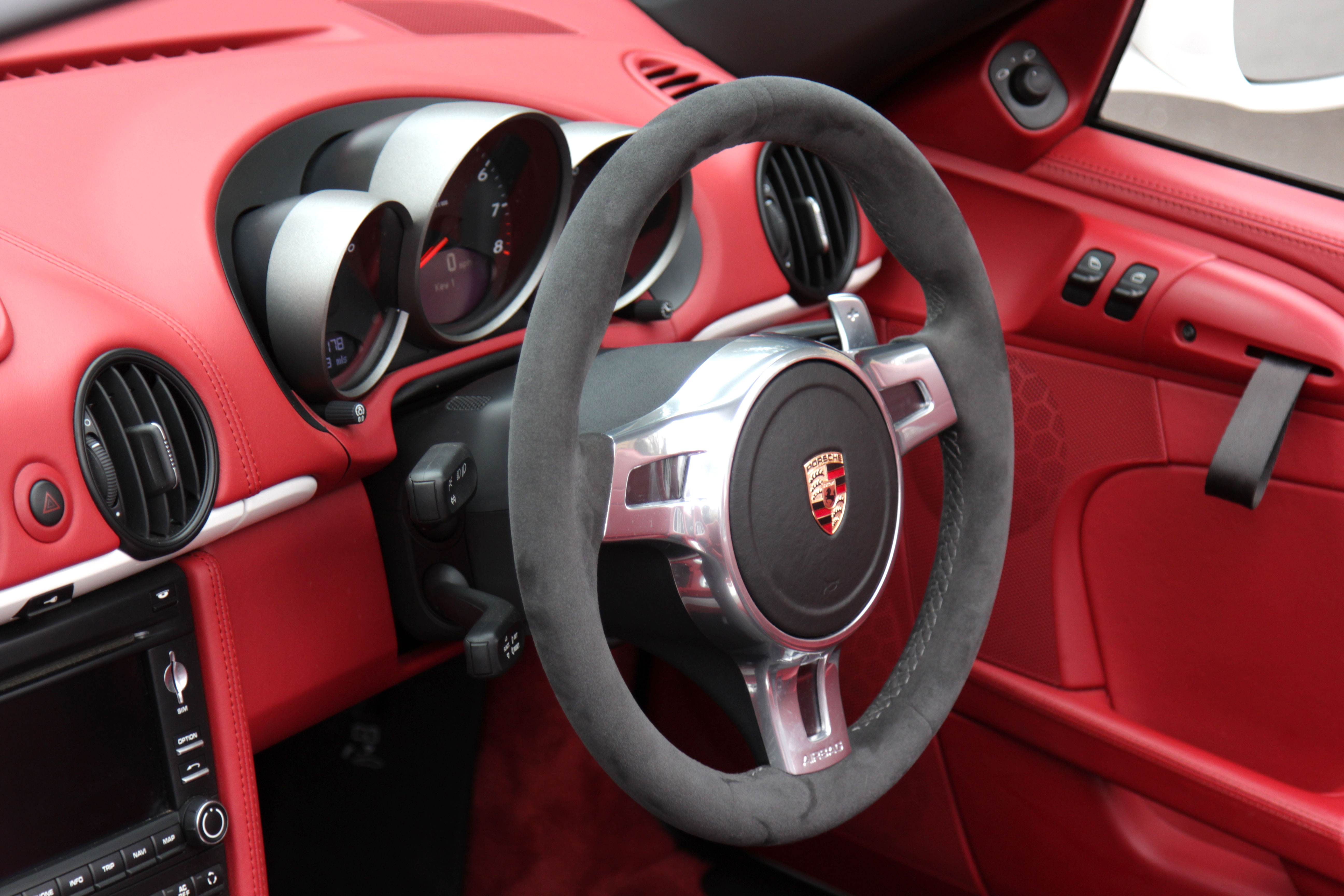 To save weight further, cup holders and the binnacle (usually over the top of the dials) are not present and 'RS style' door pulls are fitted. This leads, in standard form, to a weight saving of around 80kg over the Boxster S.