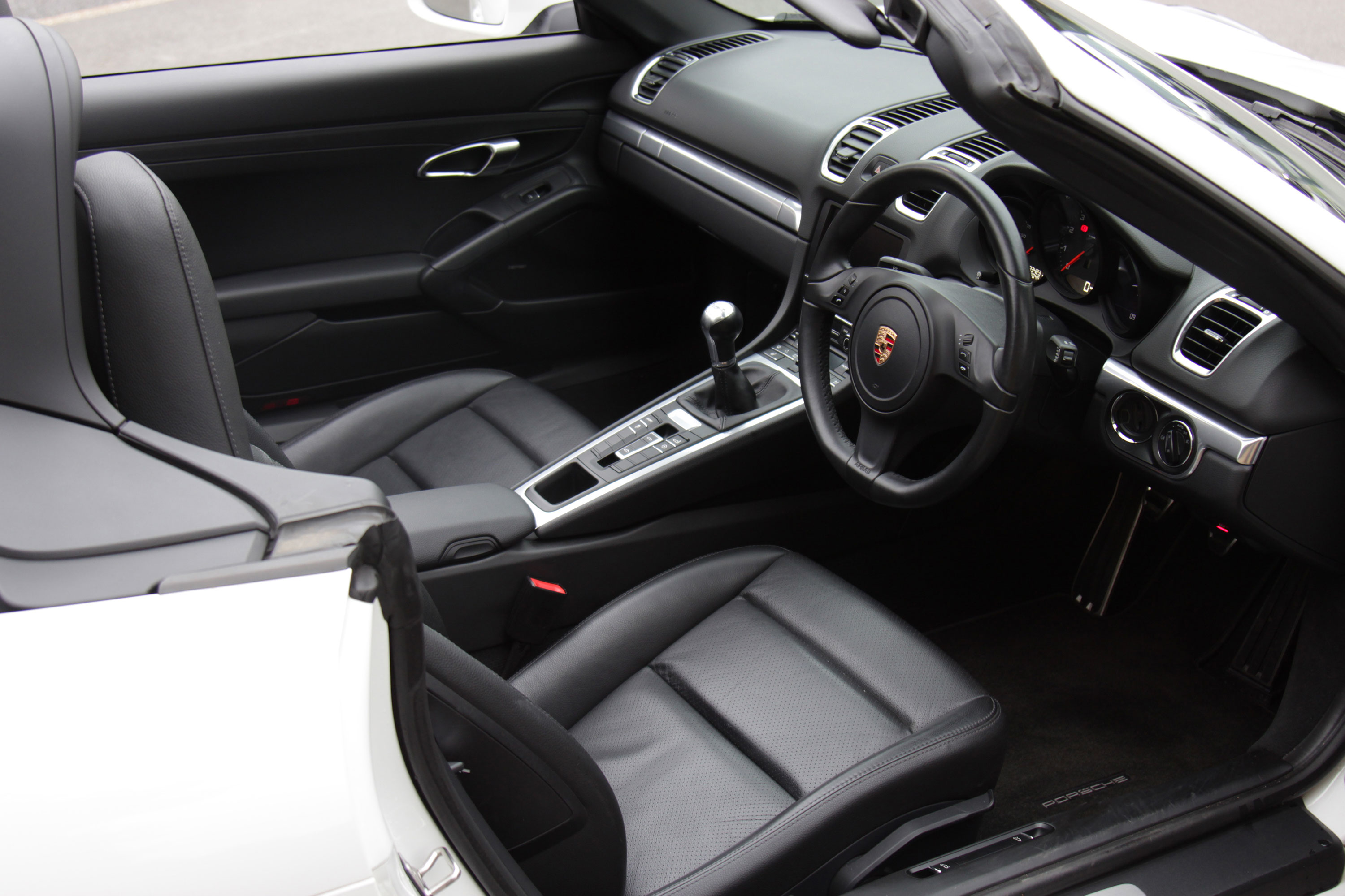 This Boxster 2.7 (981) has the 6-speed manual gearbox and is presented in Carrara White with black leather seats.
