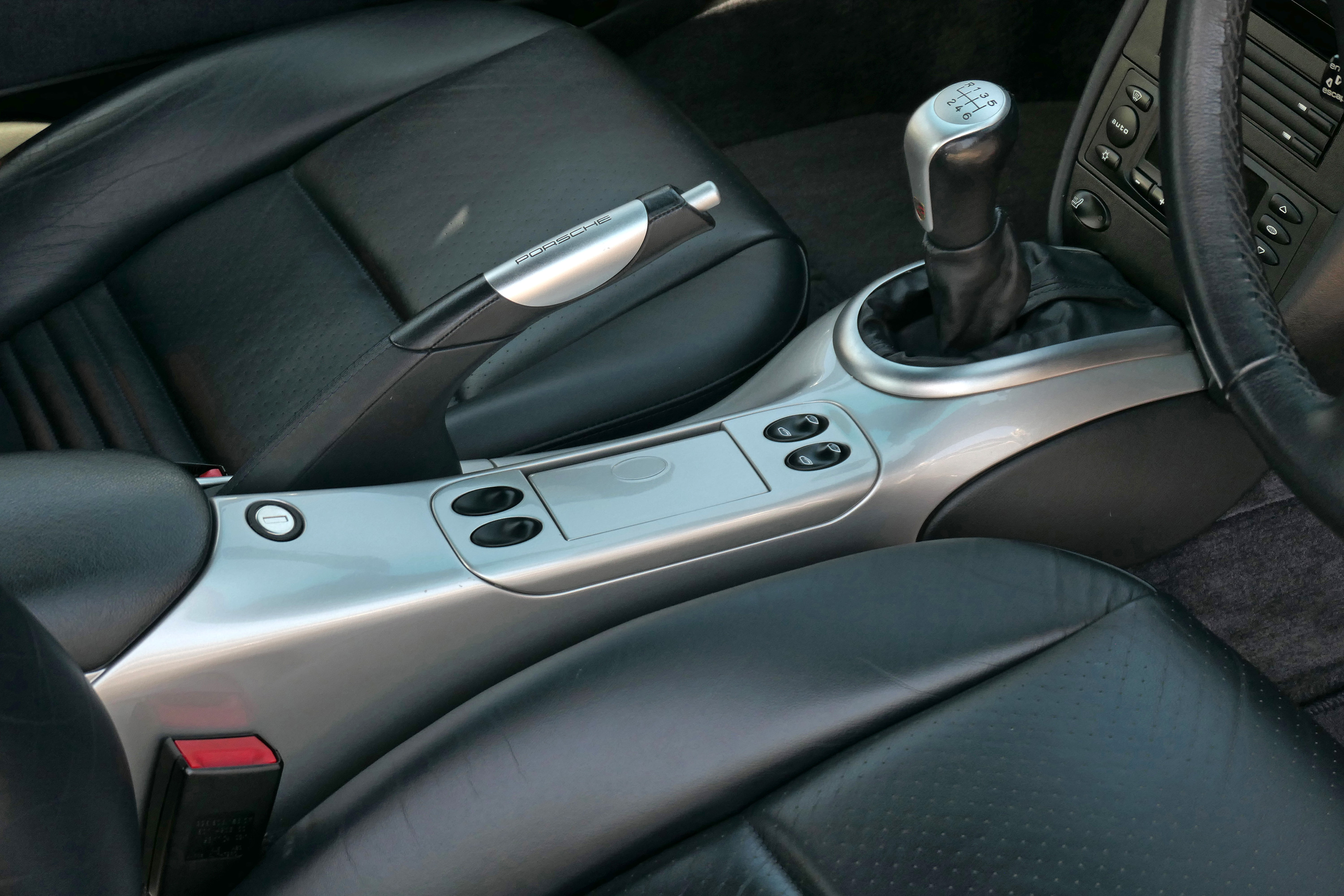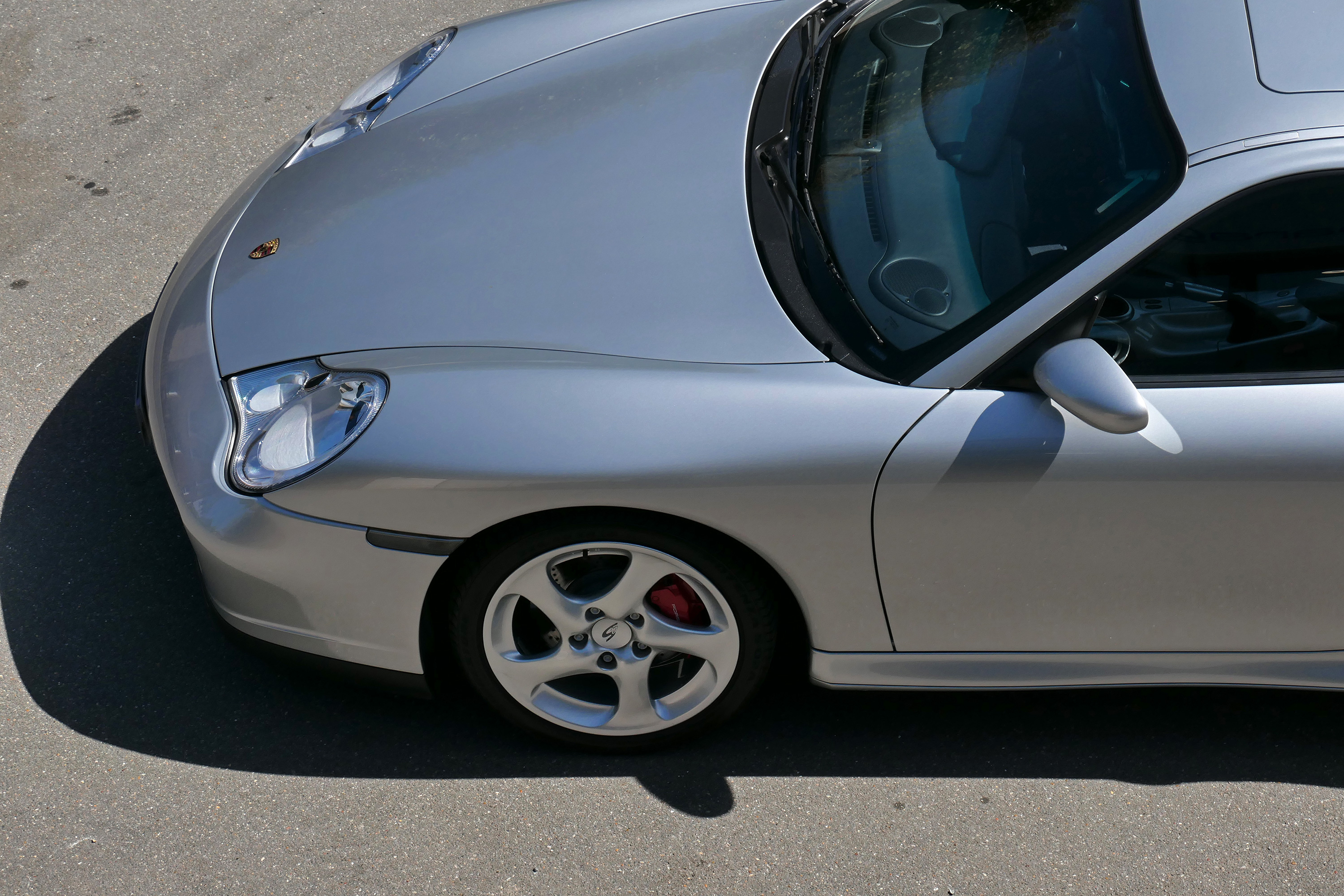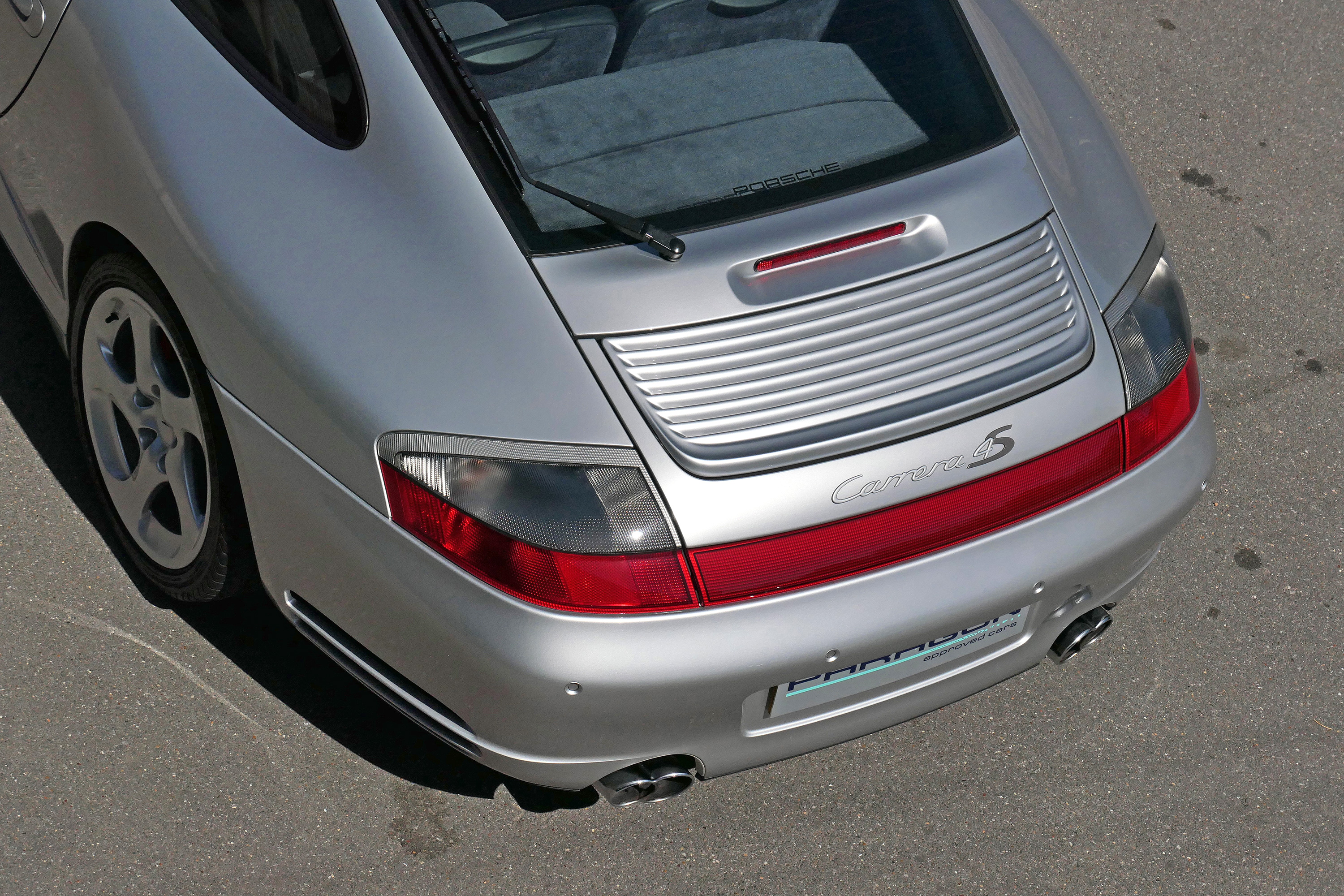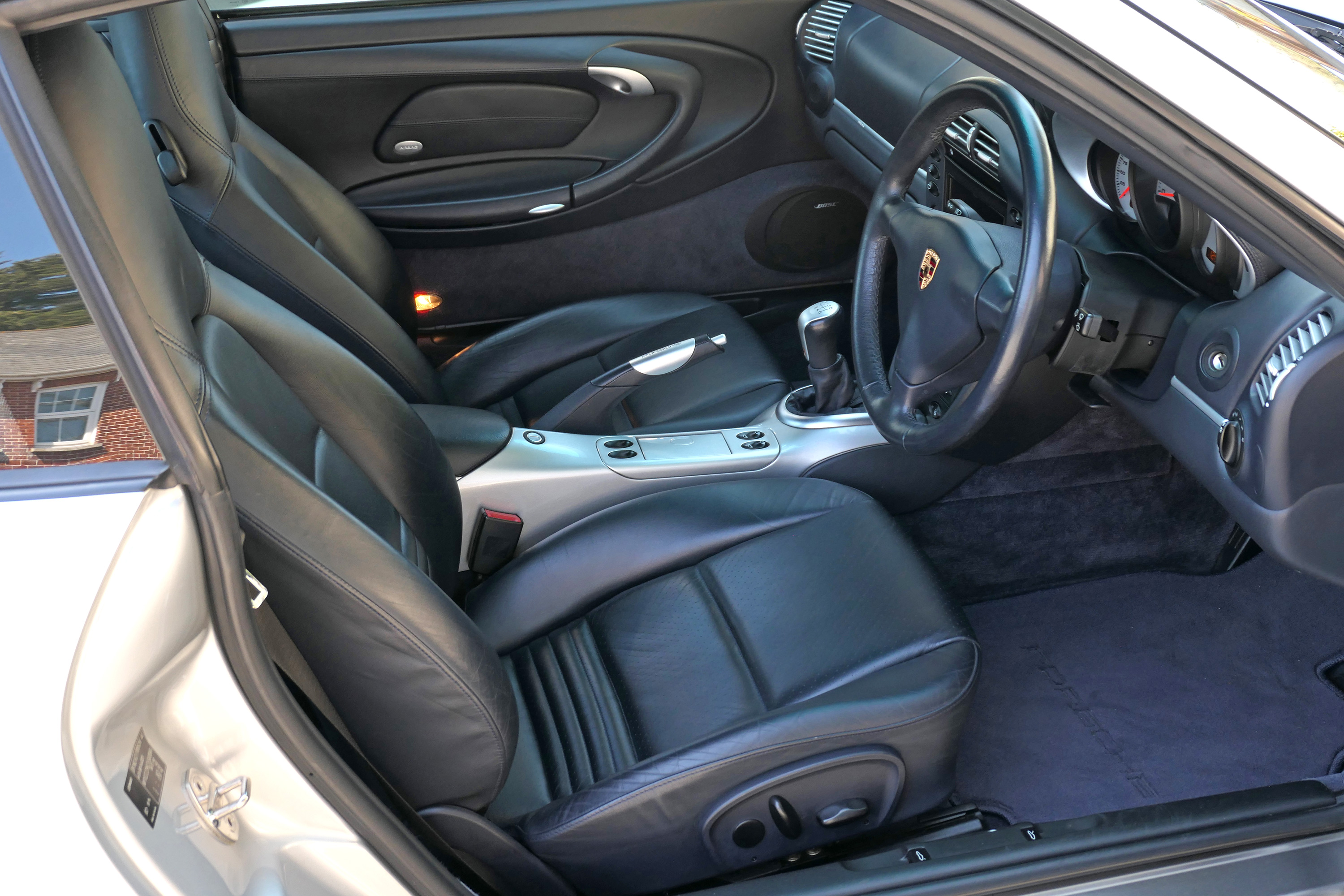 This 911 Carrera 4 S Coupe (996) has the 6-speed manual gearbox and is presented in Arctic Silver with dark blue leather seats.
