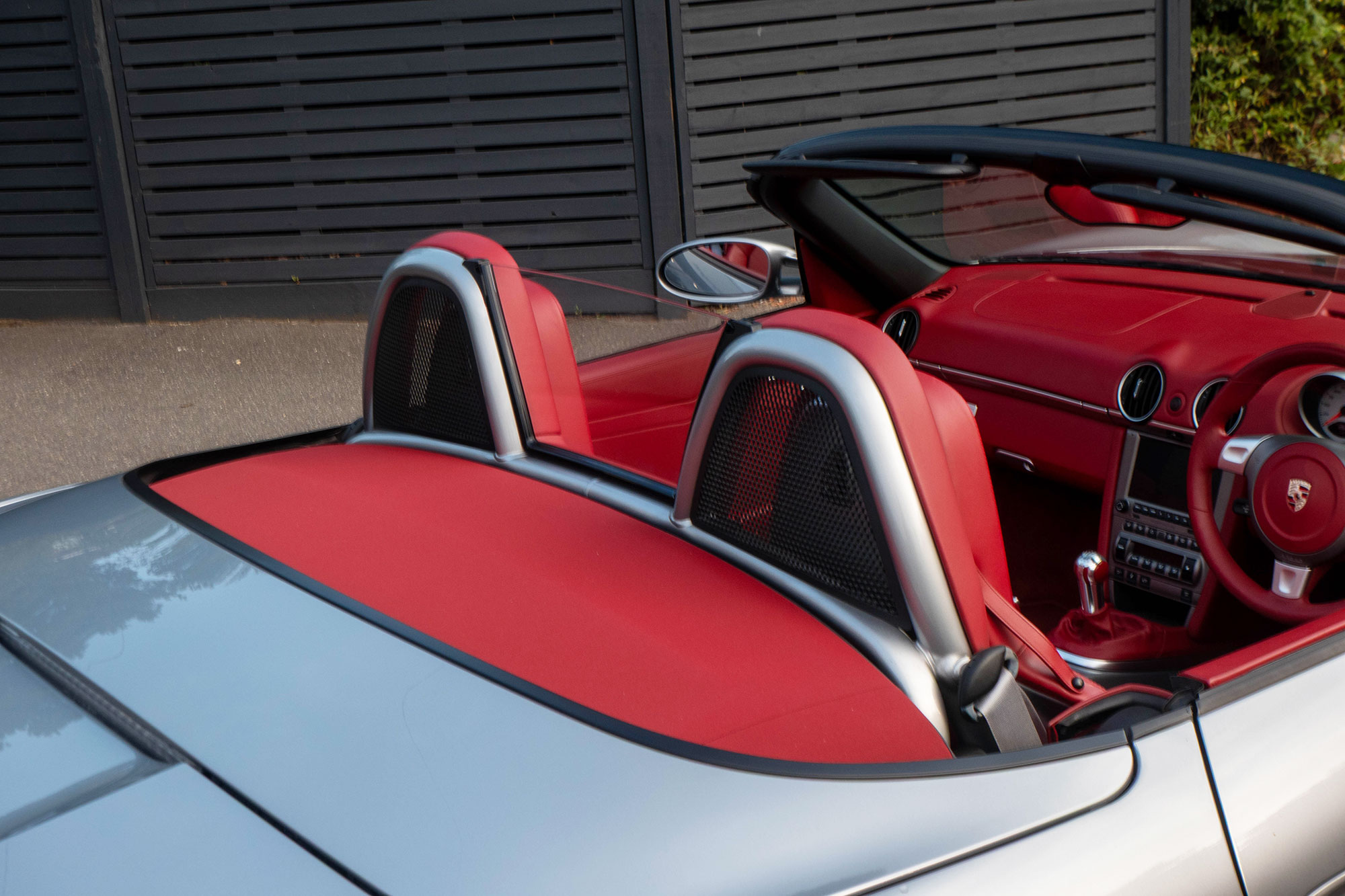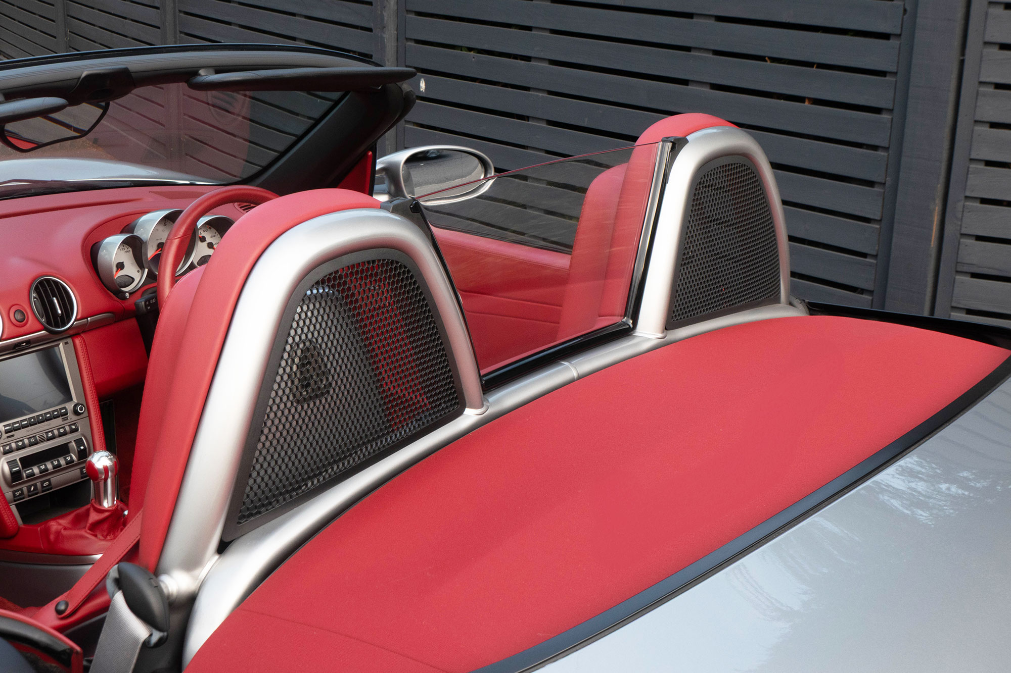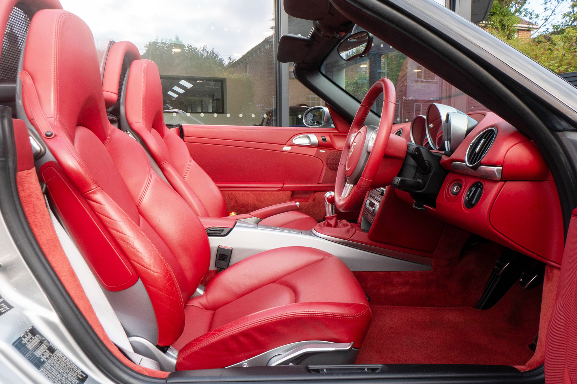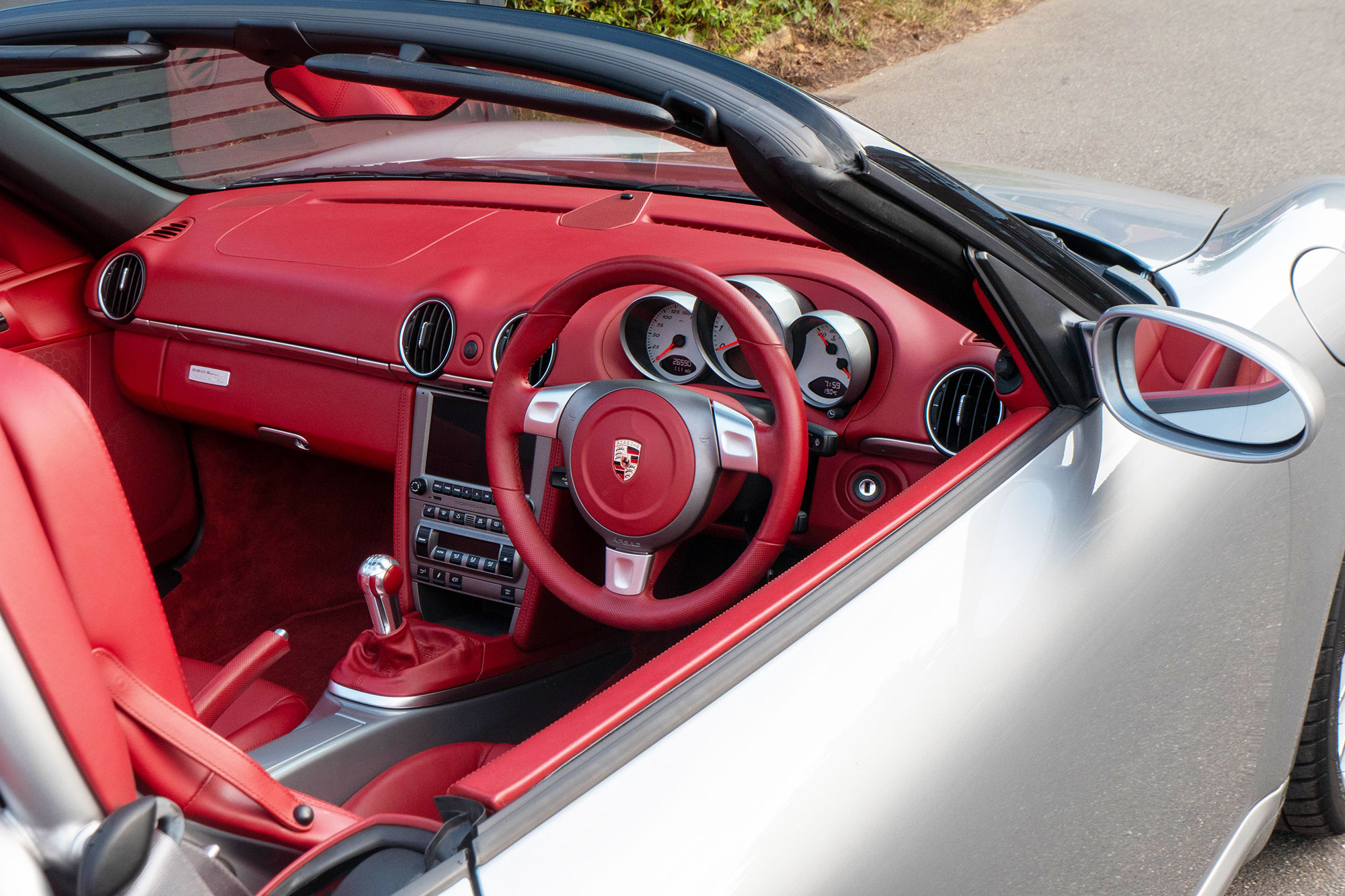 Presented in GT Silver with Natural Carrera Red leather sports seats with a 6-speed manual gearbox, standard features include a Carrera Red power hood, 19" Sport Design wheels, a body coloured centre console, extended leather, RS60 Stainless steel door entry guards, an onboard computer, a body coloured roll over bar, Silver Grey seat belts, a 3-spoke leather sports steering wheel, silver dials, Porsche Active Suspension Management & Porsche Stability Management, a wind deflector, switchable sports exhaust, air conditioning and red tail lights.