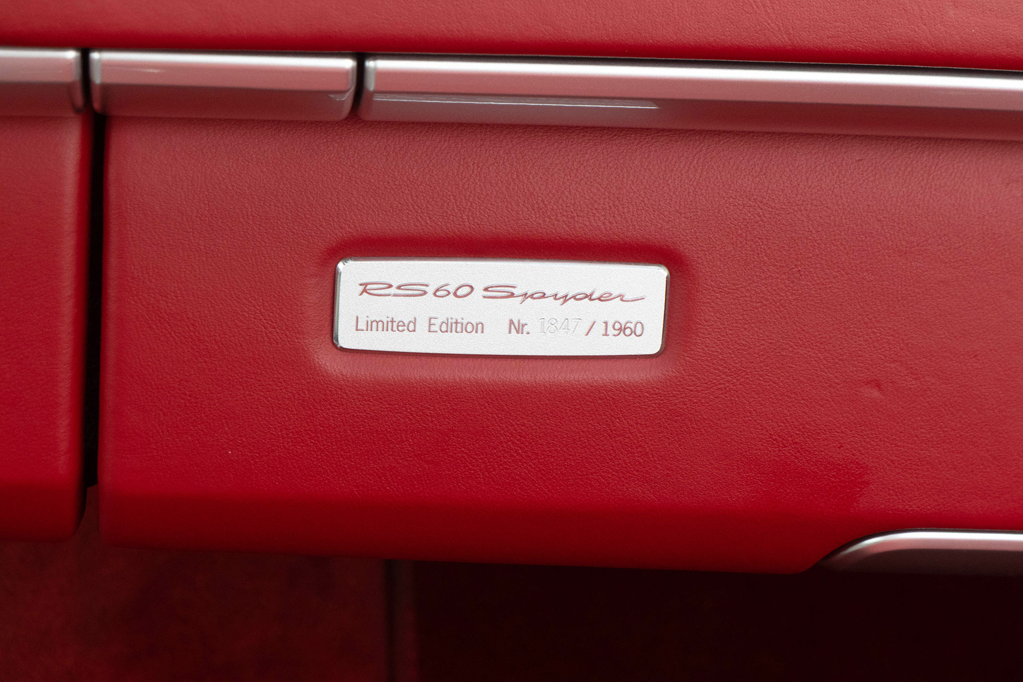 This Boxster RS60 Spyder has a 3.4 litre flat six engine that develops 305 bhp - 25bhp over the standard Boxster S. This RS60 limited edition is one of 1960 cars (of which this is no.1847) as denoted by the plaque on the air bag cover.