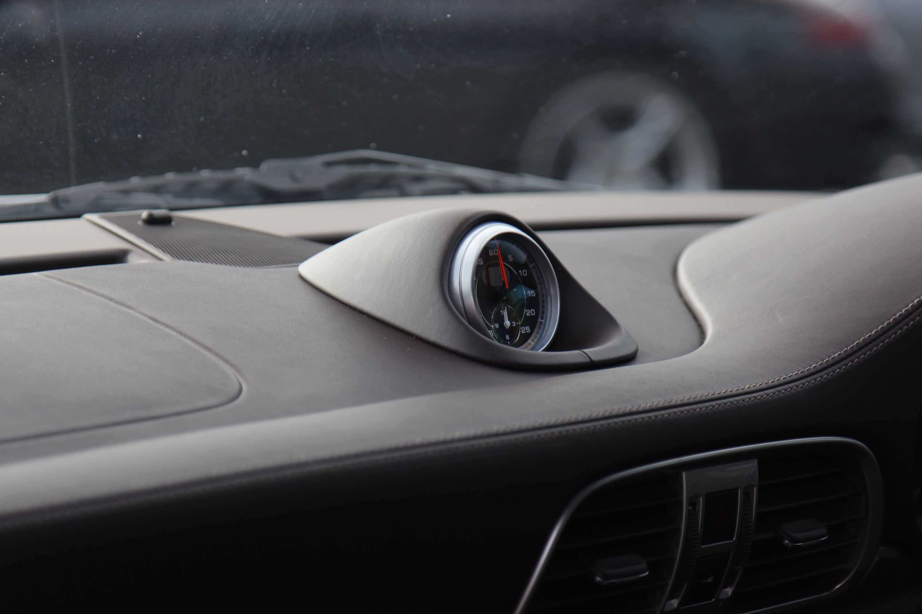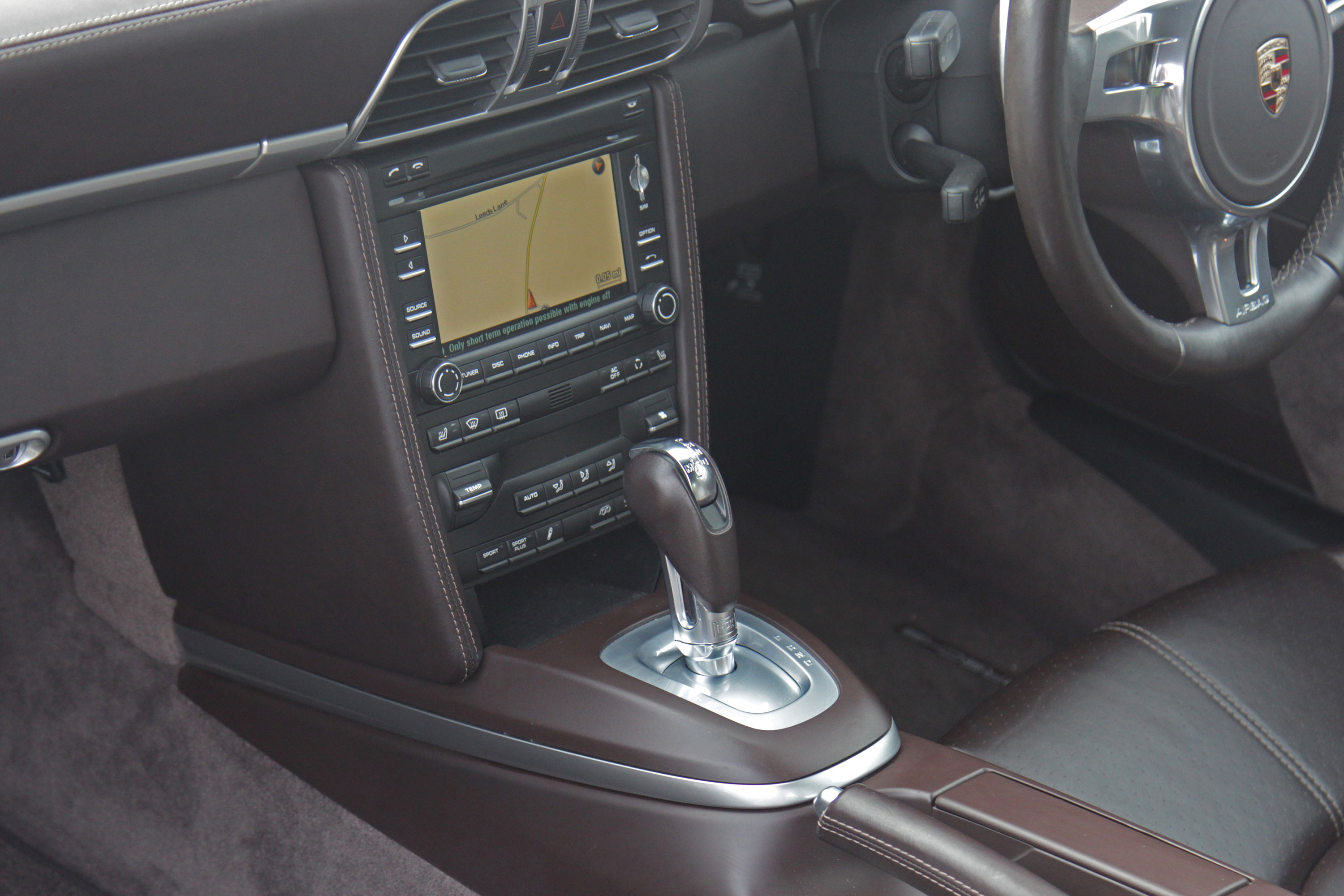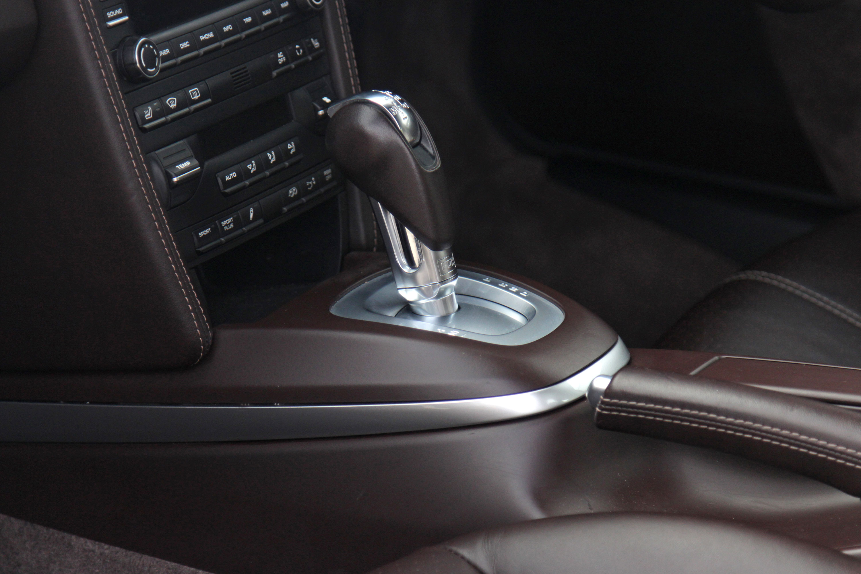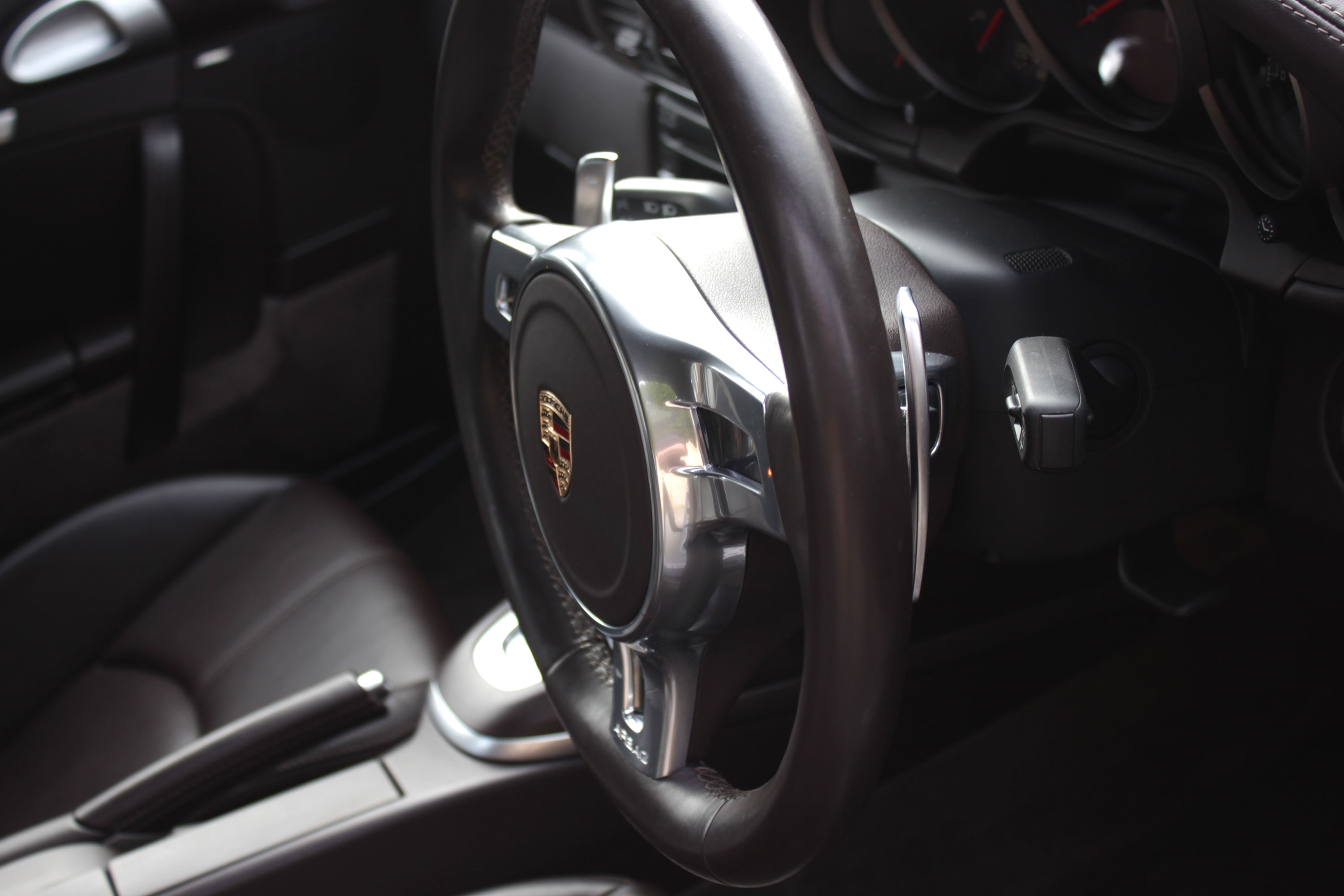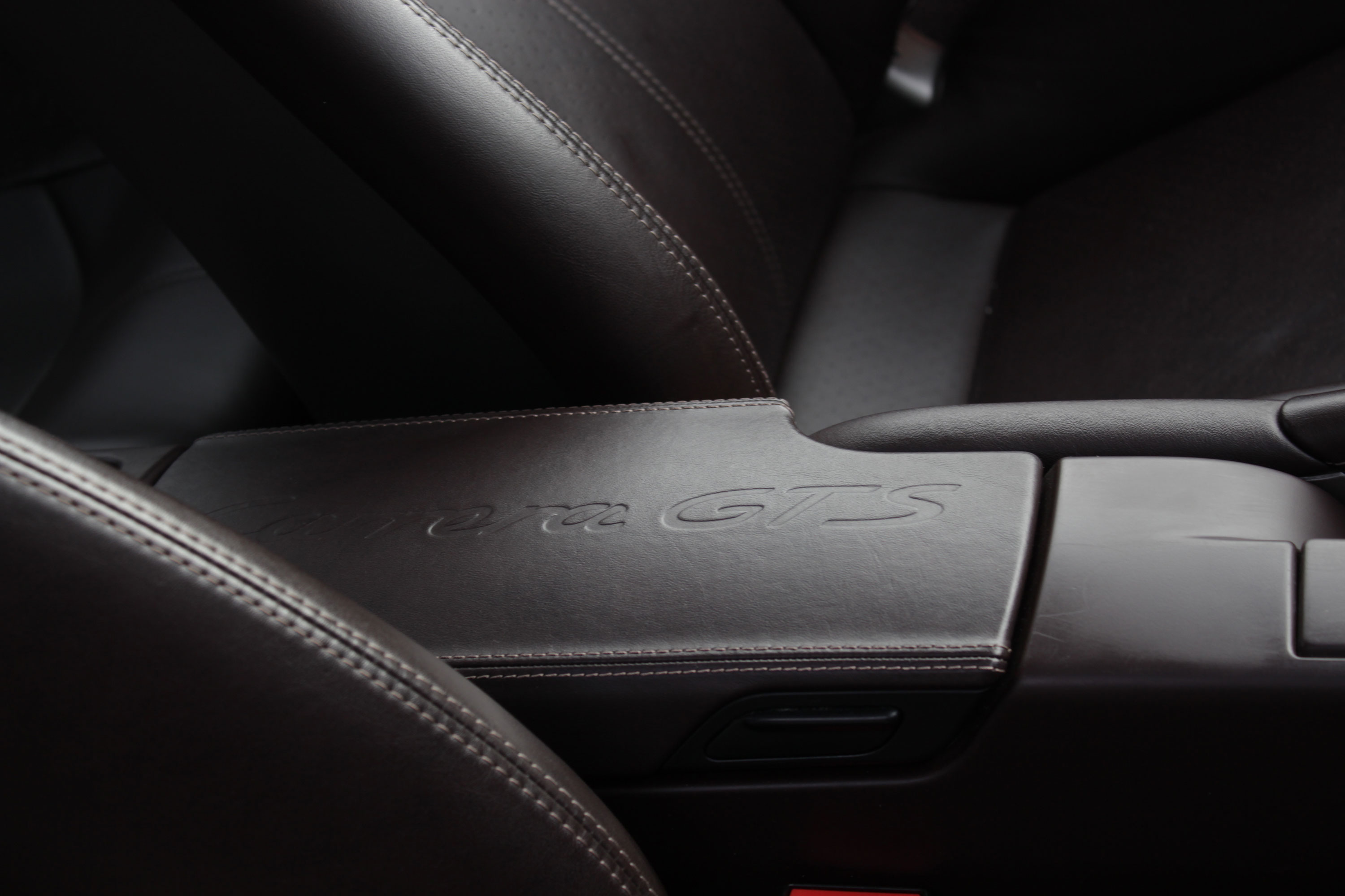 Factory-fitted options include sport seats, embossed crested headrests, the GTS logo embossed into the centre armrest, the Sport Chrono Pack with Sport Plus, the 7-speed PDK gearbox with Sport Design paddle shift steering wheel, heated seats, a full leather interior that extends to the dashboard and door panels, Bluetooth phone, a rear wiper, rear parking sensors, and an iPod/USB interface for the Porsche Communications Management system.