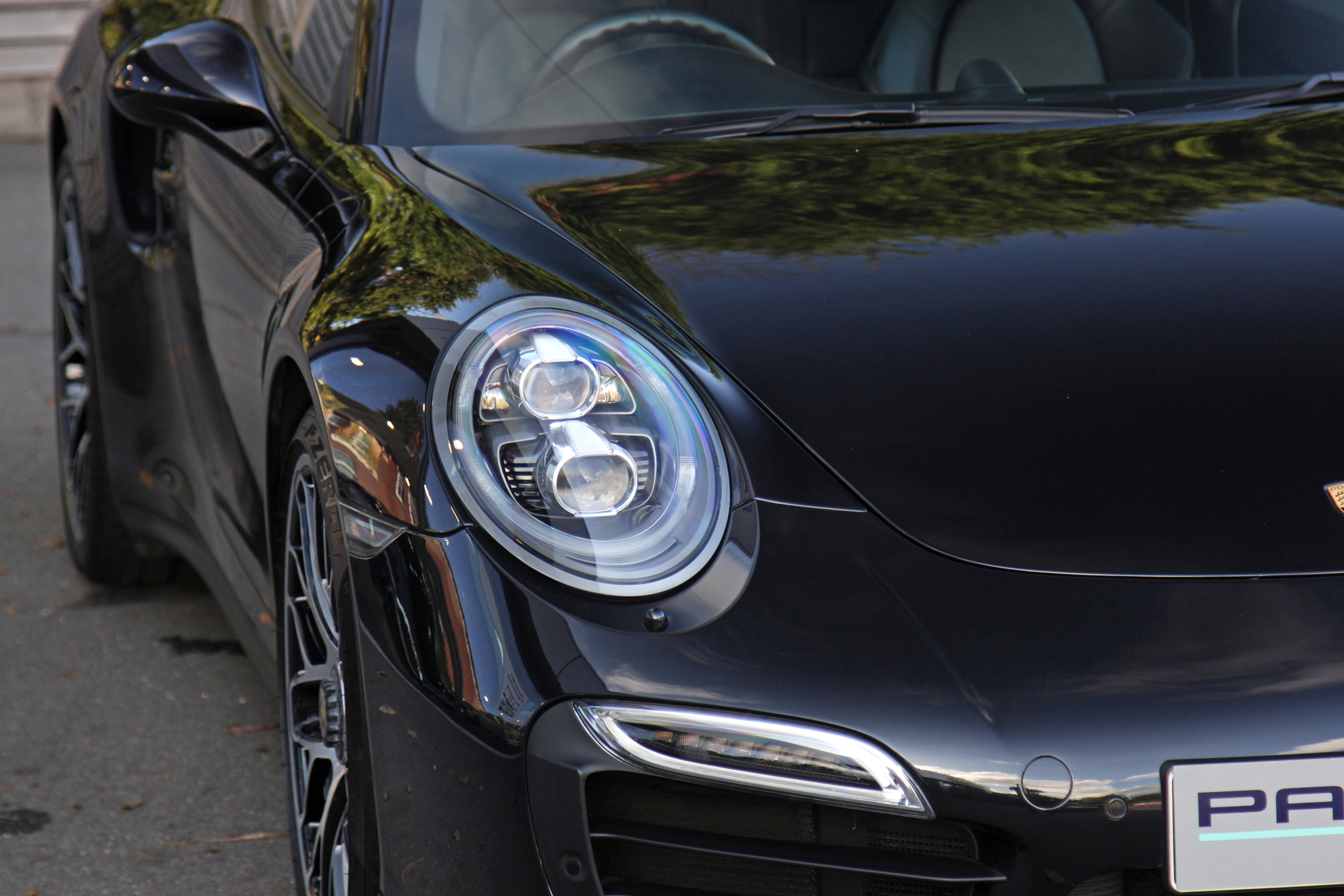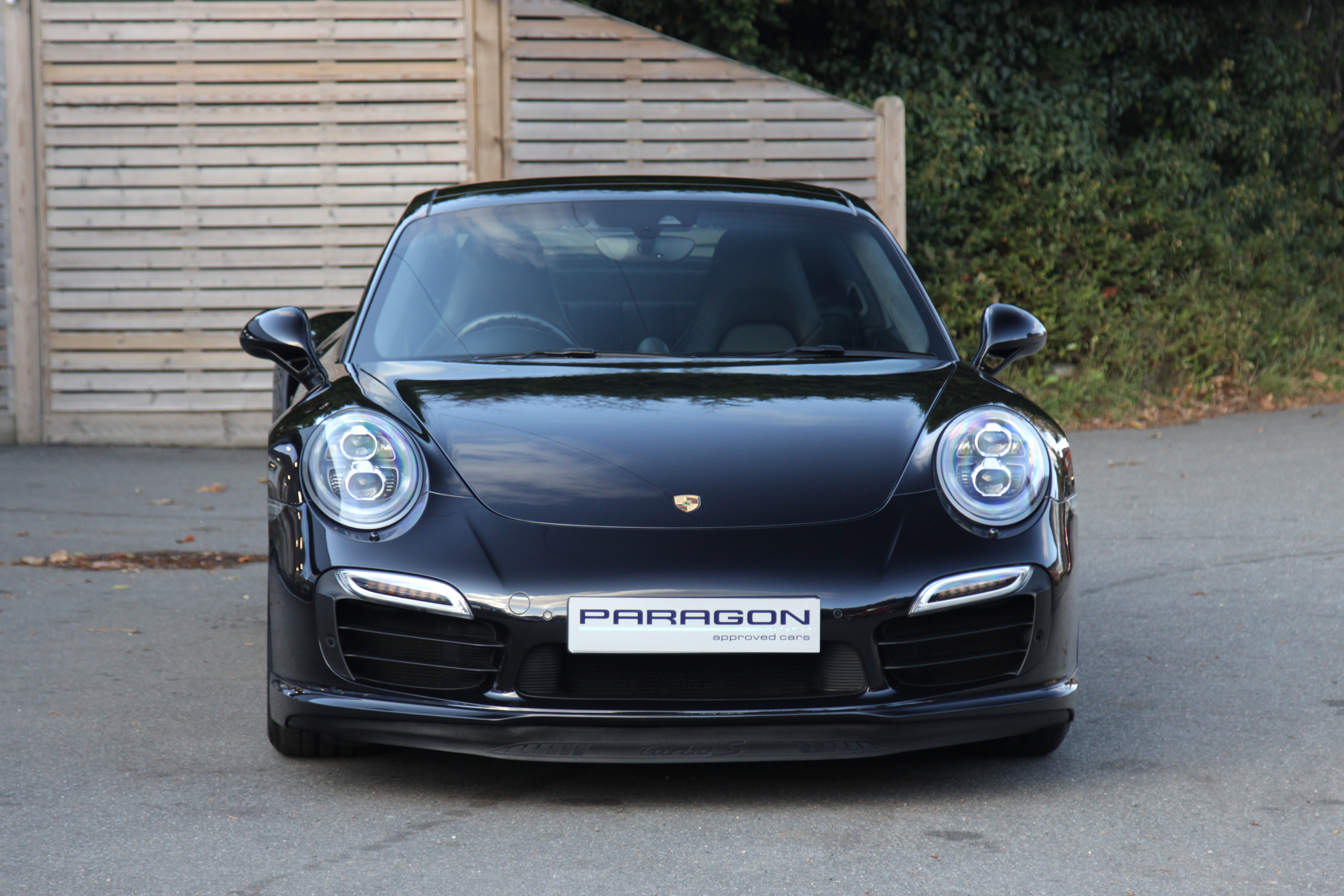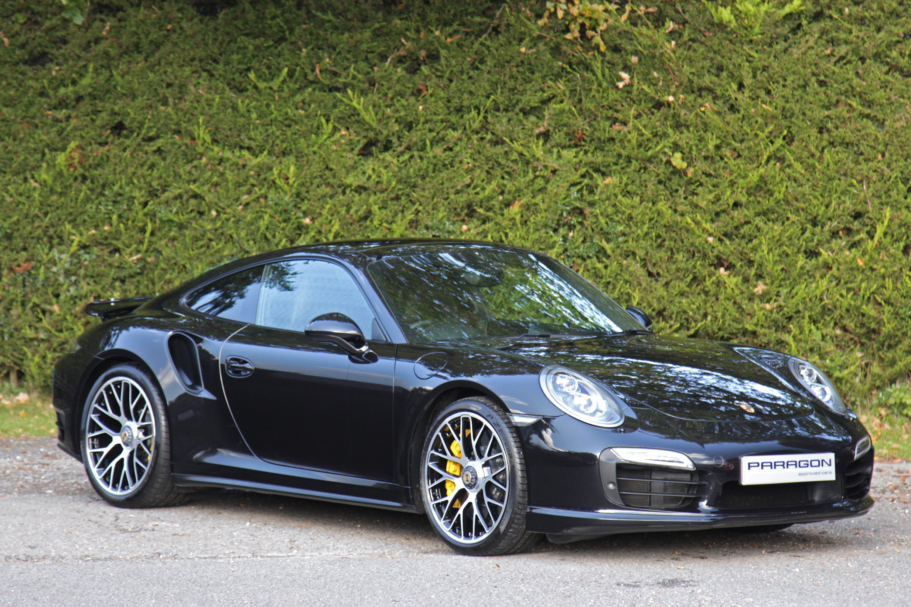 This 911 Turbo S Coupe (991) has the 7-speed PDK gearbox and is presented in Basalt Black with black leather seats.