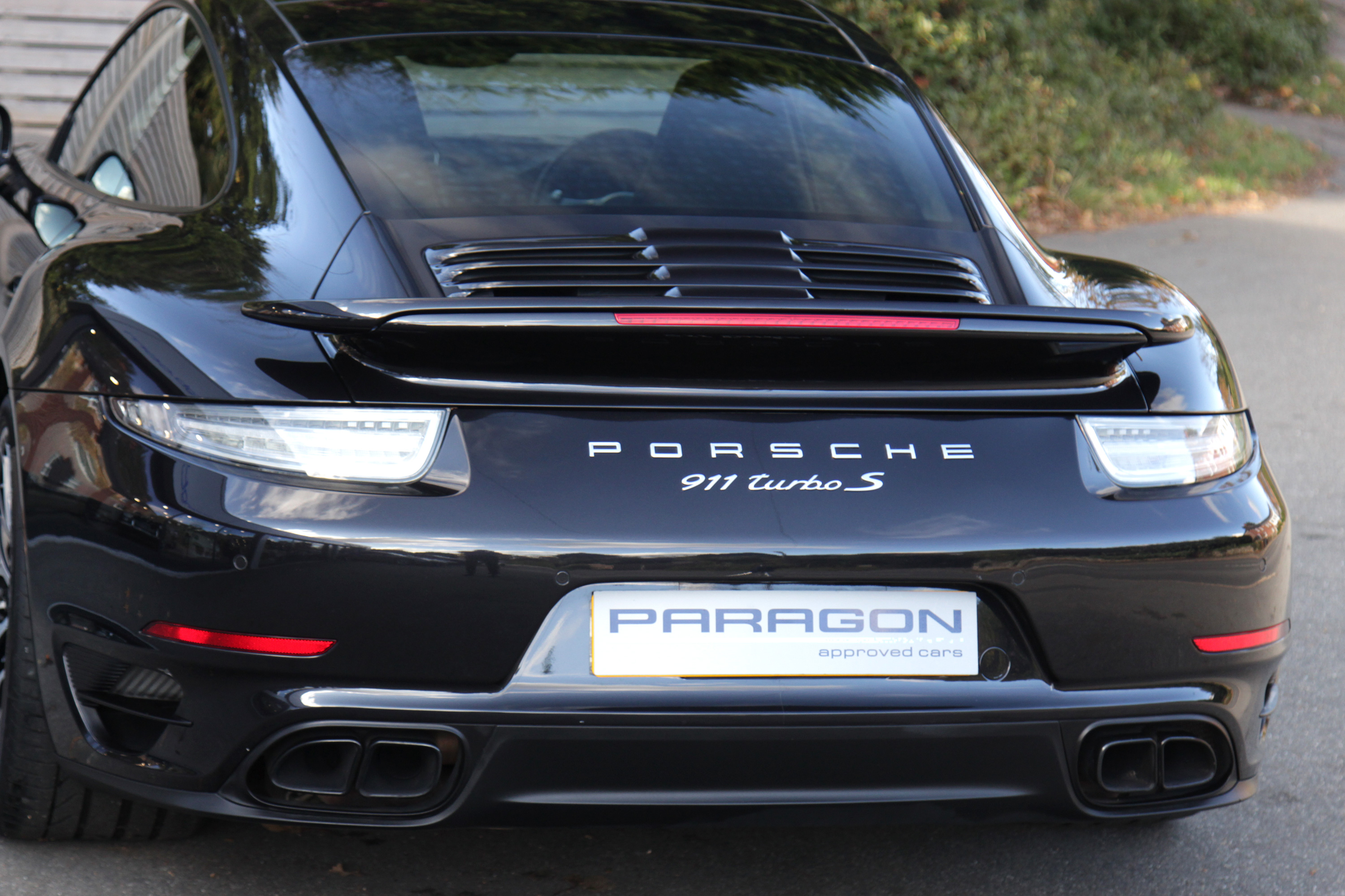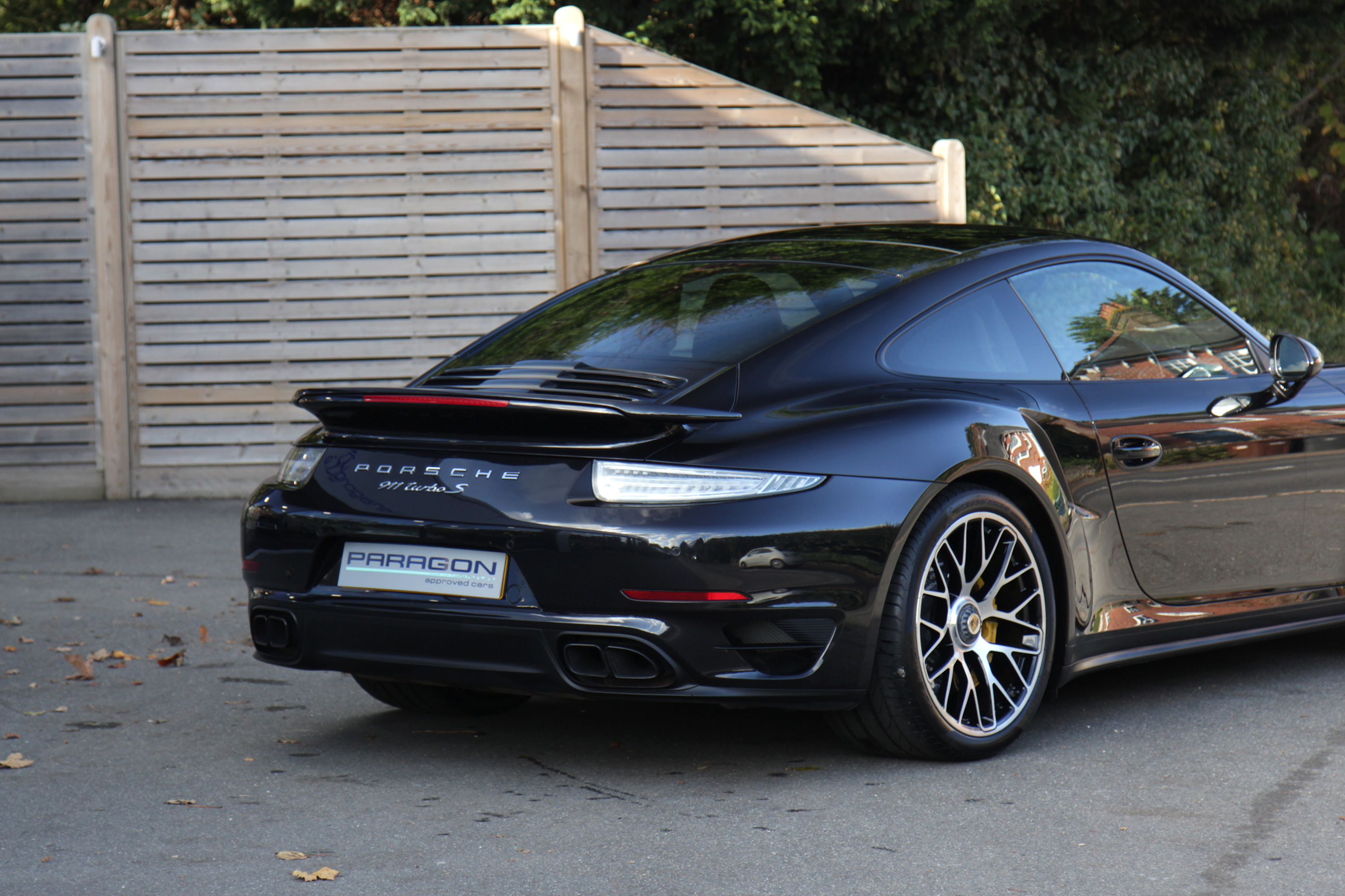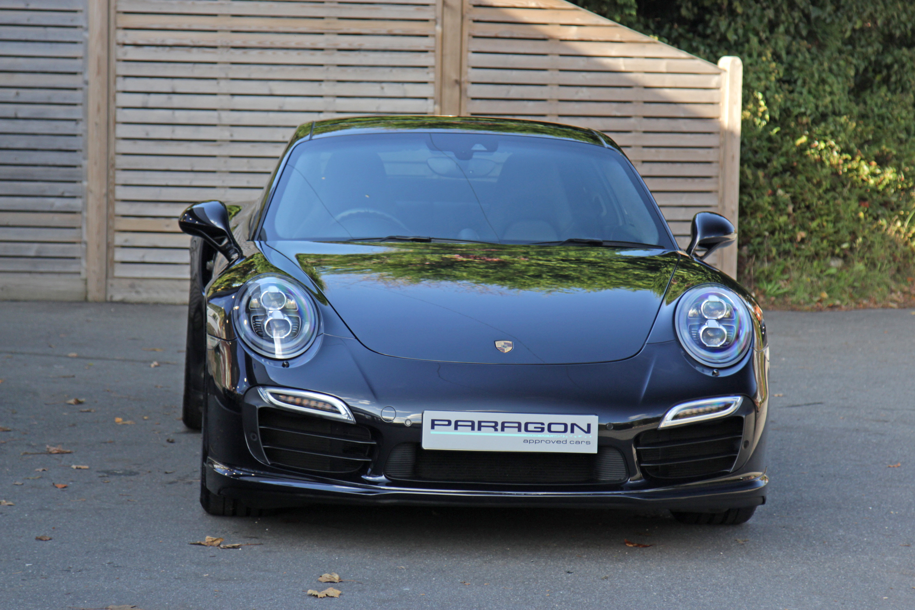 This 911 Turbo S Coupe (991) has the 7-speed PDK gearbox and is presented in Basalt Black with black leather seats.