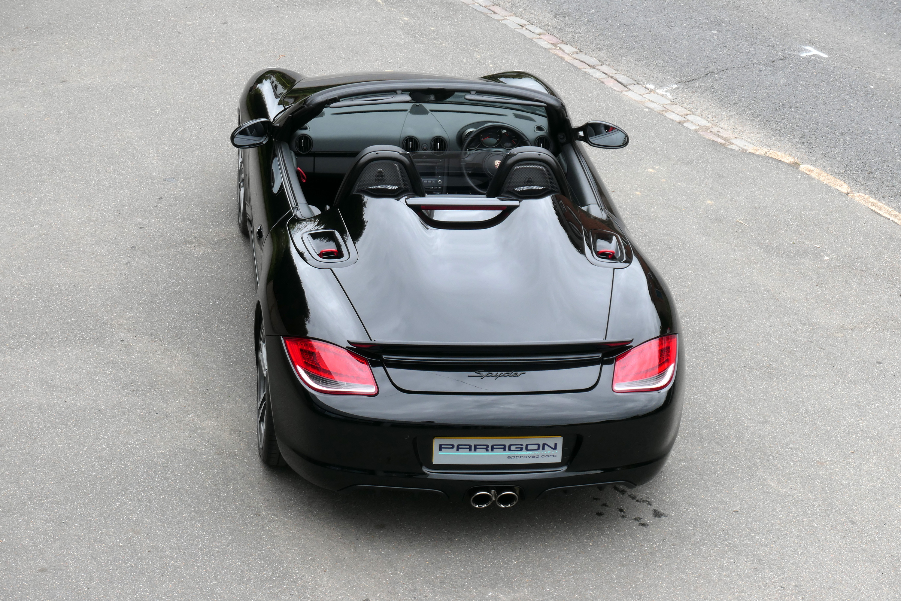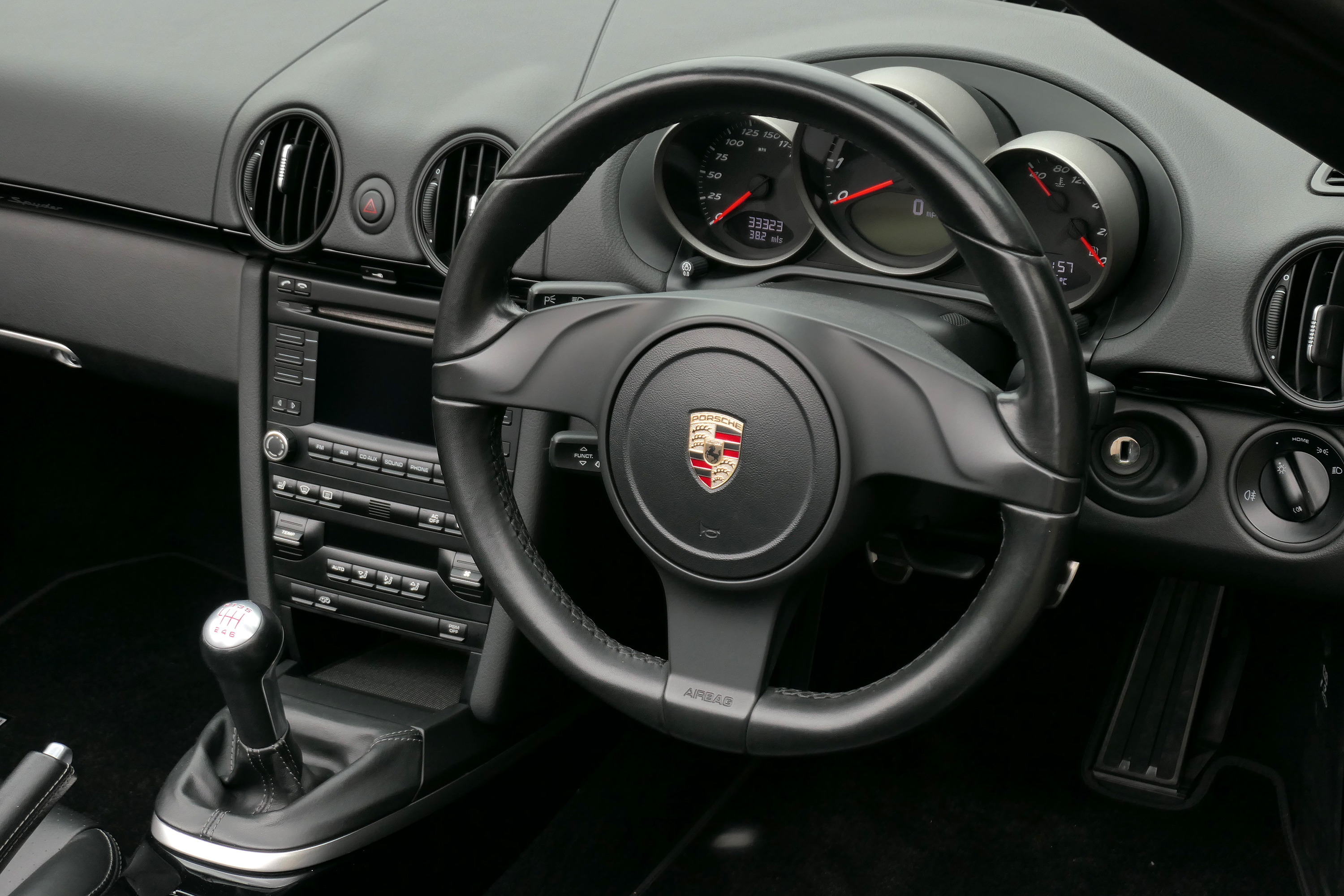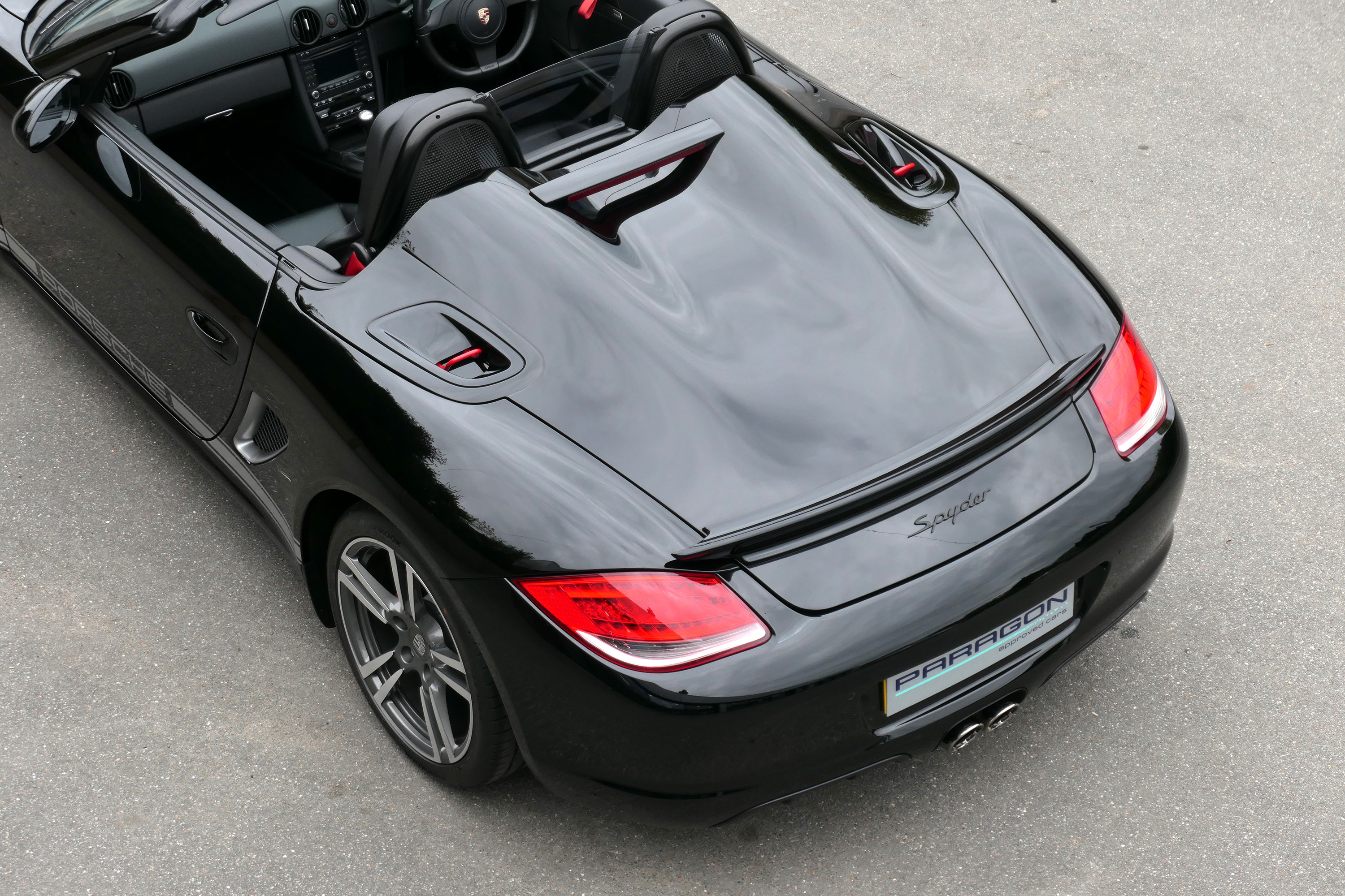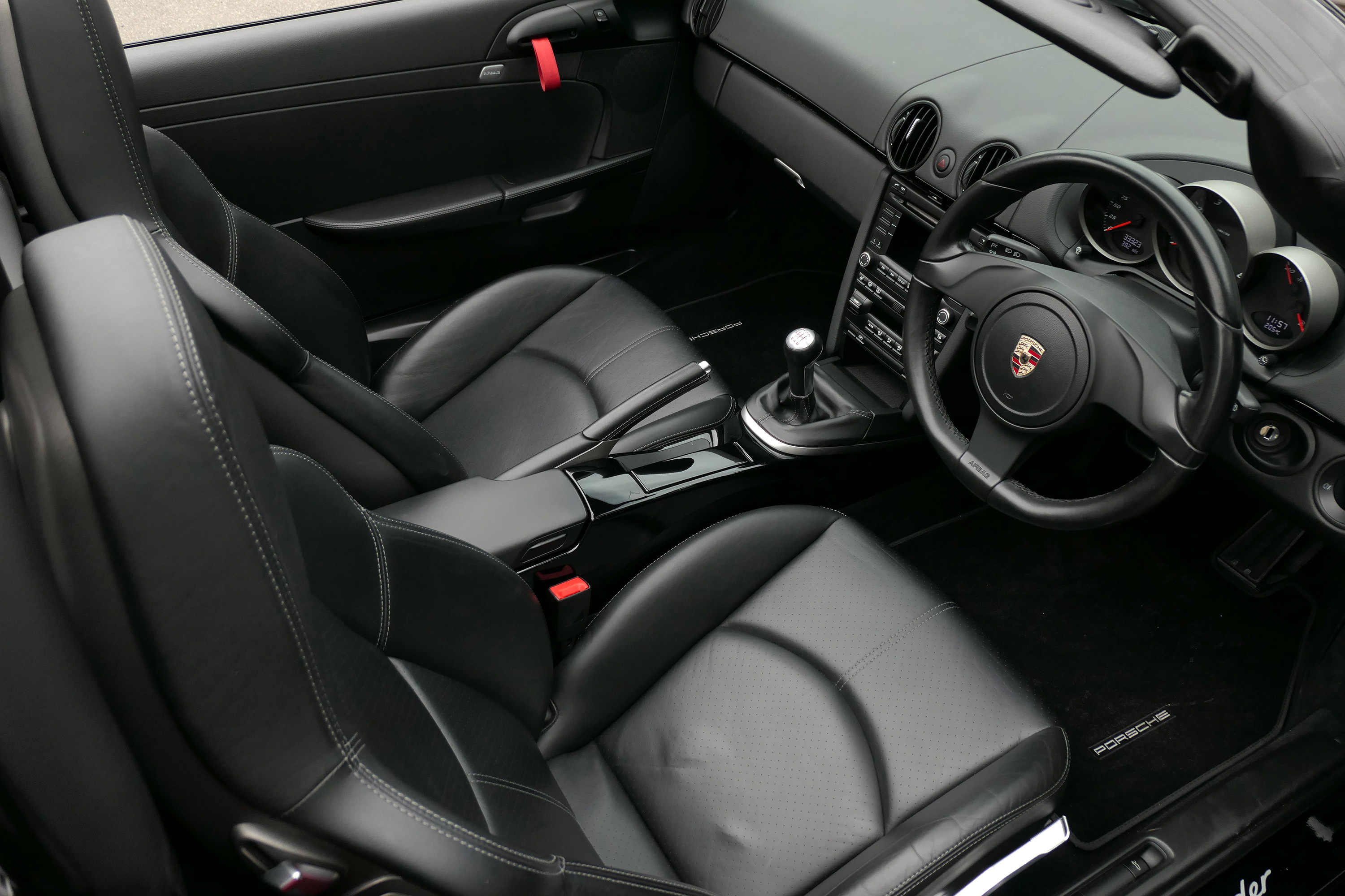 This Boxster Spyder (987 GEN ll) has the 6-speed manual gearbox and is presented in Jet Black with black leather sport seats and a black lightweight hood.