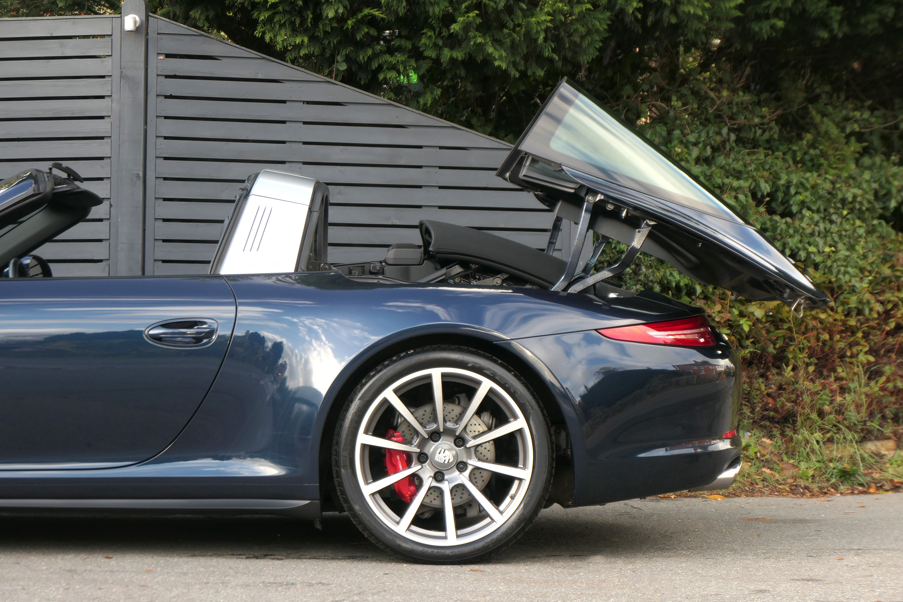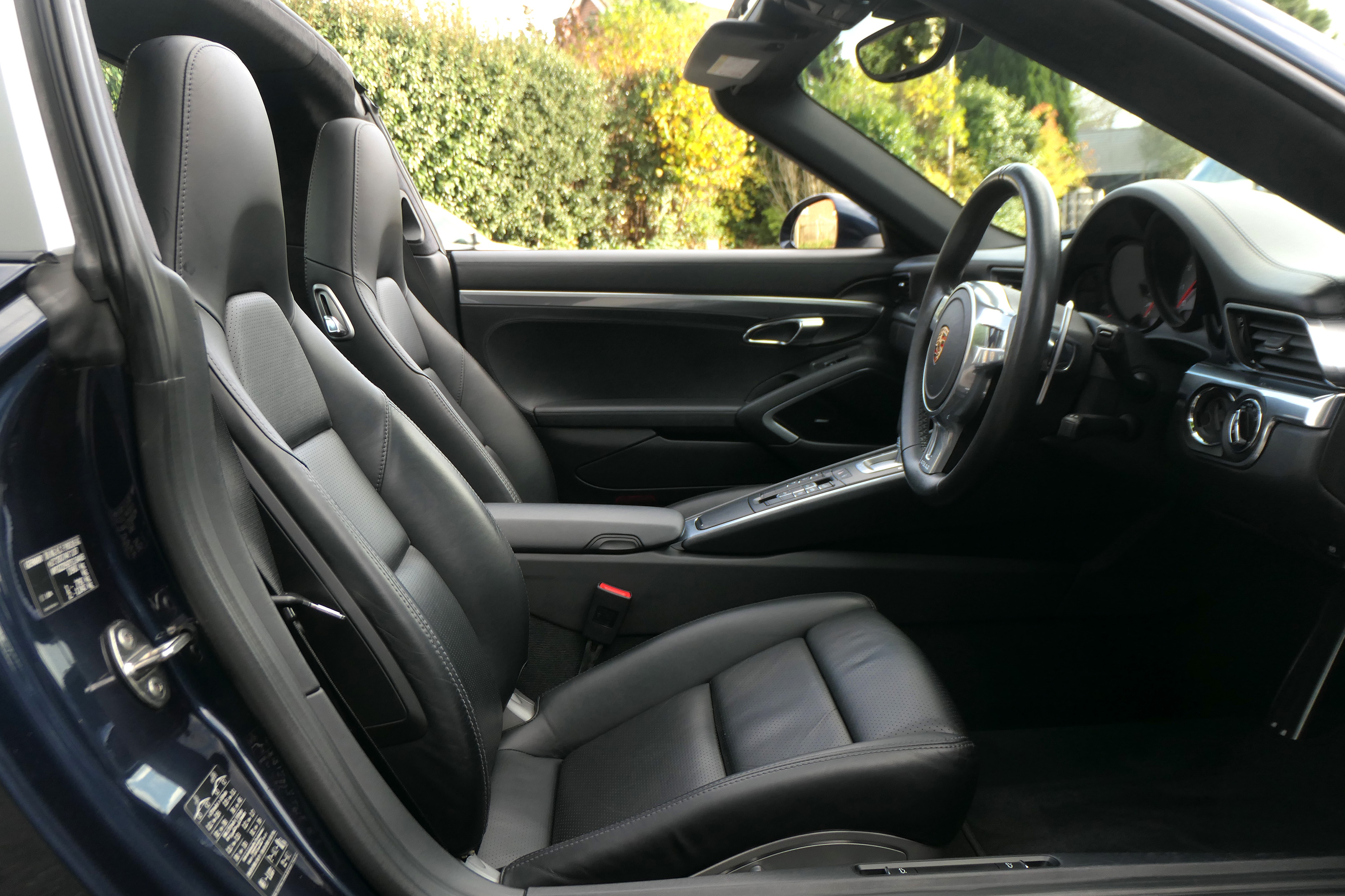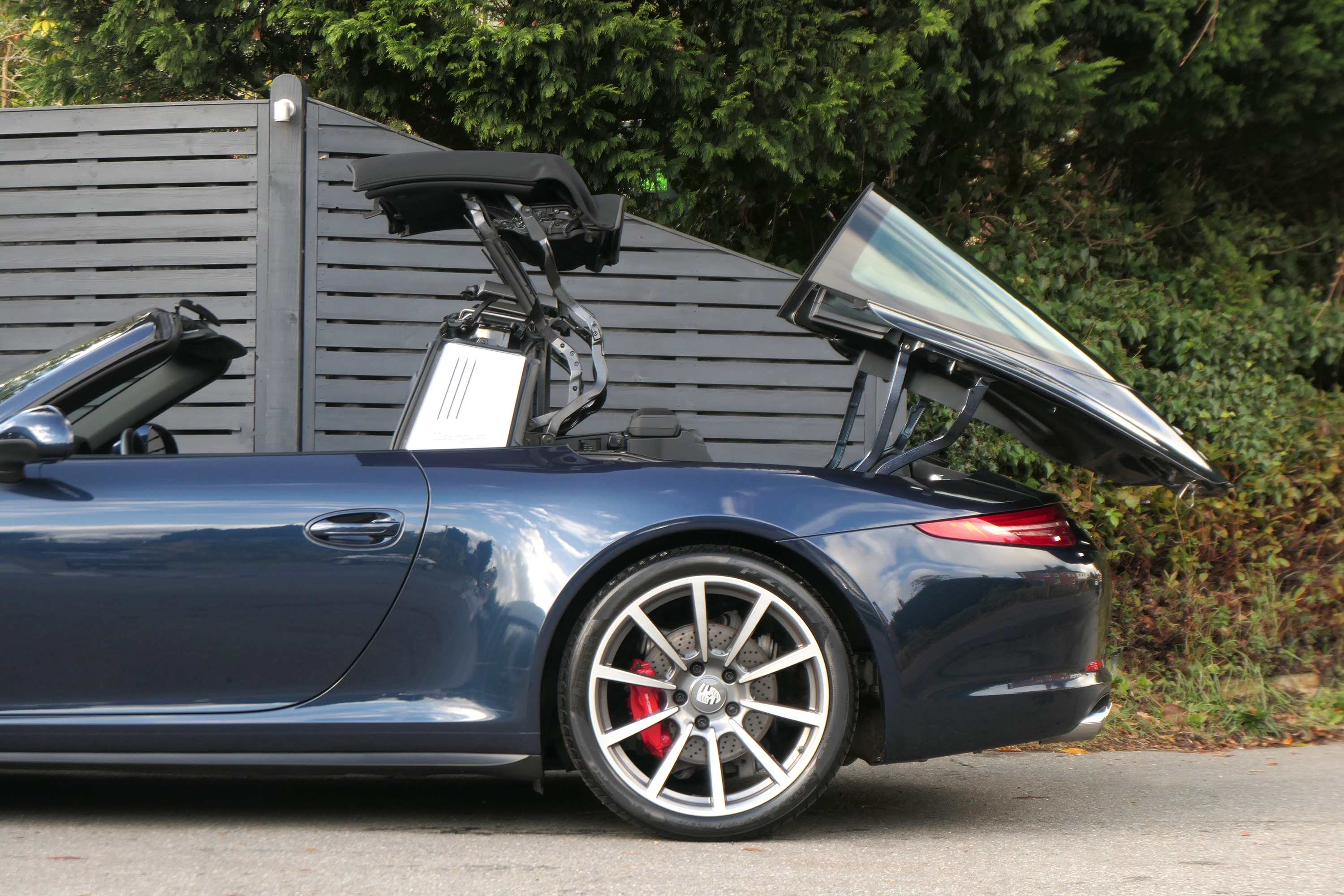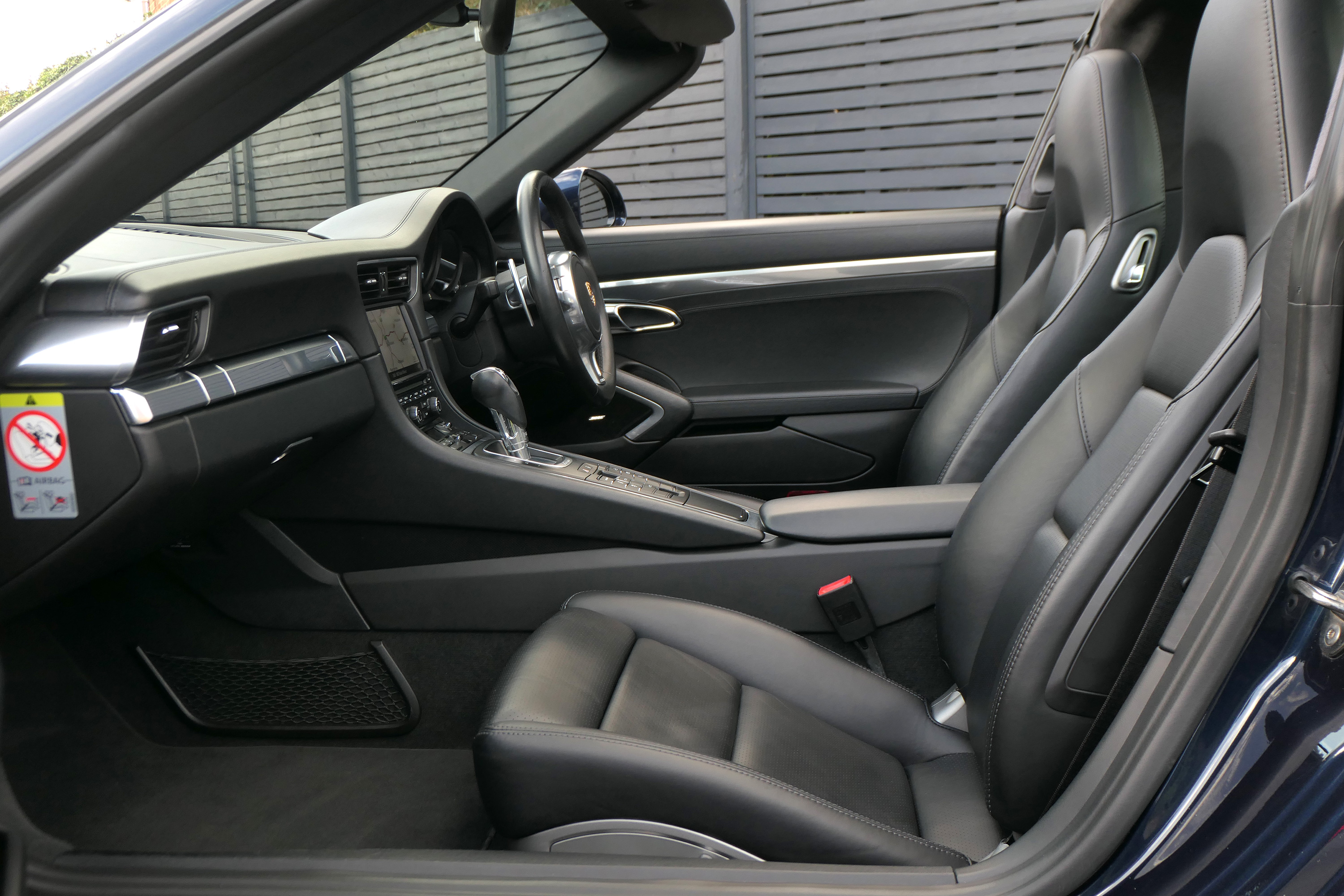 This 911 Carrera 4 S Targa (991) has the 7-speed PDK gearbox and is presented in Night Blue Metallic with black leather seats.