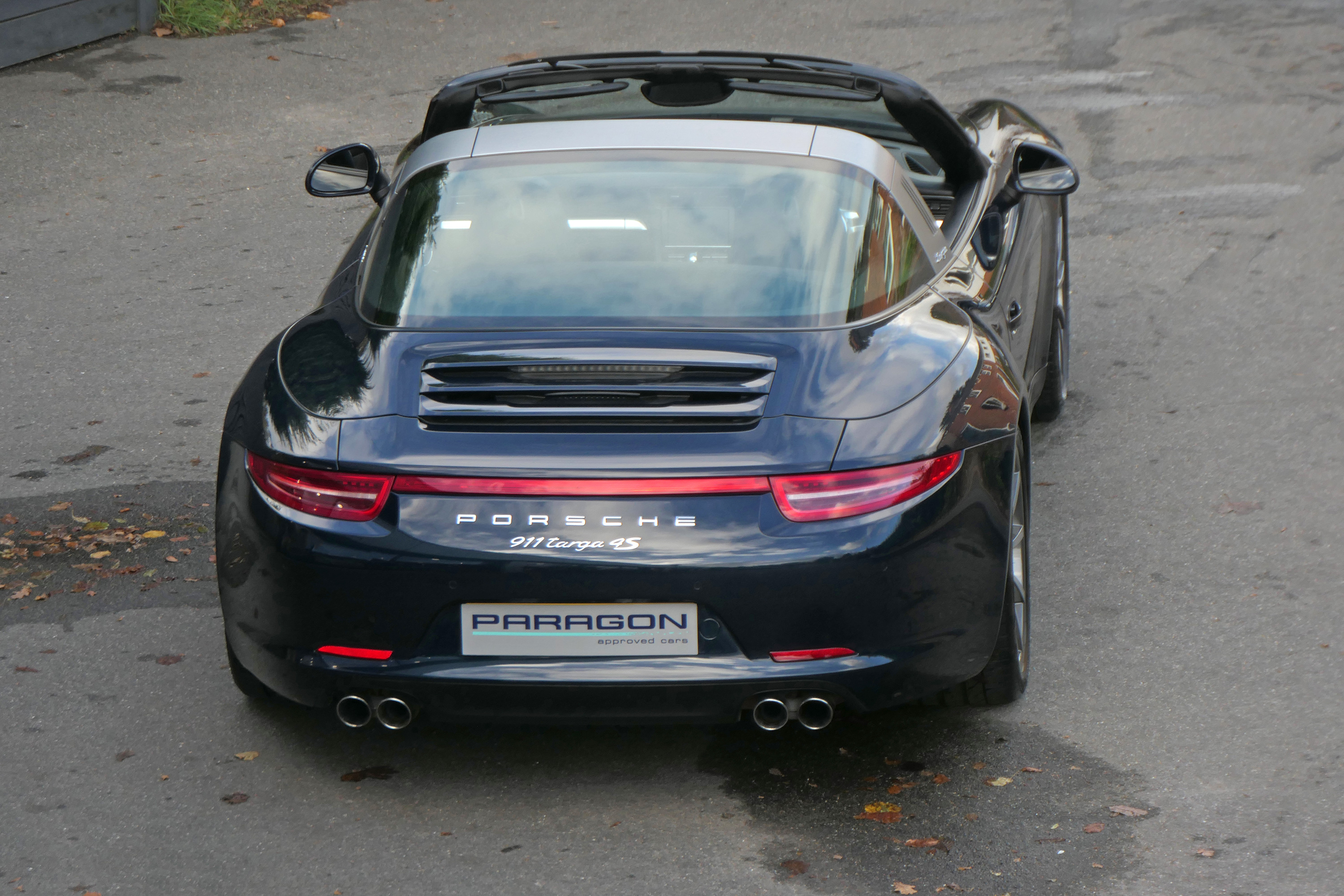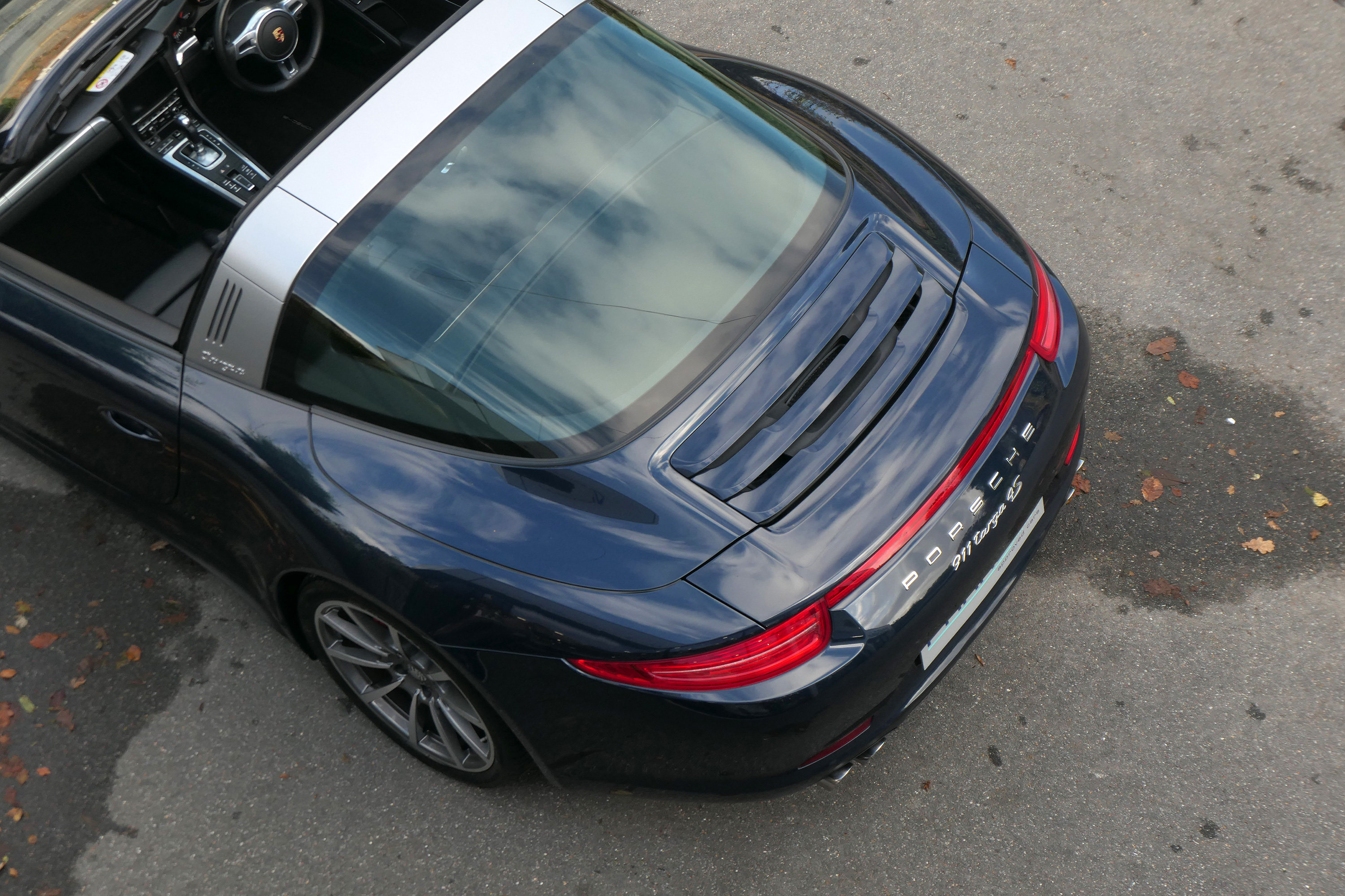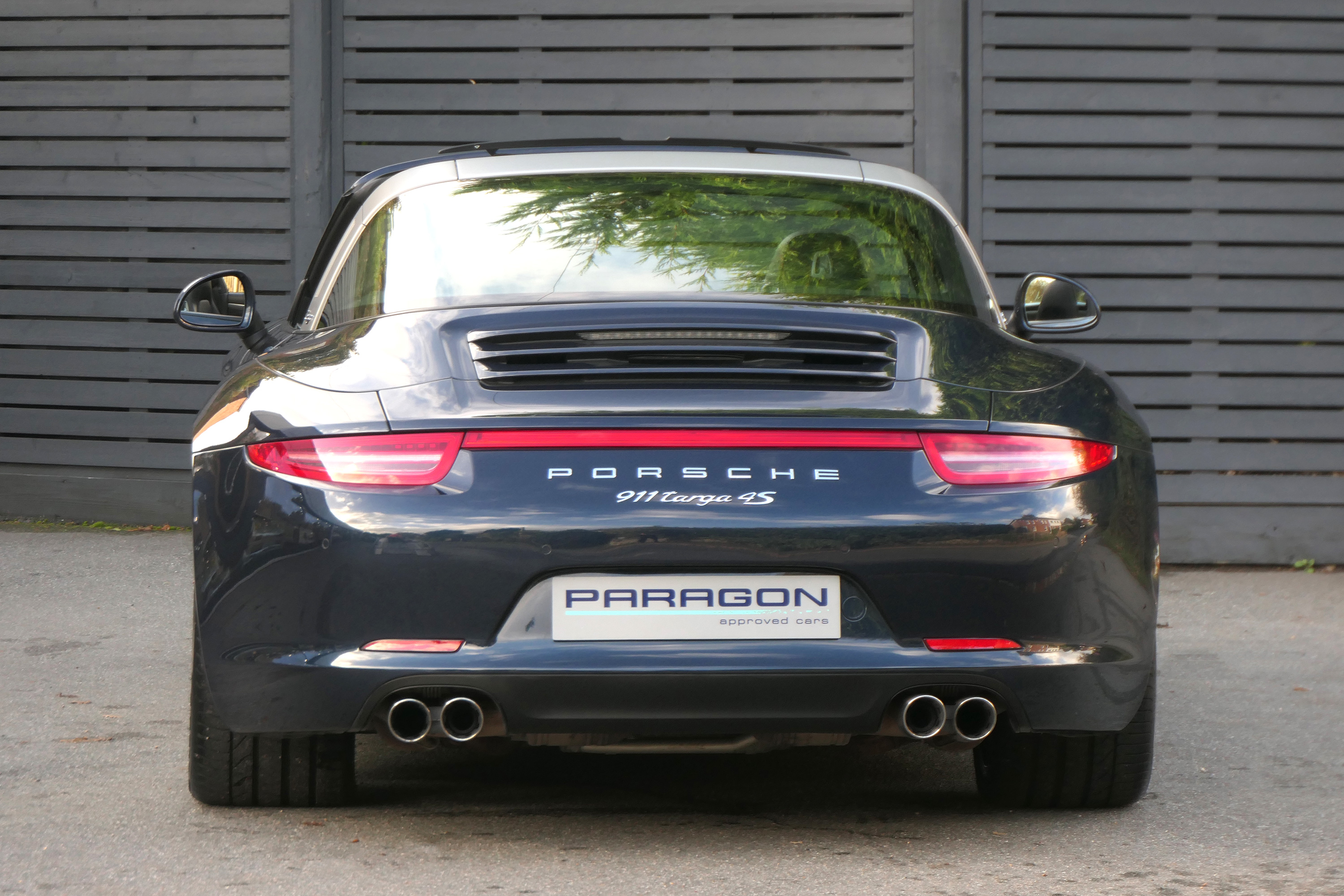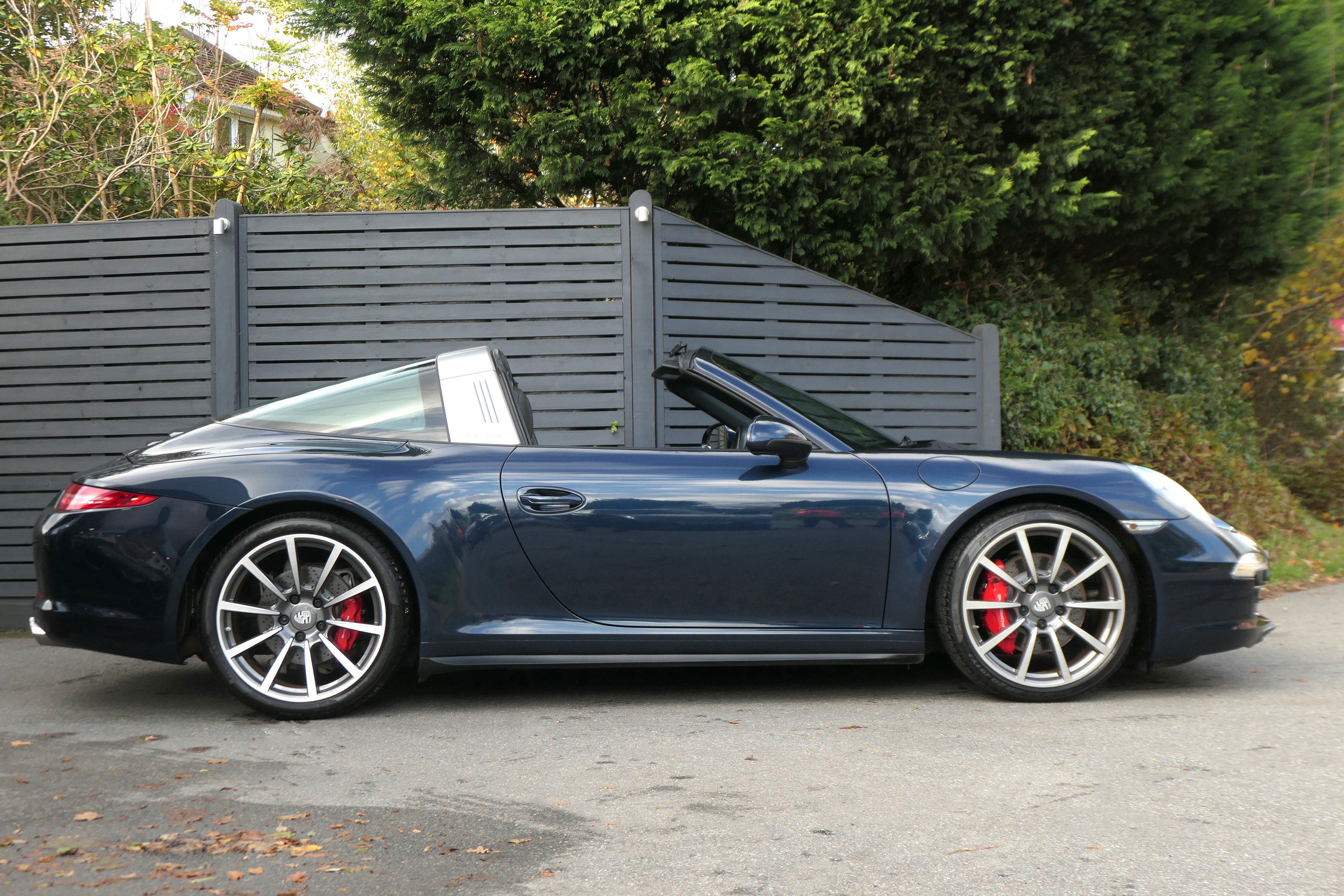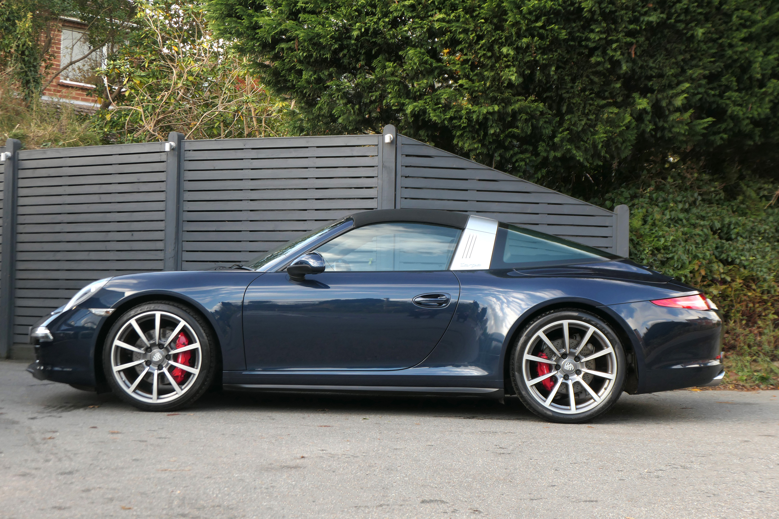 This 911 Carrera 4 S Targa (991) has the 7-speed PDK gearbox and is presented in Night Blue Metallic with black leather seats.