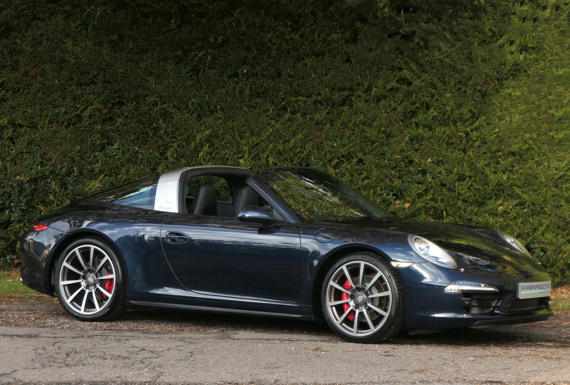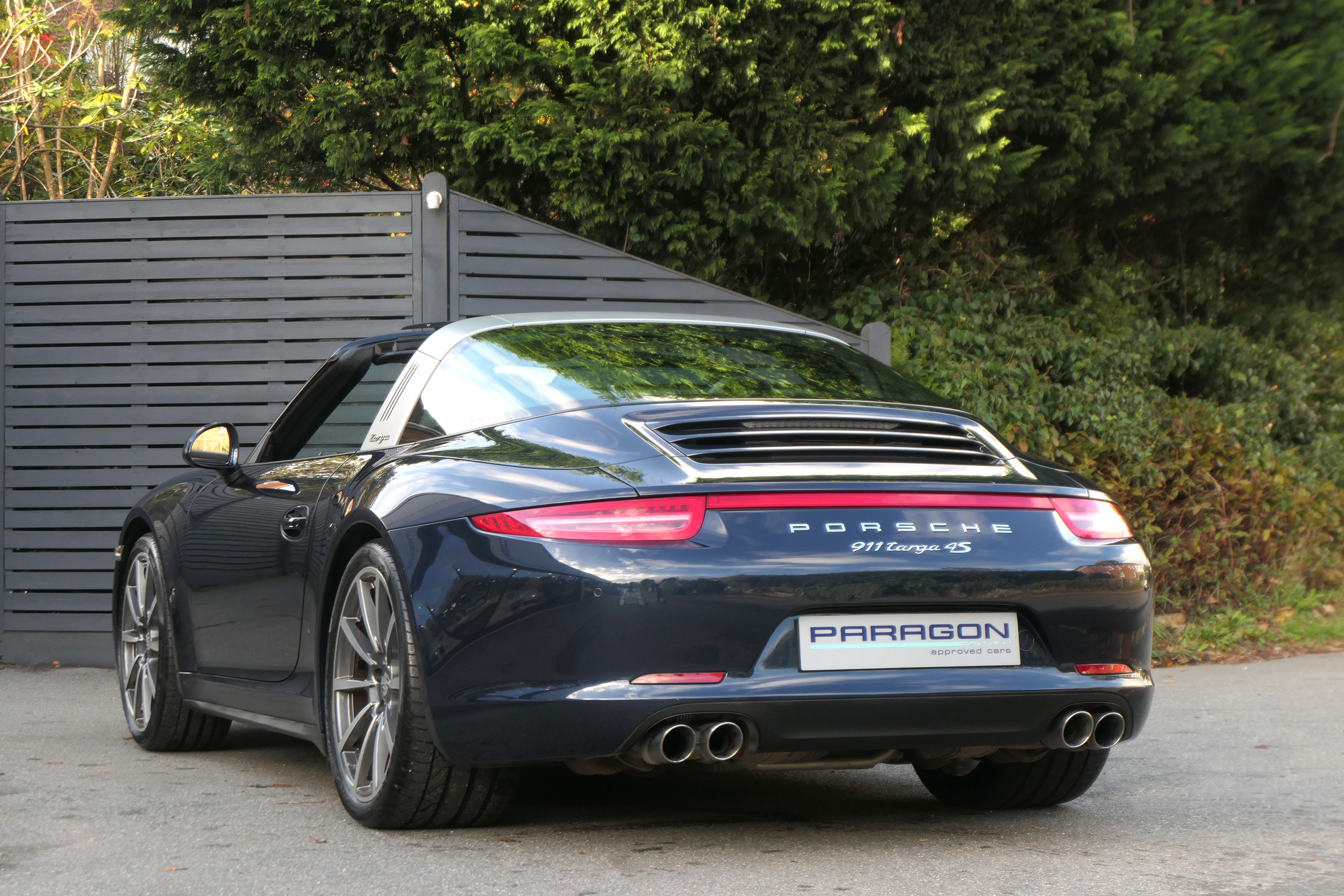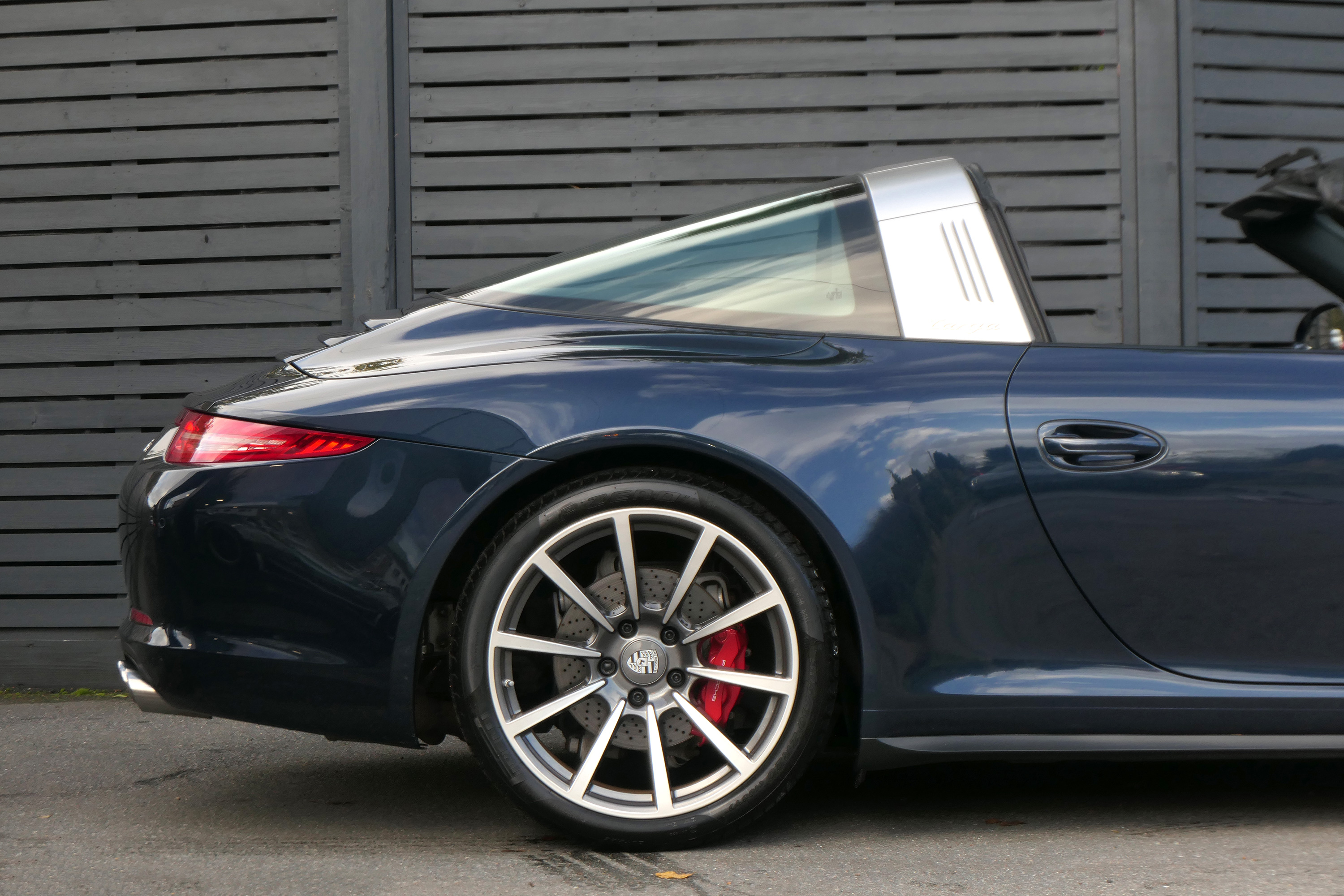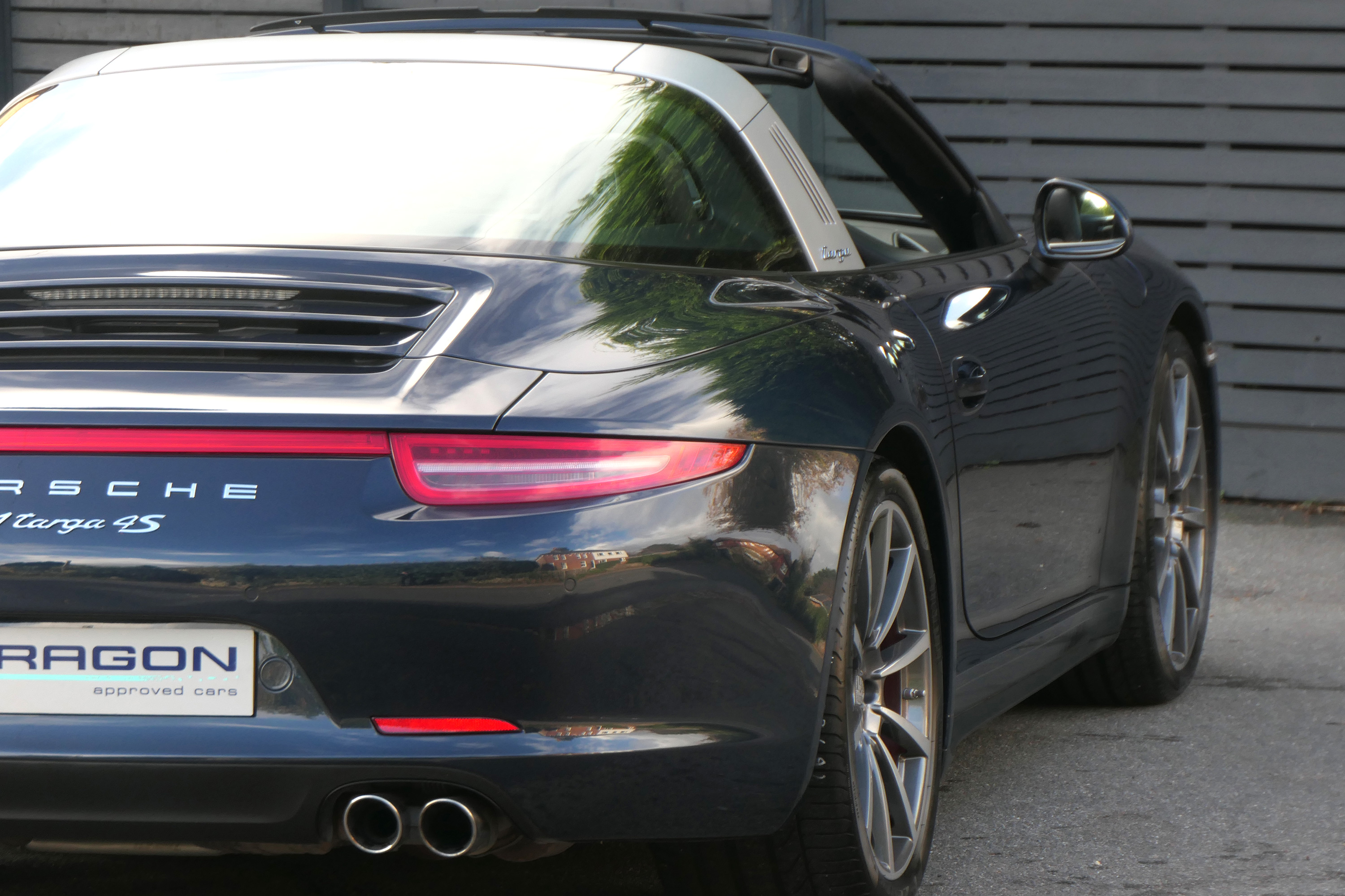 This 911 Carrera 4 S Targa (991) has the 7-speed PDK gearbox and is presented in Night Blue Metallic with black leather seats.