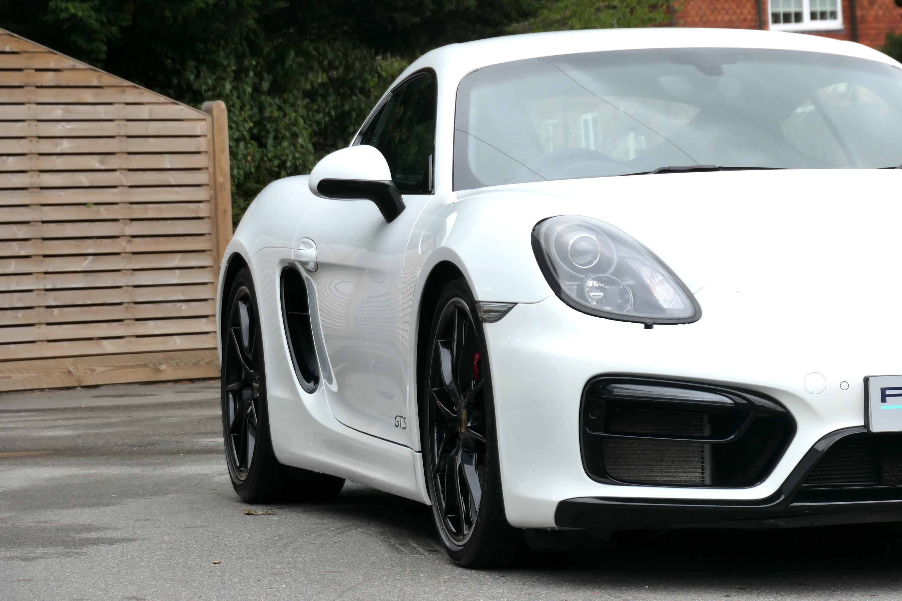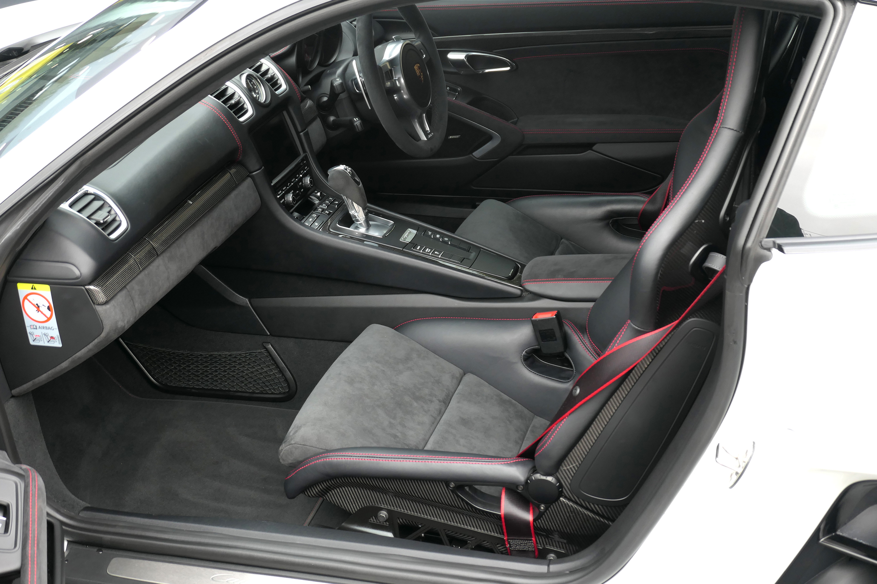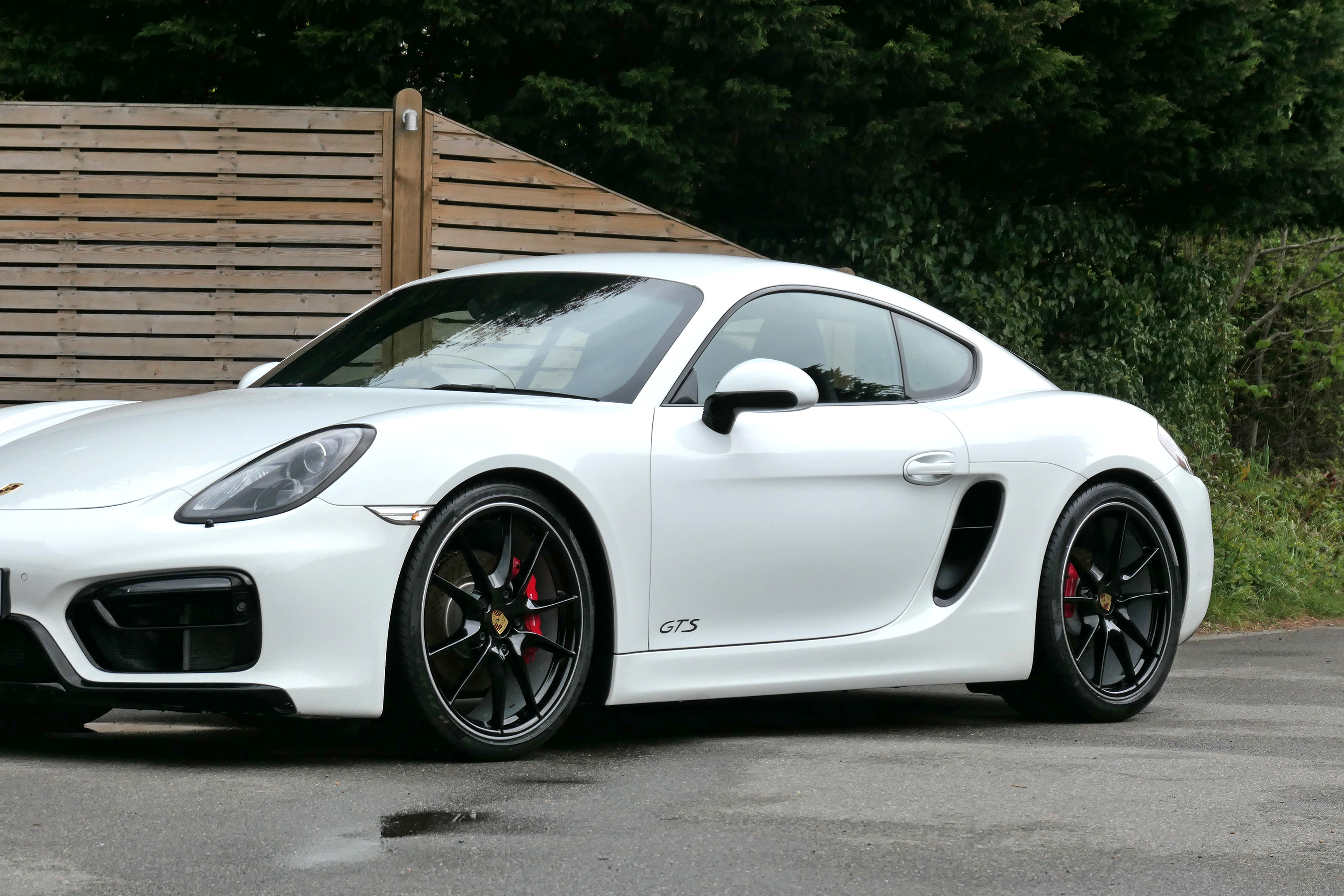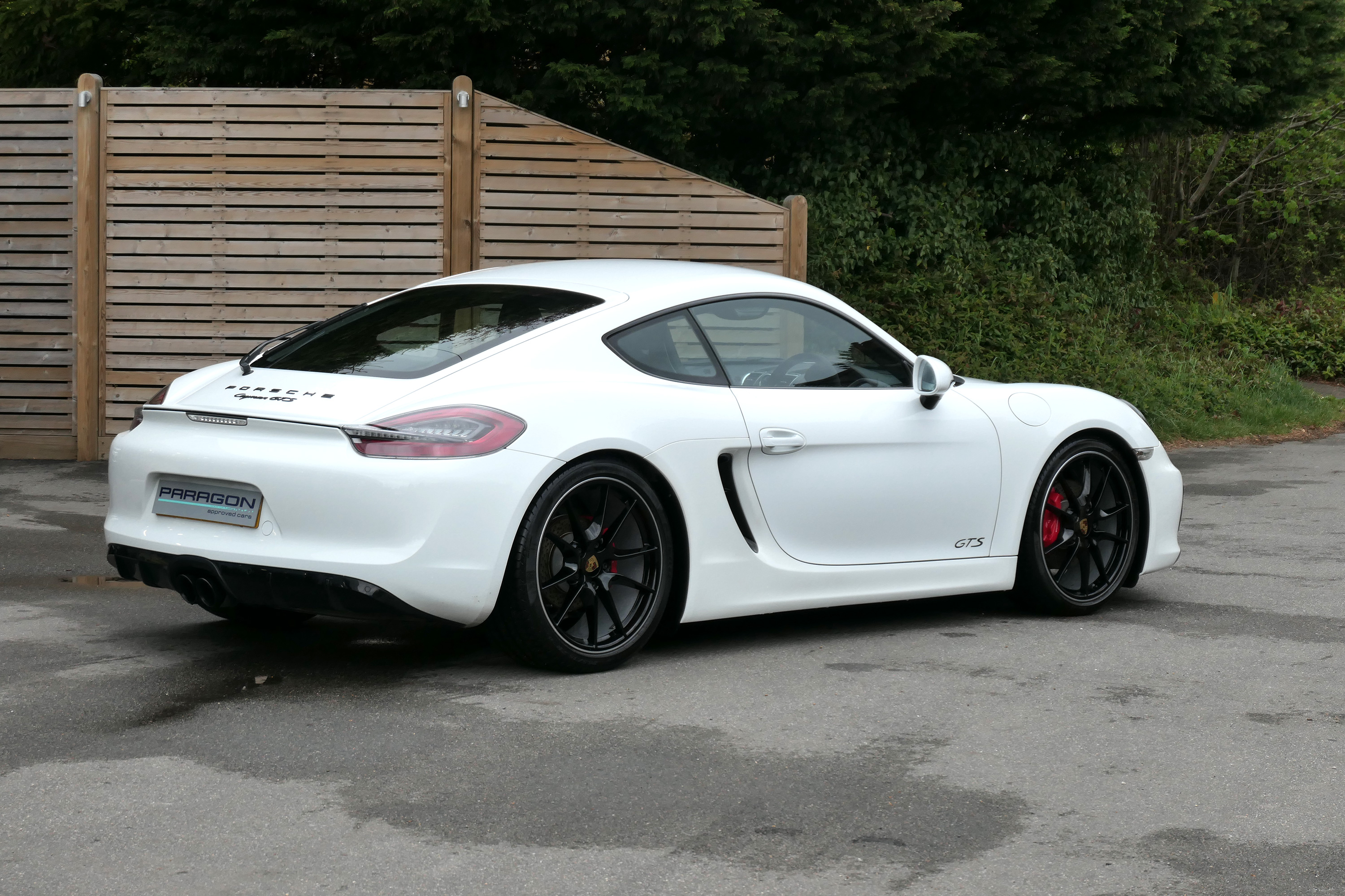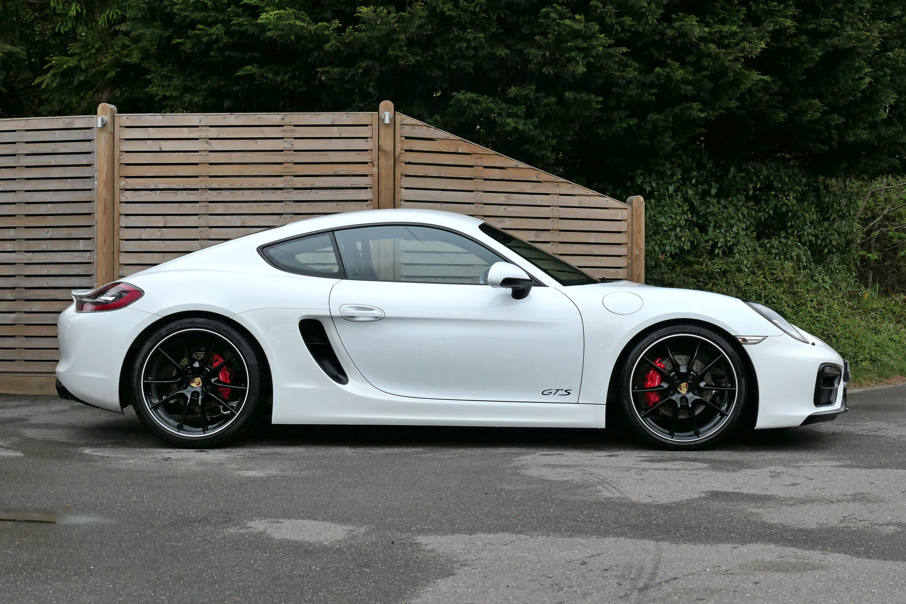 This Cayman (981) GTS has the 7-speed PDK gearbox and is presented in Carrara White with black half leather bucket seats.
