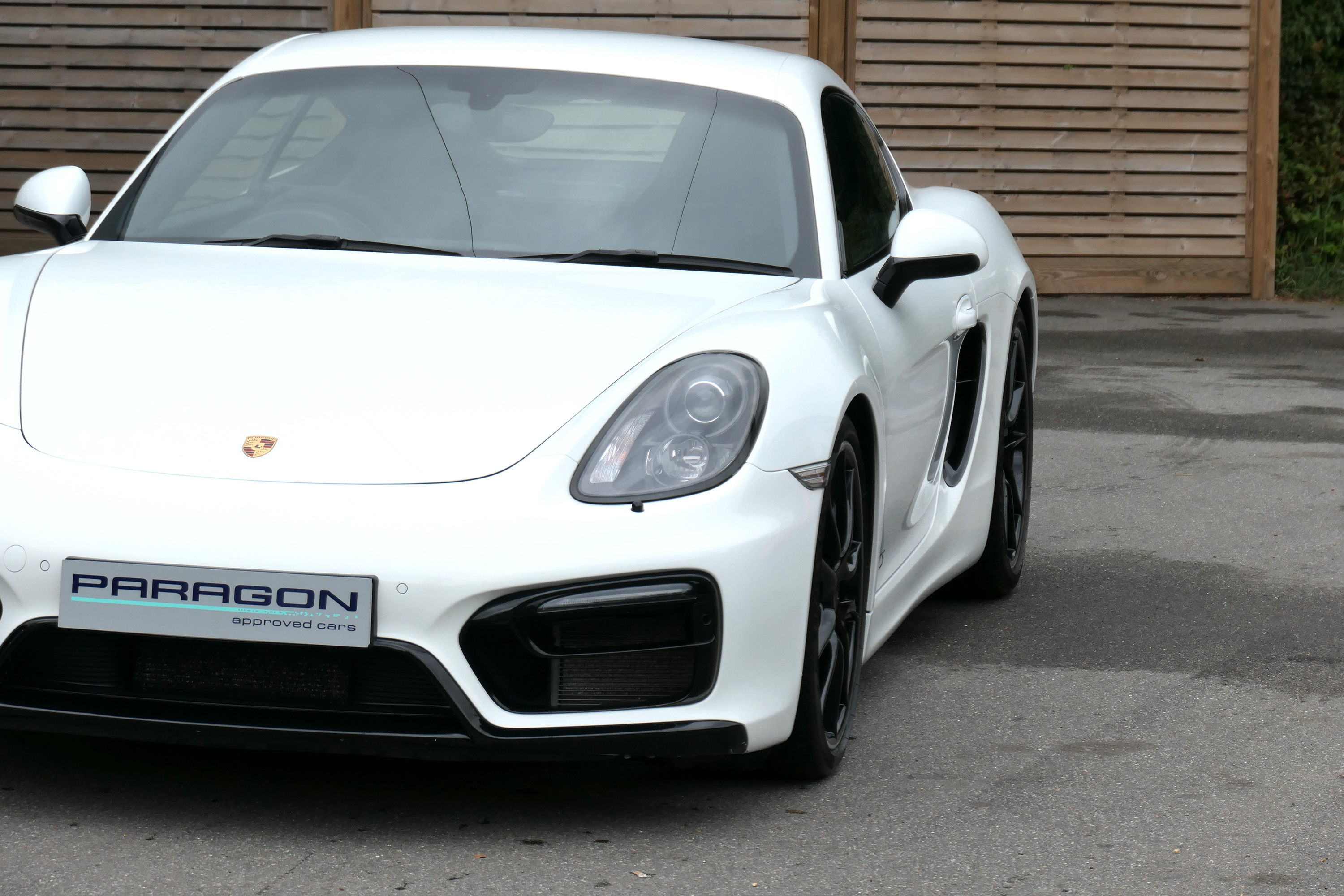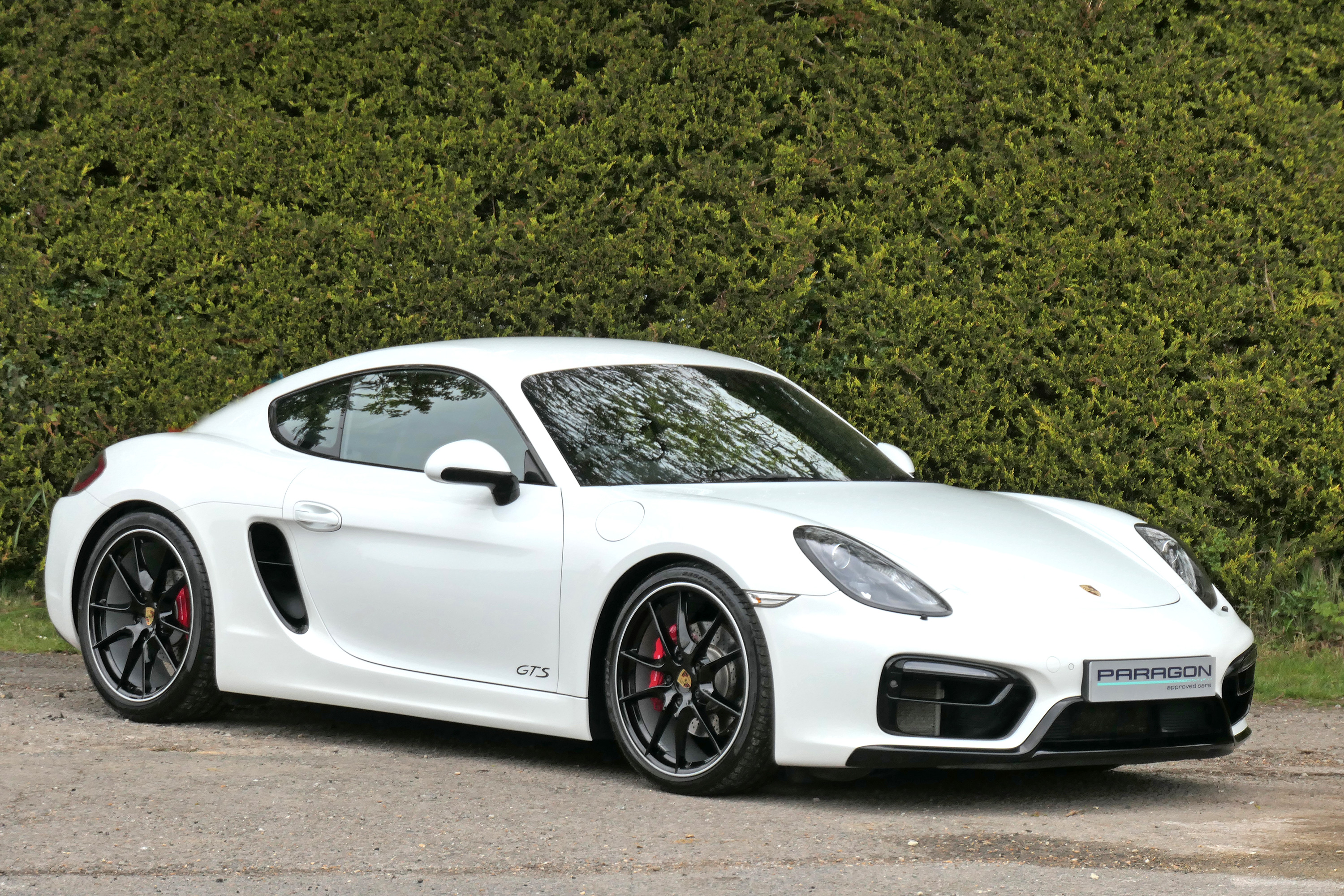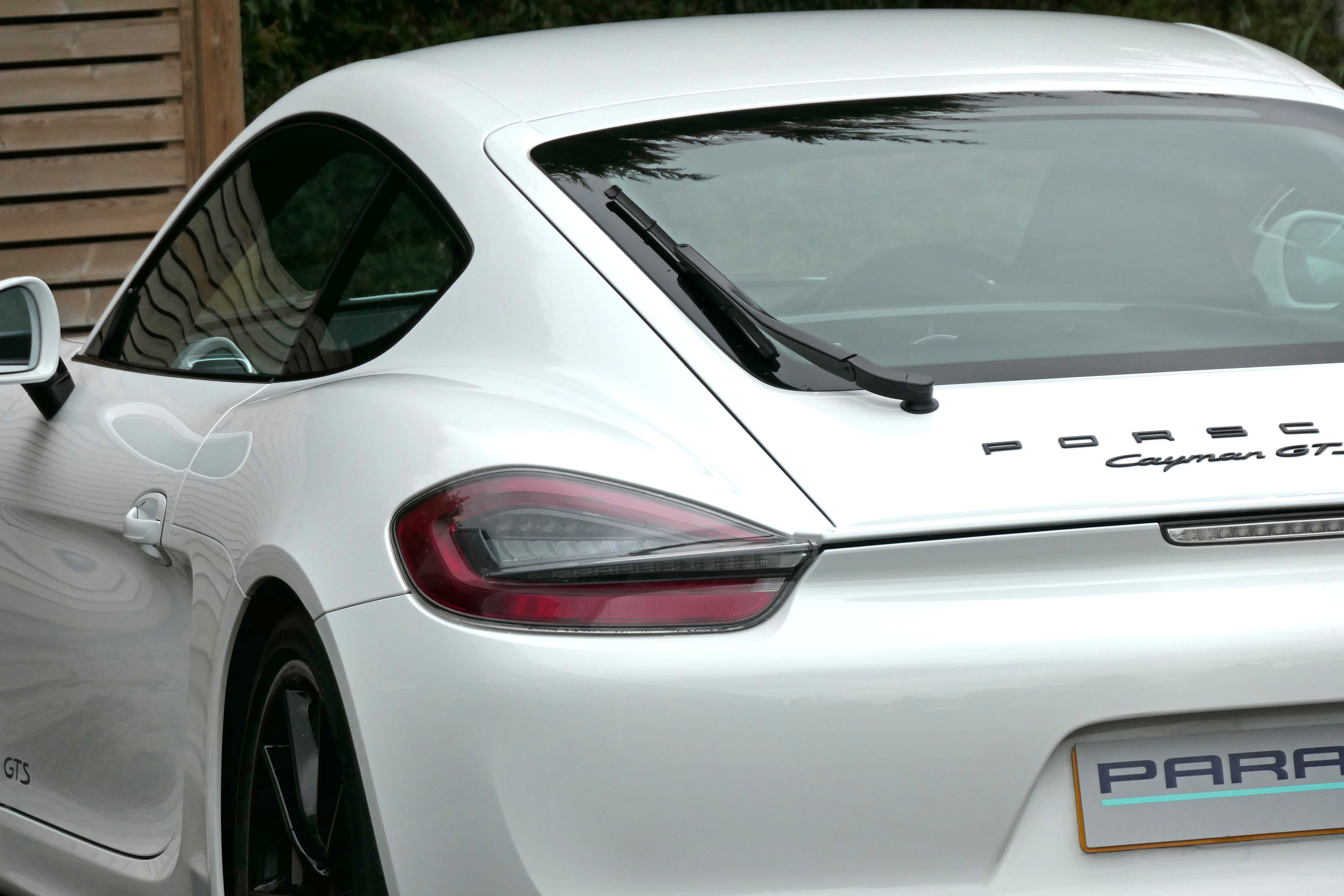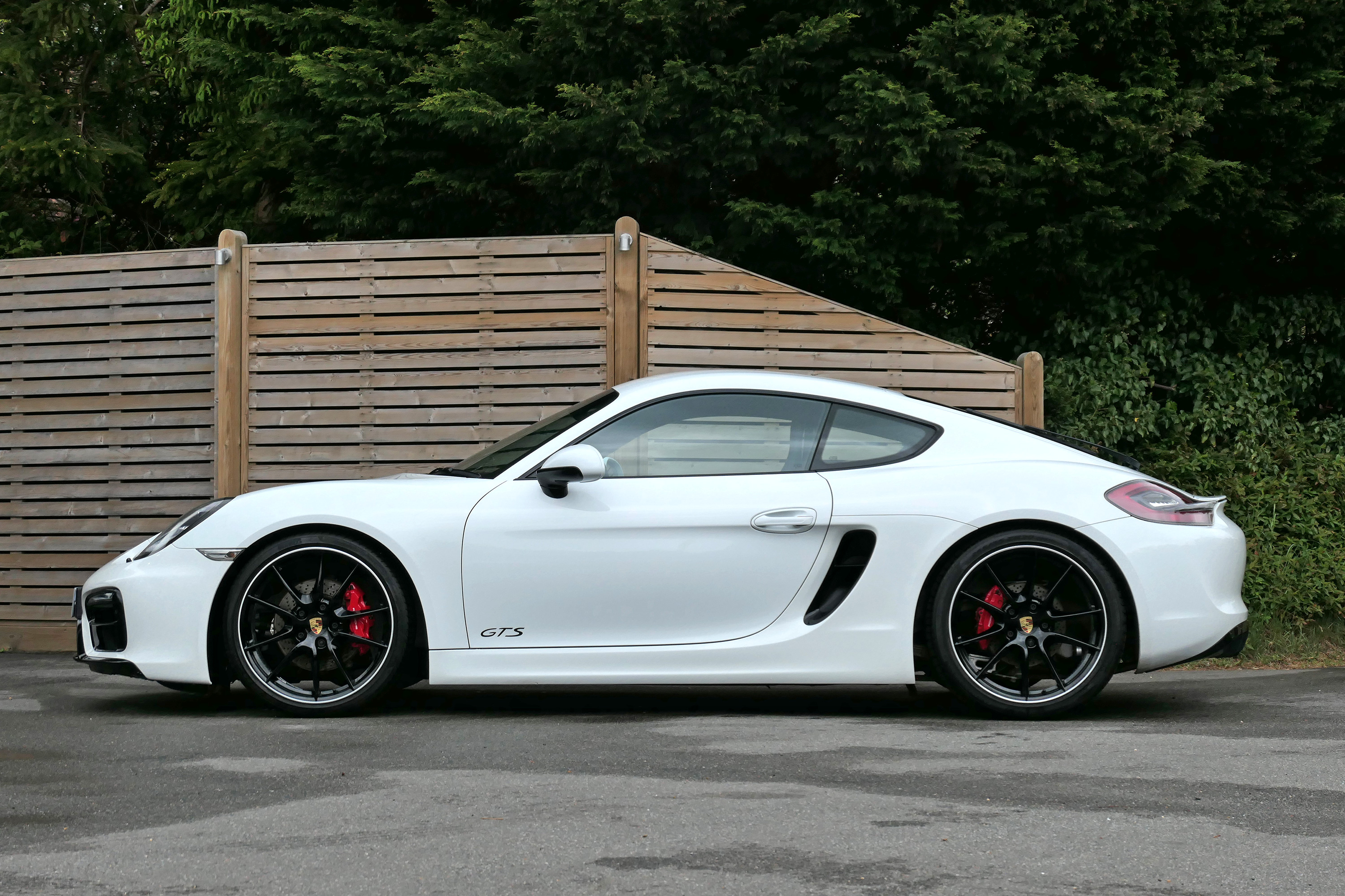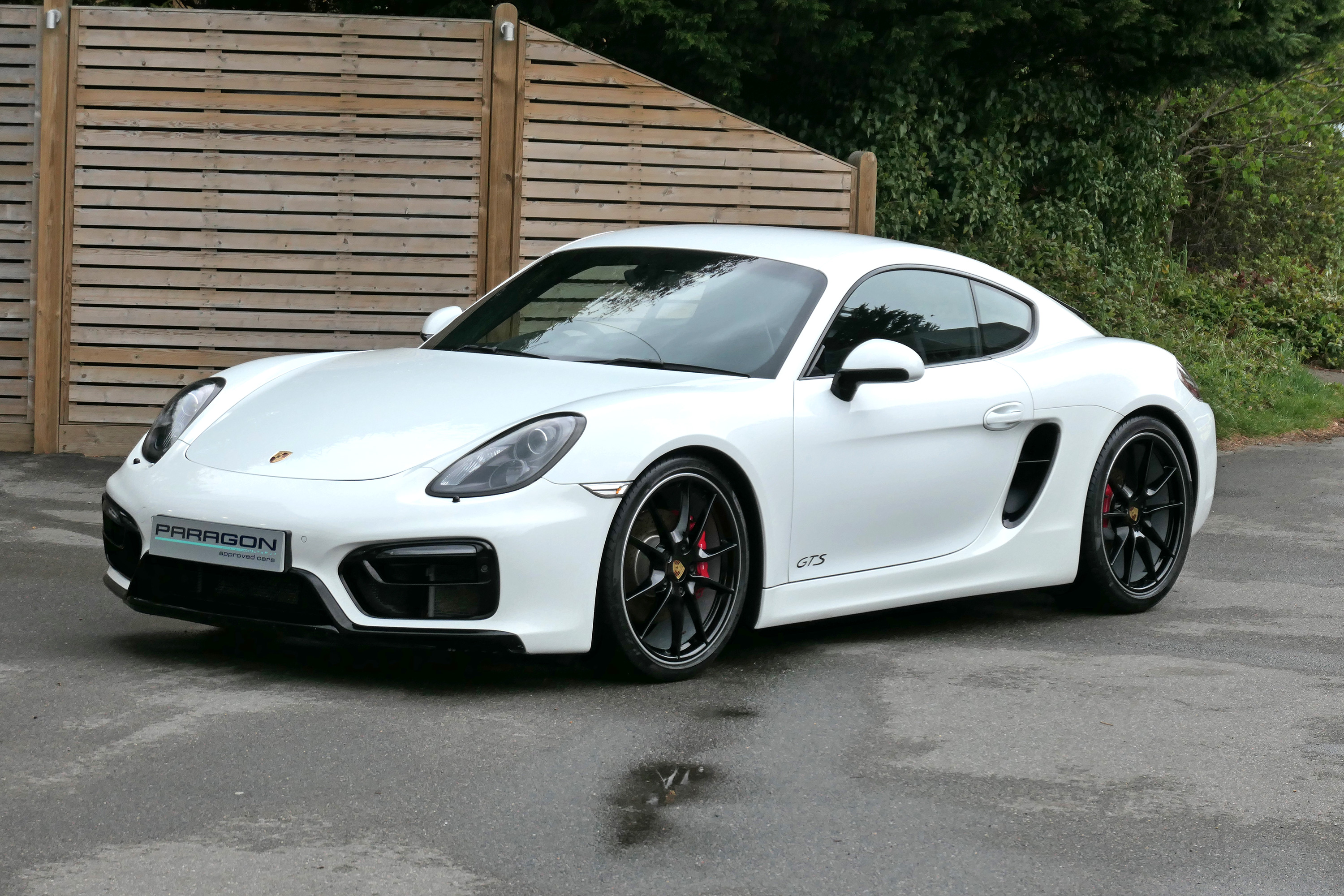 This Cayman (981) GTS has the 7-speed PDK gearbox and is presented in Carrara White with black half leather bucket seats.