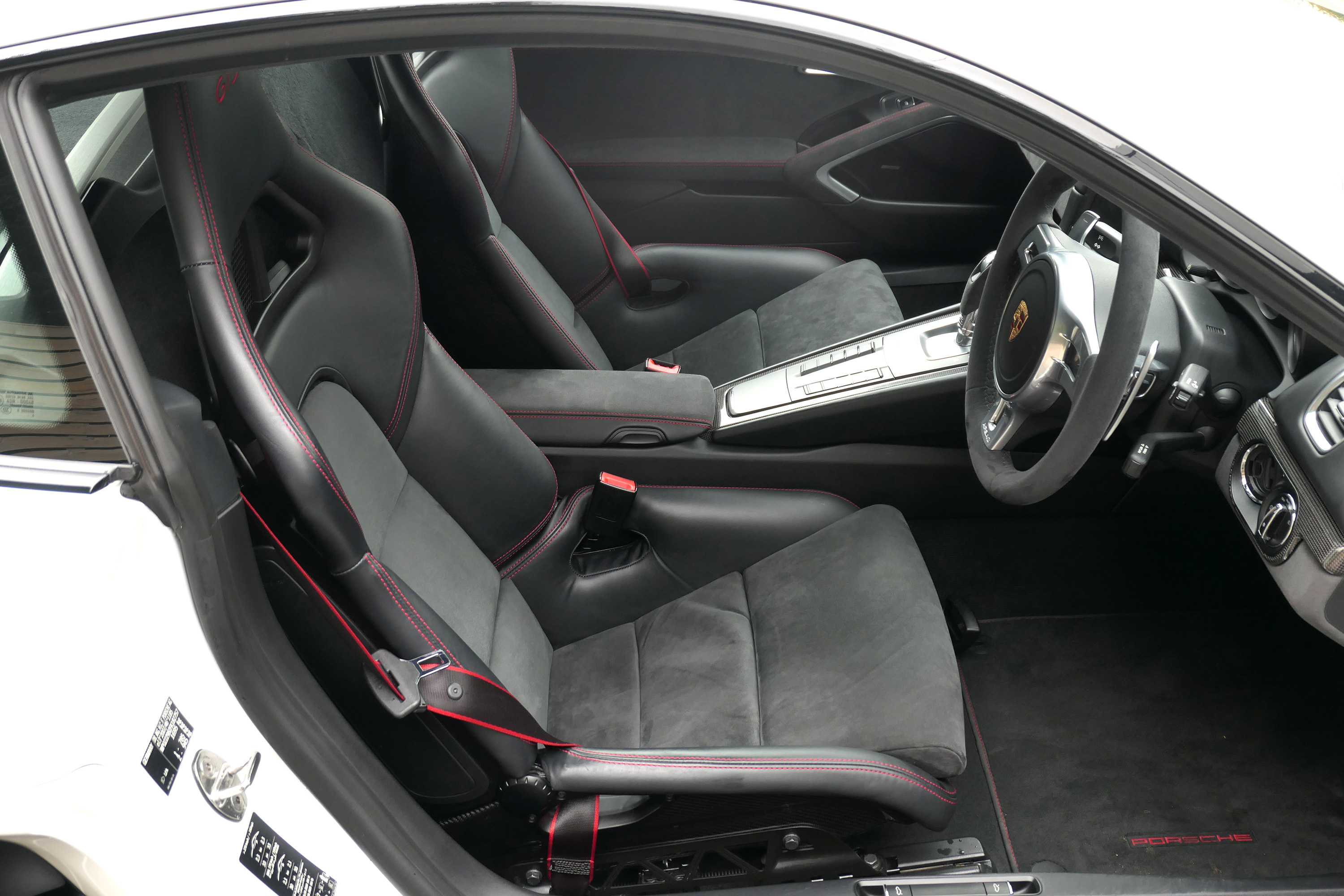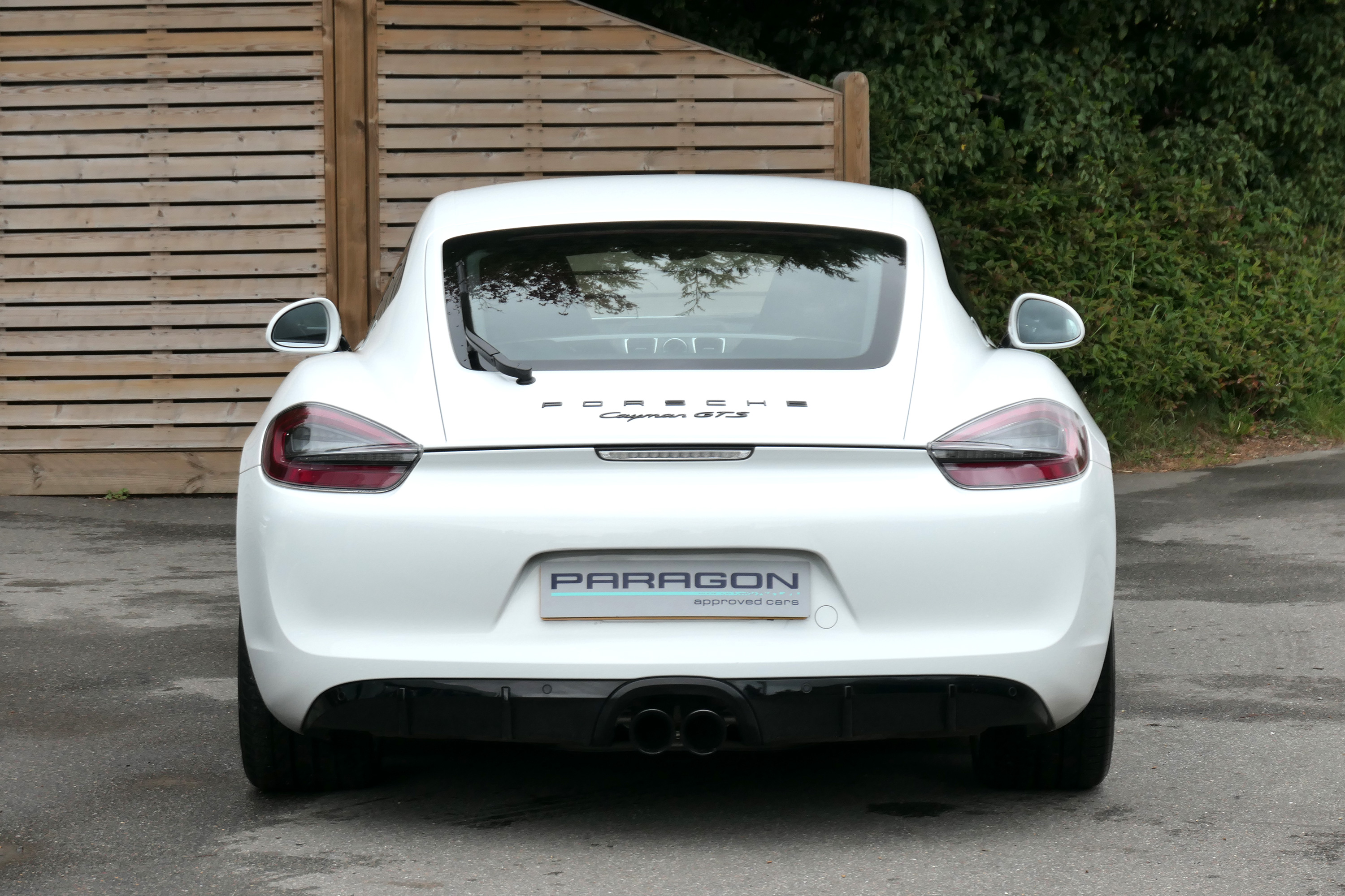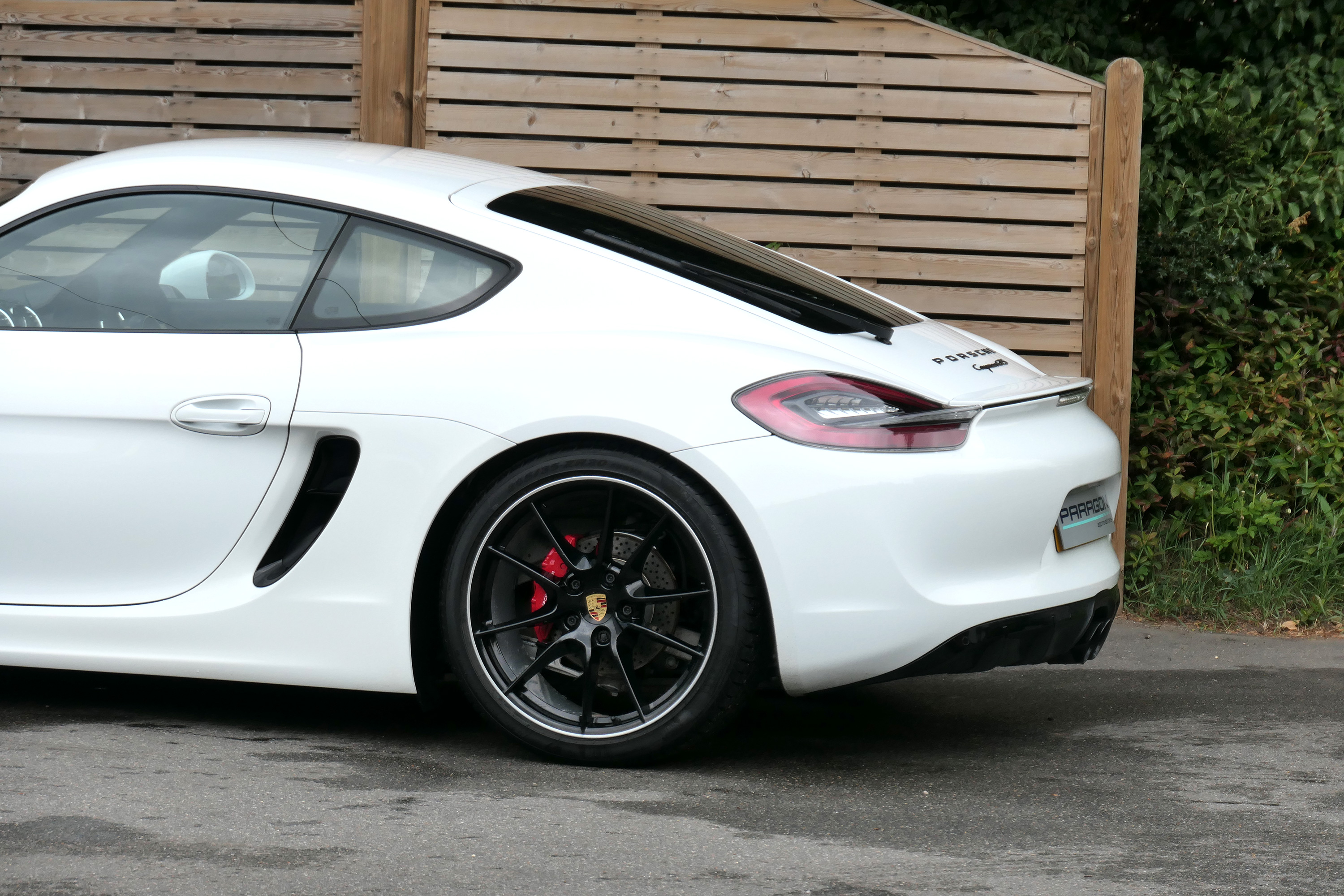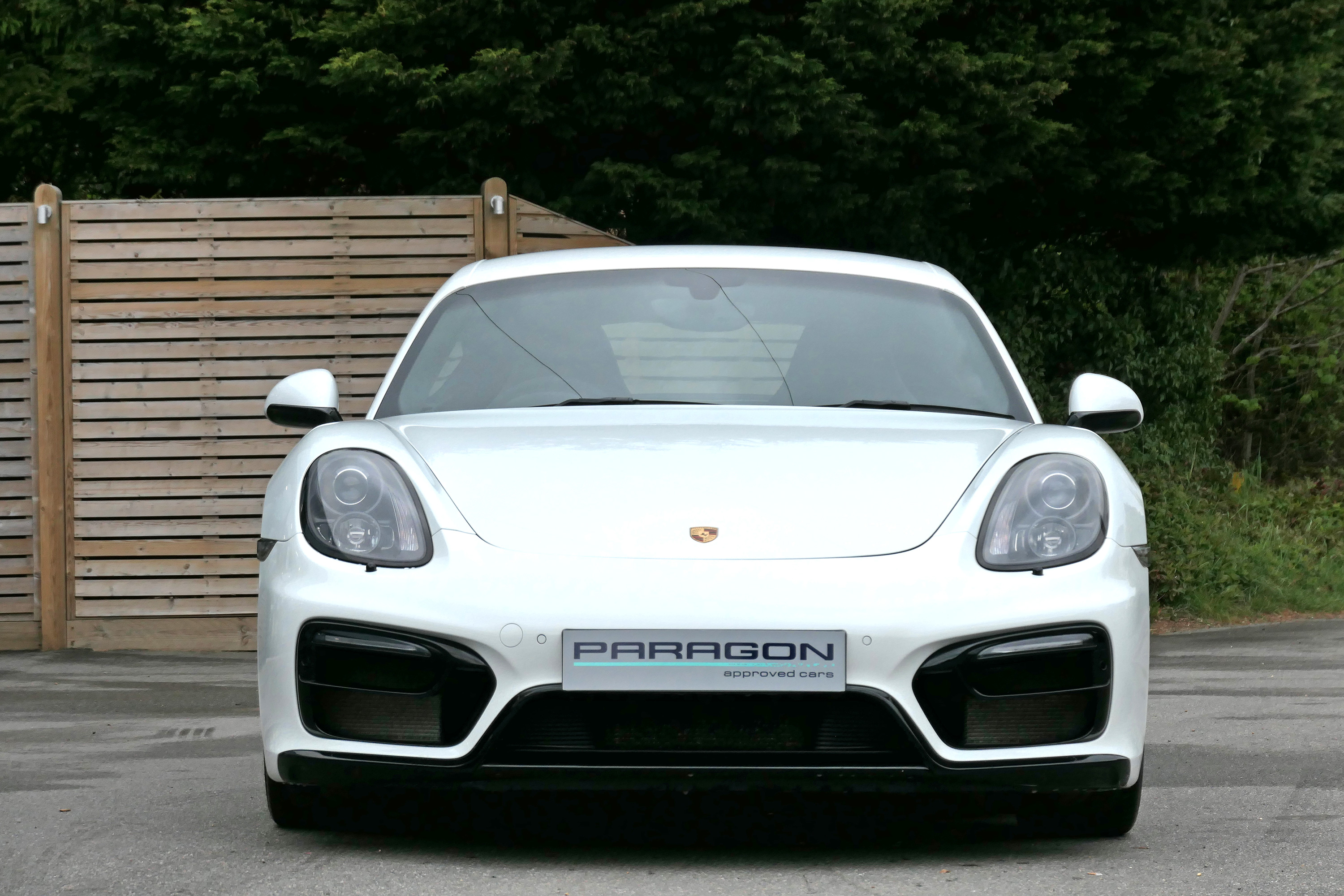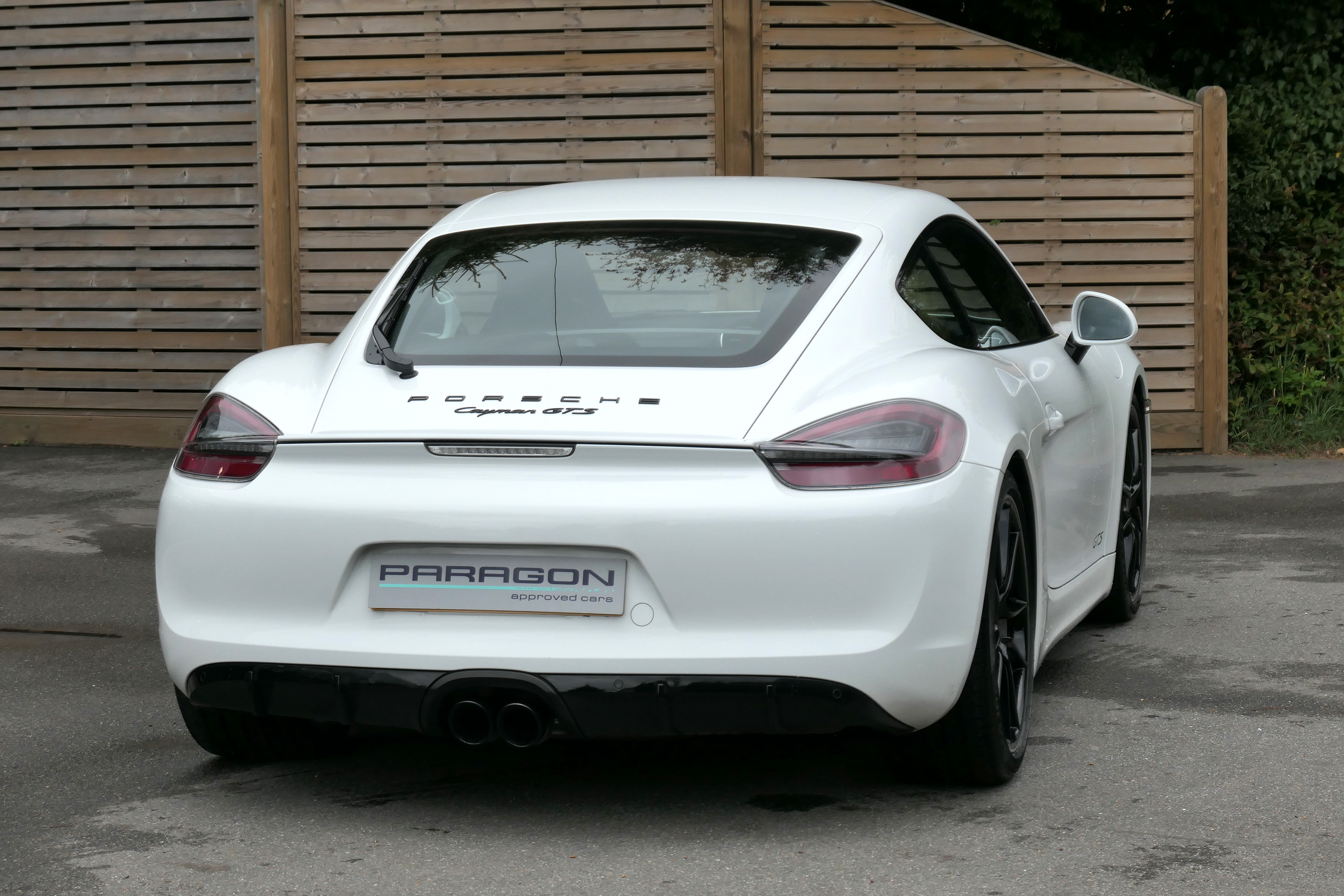 This Cayman (981) GTS has the 7-speed PDK gearbox and is presented in Carrara White with black half leather bucket seats.