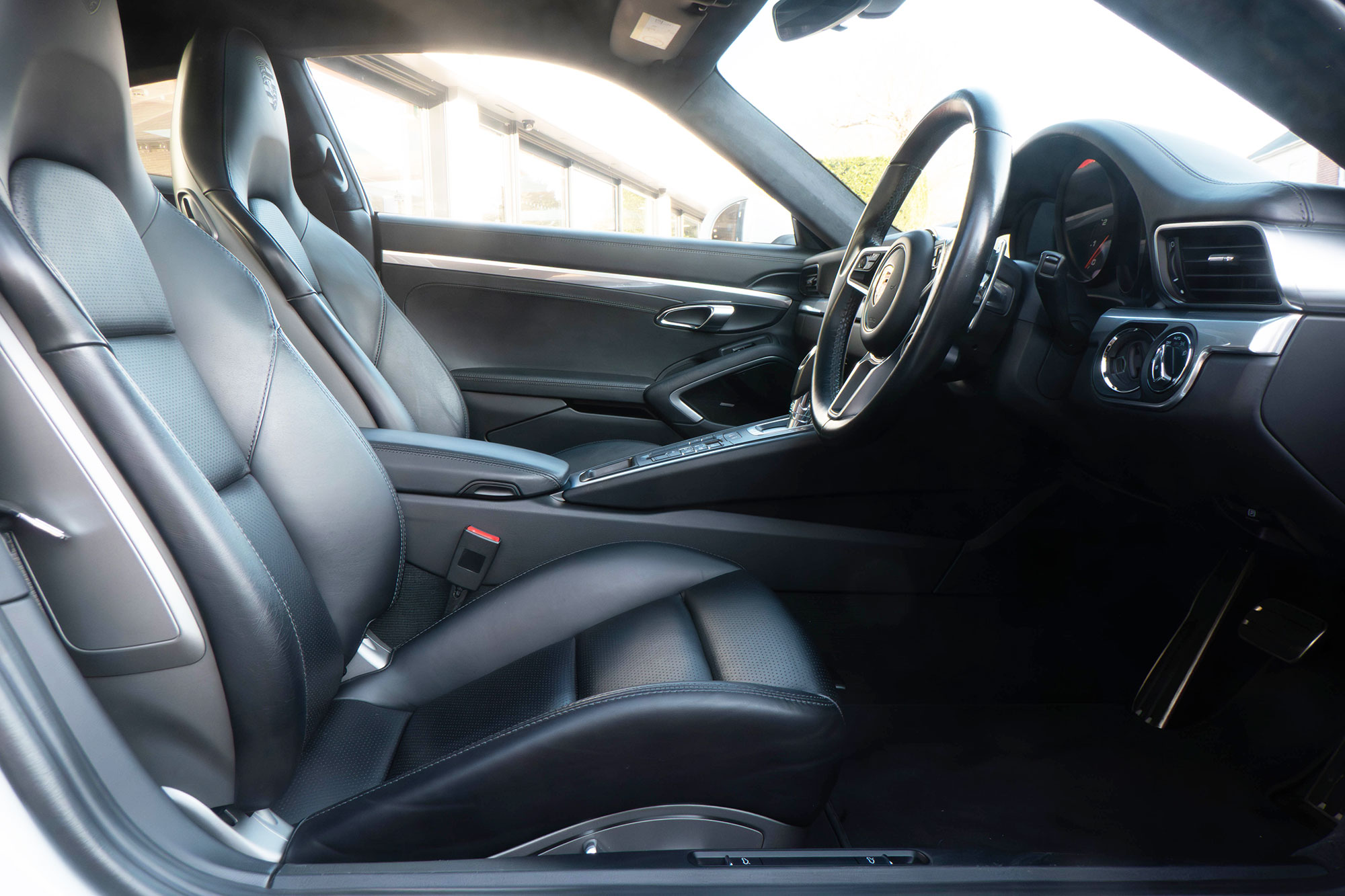 This 911 Carrera Coupe (991 GEN II) has the 7-speed PDK in Carrara White Metallic with black leather seats.