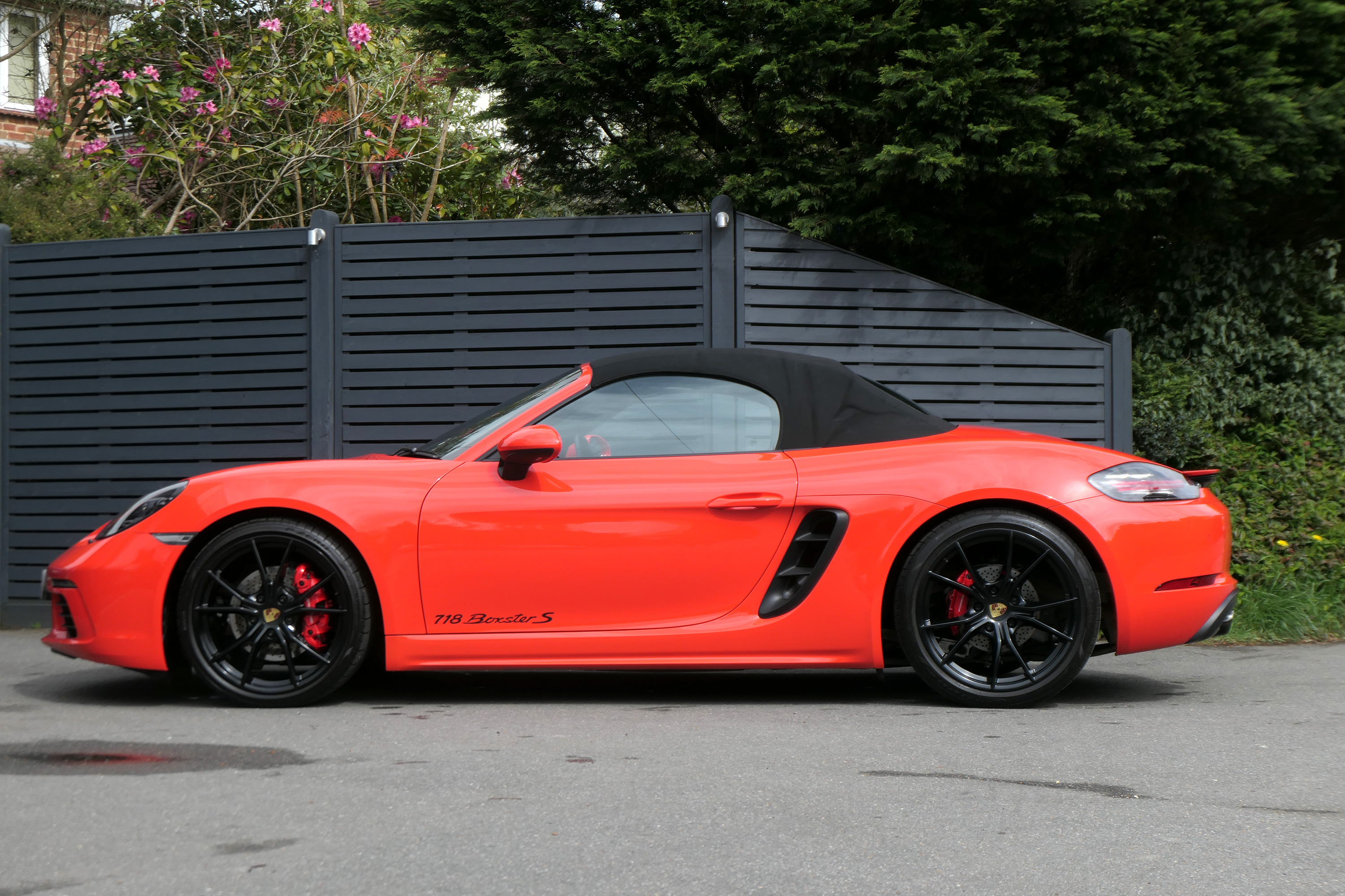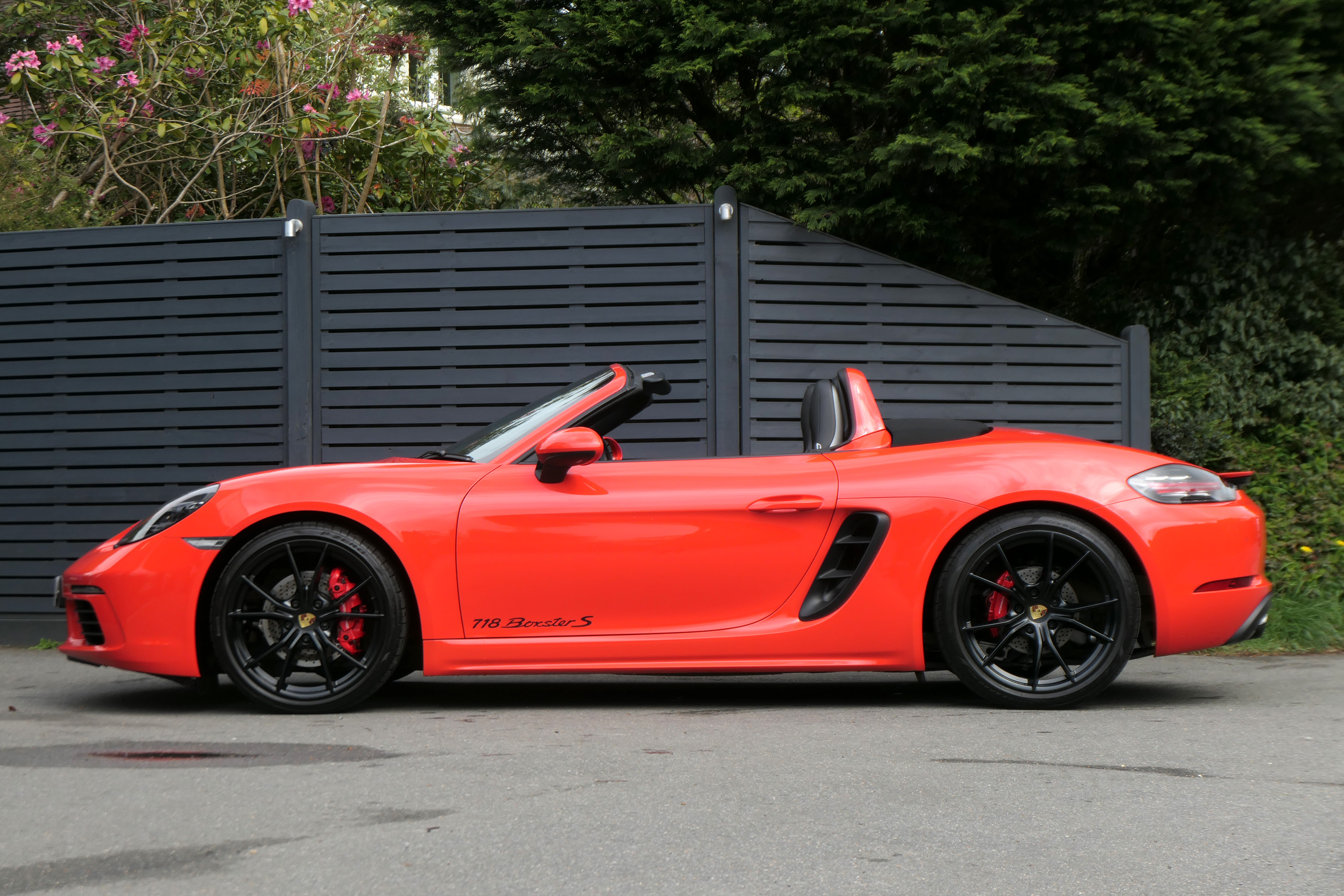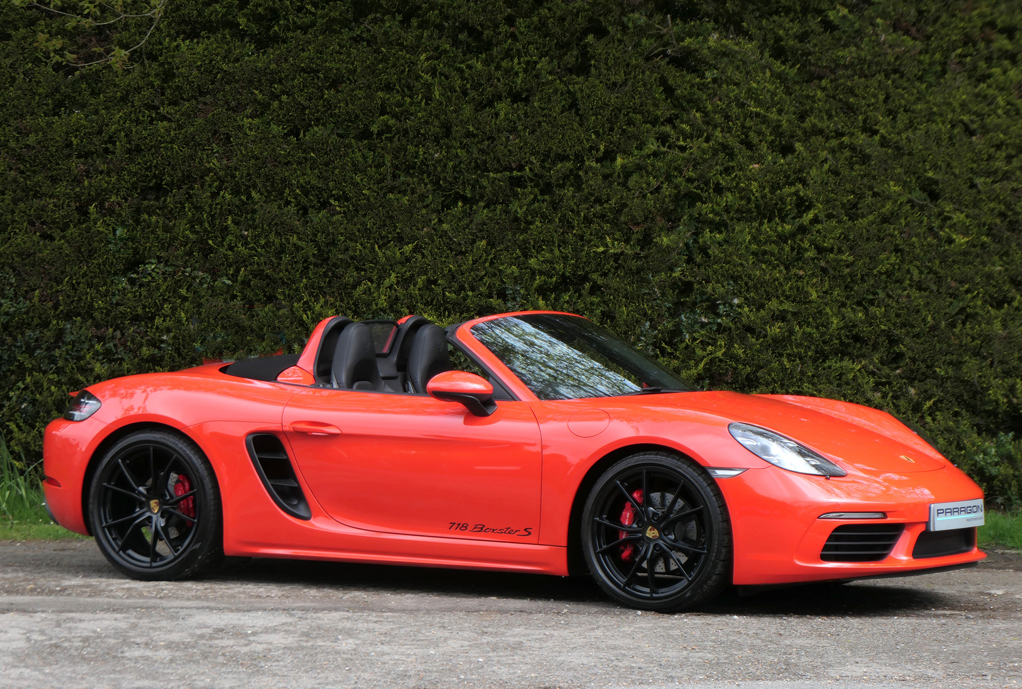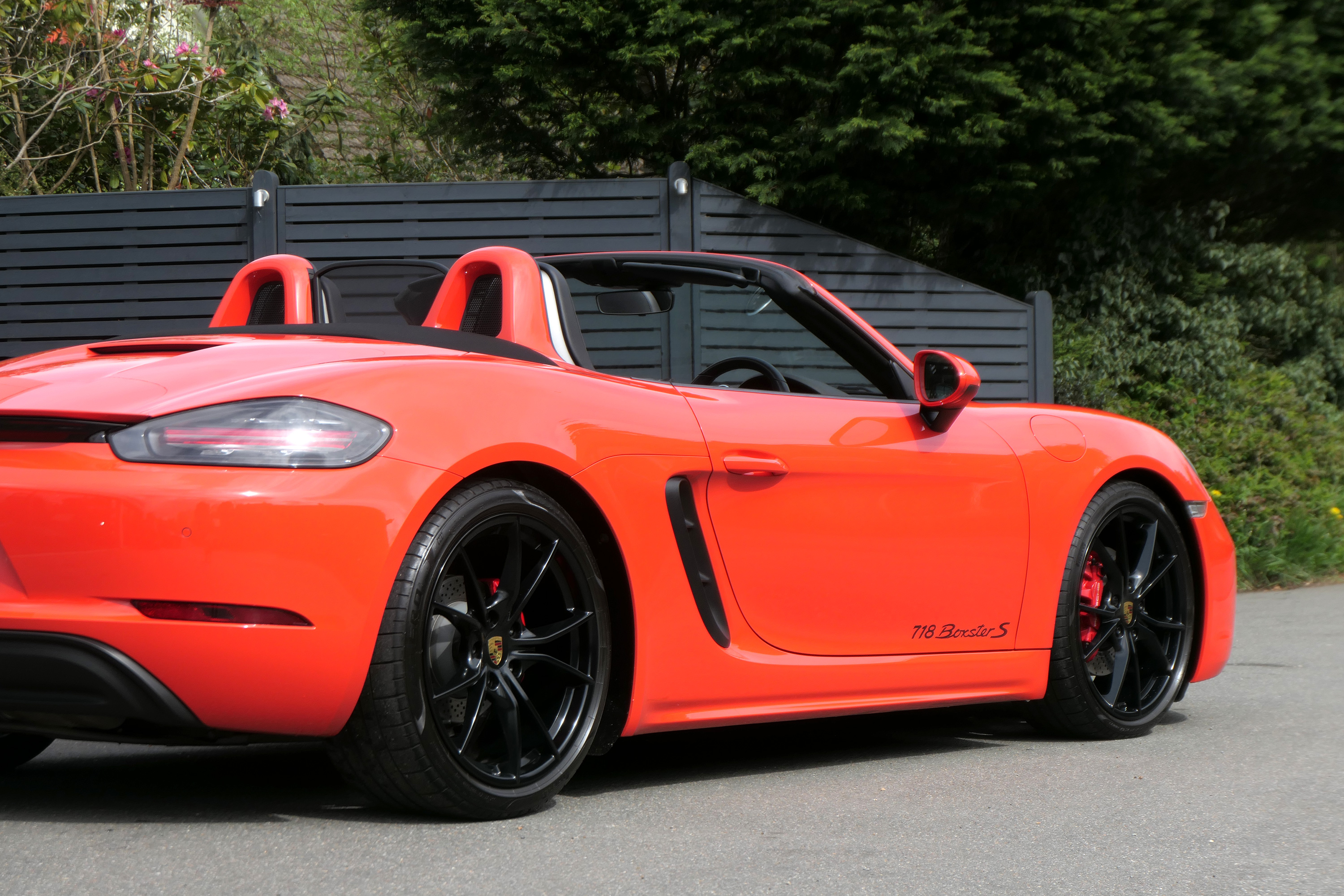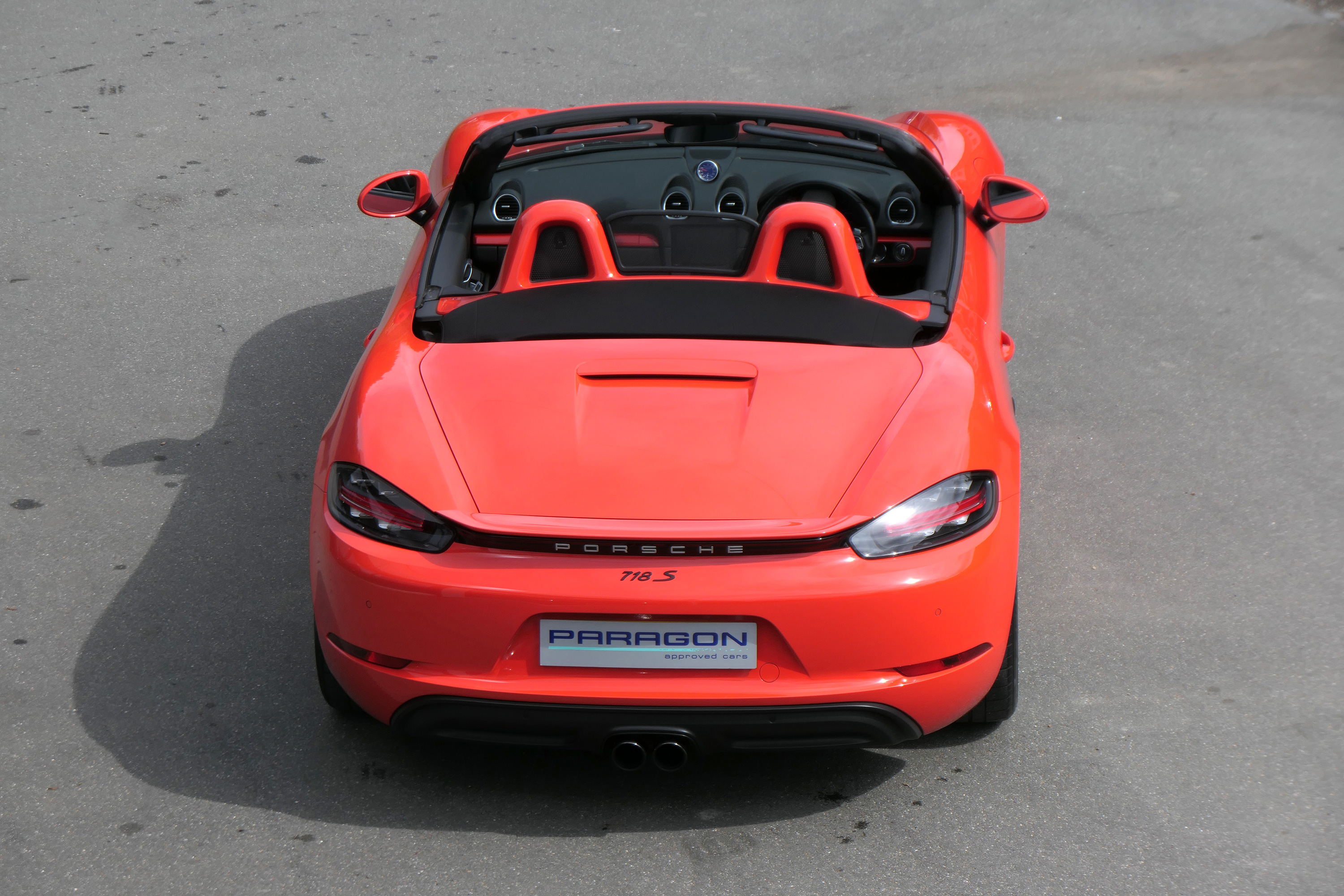This Boxster S (718) has the 7-speed PDK gearbox and is presented in Lava Orange with black leather seats and a black power hood.