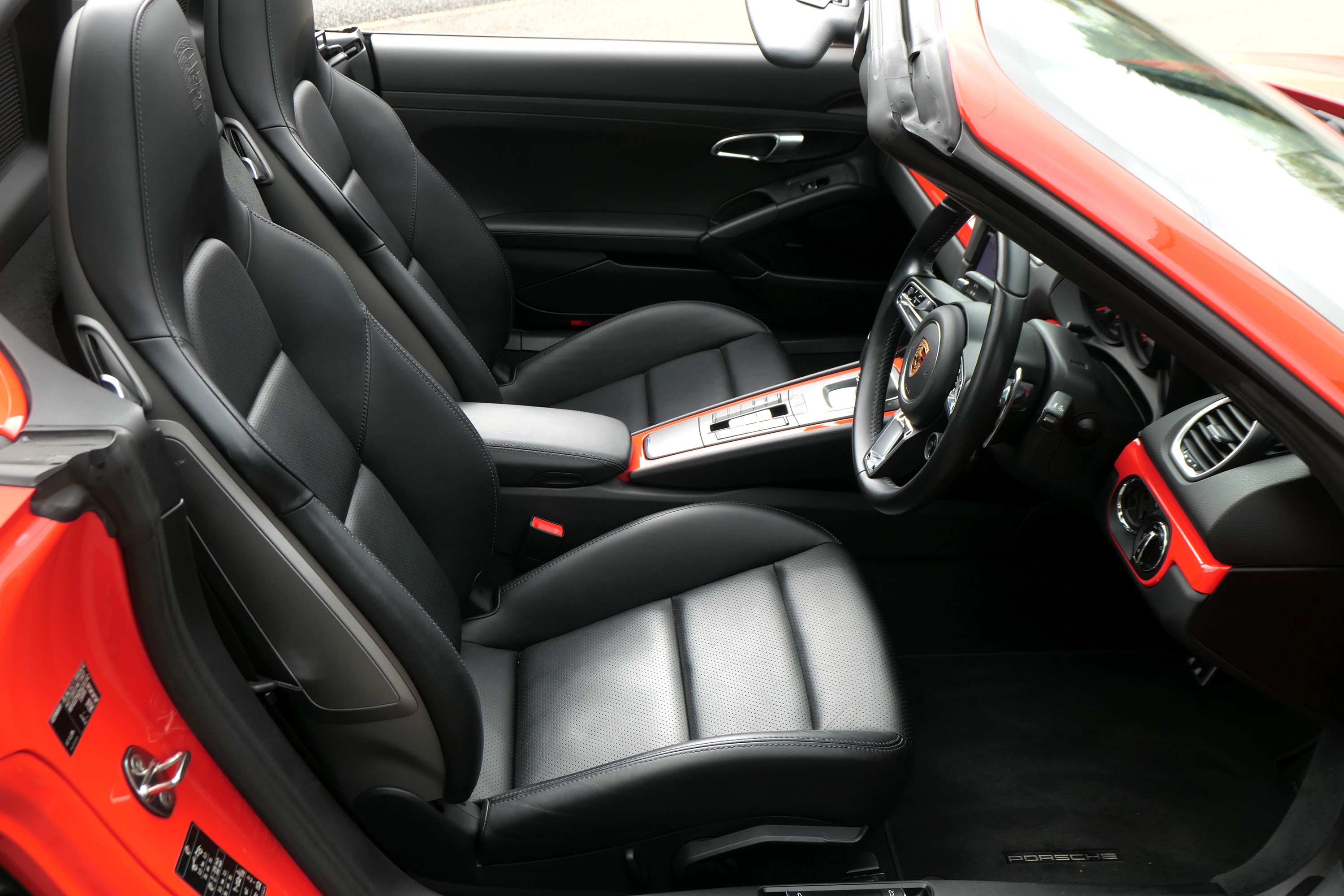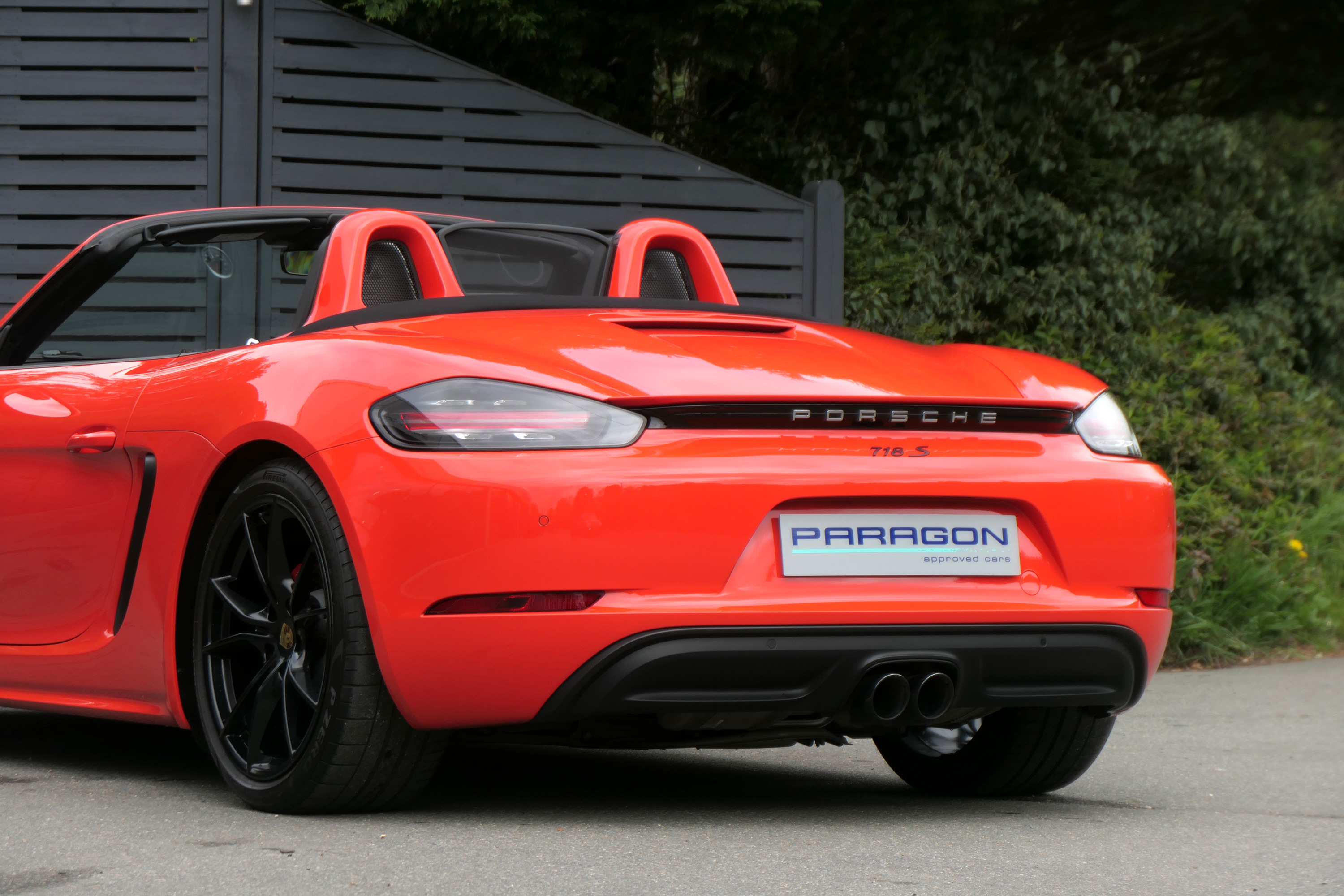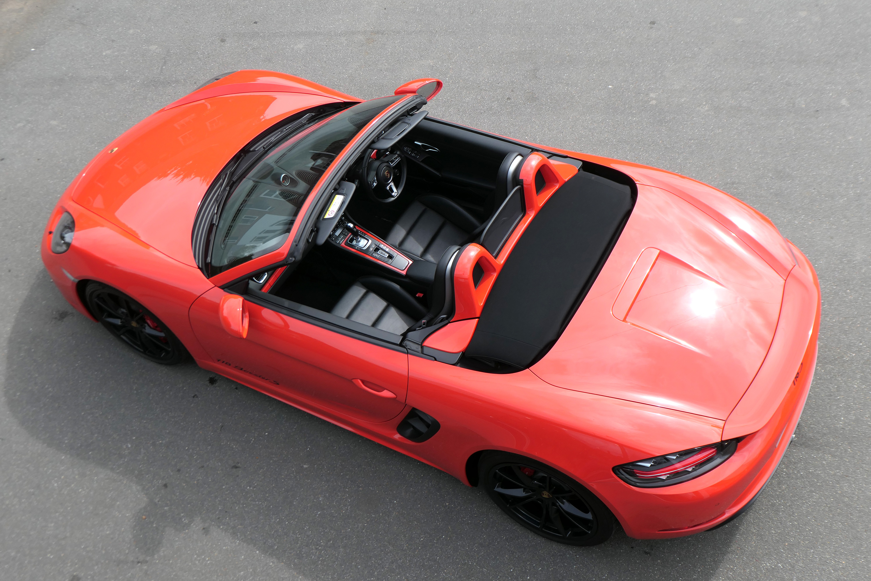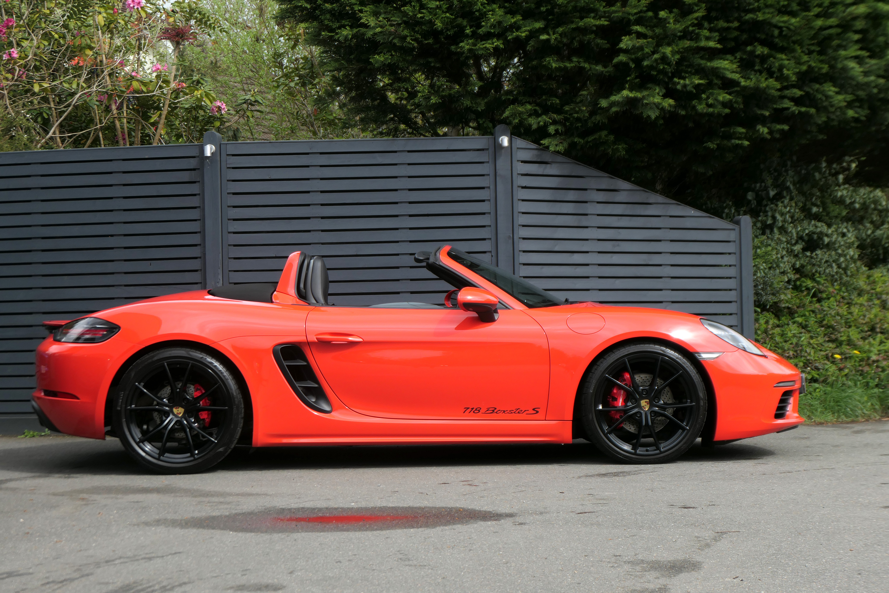 This Boxster S (718) has the 7-speed PDK gearbox and is presented in Lava Orange with black leather seats and a black power hood.